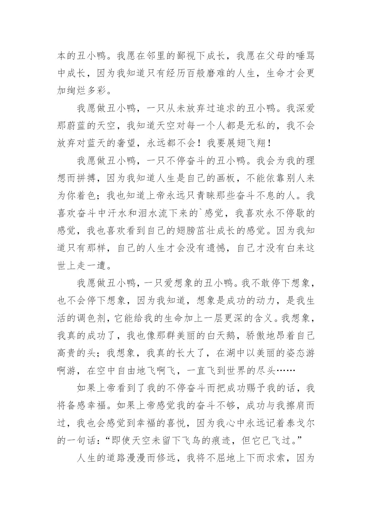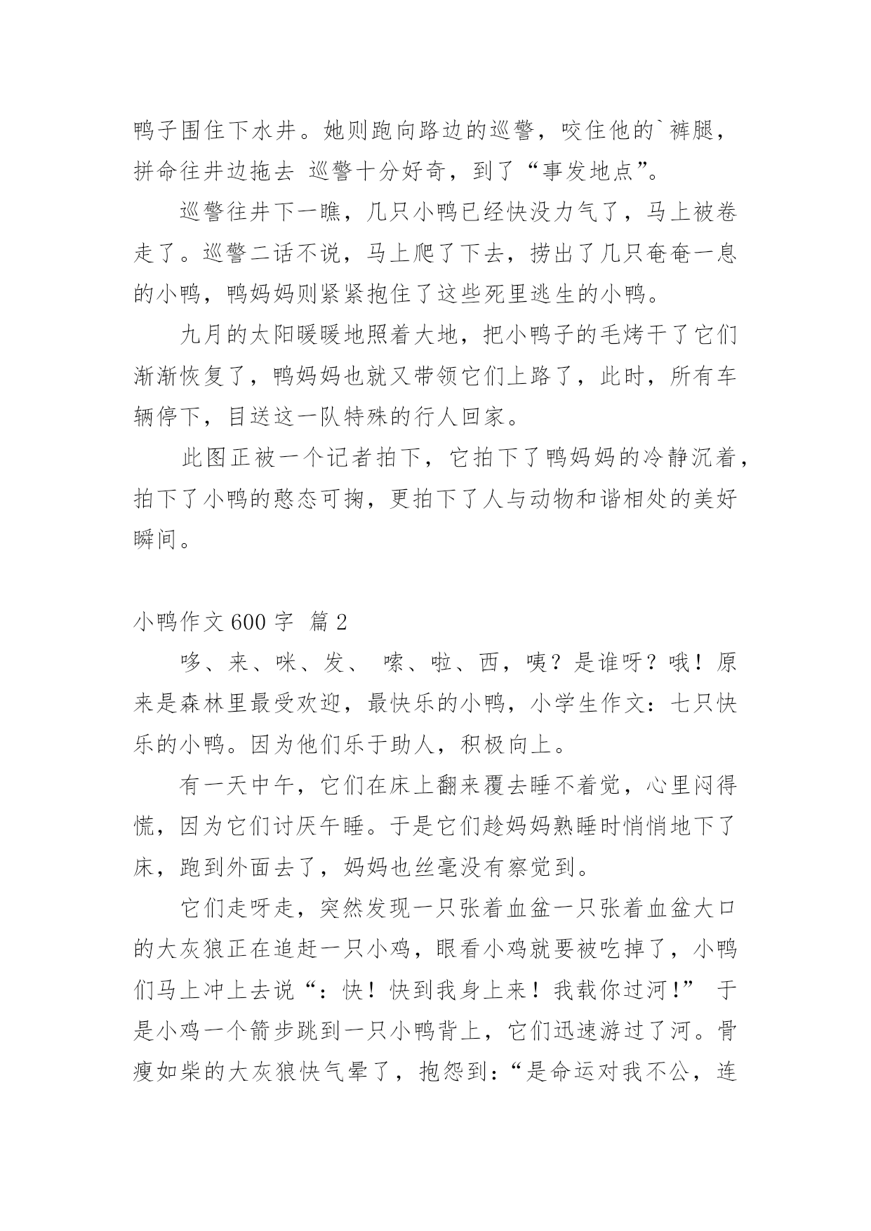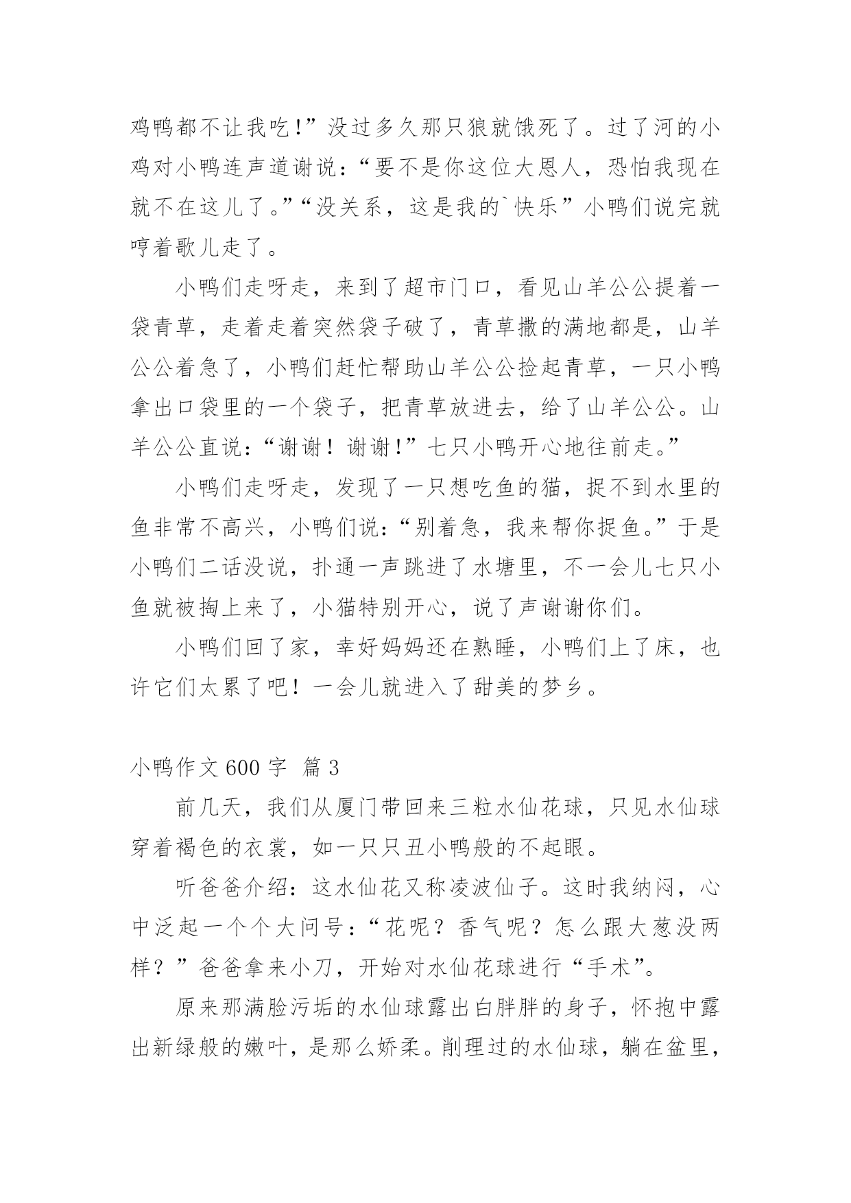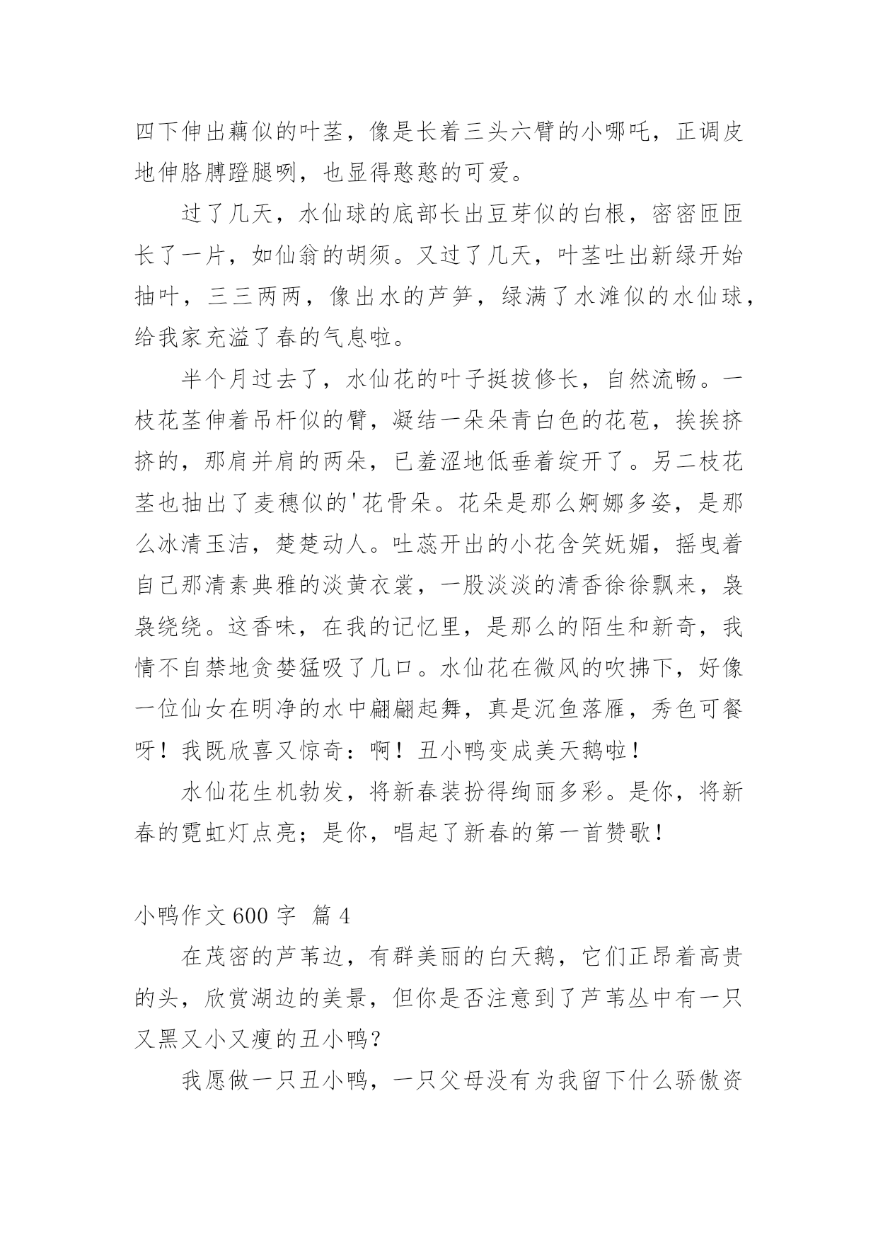 小鸭作文600字篇1 小鸭作文600字在平平淡淡的日常中,大家都经常看到作文的身影吧,写作文可以锻炼我们的独处习惯,让自己的心静下来,思考自己未来的方向。你写作文时总是无从下笔?以下是小编整理的小鸭作文600字4篇,欢迎大家分享。小鸭作文600字篇1在一个初秋的中午,天气十分晴朗,小鸭子们排成了一队,跟着鸭妈妈,出门散步去了。小鸭们在鸭妈妈的带领下,头一次踏上了温哥华的街头,街上可热闹了,小鸭们在人群中穿梭着,马路上的车川流不息,小鸭们从来没见过这么繁华的景象,眼睛都看花了,还嘎嘎地叫着,东瞅瞅,系瞧瞧,好不快活。这么多好玩的事物,怎么还有人去瞧自己脚下呢?可它们恰恰不知道,危险就在自己脚下。走着走着,突然扑通几声,几只可爱的鸭宝宝掉进了一个没有盖上盖的下水道里去了!鸭妈妈回头一瞧,咦?怎么少了那么多的鸭宝宝呢?再一看,呀!小鸭子掉进下水道了,这下可把鸭妈妈给急坏了,剩下的小鸭子也吓的缩回了妈妈身边。下水道的水十分湍急,时不时还会漂来个垃圾,小鸭子在井下拼命地游着,一边大声叫着。鸭妈妈心乱如麻,可她此时却显得如此镇静,对着井下的孩子们说:“不要怕,再坚持一会儿,妈妈想办法救你们”。之后,又吩咐其他小鸭子围住下水井。她则跑向路边的巡警,咬住他的`裤腿,拼命往井边拖去巡警十分好奇,到了“事发地点”。巡警往井下一瞧,几只小鸭已经快没力气了,马上被卷走了。巡警二话不说,马上爬了下去,捞出了几只奄奄一息的小鸭,鸭妈妈则紧紧抱住了这些死里逃生的小鸭。九月的太阳暖暖地照着大地,把小鸭子的毛烤干了它们渐渐恢复了,鸭妈妈也就又带领它们上路了,此时,所有车辆停下,目送这一队特殊的行人回家。此图正被一个记者拍下,它拍下了鸭妈妈的冷静沉着,拍下了小鸭的憨态可掬,更拍下了人与动物和谐相处的美好瞬间。小鸭作文600字篇2哆、来、咪、发、嗦、啦、西,咦?是谁呀?哦!原来是森林里最受欢迎,最快乐的小鸭,小学生作文:七只快乐的小鸭。因为他们乐于助人,积极向上。有一天中午,它们在床上翻来覆去睡不着觉,心里闷得慌,因为它们讨厌午睡。于是它们趁妈妈熟睡时悄悄地下了床,跑到外面去了,妈妈也丝毫没有察觉到。它们走呀走,突然发现一只张着血盆一只张着血盆大口的大灰狼正在追赶一只小鸡,眼看小鸡就要被吃掉了,小鸭们马上冲上去说“:快!快到我身上来!我载你过河!”于是小鸡一个箭步跳到一只小鸭背上,它们迅速游过了河。骨瘦如柴的大灰狼快气晕了,抱怨到:“是命运对我不公,连鸡鸭都不让我吃!”没过多久那只狼就饿死了。过了河的小鸡对小鸭连声道谢说:“要不是你这位大恩人,恐怕我现在就不在这儿了。”“没关系,这是我的`快乐”小鸭们说完就哼着歌儿走了。小鸭们走呀走,来到了超市门口,看见山羊公公提着一袋青草,走着走着突然袋子破了,青草撒的满地都是,山羊公公着急了,小鸭们赶忙帮助山羊公公捡起青草,一只小鸭拿出口袋里的一个袋子,把青草放进去,给了山羊公公。山羊公公直说:“谢谢!谢谢!”七只小鸭开心地往前走。”小鸭们走呀走,发现了一只想吃鱼的猫,捉不到水里的鱼非常不高兴,小鸭们说:“别着急,我来帮你捉鱼。”于是小鸭们二话没说,扑通一声跳进了水塘里,不一会儿七只小鱼就被掏上来了,小猫特别开心,说了声谢谢你们。小鸭们回了家,幸好妈妈还在熟睡,小鸭们上了床,也许它们太累了吧!一会儿就进入了甜美的梦乡。小鸭作文600字篇3前几天,我们从厦门带回来三粒水仙花球,只见水仙球穿着褐色的衣裳,如一只只丑小鸭般的不起眼。听爸爸介绍:这水仙花又称凌波仙子。这时我纳闷,心中泛起一个个大问号:“花呢?香气呢?怎么跟大葱没两样?”爸爸拿来小刀,开始对水仙花球进行“手术”。原来那满脸污垢的水仙球露出白胖胖的身子,怀抱中露出新绿般的嫩叶,是那么娇柔。削理过的水仙球,躺在盆里,四下伸出藕似的叶茎,像是长着三头六臂的小哪吒,正调皮地伸胳膊蹬腿咧,也显得憨憨的可爱。过了几天,水仙球的底部长出豆芽似的白根,密密匝匝长了一片,如仙翁的胡须。又过了几天,叶茎吐出新绿开始抽叶,三三两两,像出水的芦笋,绿满了水滩似的水仙球,给我家充溢了春的气息啦。半个月过去了,水仙花的叶子挺拔修长,自然流畅。一枝花茎伸着吊杆似的臂,凝结一朵朵青白色的花苞,挨挨挤挤的,那肩并肩的两朵,已羞涩地低垂着绽开了。另二枝花茎也抽出了麦穗似的'花骨朵。花朵是那么婀娜多姿,是那么冰清玉洁,楚楚动人。吐蕊开出的小花含笑妩媚,摇曳着自己那清素典雅的淡黄衣裳,一股淡淡的清香徐徐飘来,袅袅绕绕。这香味,在我的记忆里,是那么的陌生和新奇,我情不自禁地贪婪猛吸了几口。水仙花在微风的吹拂下,好像一位仙女在明净的水中翩翩起舞,真是沉鱼落雁,秀色可餐呀!我既欣喜又惊奇:啊!丑小鸭变成美天鹅啦!水仙花生机勃发,将新春装扮得绚丽多彩。是你,将新春的霓虹灯点亮;是你,唱起了新春的第一首赞歌!小鸭作文