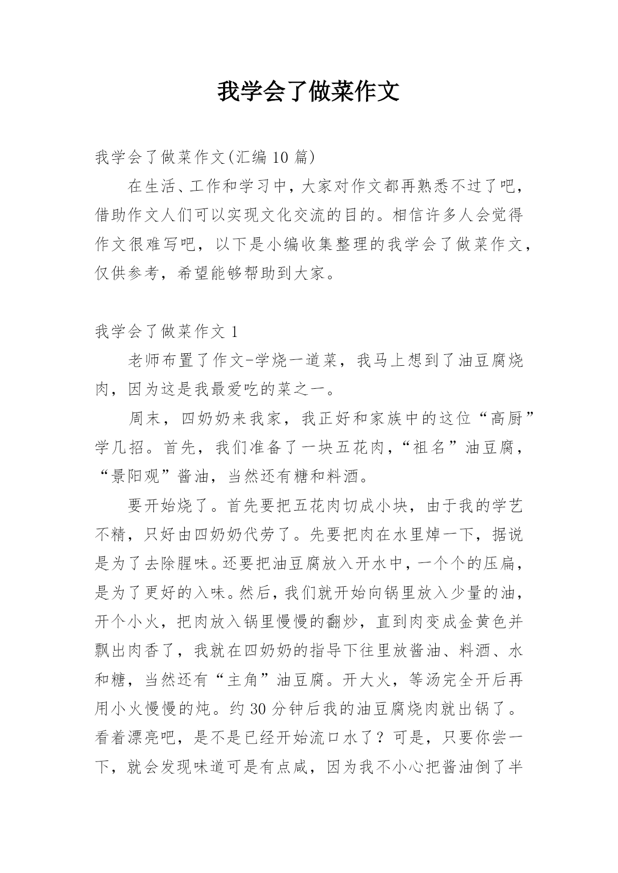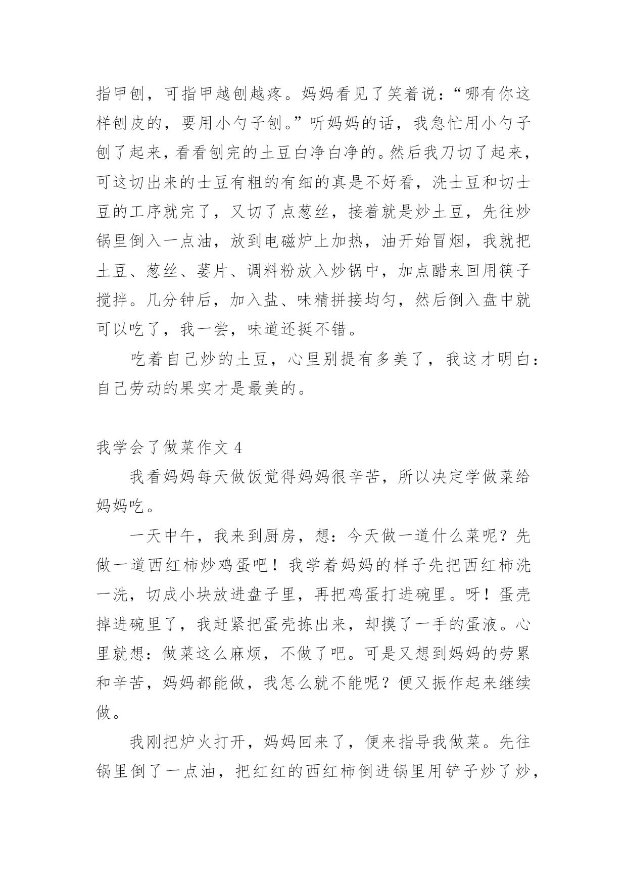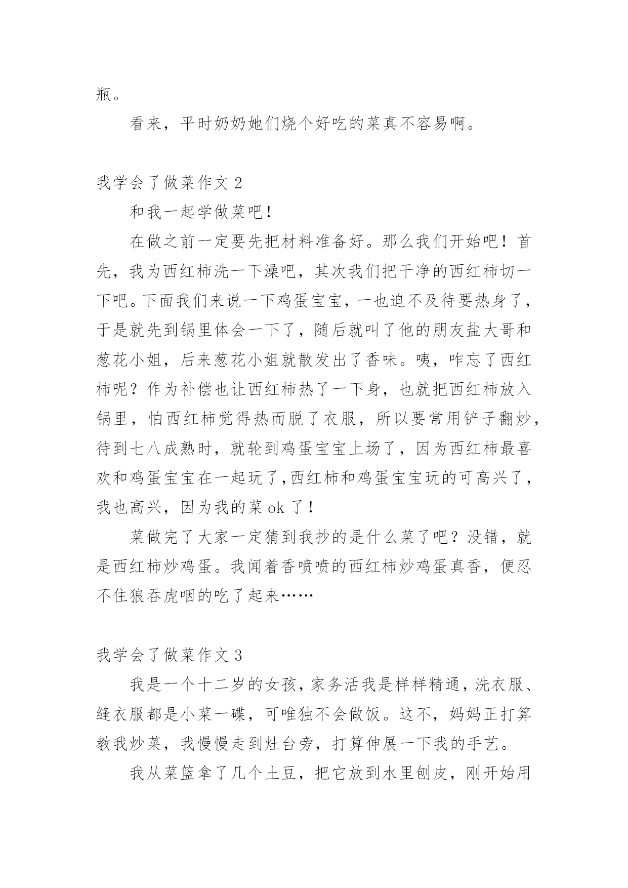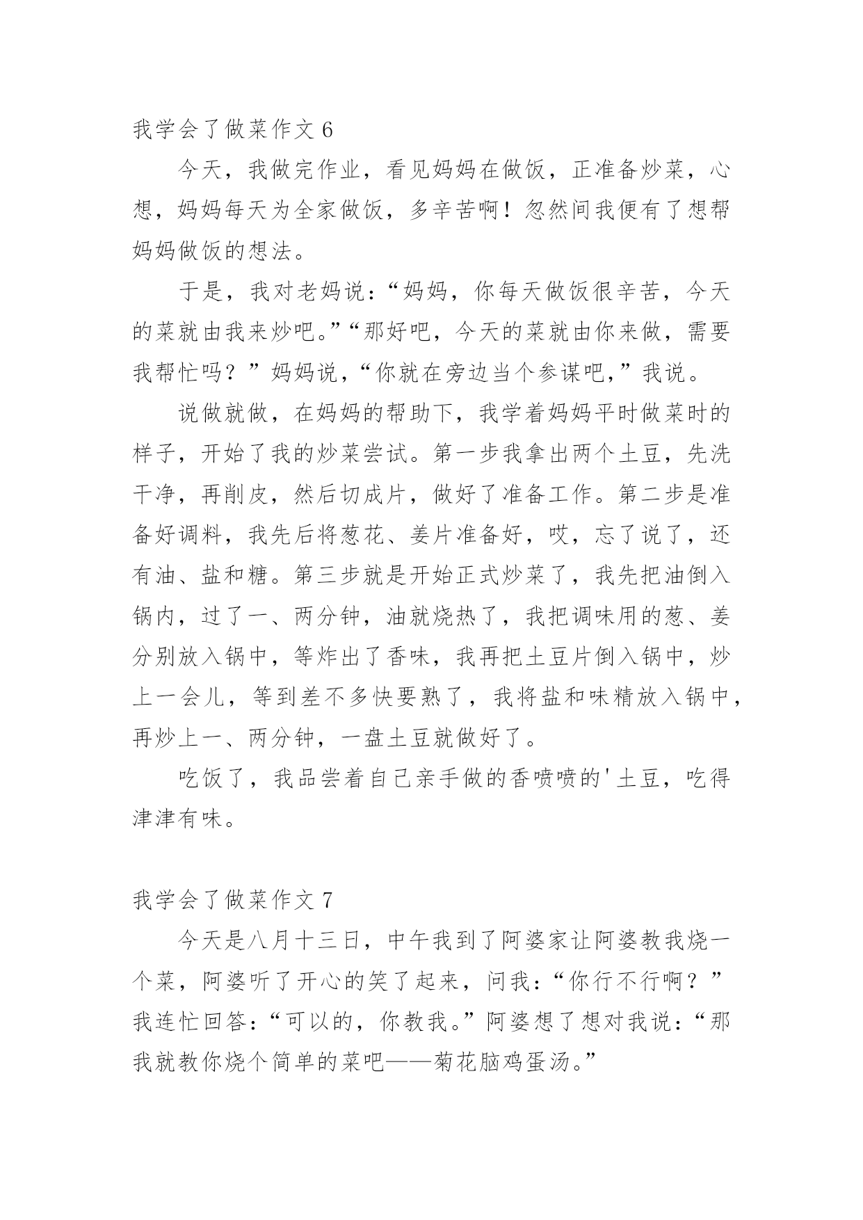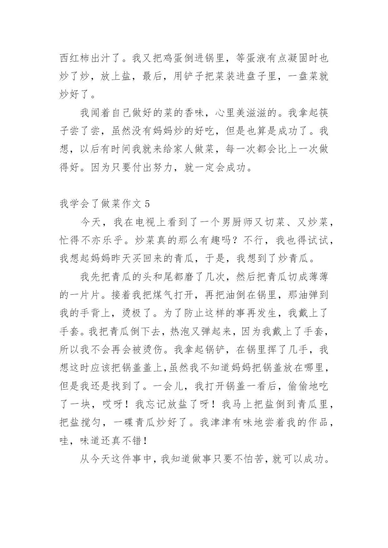 我学会了做菜作文 我学会了做菜作文(汇编10篇)在生活、工作和学习中,大家对作文都再熟悉不过了吧,借助作文人们可以实现文化交流的目的。相信许多人会觉得作文很难写吧,以下是小编收集整理的我学会了做菜作文,仅供参考,希望能够帮助到大家。我学会了做菜作文1老师布置了作文-学烧一道菜,我马上想到了油豆腐烧肉,因为这是我最爱吃的菜之一。周末,四奶奶来我家,我正好和家族中的这位“高厨”学几招。首先,我们准备了一块五花肉,“祖名”油豆腐,“景阳观”酱油,当然还有糖和料酒。要开始烧了。首先要把五花肉切成小块,由于我的学艺不精,只好由四奶奶代劳了。先要把肉在水里焯一下,据说是为了去除腥味。还要把油豆腐放入开水中,一个个的压扁,是为了更好的入味。然后,我们就开始向锅里放入少量的油,开个小火,把肉放入锅里慢慢的翻炒,直到肉变成金黄色并飘出肉香了,我就在四奶奶的指导下往里放酱油、料酒、水和糖,当然还有“主角”油豆腐。开大火,等汤完全开后再用小火慢慢的炖。约30分钟后我的油豆腐烧肉就出锅了。看着漂亮吧,是不是已经开始流口水了?可是,只要你尝一下,就会发现味道可是有点咸,因为我不小心把酱油倒了半瓶。看来,平时奶奶她们烧个好吃的菜真不容易啊。我学会了做菜作文2和我一起学做菜吧!在做之前一定要先把材料准备好。那么我们开始吧!首先,我为西红柿洗一下澡吧,其次我们把干净的西红柿切一下吧。下面我们来说一下鸡蛋宝宝,一也迫不及待要热身了,于是就先到锅里体会一下了,随后就叫了他的朋友盐大哥和葱花小姐,后来葱花小姐就散发出了香味。咦,咋忘了西红柿呢?作为补偿也让西红柿热了一下身,也就把西红柿放入锅里,怕西红柿觉得热而脱了衣服,所以要常用铲子翻炒,待到七八成熟时,就轮到鸡蛋宝宝上场了,因为西红柿最喜欢和鸡蛋宝宝在一起玩了,西红柿和鸡蛋宝宝玩的可高兴了,我也高兴,因为我的菜ok了!菜做完了大家一定猜到我抄的是什么菜了吧?没错,就是西红柿炒鸡蛋。我闻着香喷喷的西红柿炒鸡蛋真香,便忍不住狼吞虎咽的吃了起来……我学会了做菜作文3我是一个十二岁的女孩,家务活我是样样精通,洗衣服、缝衣服都是小菜一碟,可唯独不会做饭。这不,妈妈正打算教我炒菜,我慢慢走到灶台旁,打算伸展一下我的手艺。我从菜篮拿了几个土豆,把它放到水里刨皮,刚开始用指甲刨,可指甲越刨越疼。妈妈看见了笑着说:“哪有你这样刨皮的,要用小勺子刨。”听妈妈的话,我急忙用小勺子刨了起来,看看刨完的土豆白净白净的。然后我刀切了起来,可这切出来的士豆有粗的有细的真是不好看,洗士豆和切士豆的工序就完了,又切了点葱丝,接着就是炒土豆,先往炒锅里倒入一点油,放到电磁炉上加热,油开始冒烟,我就把土豆、葱丝、葁片、调料粉放入炒锅中,加点醋来回用筷子搅拌。几分钟后,加入盐、味精拼接均匀,然后倒入盘中就可以吃了,我一尝,味道还挺不错。吃着自己炒的土豆,心里别提有多美了,我这才明白:自己劳动的果实才是最美的。我学会了做菜作文4我看妈妈每天做饭觉得妈妈很辛苦,所以决定学做菜给妈妈吃。一天中午,我来到厨房,想:今天做一道什么菜呢?先做一道西红柿炒鸡蛋吧!我学着妈妈的样子先把西红柿洗一洗,切成小块放进盘子里,再把鸡蛋打进碗里。呀!蛋壳掉进碗里了,我赶紧把蛋壳拣出来,却摸了一手的蛋液。心里就想:做菜这么麻烦,不做了吧。可是又想到妈妈的劳累和辛苦,妈妈都能做,我怎么就不能呢?便又振作起来继续做。我刚把炉火打开,妈妈回来了,便来指导我做菜。先往锅里倒了一点油,把红红的西红柿倒进锅里用铲子炒了炒,西红柿出汁了。我又把鸡蛋倒进锅里,等蛋液有点凝固时也炒了炒,放上盐,最后,用铲子把菜装进盘子里,一盘菜就炒好了。我闻着自己做好的菜的香味,心里美滋滋的。我拿起筷子尝了尝,虽然没有妈妈炒的好吃,但是也算是成功了。我想,以后有时间我就来给家人做菜,每一次都会比上一次做得好。因为只要付出努力,就一定会成功。我学会了做菜作文5今天,我在电视上看到了一个男厨师又切菜、又炒菜,忙得不亦乐乎。炒菜真的那么有趣吗?不行,我也得试试,我想起妈妈昨天买回来的青瓜,于是,我想到了炒青瓜。我先把青瓜的头和尾都磨了几次,然后把青瓜切成薄薄的一片片。接着我把煤气打开,再把油倒在锅里,那油弹到我的手背上,烫极了。为了防止这样的事再发生,我戴上了手套。我把青瓜倒下去,热泡又弹起来,因为我戴上了手套,所以我不会再会被烫伤。我拿起锅铲,在锅里挥了几手,我想这时应该把锅盖盖上,虽然我不知道妈妈把锅盖放在哪里,但是我还是找到了。一会儿,我打开锅盖一看后,偷偷地吃了一块,哎呀!我忘记放盐了呀!我马上把盐倒到青瓜里,把盐搅匀,一碟青瓜炒好了。我津津有味地尝着我的作品,哇,味道还真不错!从今天这件事中,我知道做事只要不怕苦,就可以成功。我学会了做菜作文6今天,我做完作业,看见妈妈在做饭,正准备炒菜,心想,妈妈每天为