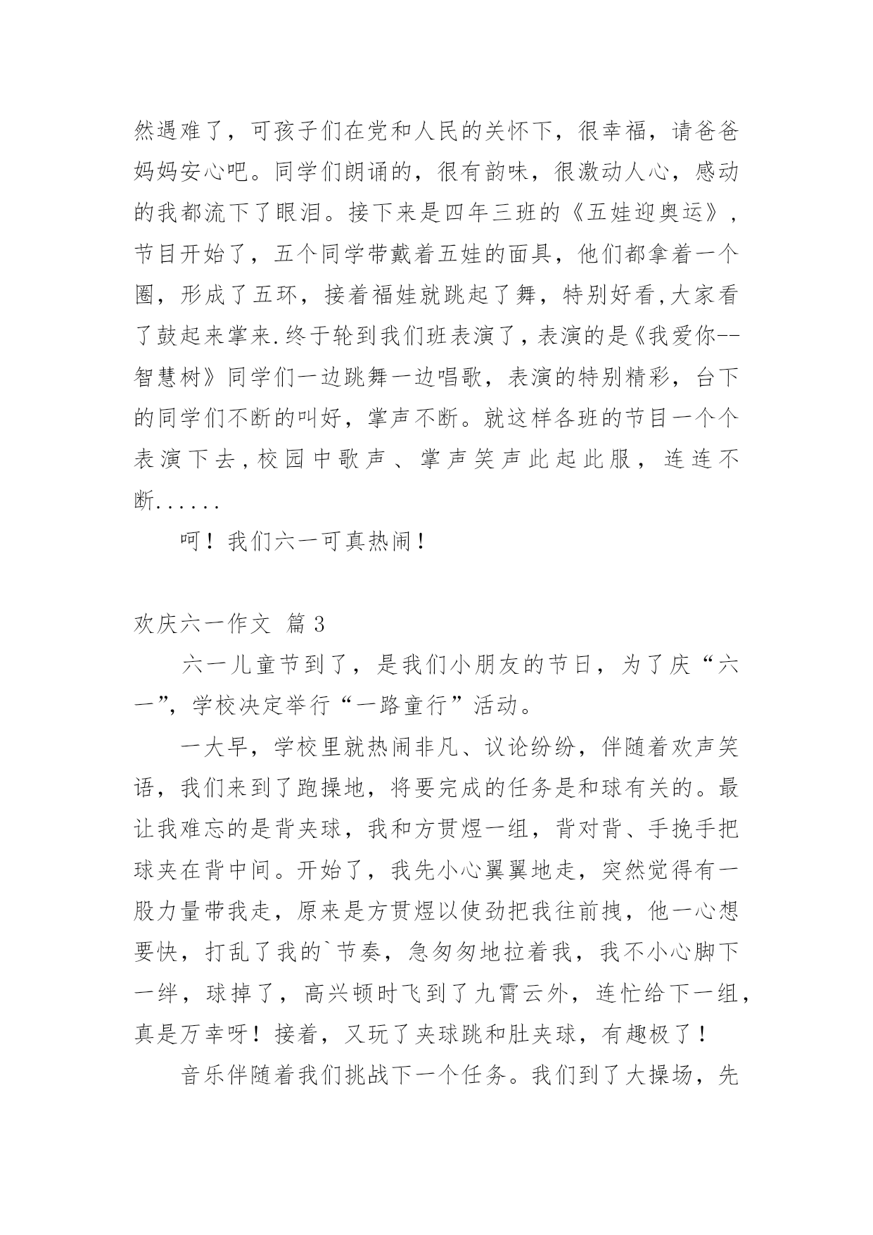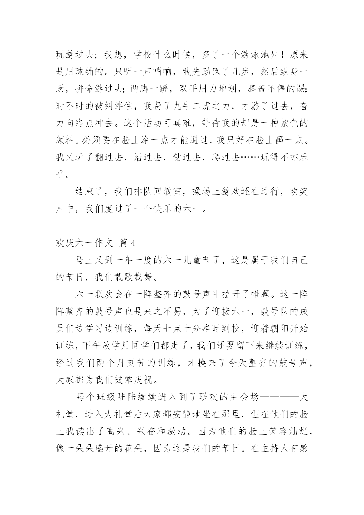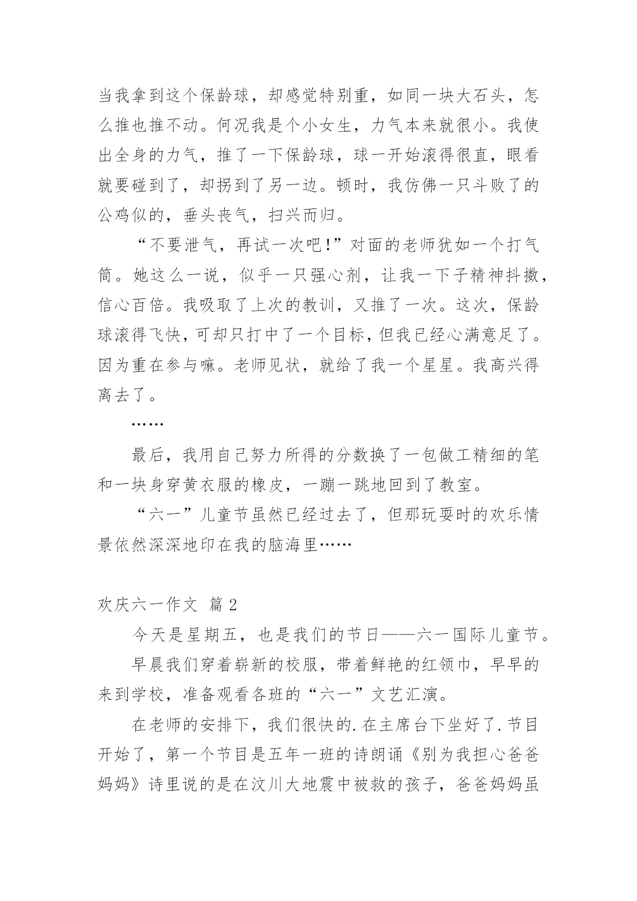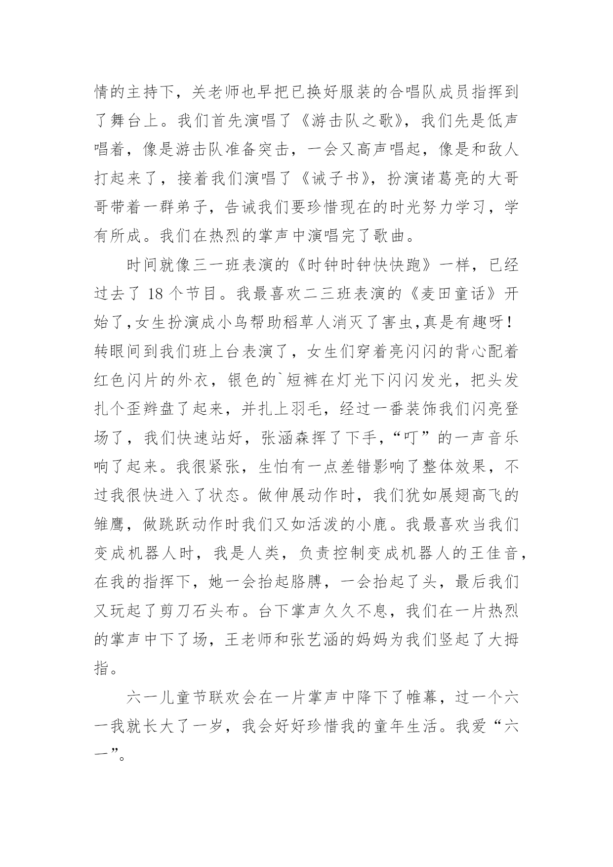 欢庆六一作文 【精选】欢庆六一作文5篇无论在学习、工作或是生活中,大家都不可避免地要接触到作文吧,作文根据写作时限的不同可以分为限时作文和非限时作文。那么你有了解过作文吗?以下是小编帮大家整理的欢庆六一作文5篇,仅供参考,大家一起来看看吧。欢庆六一作文篇1盼星星,盼月亮,终于盼到了“六一”儿童节。清早,天虽下着蒙蒙细雨上,但我们仍然格外高兴。早上,我们24个班集中到了大礼堂,看了一场表演,可心思早就飞到了下午的游园会中去了。终于到了下午,我们个个像一只只欢乐的小鸟,冲出教室,飞奔到操场上,三五成群地玩起了游戏。我和我最要好的朋友??陈洋,跑到大礼堂玩“原地踏步”。我想:原地踏步很简单,肯定能拿到太阳。我站到点上,只听鼓一响,就原地踏起步来。毕竟是蒙着眼睛的',为了防止有太大的移动,所以我把脚抬得很低。“吁”,哨子一响,我们都停下了脚步,将罩子摘下,我看到自己的脚并没有离开点子,高兴极了,果然,拿了个太阳。接着,我在大礼堂里走了走,看见一项好玩的游戏??“地面保龄球”。我带着好奇心,走了过去。看见别人把保得龄球轻轻一推,球就滚过去了,似乎很容易。轮到我了,当我拿到这个保龄球,却感觉特别重,如同一块大石头,怎么推也推不动。何况我是个小女生,力气本来就很小。我使出全身的力气,推了一下保龄球,球一开始滚得很直,眼看就要碰到了,却拐到了另一边。顿时,我仿佛一只斗败了的公鸡似的,垂头丧气,扫兴而归。“不要泄气,再试一次吧!”对面的老师犹如一个打气筒。她这么一说,似乎一只强心剂,让我一下子精神抖擞,信心百倍。我吸取了上次的教训,又推了一次。这次,保龄球滚得飞快,可却只打中了一个目标,但我已经心满意足了。因为重在参与嘛。老师见状,就给了我一个星星。我高兴得离去了。……最后,我用自己努力所得的分数换了一包做工精细的笔和一块身穿黄衣服的橡皮,一蹦一跳地回到了教室。“六一”儿童节虽然已经过去了,但那玩耍时的欢乐情景依然深深地印在我的脑海里……欢庆六一作文篇2今天是星期五,也是我们的节日——六一国际儿童节。早晨我们穿着崭新的校服,带着鲜艳的红领巾,早早的来到学校,准备观看各班的“六一”文艺汇演。在老师的安排下,我们很快的.在主席台下坐好了.节目开始了,第一个节目是五年一班的诗朗诵《别为我担心爸爸妈妈》诗里说的是在汶川大地震中被救的孩子,爸爸妈妈虽然遇难了,可孩子们在党和人民的关怀下,很幸福,请爸爸妈妈安心吧。同学们朗诵的,很有韵味,很激动人心,感动的我都流下了眼泪。接下来是四年三班的《五娃迎奥运》,节目开始了,五个同学带戴着五娃的面具,他们都拿着一个圈,形成了五环,接着福娃就跳起了舞,特别好看,大家看了鼓起来掌来.终于轮到我们班表演了,表演的是《我爱你--智慧树》同学们一边跳舞一边唱歌,表演的特别精彩,台下的同学们不断的叫好,掌声不断。就这样各班的节目一个个表演下去,校园中歌声、掌声笑声此起此服,连连不断......呵!我们六一可真热闹!欢庆六一作文篇3六一儿童节到了,是我们小朋友的节日,为了庆“六一”,学校决定举行“一路童行”活动。一大早,学校里就热闹非凡、议论纷纷,伴随着欢声笑语,我们来到了跑操地,将要完成的任务是和球有关的。最让我难忘的是背夹球,我和方贯煜一组,背对背、手挽手把球夹在背中间。开始了,我先小心翼翼地走,突然觉得有一股力量带我走,原来是方贯煜以使劲把我往前拽,他一心想要快,打乱了我的`节奏,急匆匆地拉着我,我不小心脚下一绊,球掉了,高兴顿时飞到了九霄云外,连忙给下一组,真是万幸呀!接着,又玩了夹球跳和肚夹球,有趣极了!音乐伴随着我们挑战下一个任务。我们到了大操场,先玩游过去;我想,学校什么时候,多了一个游泳池呢!原来是用球铺的。只听一声哨响,我先助跑了几步,然后纵身一跃,拼命游过去;两脚一蹬,双手用力地划,膝盖不停的踢;时不时的被纠绊住,我费了九牛二虎之力,才游了过去,奋力向终点冲去。这个活动可真难,等待我的却是一种紫色的颜料。必须要在脸上涂一点才能通过,我只好在脸上画一点。我又玩了翻过去,沿过去,钻过去,爬过去……玩得不亦乐乎。结束了,我们排队回教室,操场上游戏还在进行,欢笑声中,我们度过了一个快乐的六一。欢庆六一作文篇4马上又到一年一度的六一儿童节了,这是属于我们自己的节日,我们载歌载舞。六一联欢会在一阵整齐的鼓号声中拉开了帷幕。这一阵阵整齐的鼓号声也是来之不易,为了迎接六一,鼓号队的成员们边学习边训练,每天七点十分准时到校,迎着朝阳开始训练,下午放学后同学们都走了,我们还要留下来继续训练,经过我们两个月刻苦的训练,才换来了今天整齐的鼓号声,大家都为我们鼓掌庆祝。每个班级陆陆续续进入到了联欢的主会场————大礼堂,进入大礼堂后大家都安静地坐在那里,但在他们的脸上我读出了高兴、兴奋和激动。因为他们的脸上笑容灿烂,像一朵朵盛开的花