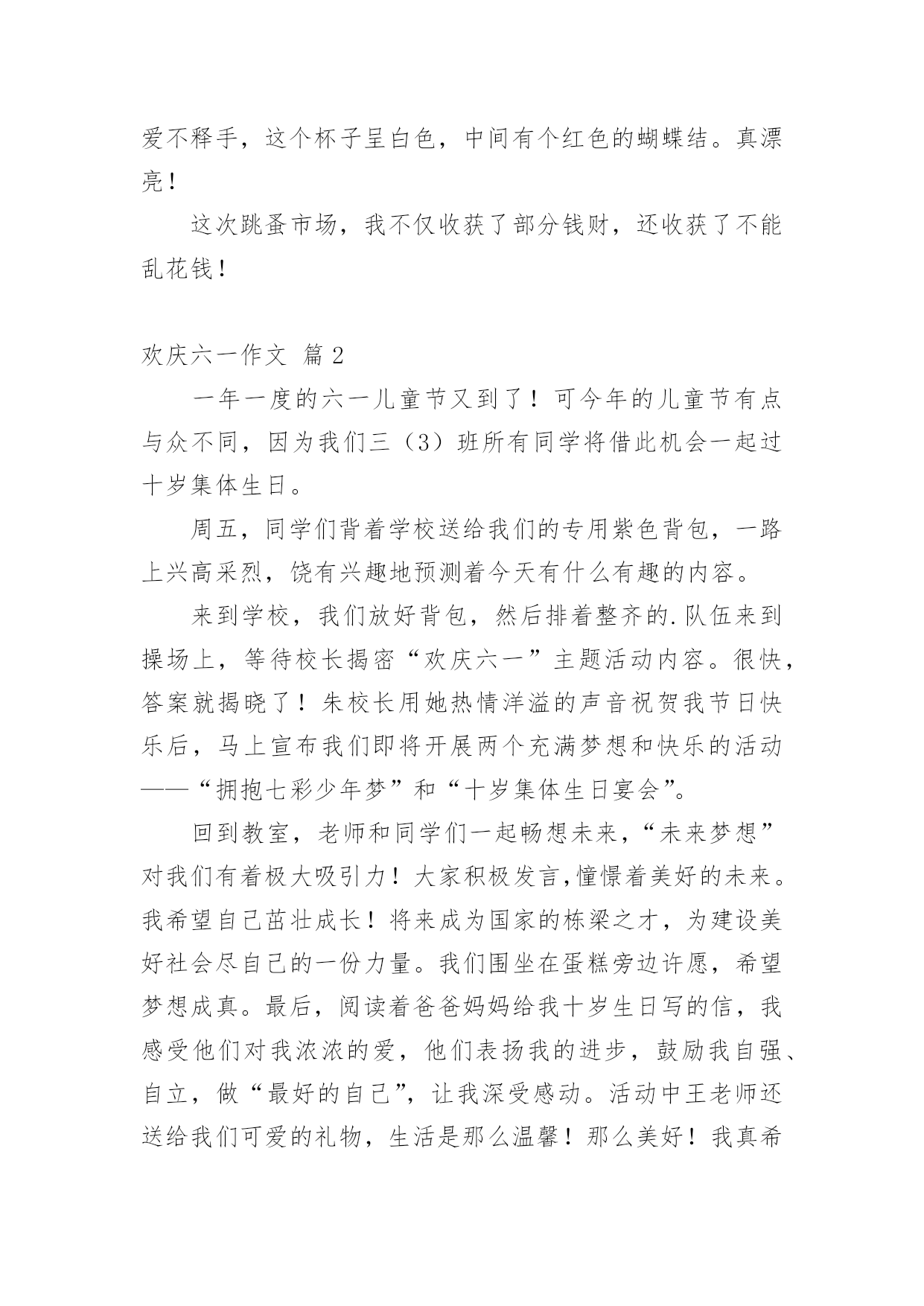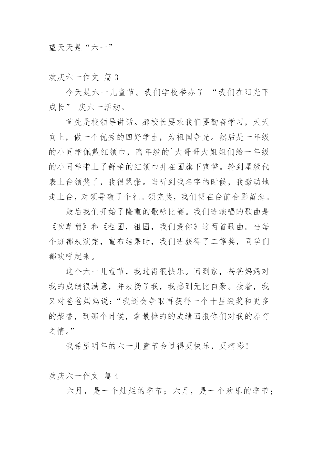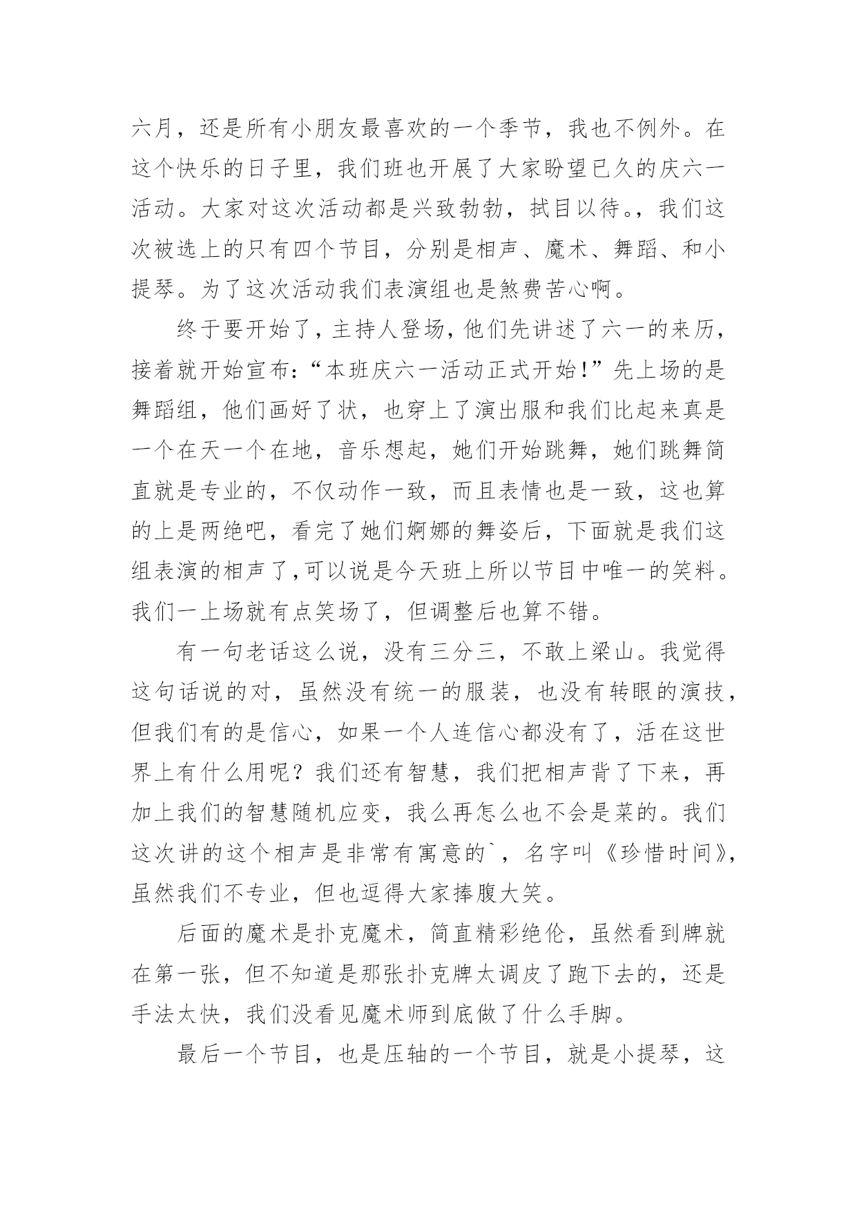 欢庆六一作文 欢庆六一作文合集6篇在学习、工作乃至生活中,大家总免不了要接触或使用作文吧,作文是一种言语活动,具有高度的综合性和创造性。那么,怎么去写作文呢?以下是小编为大家整理的欢庆六一作文6篇,欢迎大家借鉴与参考,希望对大家有所帮助。欢庆六一作文篇1每到六月一日这一天,总是孩子们最开心的时候。就在六月一日这天前,我们开展了欢庆六一活动。当天上午,我们来到操场,观看节目。这一个个精彩的表演不禁让我们拍手叫好,有小合唱、大合唱、印度舞等······其中,最令我印象深刻的是印度舞。那是几个二年级的小妹妹跳的。她们可能在这么多人的舞台上跳舞,有点紧张,但她们十分认真的做好每一个细节,没有一点失误。最令人愉悦的,还是下午的跳蚤市场。我们带着钱、要卖的东西、地毯和吆喝的工具来到操场,选定位置后,摆放好物品,就迎客了!我们迎来的第一位客人,是三年级的小妹妹。我一见小妹妹来了,便立刻拿起一长串的项链迎上去:妹妹!你看一下这个好不好!价格很便宜的哦!我心想:一定要让妹妹把这个买了!可妹妹却无情地头也不回地走了。这让我觉得很失败,心想:为什么妹妹走了?难道不好看吗?也不是啊!但不管怎么说,我都要卖出去!于是,我重振旗鼓,决定察言观色。有一位顾客来了,当她看到我的项链时,闪出了异样的光。我想:这一次一定要卖出去!我对姐姐说:姐姐!这个2元!很便宜的!姐姐什么也没说,什么也没做,我使出了招数——说好话,姐姐!你看,这条‘项链’十分符合你那高贵的气质,十分漂亮!你就买了吧!姐姐听了这话,感到十分得意。而我的心,似乎在跟上天祈求着:一定要买!一定要买!只见姐姐掏出钱包,准备付钱。我的心一下子升到了极点,我接过钱,一下子蹦了起来,哈哈!终于卖出去了!我有拿起一个像手掌的塑料玩具,使劲、快速地拍打起来,嘴里还不停的吆喝:走过路过,千万不要错过!跳楼大甩卖!看一看!瞧一瞧!吸引了许多顾客。后来,我带钱到别处去购买物品。大家都用自己的招数吸引着客人,有的用小蜜蜂大声呼,有的也用手掌,有的`做了些十分精美的招牌······总之大家都有自己的方式。我选中了一个心仪的杯子,我拿起杯子问:这个杯子多少元?10元!我心想:这个杯子就是漂亮,但又不实用,肯定卖不到十元!我便学着大人的样子——砍起价了!6元好不好?7元!5元行吗?······3元?4元!成交!那位大姐姐被我糊里糊涂的砍成了4元!我付了钱,捧起杯子,爱不释手,这个杯子呈白色,中间有个红色的蝴蝶结。真漂亮!这次跳蚤市场,我不仅收获了部分钱财,还收获了不能乱花钱!欢庆六一作文篇2一年一度的六一儿童节又到了!可今年的儿童节有点与众不同,因为我们三(3)班所有同学将借此机会一起过十岁集体生日。周五,同学们背着学校送给我们的专用紫色背包,一路上兴高采烈,饶有兴趣地预测着今天有什么有趣的内容。来到学校,我们放好背包,然后排着整齐的.队伍来到操场上,等待校长揭密“欢庆六一”主题活动内容。很快,答案就揭晓了!朱校长用她热情洋溢的声音祝贺我节日快乐后,马上宣布我们即将开展两个充满梦想和快乐的活动——“拥抱七彩少年梦”和“十岁集体生日宴会”。回到教室,老师和同学们一起畅想未来,“未来梦想”对我们有着极大吸引力!大家积极发言,憧憬着美好的未来。我希望自己茁壮成长!将来成为国家的栋梁之才,为建设美好社会尽自己的一份力量。我们围坐在蛋糕旁边许愿,希望梦想成真。最后,阅读着爸爸妈妈给我十岁生日写的信,我感受他们对我浓浓的爱,他们表扬我的进步,鼓励我自强、自立,做“最好的自己”,让我深受感动。活动中王老师还送给我们可爱的礼物,生活是那么温馨!那么美好!我真希望天天是“六一”欢庆六一作文篇3今天是六一儿童节。我们学校举办了“我们在阳光下成长”庆六一活动。首先是校领导讲话。郝校长要求我们要勤奋学习,天天向上,做一个优秀的四好学生,为祖国争光。然后是一年级的小同学佩戴红领巾,高年级的`大哥哥大姐姐们给一年级的小同学带上了鲜艳的红领巾并在国旗下宣誓。轮到星级代表上台领奖了,我很紧张。当听到我名字的时候,我激动地走上台,对领导敬了个礼。领完奖,我们便在台前合影留念。最后我们开始了隆重的歌咏比赛。我们班演唱的歌曲是《吹草哨》和《祖国,祖国,我们爱你》这两首歌曲。当每个班都表演完,宣布结果时,我们班获得了二等奖,同学们都欢呼起来。这个六一儿童节,我过得很快乐。回到家,爸爸妈妈对我的成绩很满意,并表扬了我,我感到无比自豪。接着,我又对爸爸妈妈说:“我还会争取再获得一个十星级奖和更多的荣誉,到那个时候,拿最棒的的成绩回报你们对我的养育之情。”我希望明年的六一儿童节会过得更快乐,更精彩!欢庆六一作文篇4六月,是一个灿烂的季节;六月,是一个欢乐的季节;六月,还是所有小朋友最喜欢的一个季节,我也不例外。在这个快乐的日子里,我们班也开展了大家盼望已久的庆六一活