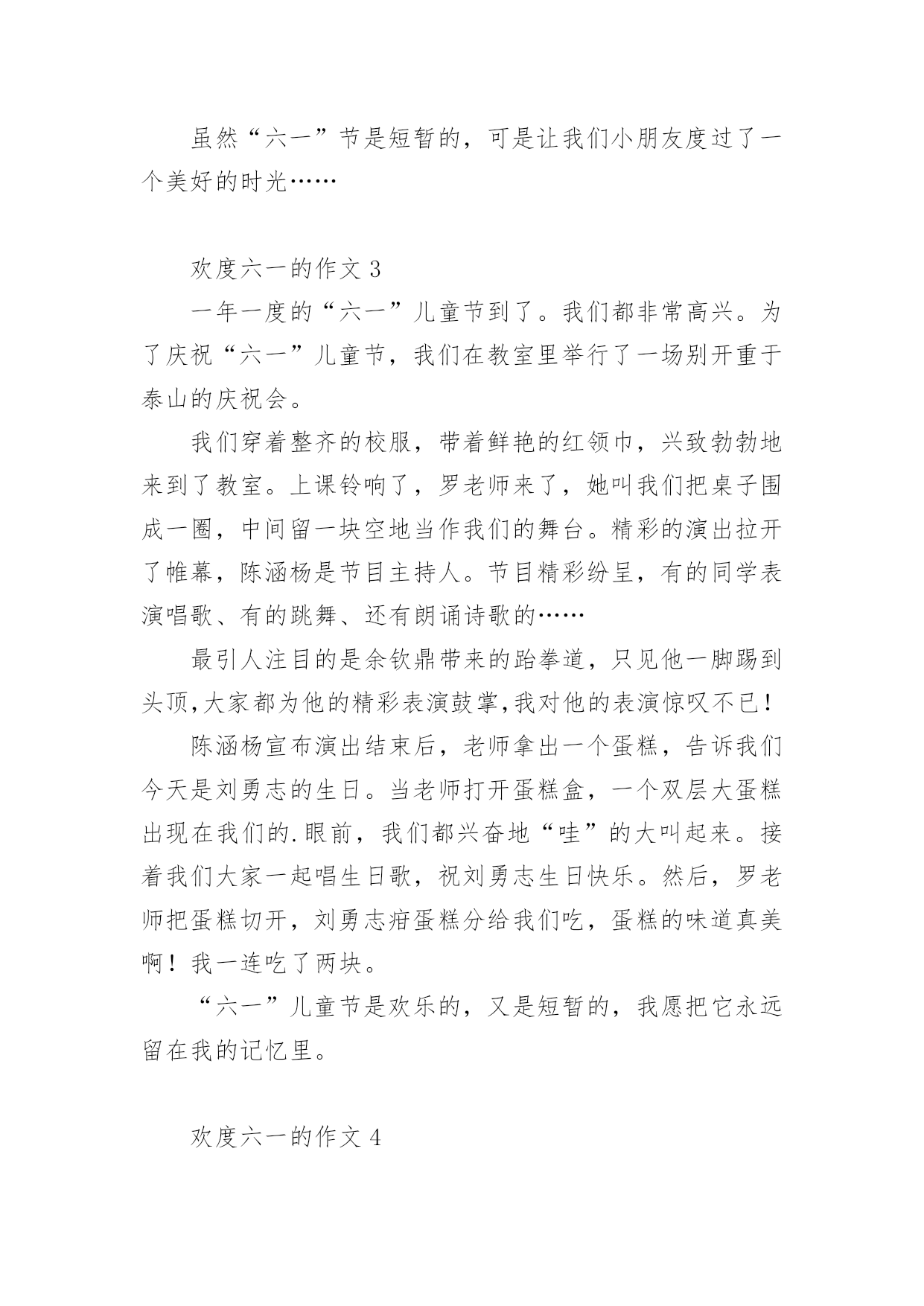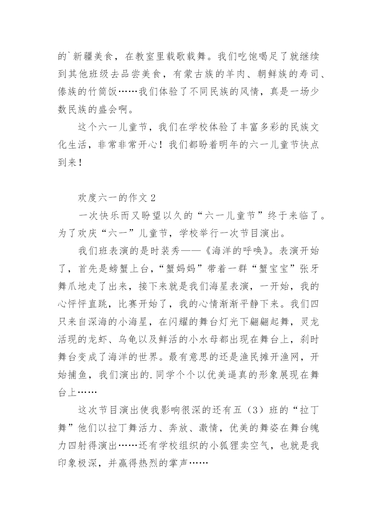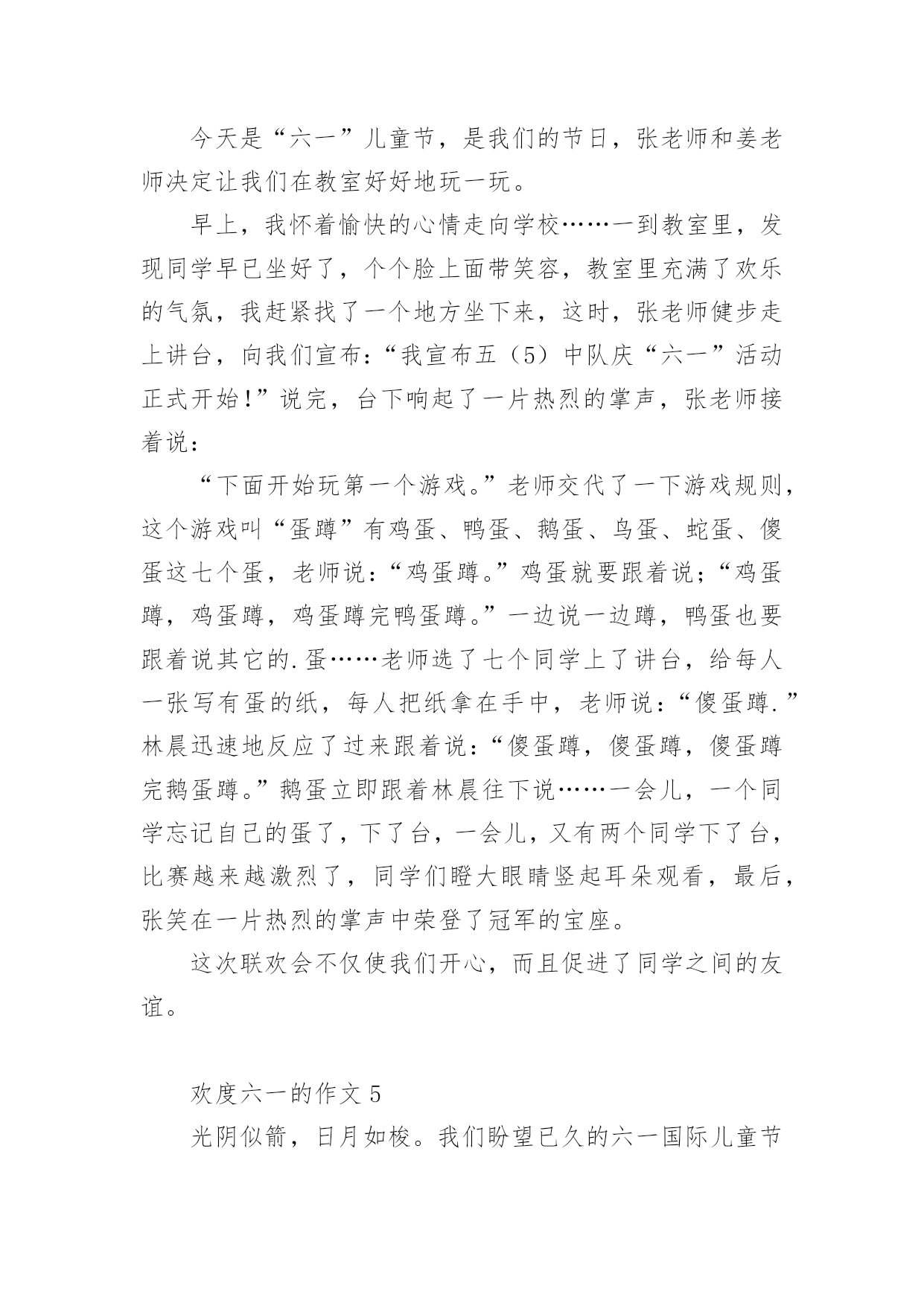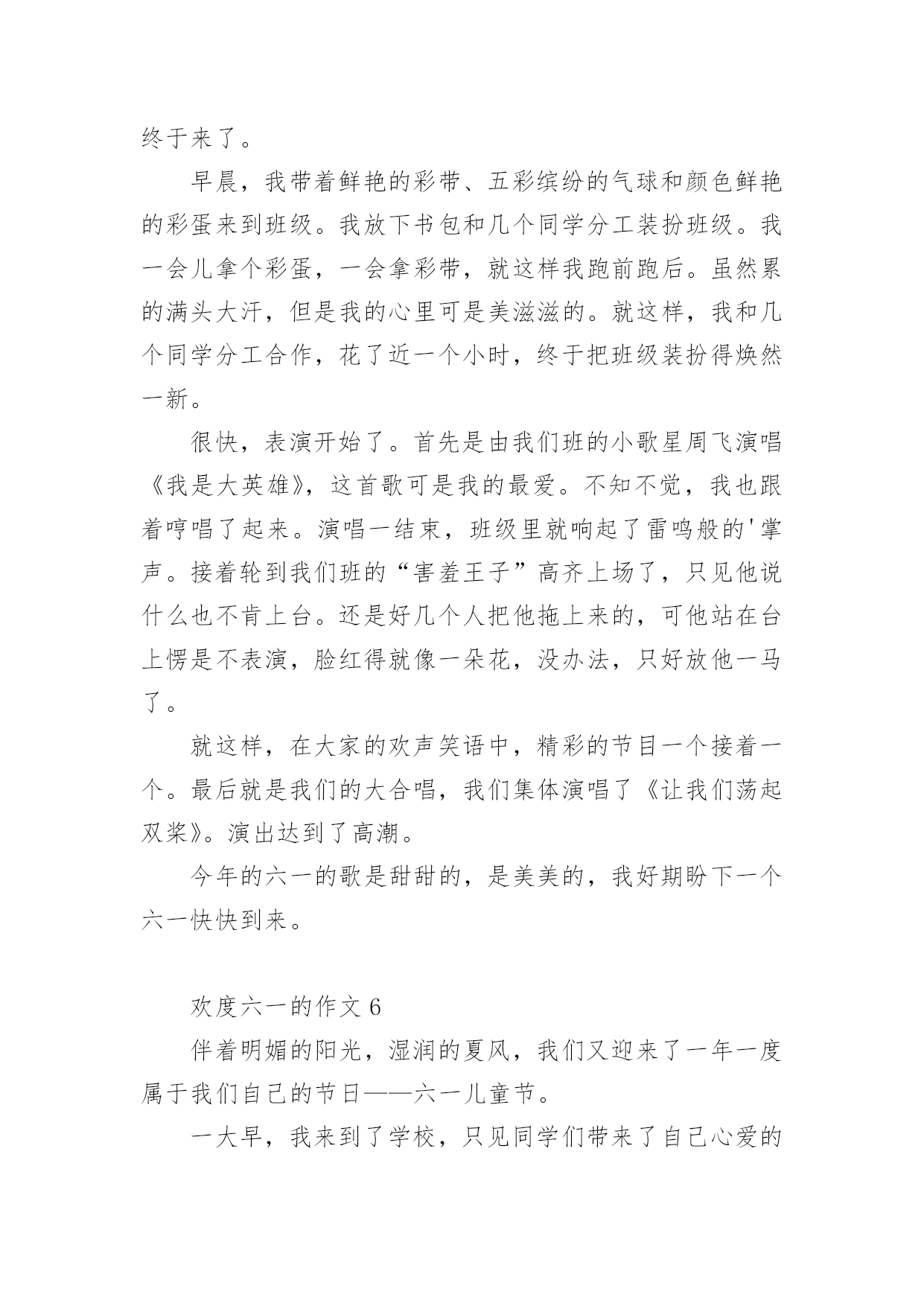 欢度六一的作文 欢度六一的作文(精选12篇)在现实生活或工作学习中,许多人都写过作文吧,借助作文可以提高我们的语言组织能力。你写作文时总是无从下笔?以下是小编帮大家整理的欢度六一的作文(精选12篇),仅供参考,欢迎大家阅读。欢度六一的作文1日月如梭,光阴似箭。我们盼望已久的六一儿童节终于到来了。儿童节是小朋友的节日,也是我最喜欢的日子。一大早,我穿着维吾尔族的服装来到了学校。我们学校今天要举行民族文化节开幕式,每个班都代表一个民族,我们班很荣幸地代表维吾尔族。因为,我们班正好来了一位新疆的客人老师——关老师,她将陪伴我们度过这快乐的六一儿童节,想想我就兴奋。一进教室,我就忍不住“哇!”地大叫一声,我看到大家的桌子已经被排成了两竖排,上面摆着各种各样的新疆美食,有:香喷喷的手抓饭,紫莹莹的大葡萄,黄橙橙的哈密瓜,脆生生的小香梨……看得我口水直流三千尺。我们班的曹征华妈妈和苏文涵妈妈一大早起来做手抓饭,我们的新疆老师手把手地指导,我们的家长们一大早来为我们布置教室,为我们化妆,父母老师的爱让我们的节日显得多么不同寻常啊。我们一边听着新疆名曲《欢乐地跳吧》,一边吃着美味的`新疆美食,在教室里载歌载舞。我们吃饱喝足了就继续到其他班级去品尝美食,有蒙古族的羊肉、朝鲜族的寿司、傣族的竹筒饭……我们体验了不同民族的风情,真是一场少数民族的盛会啊。这个六一儿童节,我们在学校体验了丰富多彩的民族文化生活,非常非常开心!我们都盼着明年的六一儿童节快点到来!欢度六一的作文2一次快乐而又盼望以久的“六一儿童节”终于来临了。为了欢庆“六一”儿童节,学校举行一次节目演出。我们班表演的是时装秀——《海洋的呼唤》。表演开始了,首先是螃蟹上台,“蟹妈妈”带着一群“蟹宝宝”张牙舞爪地走了出来,接下来就是我们海星表演,一开始,我的心怦怦直跳,比赛开始了,我的心情渐渐平静下来。我们四只来自深海的小海星,在闪耀的舞台灯光下翩翩起舞,灵龙活现的龙虾、乌龟以及鲜活的小水母都出现在舞台上,刹时舞台变成了海洋的世界。最有意思的还是渔民摊开渔网,开始捕鱼,我们演出的.同学个个以优美逼真的形象展现在舞台上……这次节目演出使我影响很深的还有五(3)班的“拉丁舞”他们以拉丁舞活力、奔放、激情,优美的舞姿在舞台魄力四射得演出……还有学校组织的小狐狸卖空气,也就是我印象极深,并赢得热烈的掌声……虽然“六一”节是短暂的,可是让我们小朋友度过了一个美好的时光……欢度六一的作文3一年一度的“六一”儿童节到了。我们都非常高兴。为了庆祝“六一”儿童节,我们在教室里举行了一场别开重于泰山的庆祝会。我们穿着整齐的校服,带着鲜艳的红领巾,兴致勃勃地来到了教室。上课铃响了,罗老师来了,她叫我们把桌子围成一圈,中间留一块空地当作我们的舞台。精彩的演出拉开了帷幕,陈涵杨是节目主持人。节目精彩纷呈,有的同学表演唱歌、有的跳舞、还有朗诵诗歌的……最引人注目的是余钦鼎带来的跆拳道,只见他一脚踢到头顶,大家都为他的精彩表演鼓掌,我对他的表演惊叹不已!陈涵杨宣布演出结束后,老师拿出一个蛋糕,告诉我们今天是刘勇志的生日。当老师打开蛋糕盒,一个双层大蛋糕出现在我们的.眼前,我们都兴奋地“哇”的大叫起来。接着我们大家一起唱生日歌,祝刘勇志生日快乐。然后,罗老师把蛋糕切开,刘勇志疳蛋糕分给我们吃,蛋糕的味道真美啊!我一连吃了两块。“六一”儿童节是欢乐的,又是短暂的,我愿把它永远留在我的记忆里。欢度六一的作文4今天是“六一”儿童节,是我们的节日,张老师和姜老师决定让我们在教室好好地玩一玩。早上,我怀着愉快的心情走向学校……一到教室里,发现同学早已坐好了,个个脸上面带笑容,教室里充满了欢乐的气氛,我赶紧找了一个地方坐下来,这时,张老师健步走上讲台,向我们宣布:“我宣布五(5)中队庆“六一”活动正式开始!”说完,台下响起了一片热烈的掌声,张老师接着说:“下面开始玩第一个游戏。”老师交代了一下游戏规则,这个游戏叫“蛋蹲”有鸡蛋、鸭蛋、鹅蛋、鸟蛋、蛇蛋、傻蛋这七个蛋,老师说:“鸡蛋蹲。”鸡蛋就要跟着说;“鸡蛋蹲,鸡蛋蹲,鸡蛋蹲完鸭蛋蹲。”一边说一边蹲,鸭蛋也要跟着说其它的.蛋……老师选了七个同学上了讲台,给每人一张写有蛋的纸,每人把纸拿在手中,老师说:“傻蛋蹲.”林晨迅速地反应了过来跟着说:“傻蛋蹲,傻蛋蹲,傻蛋蹲完鹅蛋蹲。”鹅蛋立即跟着林晨往下说……一会儿,一个同学忘记自己的蛋了,下了台,一会儿,又有两个同学下了台,比赛越来越激烈了,同学们瞪大眼睛竖起耳朵观看,最后,张笑在一片热烈的掌声中荣登了冠军的宝座。这次联欢会不仅使我们开心,而且促进了同学之间的友谊。欢度六一的作文5光阴似箭,日月如梭。我们盼望已久的六一国际儿童节终于来了。早晨,我带着鲜艳的彩带、五彩缤纷的气球和颜色鲜艳的彩蛋来到班级。我放下书包和几个同学分工装扮班级。我一会