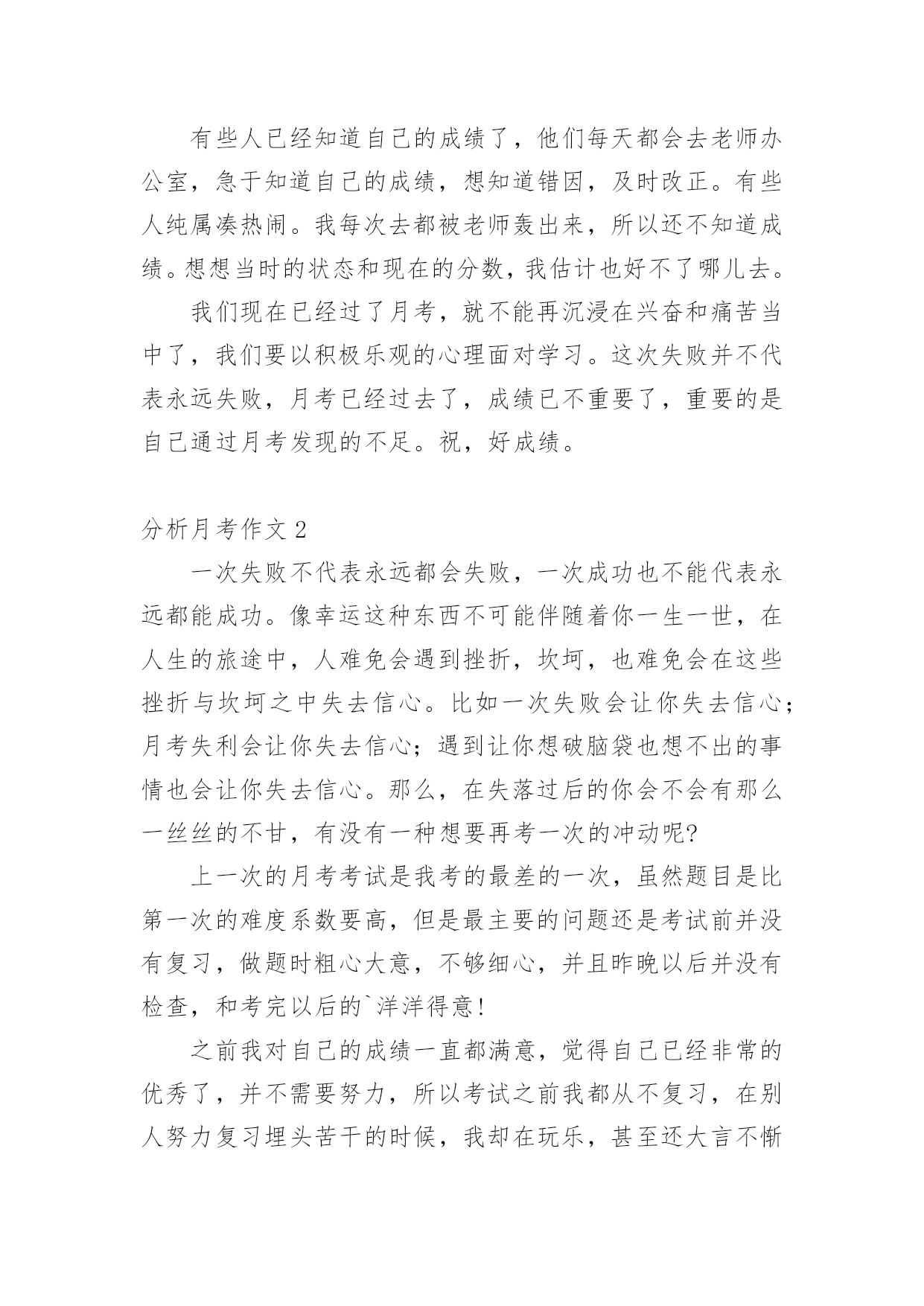 分析月考作文 分析月考作文2篇在日常学习、工作或生活中,大家总免不了要接触或使用作文吧,作文是人们以书面形式表情达意的言语活动。作文的注意事项有许多,你确定会写吗?以下是小编整理的分析月考作文,希望对大家有所帮助。分析月考作文1一个月都过去了,月考也过去了,真快。现在知道自己月考成绩不好的同学,在怎么懊悔也没用了,都应经过去了,如果要怪,也只能怪自己考试时的状态。状态好坏是两码事,它会直接影响到你的成绩。状态好,是你好好复习,认真检查,这是付出,既然是付出就一定有回报,哪怕只有一点点,也要争取。状态不好,就是在别人复习时,自己在玩,别人比自己多学一点,考试时遇到没复习到的重点,不是一定不会,那肯定也有点迷糊。虽然成绩没发,但我们通过考试前和当时的状态,考试成绩可想而知。复习时,用功的好坏也会影响成绩。有些人说,我在家里把所有课本都读了多遍,为什么考得还是这么烂。有些人又说,我在家里只是认认真真的复习了一遍,考得还不错。这可不是侥幸,有些人虽然读了多遍,但他们并没有用功,根本是在应付。而另一种是在用心想把这个重点记住弄会。所以大家复习时一定用功,不然作用很小。有些人已经知道自己的成绩了,他们每天都会去老师办公室,急于知道自己的成绩,想知道错因,及时改正。有些人纯属凑热闹。我每次去都被老师轰出来,所以还不知道成绩。想想当时的状态和现在的分数,我估计也好不了哪儿去。我们现在已经过了月考,就不能再沉浸在兴奋和痛苦当中了,我们要以积极乐观的心理面对学习。这次失败并不代表永远失败,月考已经过去了,成绩已不重要了,重要的是自己通过月考发现的不足。祝,好成绩。分析月考作文2一次失败不代表永远都会失败,一次成功也不能代表永远都能成功。像幸运这种东西不可能伴随着你一生一世,在人生的旅途中,人难免会遇到挫折,坎坷,也难免会在这些挫折与坎坷之中失去信心。比如一次失败会让你失去信心;月考失利会让你失去信心;遇到让你想破脑袋也想不出的事情也会让你失去信心。那么,在失落过后的你会不会有那么一丝丝的不甘,有没有一种想要再考一次的冲动呢?上一次的月考考试是我考的最差的一次,虽然题目是比第一次的难度系数要高,但是最主要的问题还是考试前并没有复习,做题时粗心大意,不够细心,并且昨晚以后并没有检查,和考完以后的`洋洋得意!之前我对自己的成绩一直都满意,觉得自己已经非常的优秀了,并不需要努力,所以考试之前我都从不复习,在别人努力复习埋头苦干的时候,我却在玩乐,甚至还大言不惭的要和同学比试,因为那个人的学习底子不如我的那么足,所以我就对他说,以25分为界限,多余25分,我赢,少于25分,他赢。当初立下这个约定的时候,我承认,我是有压力的,但是我的自信心让我觉得他不可能考过我,那怕是25分的差距。但是,现实就是这样,就是这么的残酷。在试卷发下来的那一刻,我傻眼了,因为只有一科是及格的,但及格的那一科也在及格线的怀抱中徘徊,那个与我比试的那个人与我相差了15分,我感觉到非常的失落。