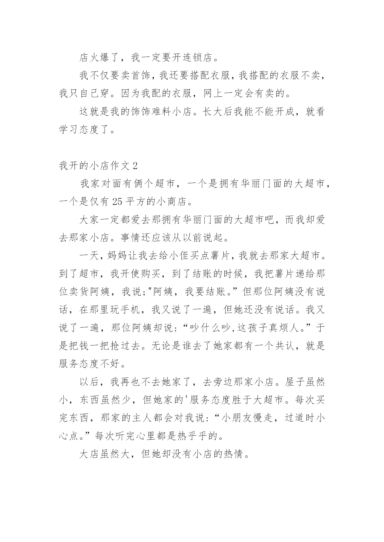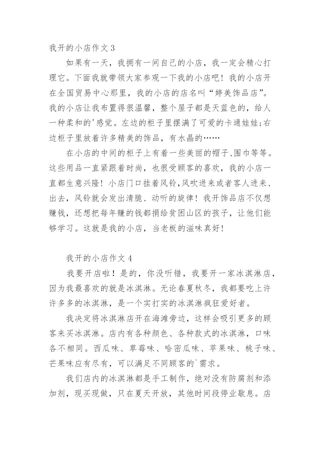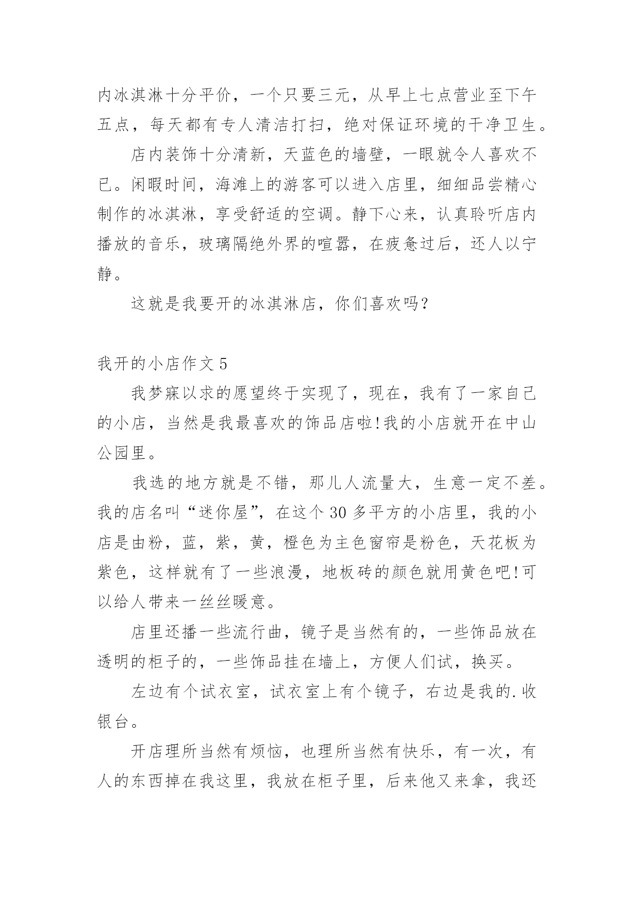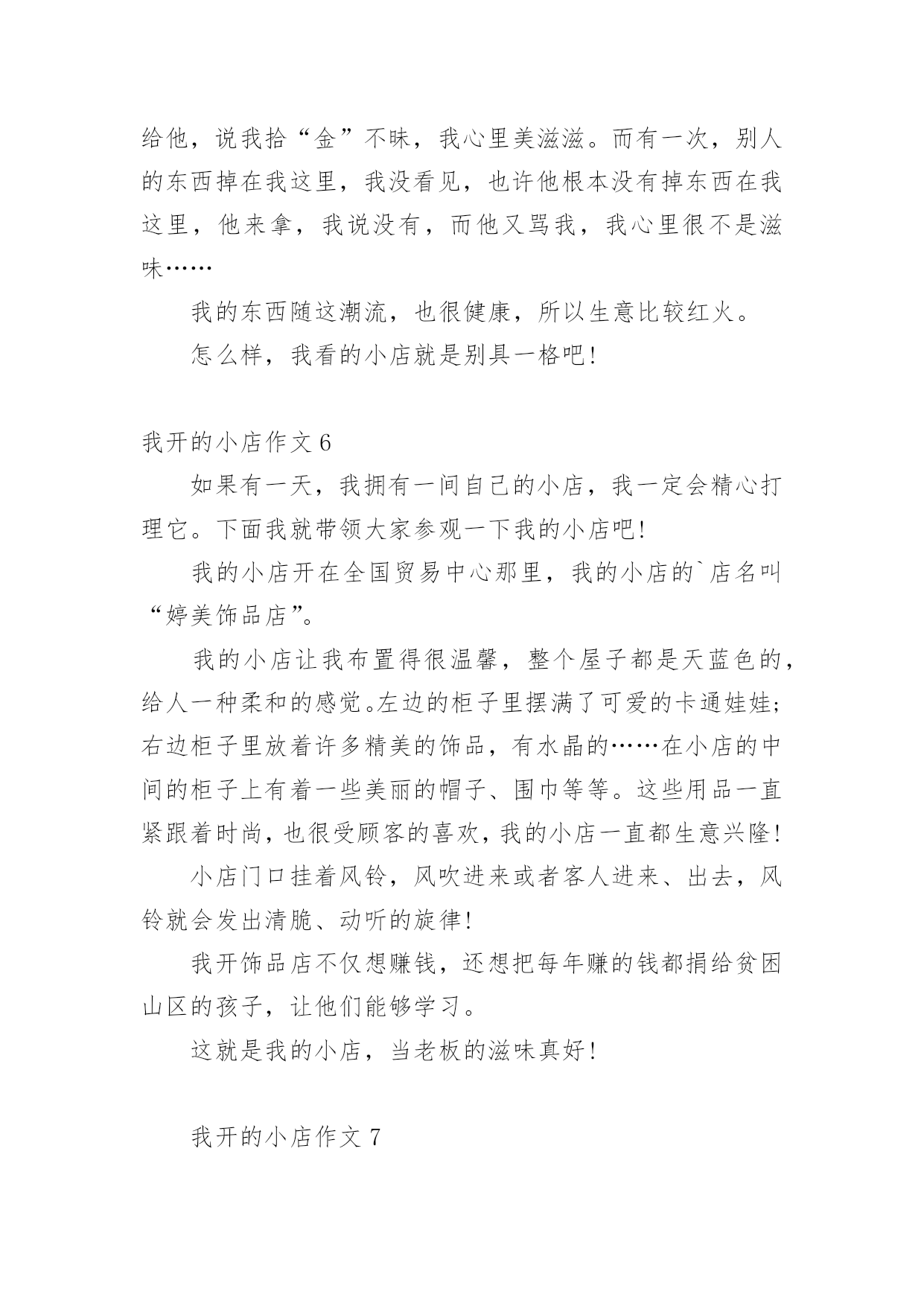 我开的小店作文 我开的小店作文9篇【通用】在日常学习、工作或生活中,大家都经常看到作文的身影吧,借助作文可以提高我们的语言组织能力。相信很多朋友都对写作文感到非常苦恼吧,下面是小编整理的我开的小店作文,希望能够帮助到大家。我开的小店作文1假如我有一家店,我一定要开一家服饰店,名叫“饰饰难料”。我是一个拥有超强的想象力的人,我设计的首饰品一定是这个世界上的独一无二的首饰,如果有人和我设计的首饰品大同小异的话,那要么是他抄袭我的,要么是我们的思雏和想象力也会是大同小异的`了。所以此时的你一定知道我为什么开这家“饰饰难料”了吧?每一件饰品都难以料到,这更是我对这象应的期望了吧。我设计的首饰,一定要让所有人都能买的起,因为首饰不在于贵重,而是衬托一个人的气质的工具。我的店铺一定要开在某一城市最中心的商业街上,我知道这个房子一定不便宜,但我可以买一个小一点的店铺。我要把它装得高冷一些,这样才更能体现出饰品的效果,我不管打造它用多少金钱,但我但要用出厂价加上100百元售出。如果我的店火爆了,我一定要开连锁店。我不仅要卖首饰,我还要搭配衣服,我搭配的衣服不卖,我只自己穿。因为我配的衣服,网上一定会有卖的。这就是我的饰饰难料小店。长大后我能不能开成,就看学习态度了。我开的小店作文2我家对面有俩个超市,一个是拥有华丽门面的大超市,一个是仅有25平方的小商店。大家一定都爱去那拥有华丽门面的大超市吧,而我却爱去那家小店。事情还应该从以前说起。一天,妈妈让我去给小侄买点薯片,我就去那家大超市。到了超市,我开使购买,到了结账的时候,我把薯片递给那位卖货阿姨,我说;"阿姨,我要结账。”但那位阿姨没有说话,在那里玩手机,我又说了一遍,但她还没有说话。我又说了一遍,那位阿姨却说:“吵什么吵,这孩子真烦人。”于是把钱一把抢过去。无论是谁去了她家都有一个共认,就是服务态度不好。以后,我再也不去她家了,去旁边那家小店。屋子虽然小,东西虽然少,但她家的'服务态度胜于大超市。每次买完东西,那家的主人都会对我说:“小朋友慢走,过道时小心点。”每次听完心里都是热乎乎的。大店虽然大,但她却没有小店的热情。我开的小店作文3如果有一天,我拥有一间自己的小店,我一定会精心打理它。下面我就带领大家参观一下我的小店吧!我的小店开在全国贸易中心那里,我的小店的店名叫“婷美饰品店”。我的小店让我布置得很温馨,整个屋子都是天蓝色的,给人一种柔和的'感觉。左边的柜子里摆满了可爱的卡通娃娃;右边柜子里放着许多精美的饰品,有水晶的……在小店的中间的柜子上有着一些美丽的帽子、围巾等等。这些用品一直紧跟着时尚,也很受顾客的喜欢,我的小店一直都生意兴隆!小店门口挂着风铃,风吹进来或者客人进来、出去,风铃就会发出清脆、动听的旋律!我开饰品店不仅想赚钱,还想把每年赚的钱都捐给贫困山区的孩子,让他们能够学习。这就是我的小店,当老板的滋味真好!我开的小店作文4我要开店啦!是的,你没听错,我要开一家冰淇淋店,因为我最喜欢的就是冰淇淋。无论春夏秋冬,我都要吃上许许多多的冰淇淋,是一个实打实的冰淇淋疯狂爱好者。我决定将冰淇淋店开在海滩旁边,这样会吸引更多的顾客来买冰淇淋。店内有各种颜色、各种款式的冰淇淋,口味各不相同。西瓜味、草莓味、哈密瓜味、苹果味、桃子味、芒果味应有尽有,可以满足不同顾客的`需求。我们店内的冰淇淋都是手工制作,绝对没有防腐剂和添加剂,现买现做,只在夏天开放,其他时间段停业歇息。店内冰淇淋十分平价,一个只要三元,从早上七点营业至下午五点,每天都有专人清洁打扫,绝对保证环境的干净卫生。店内装饰十分清新,天蓝色的墙壁,一眼就令人喜欢不已。闲暇时间,海滩上的游客可以进入店里,细细品尝精心制作的冰淇淋,享受舒适的空调。静下心来,认真聆听店内播放的音乐,玻璃隔绝外界的喧嚣,在疲惫过后,还人以宁静。这就是我要开的冰淇淋店,你们喜欢吗?我开的小店作文5我梦寐以求的愿望终于实现了,现在,我有了一家自己的小店,当然是我最喜欢的饰品店啦!我的小店就开在中山公园里。我选的地方就是不错,那儿人流量大,生意一定不差。我的店名叫“迷你屋”,在这个30多平方的小店里,我的小店是由粉,蓝,紫,黄,橙色为主色窗帘是粉色,天花板为紫色,这样就有了一些浪漫,地板砖的颜色就用黄色吧!可以给人带来一丝丝暖意。店里还播一些流行曲,镜子是当然有的,一些饰品放在透明的柜子的,一些饰品挂在墙上,方便人们试,换买。左边有个试衣室,试衣室上有个镜子,右边是我的.收银台。开店理所当然有烦恼,也理所当然有快乐,有一次,有人的东西掉在我这里,我放在柜子里,后来他又来拿,我还给他,说我拾“金”不昧,我心里美滋滋。而有一次,别人的东西掉在我这里,我没看见,也许他根本没有掉东西在我这里,他来拿,我说没有,而他又骂我,我心里很不是滋味……我的东西随这潮流,也很健