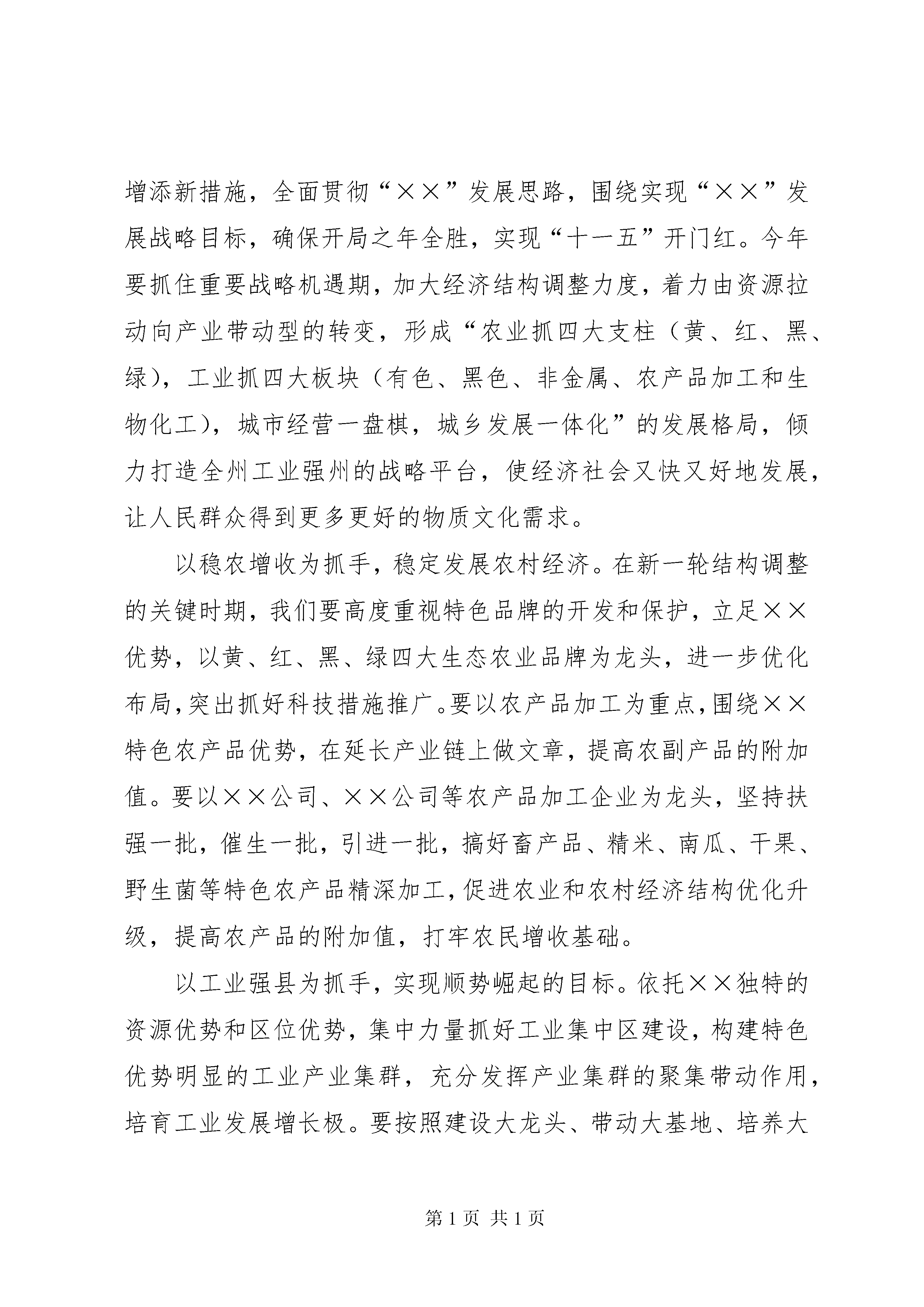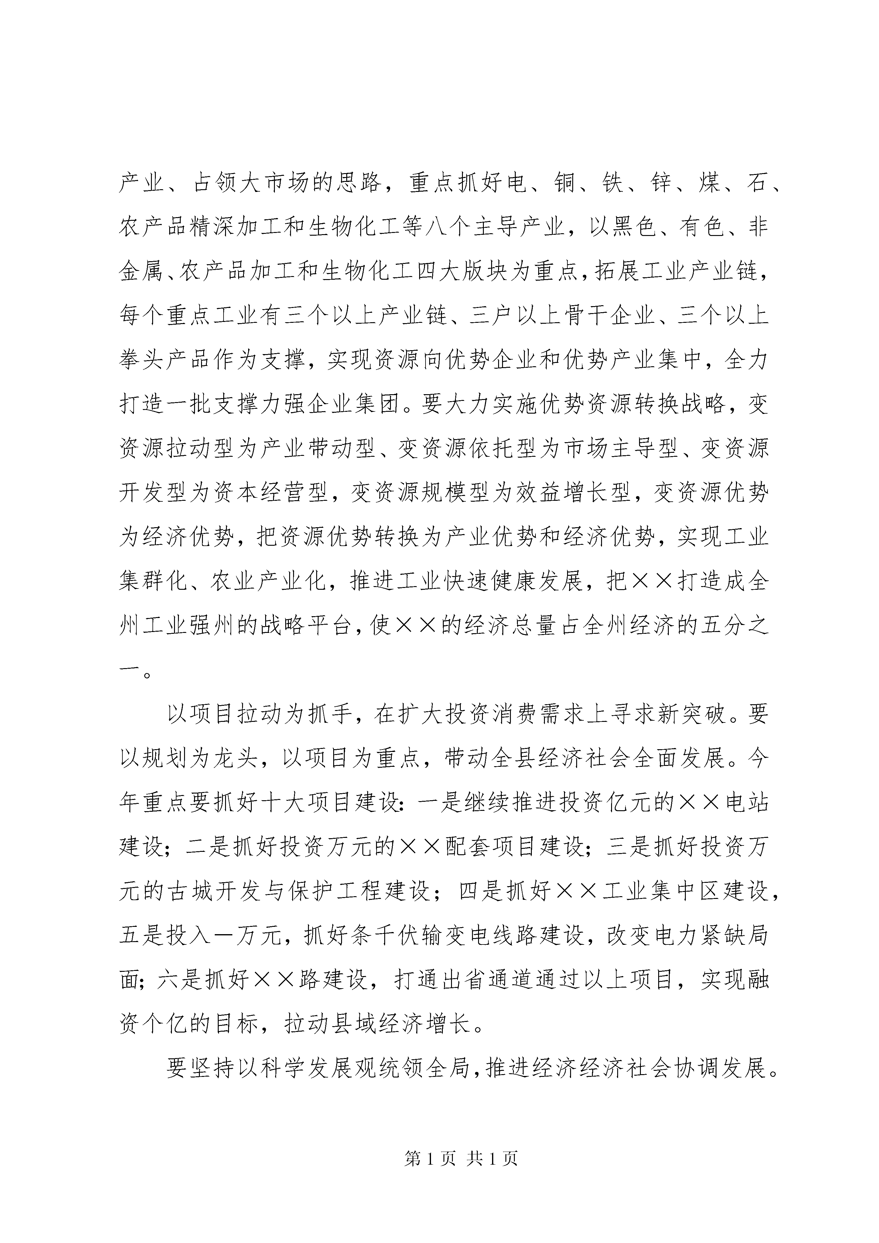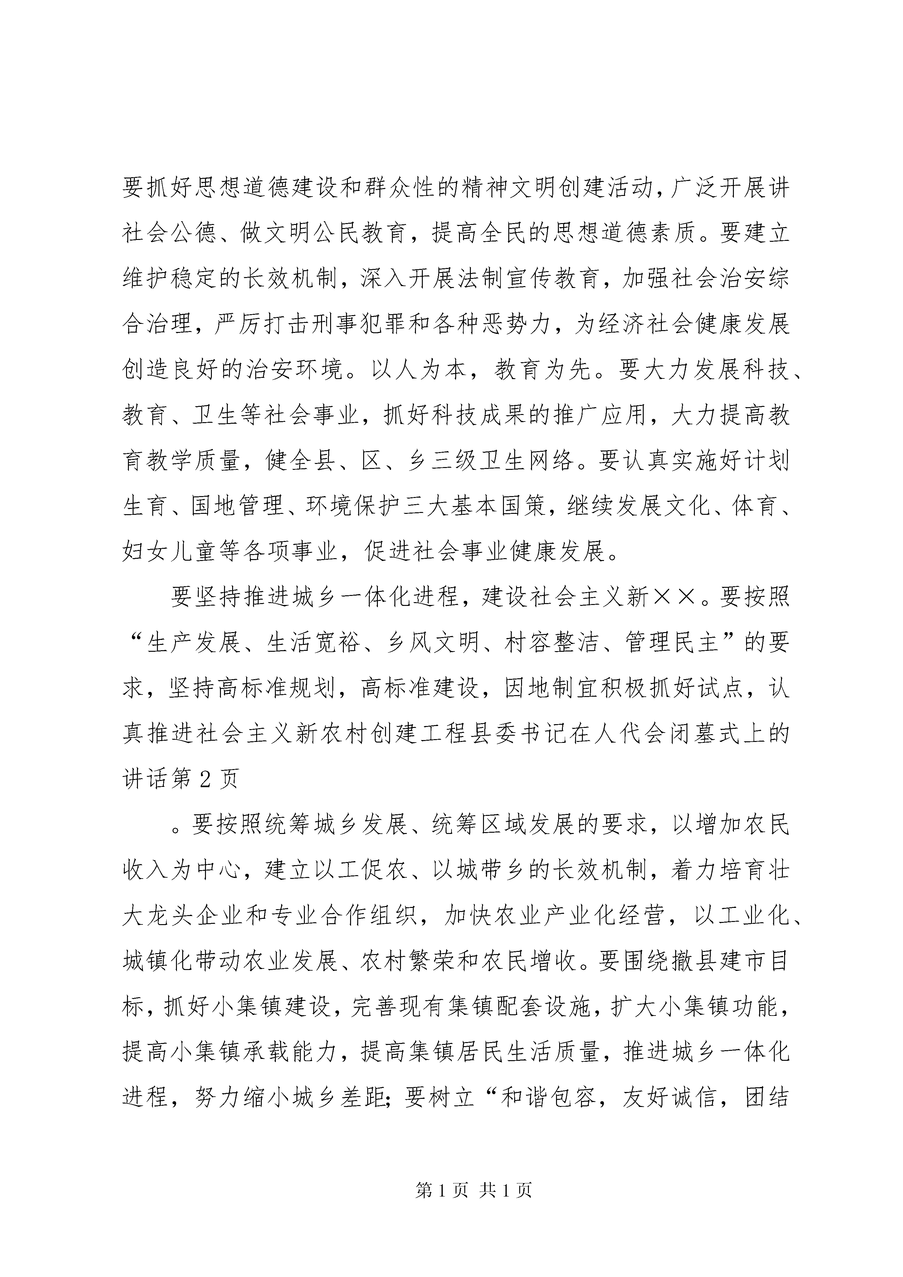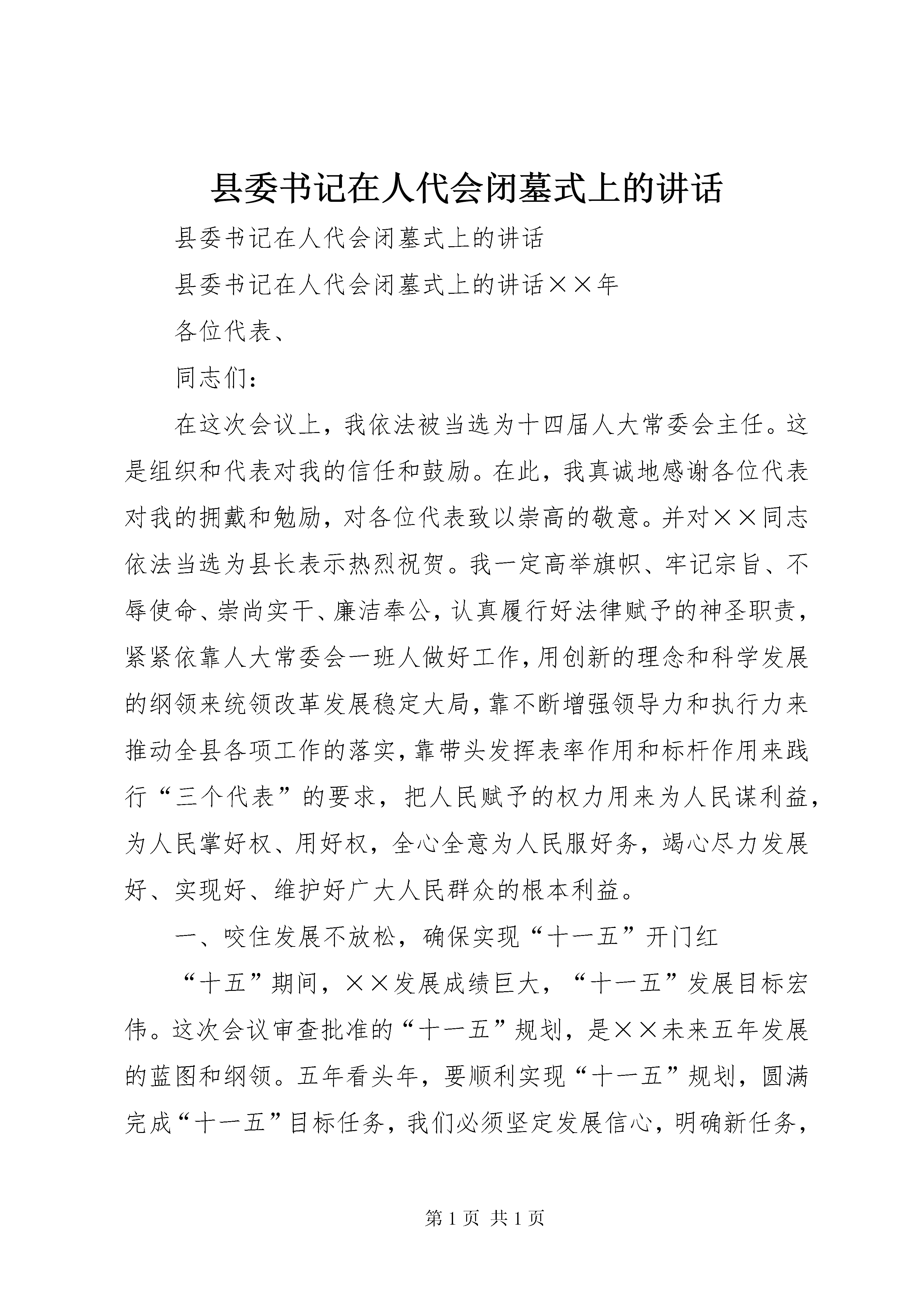 县委书记在人代会闭墓式上的讲话县委书记在人代会闭墓式上的讲话县委书记在人代会闭墓式上的讲话××年各位代表、同志们:在这次会议上,我依法被当选为十四届人大常委会主任。这是组织和代表对我的信任和鼓励。在此,我真诚地感谢各位代表对我的拥戴和勉励,对各位代表致以崇高的敬意。并对××同志依法当选为县长表示热烈祝贺。我一定高举旗帜、牢记宗旨、不辱使命、崇尚实干、廉洁奉公,认真履行好法律赋予的神圣职责,紧紧依靠人大常委会一班人做好工作,用创新的理念和科学发展的纲领来统领改革发展稳定大局,靠不断增强领导力和执行力来推动全县各项工作的落实,靠带头发挥表率作用和标杆作用来践行“三个代表”的要求,把人民赋予的权力用来为人民谋利益,为人民掌好权、用好权,全心全意为人民服好务,竭心尽力发展好、实现好、维护好广大人民群众的根本利益。一、咬住发展不放松,确保实现“十一五”开门红“十五”期间,××发展成绩巨大,“十一五”发展目标宏伟。这次会议审查批准的“十一五”规划,是××未来五年发展的蓝图和纲领。五年看头年,要顺利实现“十一五”规划,圆满完成“十一五”目标任务,我们必须坚定发展信心,明确新任务,增添新措施,全面贯彻“××”发展思路,围绕实现“××”发展战略目标,确保开局之年全胜,实现“十一五”开门红。今年要抓住重要战略机遇期,加大经济结构调整力度,着力由资源拉动向产业带动型的转变,形成“农业抓四大支柱(黄、红、黑、绿),工业抓四大板块(有色、黑色、非金属、农产品加工和生物化工),城市经营一盘棋,城乡发展一体化”的发展格局,倾力打造全州工业强州的战略平台,使经济社会又快又好地发展,让人民群众得到更多更好的物质文化需求。以稳农增收为抓手,稳定发展农村经济。在新一轮结构调整的关键时期,我们要高度重视特色品牌的开发和保护,立足××优势,以黄、红、黑、绿四大生态农业品牌为龙头,进一步优化布局,突出抓好科技措施推广。要以农产品加工为重点,围绕××特色农产品优势,在延长产业链上做文章,提高农副产品的附加值。要以××公司、××公司等农产品加工企业为龙头,坚持扶强一批,催生一批,引进一批,搞好畜产品、精米、南瓜、干果、野生菌等特色农产品精深加工,促进农业和农村经济结构优化升级,提高农产品的附加值,打牢农民增收基础。以工业强县为抓手,实现顺势崛起的目标。依托××独特的资源优势和区位优势,集中力量抓好工业集中区建设,构建特色优势明显的工业产业集群,充分发挥产业集群的聚集带动作用,培育工业发展增长极。要按照建设大龙头、带动大基地、培养大产业、占领大市场的思路,重点抓好电、铜、铁、锌、煤、石、农产品精深加工和生物化工等八个主导产业,以黑色、有色、非金属、农产品加工和生物化工四大版块为重点,拓展工业产业链,每个重点工业有三个以上产业链、三户以上骨干企业、三个以上拳头产品作为支撑,实现资源向优势企业和优势产业集中,全力打造一批支撑力强企业集团。要大力实施优势资源转换战略,变资源拉动型为产业带动型、变资源依托型为市场主导型、变资源开发型为资本经营型,变资源规模型为效益增长型,变资源优势为经济优势,把资源优势转换为产业优势和经济优势,实现工业集群化、农业产业化,推进工业快速健康发展,把××打造成全州工业强州的战略平台,使××的经济总量占全州经济的五分之一。以项目拉动为抓手,在扩大投资消费需求上寻求新突破。要以规划为龙头,以项目为重点,带动全县经济社会全面发展。今年重点要抓好十大项目建设:一是继续推进投资亿元的××电站建设;二是抓好投资万元的××配套项目建设;三是抓好投资万元的古城开发与保护工程建设;四是抓好××工业集中区建设,五是投入-万元,抓好条千伏输变电线路建设,改变电力紧缺局面;六是抓好××路建设,打通出省通道通过以上项目,实现融资个亿的目标,拉动县域经济增长。要坚持以科学发展观统领全局,推进经济经济社会协调发展。要抓好思想道德建设和群众性的精神文明创建活动,广泛开展讲社会公德、做文明公民教育,提高全民的思想道德素质。要建立维护稳定的长效机制,深入开展法制宣传教育,加强社会治安综合治理,严厉打击刑事犯罪和各种恶势力,为经济社会健康发展创造良好的治安环境。以人为本,教育为先。要大力发展科技、教育、卫生等社会事业,抓好科技成果的推广应用,大力提高教育教学质量,健全县、区、乡三级卫生网络。要认真实施好计划生育、国地管理、环境保护三大基本国策,继续发展文化、体育、妇女儿童等各项事业,促进社会事业健康发展。要坚持推进城乡一体化进程,建设社会主义新××。要按照“生产发展、生活宽裕、乡风文明、村容整洁、管理民主”的要求,坚持高标准规划,高标准建设,因地制宜积极抓好试点,认真推进社会主义新农村创建工程县委书记在人代会闭墓式上的讲话。要按照统筹城乡发展、统筹区域发展的要