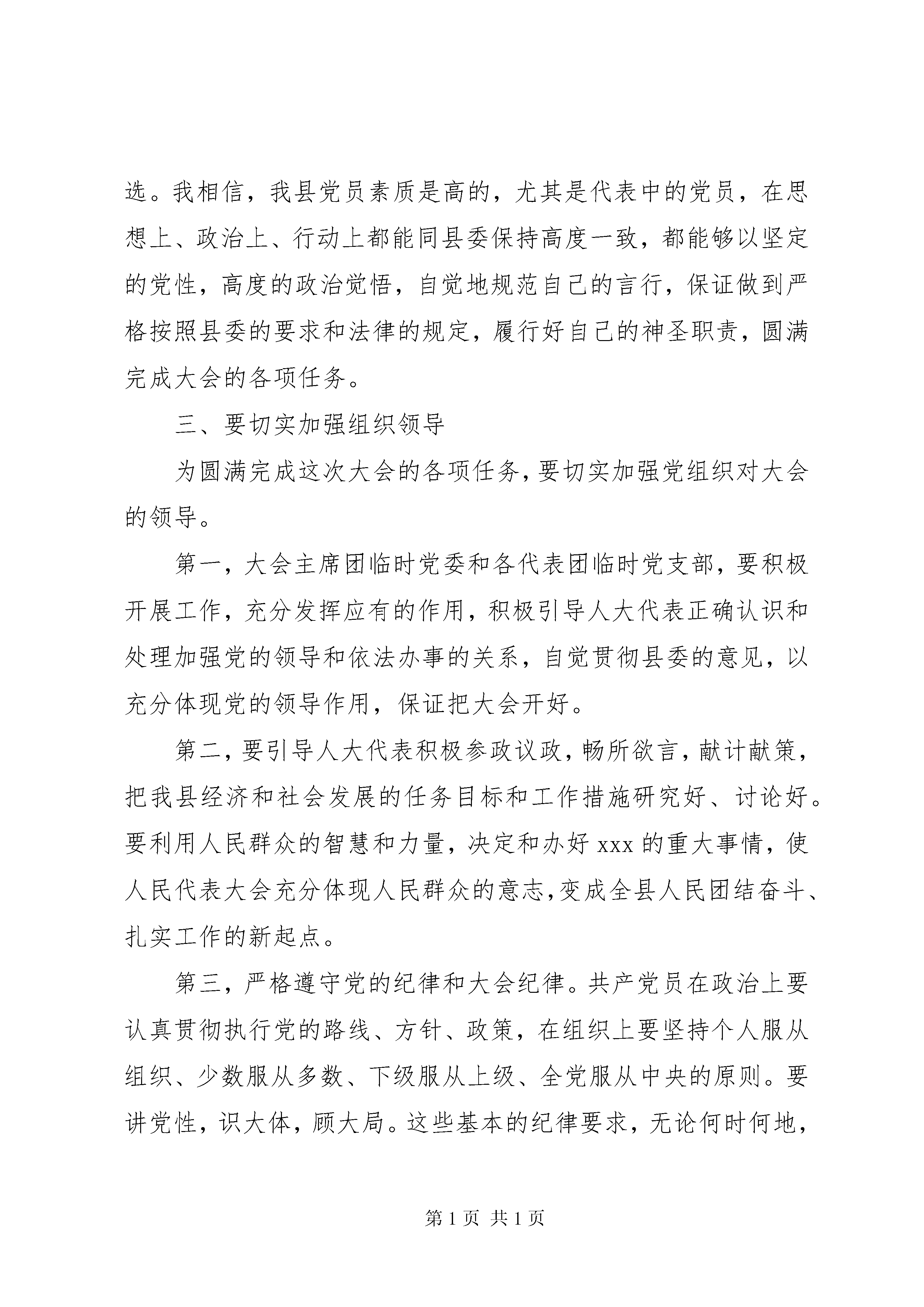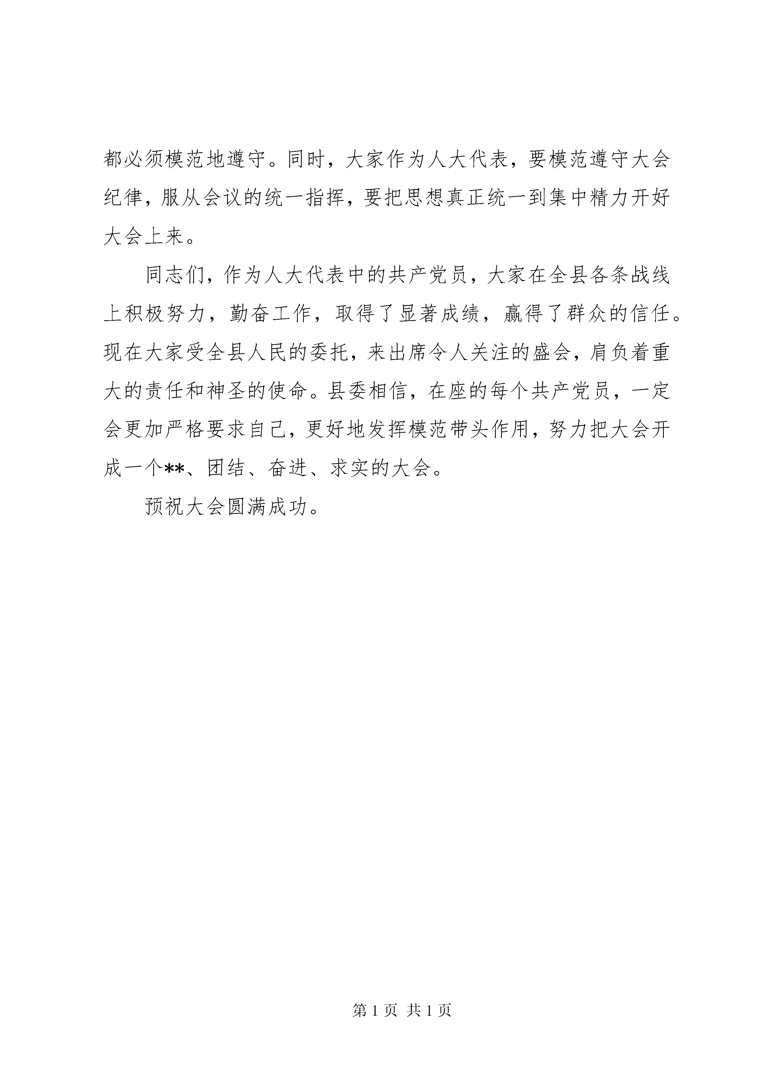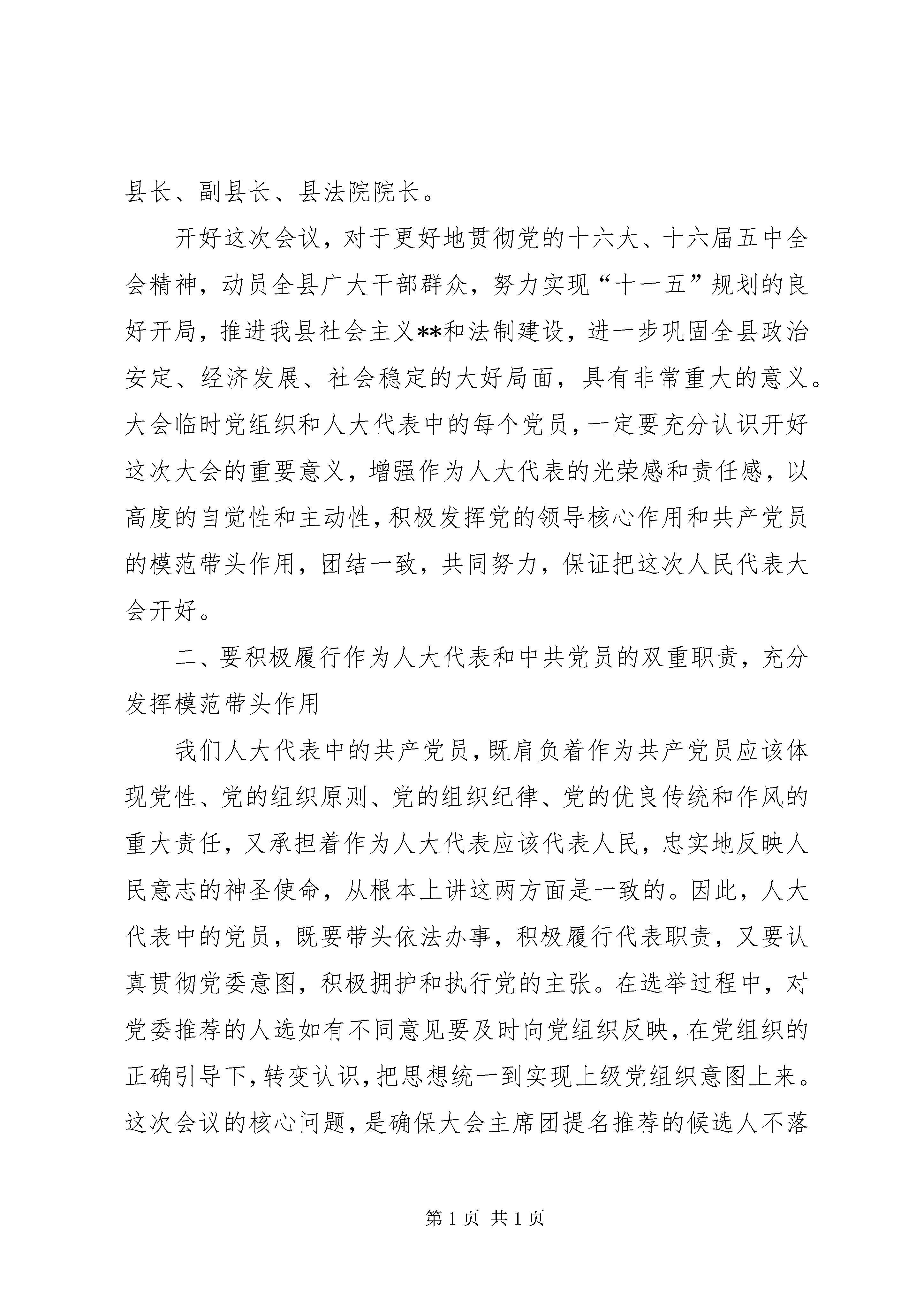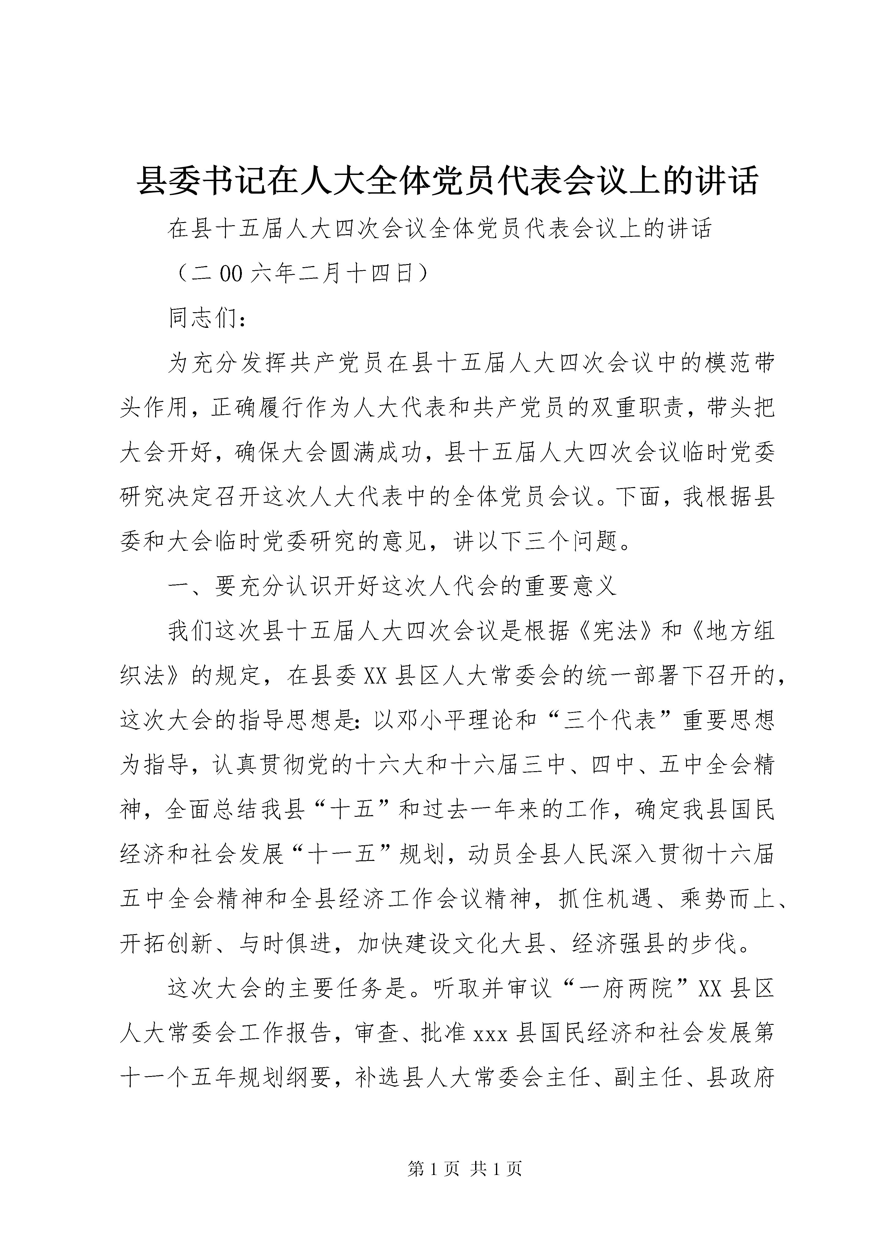县委书记在人大全体党员代表会议上的讲话在县十五届人大四次会议全体党员代表会议上的讲话(二00六年二月十四日)同志们:为充分发挥共产党员在县十五届人大四次会议中的模范带头作用,正确履行作为人大代表和共产党员的双重职责,带头把大会开好,确保大会圆满成功,县十五届人大四次会议临时党委研究决定召开这次人大代表中的全体党员会议。下面,我根据县委和大会临时党委研究的意见,讲以下三个问题。一、要充分认识开好这次人代会的重要意义我们这次县十五届人大四次会议是根据《宪法》和《地方组织法》的规定,在县委XX县区人大常委会的统一部署下召开的,这次大会的指导思想是:以邓小平理论和“三个代表”重要思想为指导,认真贯彻党的十六大和十六届三中、四中、五中全会精神,全面总结我县“十五”和过去一年来的工作,确定我县国民经济和社会发展“十一五”规划,动员全县人民深入贯彻十六届五中全会精神和全县经济工作会议精神,抓住机遇、乘势而上、开拓创新、与时俱进,加快建设文化大县、经济强县的步伐。这次大会的主要任务是。听取并审议“一府两院”XX县区人大常委会工作报告,审查、批准xxx县国民经济和社会发展第十一个五年规划纲要,补选县人大常委会主任、副主任、县政府县长、副县长、县法院院长。开好这次会议,对于更好地贯彻党的十六大、十六届五中全会精神,动员全县广大干部群众,努力实现“十一五”规划的良好开局,推进我县社会主义**和法制建设,进一步巩固全县政治安定、经济发展、社会稳定的大好局面,具有非常重大的意义。大会临时党组织和人大代表中的每个党员,一定要充分认识开好这次大会的重要意义,增强作为人大代表的光荣感和责任感,以高度的自觉性和主动性,积极发挥党的领导核心作用和共产党员的模范带头作用,团结一致,共同努力,保证把这次人民代表大会开好。二、要积极履行作为人大代表和中共党员的双重职责,充分发挥模范带头作用我们人大代表中的共产党员,既肩负着作为共产党员应该体现党性、党的组织原则、党的组织纪律、党的优良传统和作风的重大责任,又承担着作为人大代表应该代表人民,忠实地反映人民意志的神圣使命,从根本上讲这两方面是一致的。因此,人大代表中的党员,既要带头依法办事,积极履行代表职责,又要认真贯彻党委意图,积极拥护和执行党的主张。在选举过程中,对党委推荐的人选如有不同意见要及时向党组织反映,在党组织的正确引导下,转变认识,把思想统一到实现上级党组织意图上来。这次会议的核心问题,是确保大会主席团提名推荐的候选人不落选。我相信,我县党员素质是高的,尤其是代表中的党员,在思想上、政治上、行动上都能同县委保持高度一致,都能够以坚定的党性,高度的政治觉悟,自觉地规范自己的言行,保证做到严格按照县委的要求和法律的规定,履行好自己的神圣职责,圆满完成大会的各项任务。三、要切实加强组织领导为圆满完成这次大会的各项任务,要切实加强党组织对大会的领导。第一,大会主席团临时党委和各代表团临时党支部,要积极开展工作,充分发挥应有的作用,积极引导人大代表正确认识和处理加强党的领导和依法办事的关系,自觉贯彻县委的意见,以充分体现党的领导作用,保证把大会开好。第二,要引导人大代表积极参政议政,畅所欲言,献计献策,把我县经济和社会发展的任务目标和工作措施研究好、讨论好。要利用人民群众的智慧和力量,决定和办好xxx的重大事情,使人民代表大会充分体现人民群众的意志,变成全县人民团结奋斗、扎实工作的新起点。第三,严格遵守党的纪律和大会纪律。共产党员在政治上要认真贯彻执行党的路线、方针、政策,在组织上要坚持个人服从组织、少数服从多数、下级服从上级、全党服从中央的原则。要讲党性,识大体,顾大局。这些基本的纪律要求,无论何时何地,都必须模范地遵守。同时,大家作为人大代表,要模范遵守大会纪律,服从会议的统一指挥,要把思想真正统一到集中精力开好大会上来。同志们,作为人大代表中的共产党员,大家在全县各条战线上积极努力,勤奋工作,取得了显著成绩,赢得了群众的信任。现在大家受全县人民的委托,来出席令人关注的盛会,肩负着重大的责任和神圣的使命。县委相信,在座的每个共产党员,一定会更加严格要求自己,更好地发挥模范带头作用,努力把大会开成一个**、团结、奋进、求实的大会。预祝大会圆满成功。