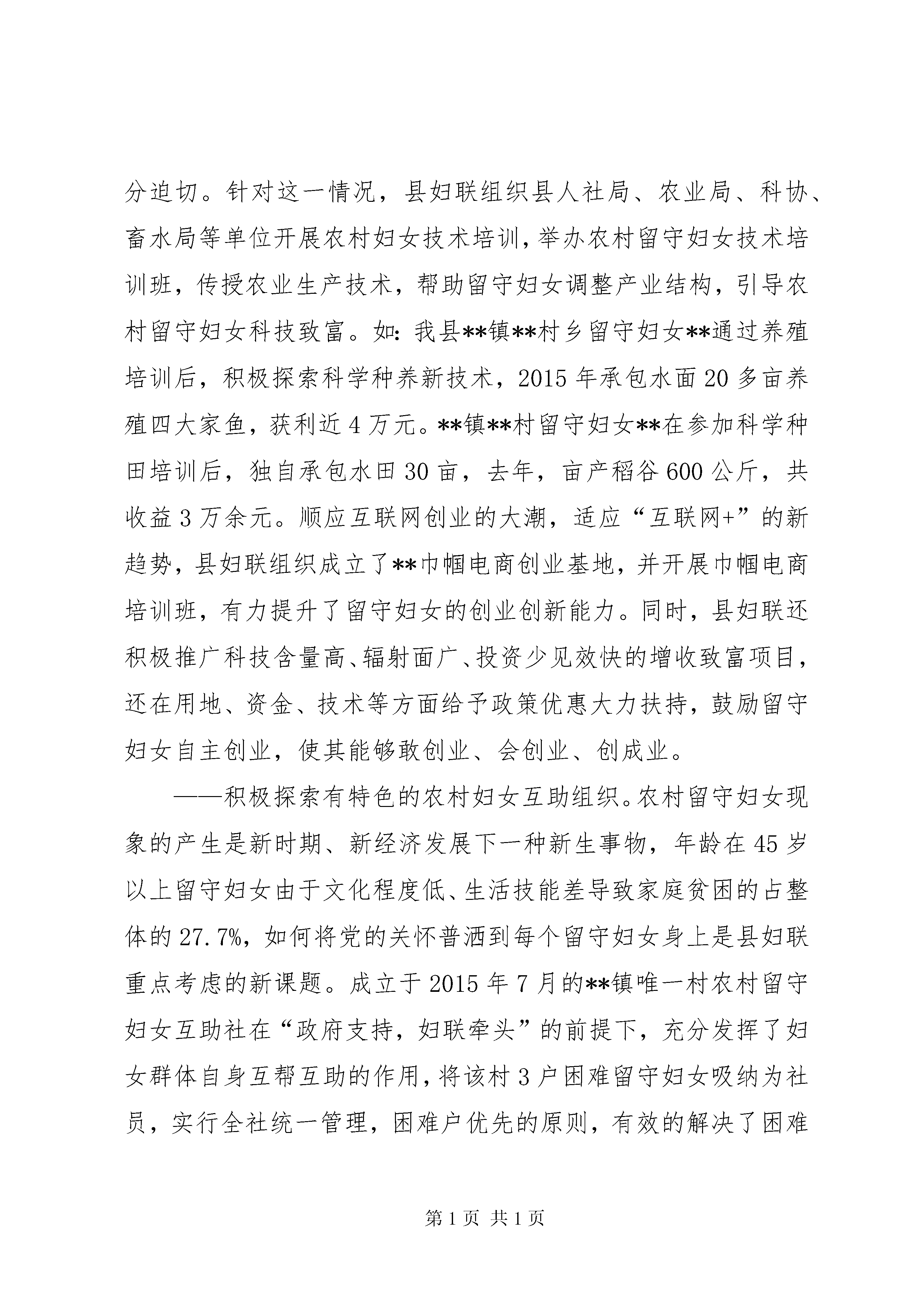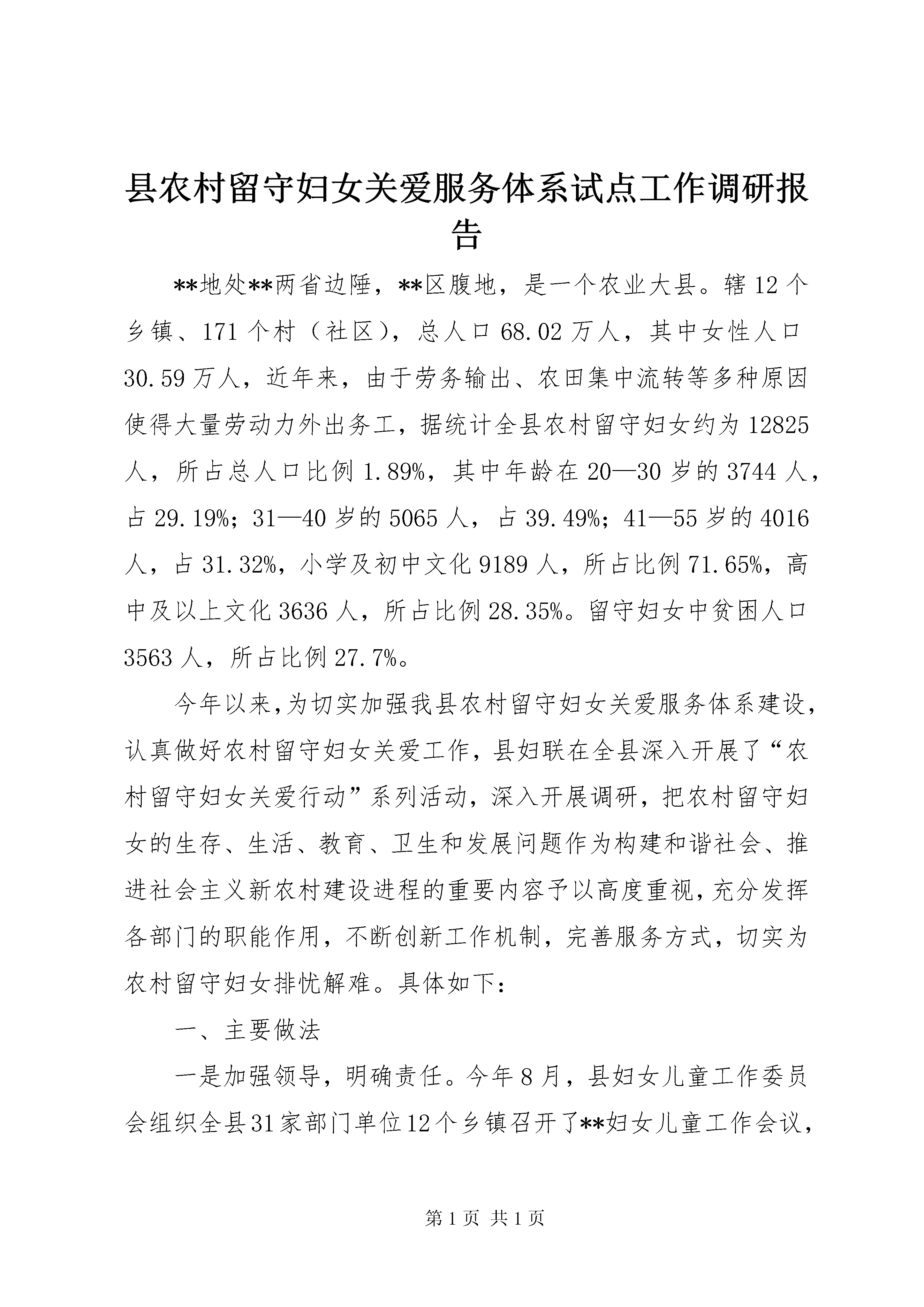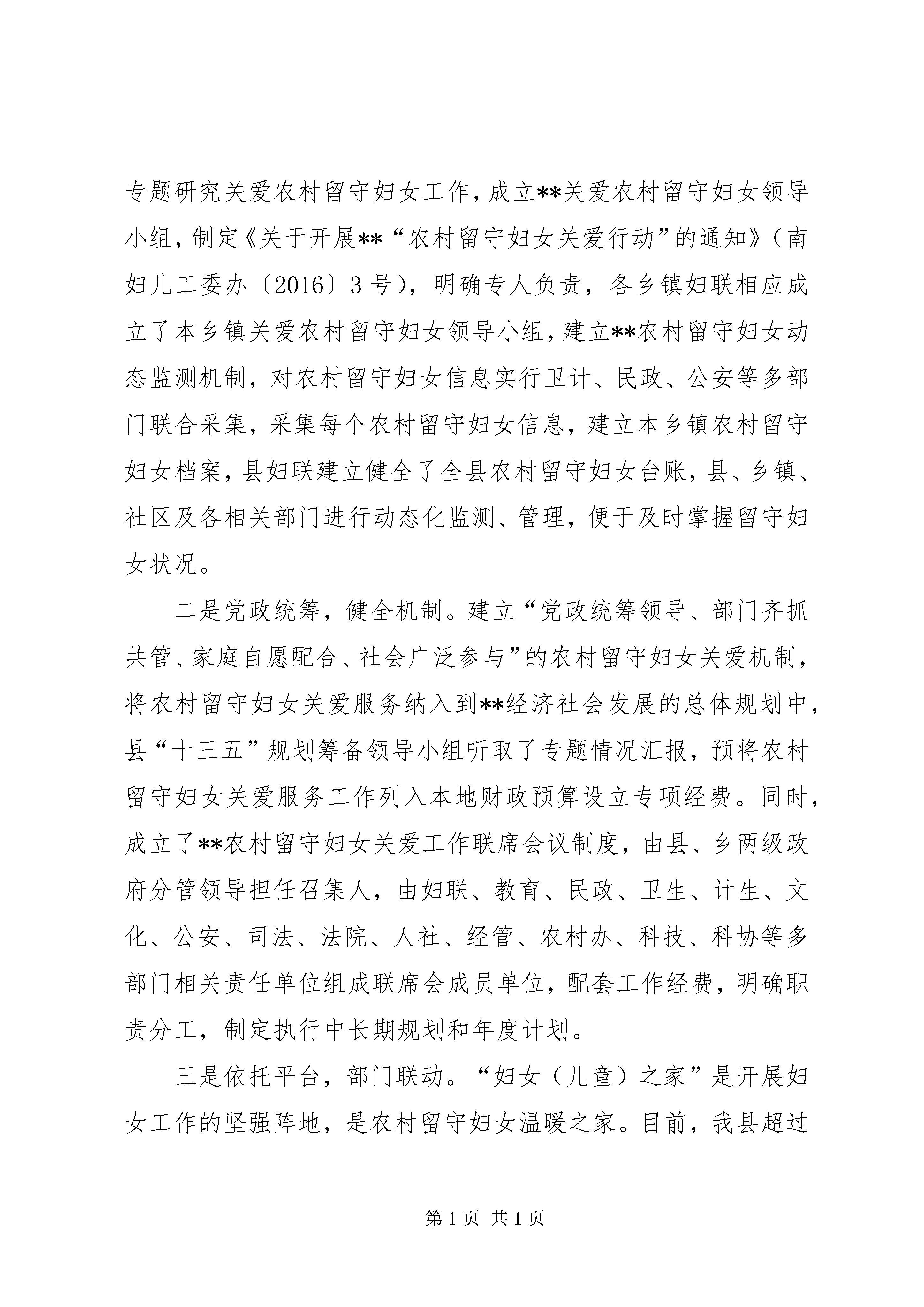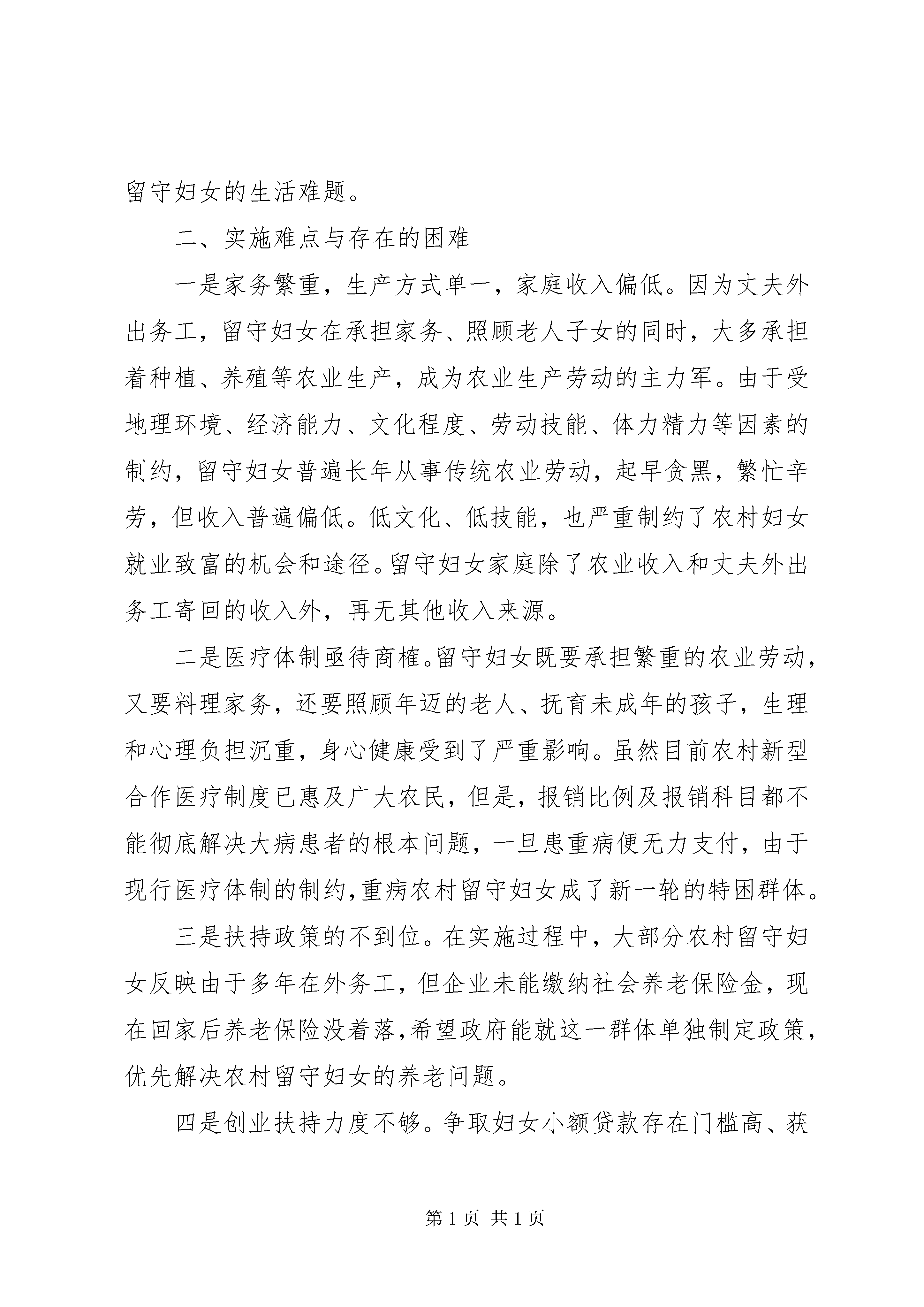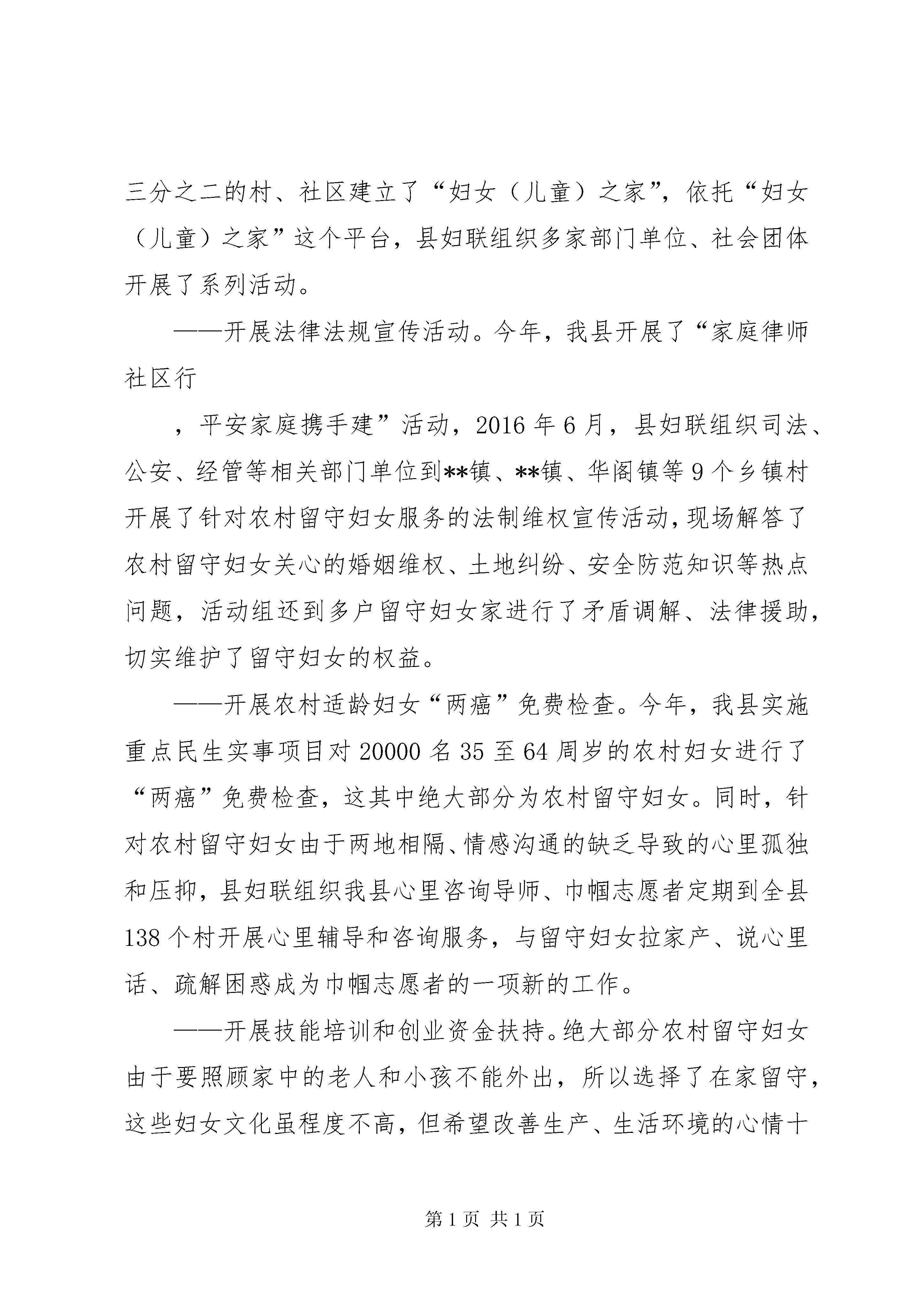 县农村留守妇女关爱服务体系试点工作调研报告**地处**两省边陲,**区腹地,是一个农业大县。辖12个乡镇、171个村(社区),总人口68.02万人,其中女性人口30.59万人,近年来,由于劳务输出、农田集中流转等多种原因使得大量劳动力外出务工,据统计全县农村留守妇女约为12825人,所占总人口比例1.89%,其中年龄在20—30岁的3744人,占29.19%;31—40岁的5065人,占39.49%;41—55岁的4016人,占31.32%,小学及初中文化9189人,所占比例71.65%,高中及以上文化3636人,所占比例28.35%。留守妇女中贫困人口3563人,所占比例27.7%。今年以来,为切实加强我县农村留守妇女关爱服务体系建设,认真做好农村留守妇女关爱工作,县妇联在全县深入开展了“农村留守妇女关爱行动”系列活动,深入开展调研,把农村留守妇女的生存、生活、教育、卫生和发展问题作为构建和谐社会、推进社会主义新农村建设进程的重要内容予以高度重视,充分发挥各部门的职能作用,不断创新工作机制,完善服务方式,切实为农村留守妇女排忧解难。具体如下:一、主要做法一是加强领导,明确责任。今年8月,县妇女儿童工作委员会组织全县31家部门单位12个乡镇召开了**妇女儿童工作会议,专题研究关爱农村留守妇女工作,成立**关爱农村留守妇女领导小组,制定《关于开展**“农村留守妇女关爱行动”的通知》(南妇儿工委办〔2016〕3号),明确专人负责,各乡镇妇联相应成立了本乡镇关爱农村留守妇女领导小组,建立**农村留守妇女动态监测机制,对农村留守妇女信息实行卫计、民政、公安等多部门联合采集,采集每个农村留守妇女信息,建立本乡镇农村留守妇女档案,县妇联建立健全了全县农村留守妇女台账,县、乡镇、社区及各相关部门进行动态化监测、管理,便于及时掌握留守妇女状况。二是党政统筹,健全机制。建立“党政统筹领导、部门齐抓共管、家庭自愿配合、社会广泛参与”的农村留守妇女关爱机制,将农村留守妇女关爱服务纳入到**经济社会发展的总体规划中,县“十三五”规划筹备领导小组听取了专题情况汇报,预将农村留守妇女关爱服务工作列入本地财政预算设立专项经费。同时,成立了**农村留守妇女关爱工作联席会议制度,由县、乡两级政府分管领导担任召集人,由妇联、教育、民政、卫生、计生、文化、公安、司法、法院、人社、经管、农村办、科技、科协等多部门相关责任单位组成联席会成员单位,配套工作经费,明确职责分工,制定执行中长期规划和年度计划。三是依托平台,部门联动。“妇女(儿童)之家”是开展妇女工作的坚强阵地,是农村留守妇女温暖之家。目前,我县超过三分之二的村、社区建立了“妇女(儿童)之家”,依托“妇女(儿童)之家”这个平台,县妇联组织多家部门单位、社会团体开展了系列活动。——开展法律法规宣传活动。今年,我县开展了“家庭律师社区行,平安家庭携手建”活动,2016年6月,县妇联组织司法、公安、经管等相关部门单位到**镇、**镇、华阁镇等9个乡镇村开展了针对农村留守妇女服务的法制维权宣传活动,现场解答了农村留守妇女关心的婚姻维权、土地纠纷、安全防范知识等热点问题,活动组还到多户留守妇女家进行了矛盾调解、法律援助,切实维护了留守妇女的权益。——开展农村适龄妇女“两癌”免费检查。今年,我县实施重点民生实事项目对20000名35至64周岁的农村妇女进行了“两癌”免费检查,这其中绝大部分为农村留守妇女。同时,针对农村留守妇女由于两地相隔、情感沟通的缺乏导致的心里孤独和压抑,县妇联组织我县心里咨询导师、巾帼志愿者定期到全县138个村开展心里辅导和咨询服务,与留守妇女拉家产、说心里话、疏解困惑成为巾帼志愿者的一项新的工作。——开展技能培训和创业资金扶持。绝大部分农村留守妇女由于要照顾家中的老人和小孩不能外出,所以选择了在家留守,这些妇女文化虽程度不高,但希望改善生产、生活环境的心情十分迫切。针对这一情况,县妇联组织县人社局、农业局、科协、畜水局等单位开展农村妇女技术培训,举办农村留守妇女技术培训班,传授农业生产技术,帮助留守妇女调整产业结构,引导农村留守妇女科技致富。如:我县**镇**村乡留守妇女**通过养殖培训后,积极探索科学种养新技术,2015年承包水面20多亩养殖四大家鱼,获利近4万元。**镇**村留守妇女**在参加科学种田培训后,独自承包水田30亩,去年,亩产稻谷600公斤,共收益3万余元。顺应互联网创业的大潮,适应“互联网+”的新趋势,县妇联组织成立了**巾帼电商创业基地,并开展巾帼电商培训班,有力提升了留守妇女的创业创新能力。同时,县妇联还积极推广科技含量高、辐射面广、投资少见效快的增收致富项目,还在用地、资金、技术等方面给予政策优惠大力扶持,鼓励留守妇女自主创业,使其能够敢创业、会创