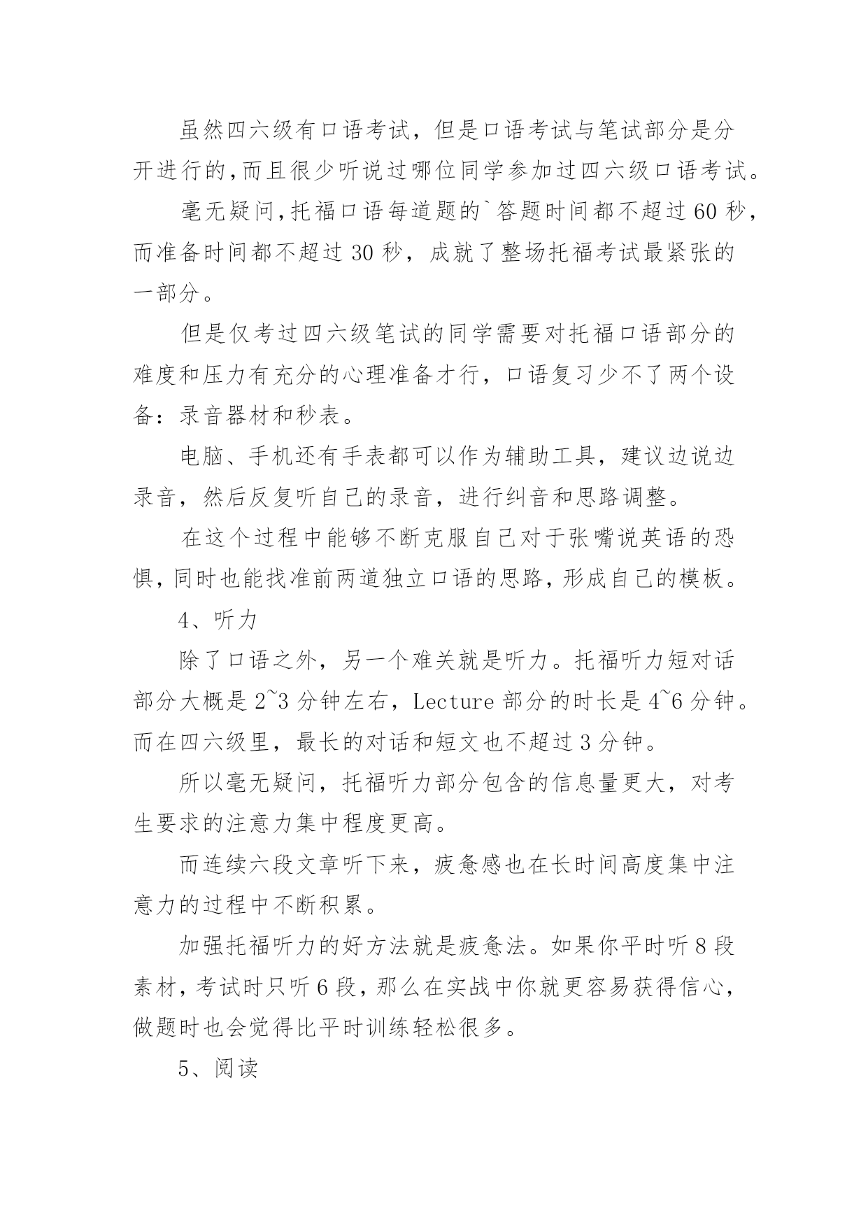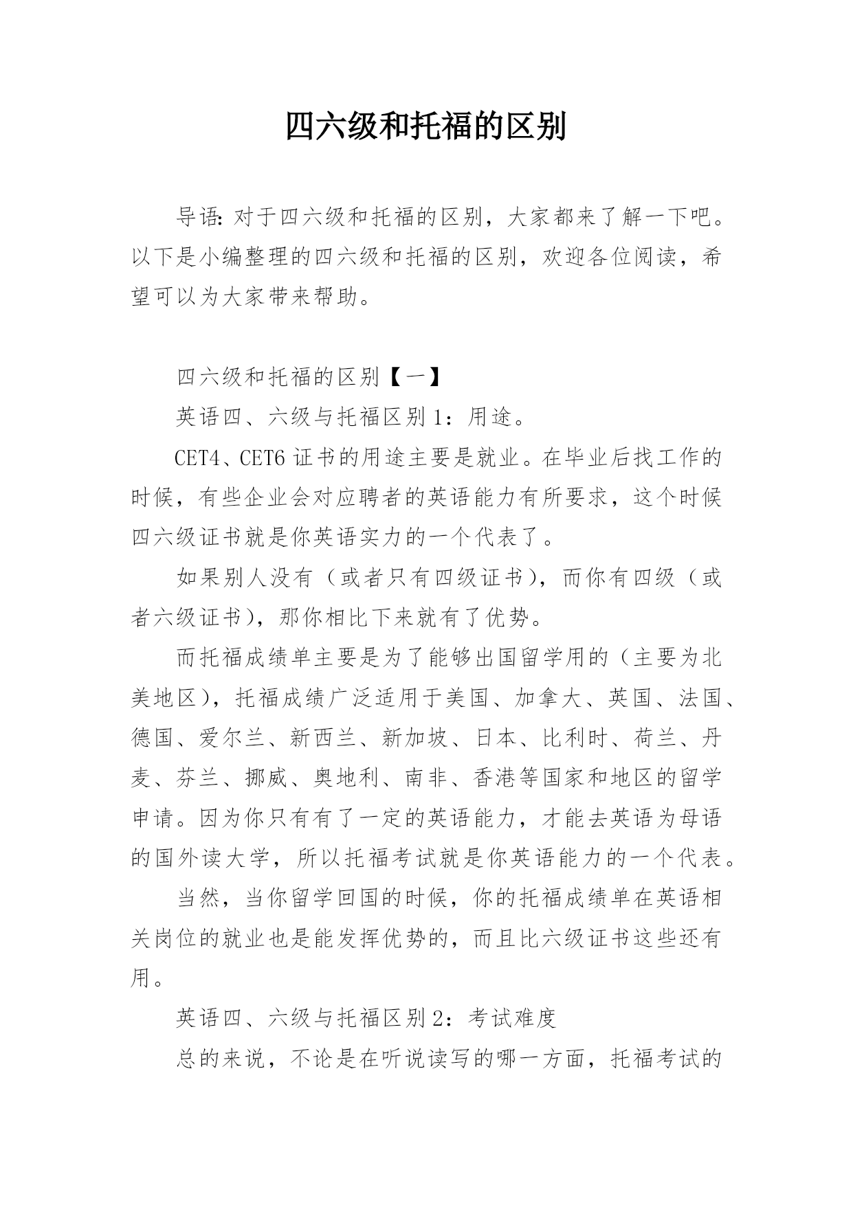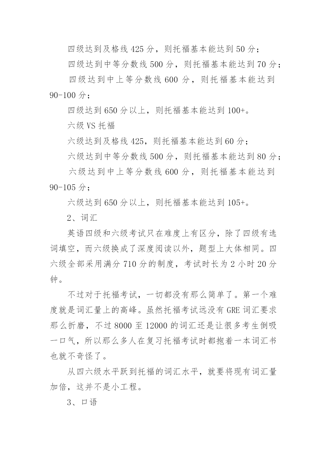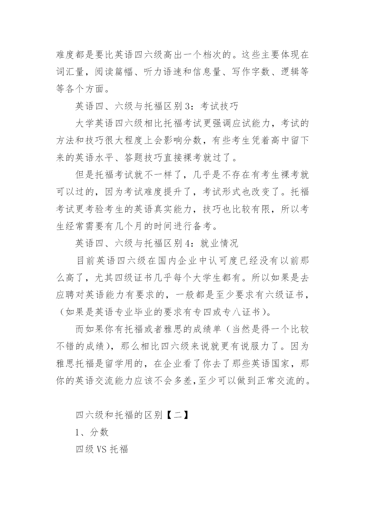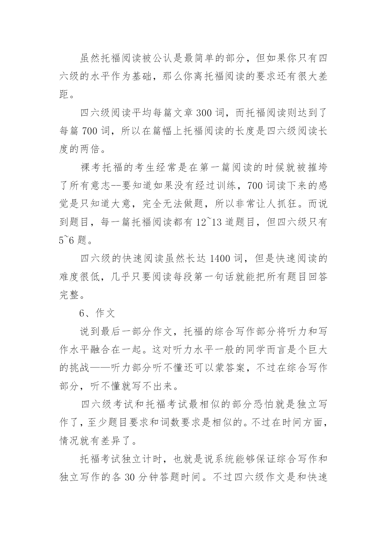 四六级和托福的区别 导语:对于四六级和托福的区别,大家都来了解一下吧。以下是小编整理的四六级和托福的区别,欢迎各位阅读,希望可以为大家带来帮助。四六级和托福的区别【一】英语四、六级与托福区别1:用途。CET4、CET6证书的用途主要是就业。在毕业后找工作的时候,有些企业会对应聘者的英语能力有所要求,这个时候四六级证书就是你英语实力的一个代表了。如果别人没有(或者只有四级证书),而你有四级(或者六级证书),那你相比下来就有了优势。而托福成绩单主要是为了能够出国留学用的(主要为北美地区),托福成绩广泛适用于美国、加拿大、英国、法国、德国、爱尔兰、新西兰、新加坡、日本、比利时、荷兰、丹麦、芬兰、挪威、奥地利、南非、香港等国家和地区的留学申请。因为你只有有了一定的英语能力,才能去英语为母语的国外读大学,所以托福考试就是你英语能力的一个代表。当然,当你留学回国的时候,你的托福成绩单在英语相关岗位的就业也是能发挥优势的,而且比六级证书这些还有用。英语四、六级与托福区别2:考试难度总的来说,不论是在听说读写的哪一方面,托福考试的难度都是要比英语四六级高出一个档次的。这些主要体现在词汇量,阅读篇幅、听力语速和信息量、写作字数、逻辑等等各个方面。英语四、六级与托福区别3:考试技巧大学英语四六级相比托福考试更强调应试能力,考试的方法和技巧很大程度上会影响分数,有些考生凭着高中留下来的英语水平、答题技巧直接裸考就过了。但是托福考试就不一样了,几乎是不存在有考生裸考就可以过的,因为考试难度提升了,考试形式也改变了。托福考试更考验考生的英语真实能力,技巧也比较有限,所以考生经常需要有几个月的时间进行备考。英语四、六级与托福区别4:就业情况目前英语四六级在国内企业中认可度已经没有以前那么高了,尤其四级证书几乎每个大学生都有。所以如果是去应聘对英语能力有要求的,一般都是至少要求有六级证书,(如果是英语专业毕业的要求有专四或专八证书)。而如果你有托福或者雅思的成绩单(当然是得一个比较不错的成绩),那么相比四六级来说就更有说服力了。因为雅思托福是留学用的,在企业看了你去了那些英语国家,那你的英语交流能力应该不会多差,至少可以做到正常交流的。四六级和托福的区别【二】1、分数四级VS托福四级达到及格线425分,则托福基本能达到50分;四级达到中等分数线500分,则托福基本能达到70分;四级达到中上等分数线600分,则托福基本能达到90-100分;四级达到650分以上,则托福基本能达到100+。六级VS托福六级达到及格线425,则托福基本能达到60分;六级达到中等分数线500分,则托福基本能达到80分;六级达到中上等分数线600分,则托福基本能达到90-105分;六级达到650分以上,则托福基本能达到105+。2、词汇英语四级和六级考试只在难度上有区分,除了四级有选词填空,而六级换成了深度阅读以外,题型上大体相同。四六级全部采用满分710分的制度,考试时长为2小时20分钟。不过对于托福考试,一切都没有那么简单了。第一个难度就是词汇量上的高峰。虽然托福考试远没有GRE词汇要求那么折磨,不过8000至12000的词汇还是让很多考生倒吸一口气,所以那么多人在复习托福考试时都抱着一本词汇书也就不奇怪了。从四六级水平跃到托福的词汇水平,就要将现有词汇量加倍,这并不是小工程。3、口语虽然四六级有口语考试,但是口语考试与笔试部分是分开进行的,而且很少听说过哪位同学参加过四六级口语考试。毫无疑问,托福口语每道题的`答题时间都不超过60秒,而准备时间都不超过30秒,成就了整场托福考试最紧张的一部分。但是仅考过四六级笔试的同学需要对托福口语部分的难度和压力有充分的心理准备才行,口语复习少不了两个设备:录音器材和秒表。电脑、手机还有手表都可以作为辅助工具,建议边说边录音,然后反复听自己的录音,进行纠音和思路调整。在这个过程中能够不断克服自己对于张嘴说英语的恐惧,同时也能找准前两道独立口语的思路,形成自己的模板。4、听力除了口语之外,另一个难关就是听力。托福听力短对话部分大概是2~3分钟左右,Lecture部分的时长是4~6分钟。而在四六级里,最长的对话和短文也不超过3分钟。所以毫无疑问,托福听力部分包含的信息量更大,对考生要求的注意力集中程度更高。而连续六段文章听下来,疲惫感也在长时间高度集中注意力的过程中不断积累。加强托福听力的好方法就是疲惫法。如果你平时听8段素材,考试时只听6段,那么在实战中你就更容易获得信心,做题时也会觉得比平时训练轻松很多。5、阅读虽然托福阅读被公认是最简单的部分,但如果你只有四六级的水平作为基础,那么你离托福阅读的要求还有很大差距。四六级阅读平均每篇文章300词,而托福阅读则达到了每篇700词,所以在篇幅上托福阅读的长度是四六级阅读长度的两倍。裸考托福的考生