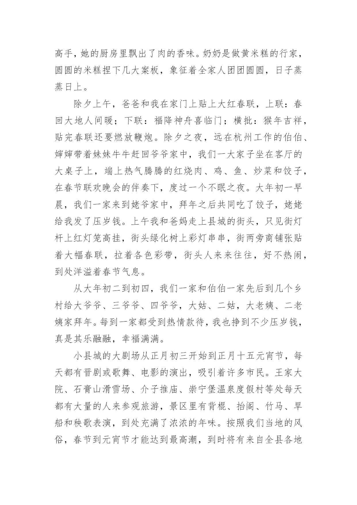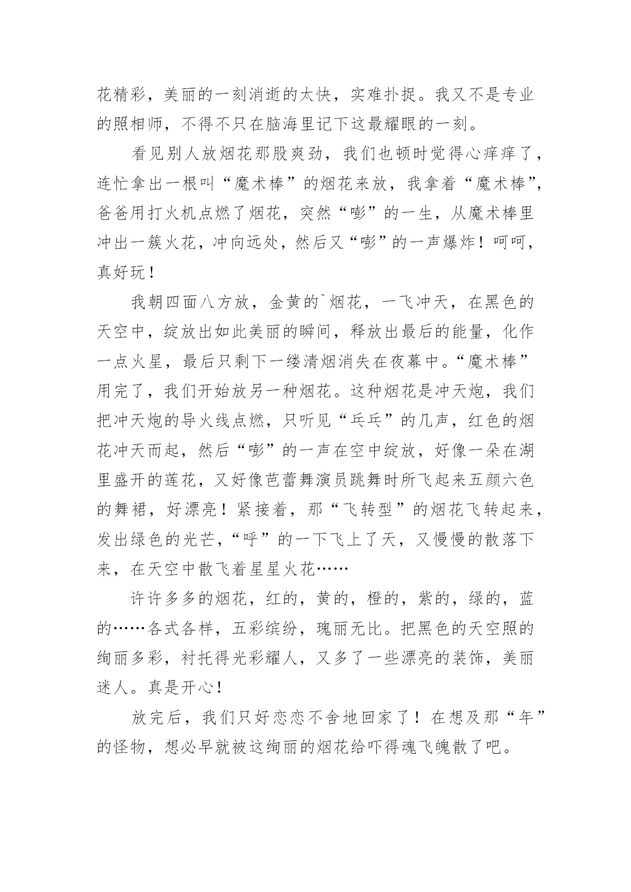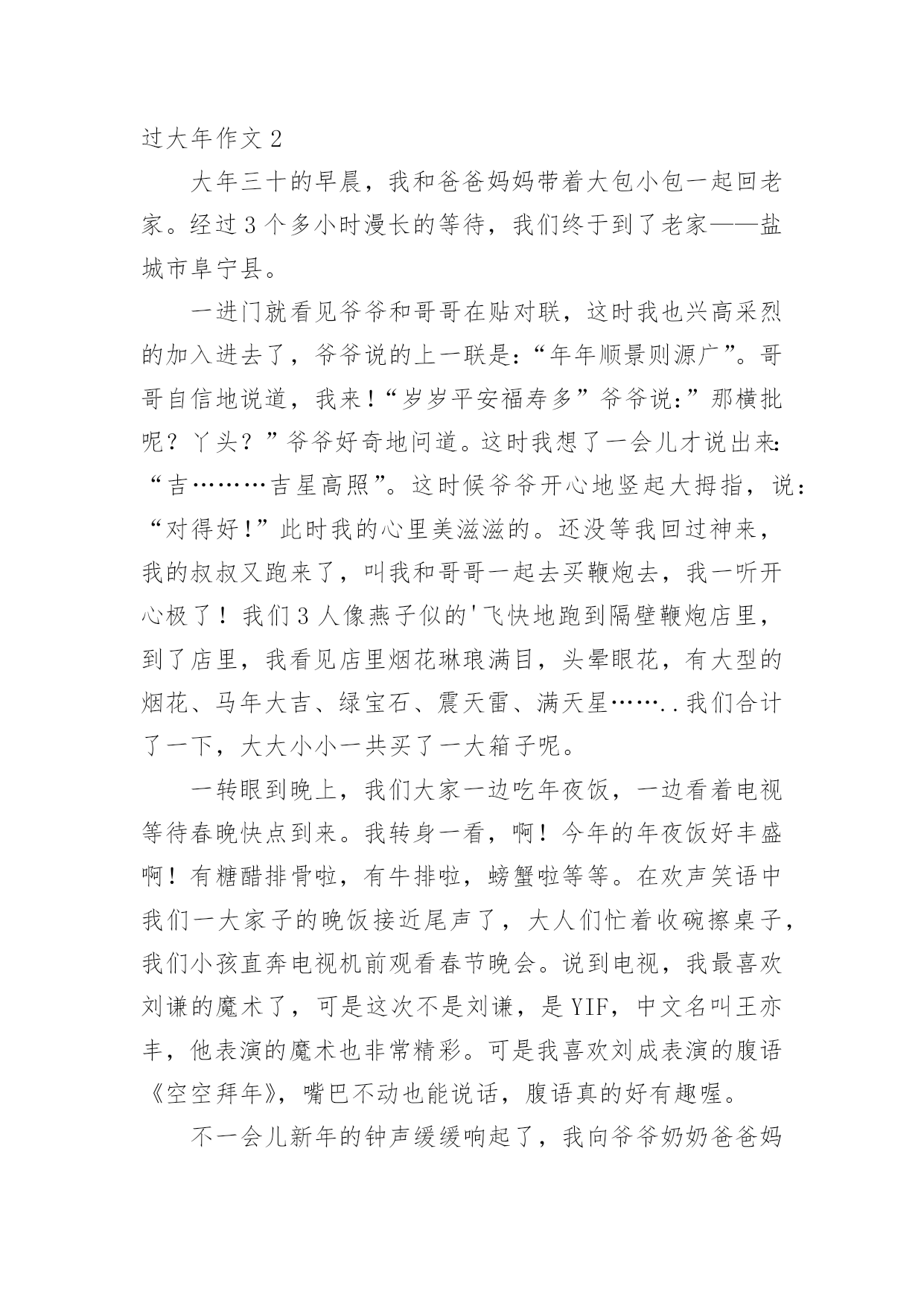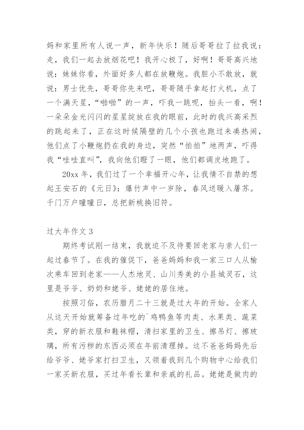 过大年作文 在平时的学习、工作或生活中,大家都接触过作文吧,写作文可以锻炼我们的独处习惯,让自己的心静下来,思考自己未来的方向。那么你有了解过作文吗?下面是小编精心整理的过大年作文,欢迎大家借鉴与参考,希望对大家有所帮助。过大年作文1“有一叫年的怪物,每当除夕夜晚,它便出来吃人,大家到了除夕晚上都不敢出来玩,后来一个勇敢的人发现年最怕爆竹声响,于是用烟花火赶走了年,大家欣喜若狂,所以每当除夕夜晚人们都出来放烟花,也把除夕夜晚称为过年!”妈妈拿着故事书津津有味的给我读着,一旁的我已经吓得直冒冷汗了,我下定决心这次除夕夜一定要好好放鞭炮吓吓年!终于到了除夕晚上了,快到十一点五十分的时候,是放烟花的时刻了,我和妈妈,爸爸一起特意在我们楼下找了个空场地专门来放烟花,我们先把买好的烟花放到一边。现在,正是放烟花最热闹的时刻,只听“轰”“嘭嘭”的几声响,一朵朵美丽的烟花盛开了,好似五彩斑斓的菊花,在黑的有些神秘的苍穹里,瞬间绽放开来,又迅速地凋零,这时的月亮与星星都显得不怎么起眼了。五光十色,瑰丽无比的烟花,那美丽的一瞬间,我真想用照相机把这给拍下来,可是这烟花精彩,美丽的一刻消逝的太快,实难扑捉。我又不是专业的照相师,不得不只在脑海里记下这最耀眼的一刻。看见别人放烟花那股爽劲,我们也顿时觉得心痒痒了,连忙拿出一根叫“魔术棒”的烟花来放,我拿着“魔术棒”,爸爸用打火机点燃了烟花,突然“嘭”的一生,从魔术棒里冲出一簇火花,冲向远处,然后又“嘭”的一声爆炸!呵呵,真好玩!我朝四面八方放,金黄的`烟花,一飞冲天,在黑色的天空中,绽放出如此美丽的瞬间,释放出最后的能量,化作一点火星,最后只剩下一缕清烟消失在夜幕中。“魔术棒”用完了,我们开始放另一种烟花。这种烟花是冲天炮,我们把冲天炮的导火线点燃,只听见“乓乓”的几声,红色的烟花冲天而起,然后“嘭”的一声在空中绽放,好像一朵在湖里盛开的莲花,又好像芭蕾舞演员跳舞时所飞起来五颜六色的舞裙,好漂亮!紧接着,那“飞转型”的烟花飞转起来,发出绿色的光芒,“呼”的一下飞上了天,又慢慢的散落下来,在天空中散飞着星星火花……许许多多的烟花,红的,黄的,橙的,紫的,绿的,蓝的……各式各样,五彩缤纷,瑰丽无比。把黑色的天空照的绚丽多彩,衬托得光彩耀人,又多了一些漂亮的装饰,美丽迷人。真是开心!放完后,我们只好恋恋不舍地回家了!在想及那“年”的怪物,想必早就被这绚丽的烟花给吓得魂飞魄散了吧。过大年作文2大年三十的早晨,我和爸爸妈妈带着大包小包一起回老家。经过3个多小时漫长的等待,我们终于到了老家——盐城市阜宁县。一进门就看见爷爷和哥哥在贴对联,这时我也兴高采烈的加入进去了,爷爷说的上一联是:“年年顺景则源广”。哥哥自信地说道,我来!“岁岁平安福寿多”爷爷说:”那横批呢?丫头?”爷爷好奇地问道。这时我想了一会儿才说出来:“吉………吉星高照”。这时候爷爷开心地竖起大拇指,说:“对得好!”此时我的心里美滋滋的。还没等我回过神来,我的叔叔又跑来了,叫我和哥哥一起去买鞭炮去,我一听开心极了!我们3人像燕子似的'飞快地跑到隔壁鞭炮店里,到了店里,我看见店里烟花琳琅满目,头晕眼花,有大型的烟花、马年大吉、绿宝石、震天雷、满天星……..我们合计了一下,大大小小一共买了一大箱子呢。一转眼到晚上,我们大家一边吃年夜饭,一边看着电视等待春晚快点到来。我转身一看,啊!今年的年夜饭好丰盛啊!有糖醋排骨啦,有牛排啦,螃蟹啦等等。在欢声笑语中我们一大家子的晚饭接近尾声了,大人们忙着收碗擦桌子,我们小孩直奔电视机前观看春节晚会。说到电视,我最喜欢刘谦的魔术了,可是这次不是刘谦,是YIF,中文名叫王亦丰,他表演的魔术也非常精彩。可是我喜欢刘成表演的腹语《空空拜年》,嘴巴不动也能说话,腹语真的好有趣喔。不一会儿新年的钟声缓缓响起了,我向爷爷奶奶爸爸妈妈和家里所有人说一声,新年快乐!随后哥哥拉了拉我说:走,我们一起去放烟花吧!我开心极了,好啊!哥哥高兴地说:妹妹你看,外面好多人都在放鞭炮。我胆小不敢放,就说:男士优先,哥哥你先来吧,哥哥随手拿起打火机,点了一个满天星,“啪啪”的一声,吓我一跳呢,抬头一看,啊!一朵朵金光闪闪的星星绽放在我的眼前,此时的我兴高采烈的跳起来了,正在这时候隔壁的几个小孩也跑过来凑热闹,他们点了小鞭炮扔在我的身边,突然“拍拍”地两声,吓得我“哇哇直叫”,我向他们瞪了一眼,他们都调皮地跑了。20xx年,我们过了一个幸福开心年,让我情不自禁的想起王安石的《元日》:爆竹声中一岁除,春风送暖入屠苏。千门万户曈曈日,总把新桃换旧符。过大年作文3期终考试刚一结束,我就迫不及待要回老家与亲人们一起过春节了。在我的催促下,爸爸妈妈和我一家三口人从榆次乘车回到老家——人杰地灵、山川秀美的小县城灵石,这里是爷爷、奶奶和姥爷、姥姥的居住地。按照习俗,