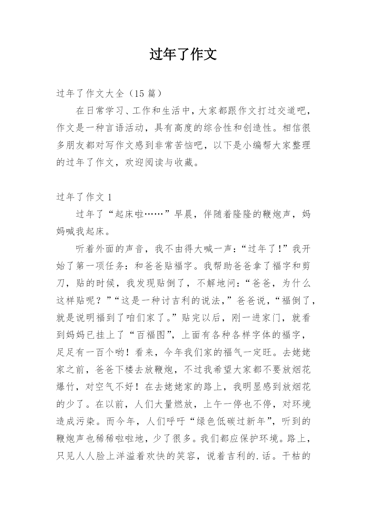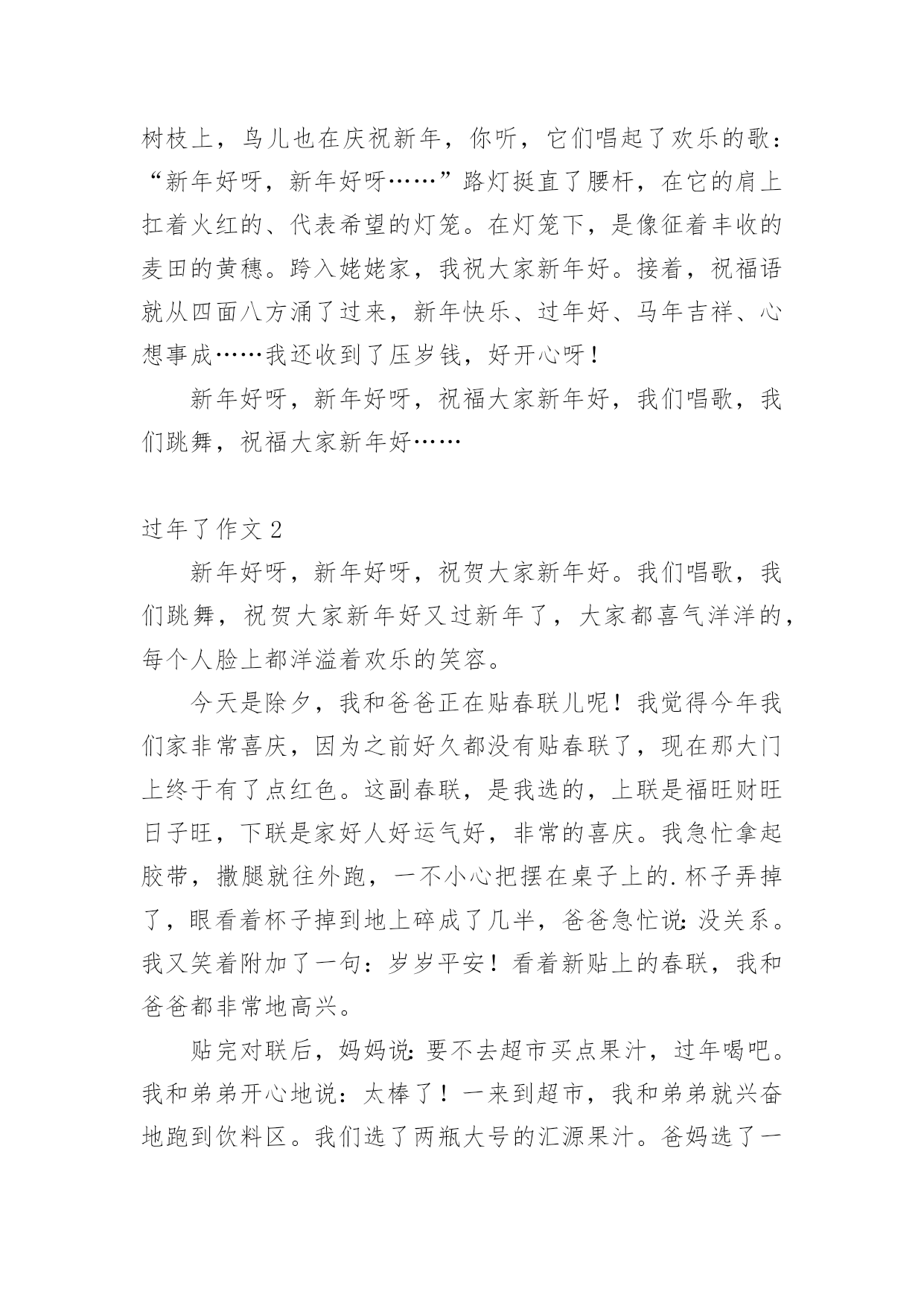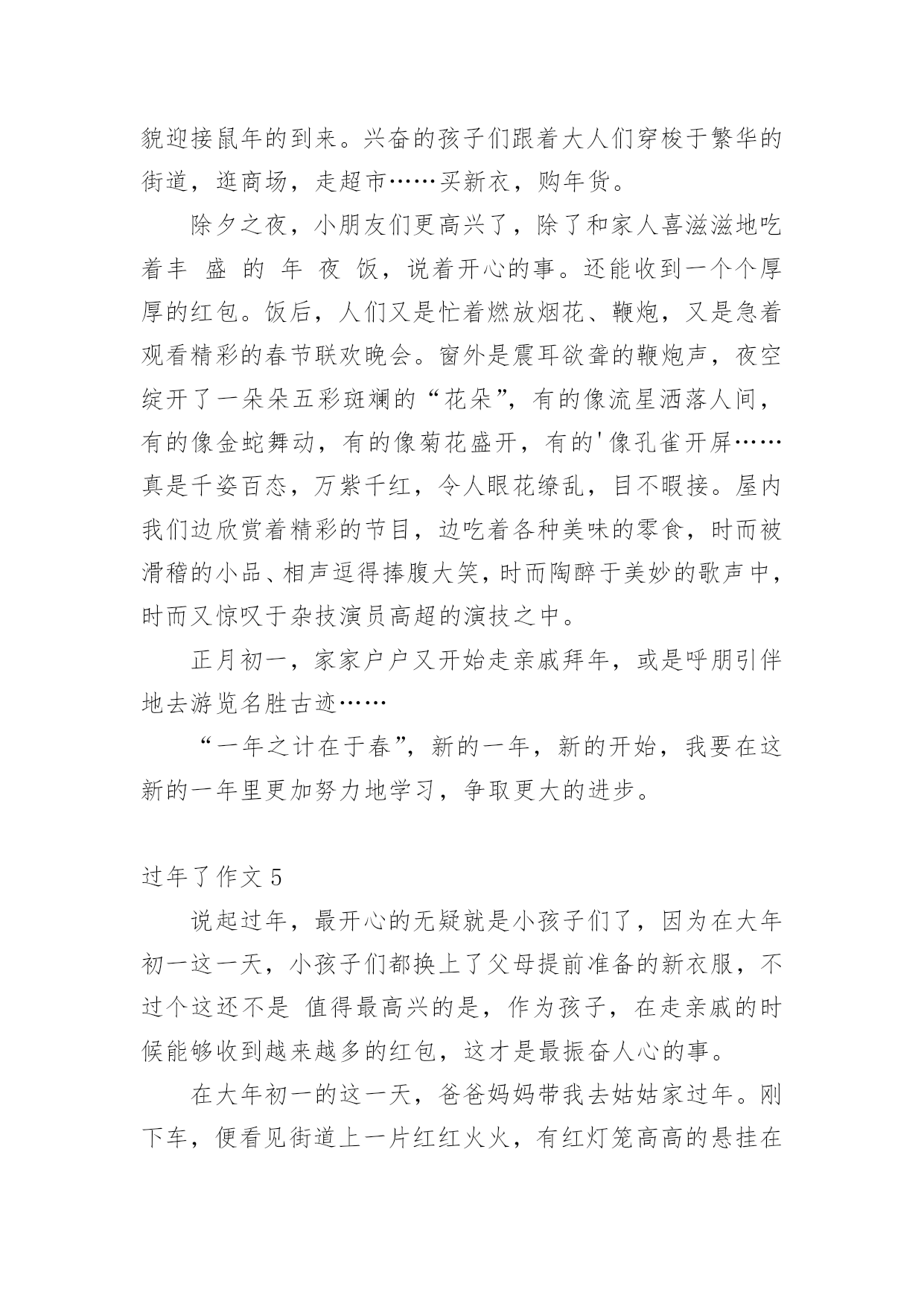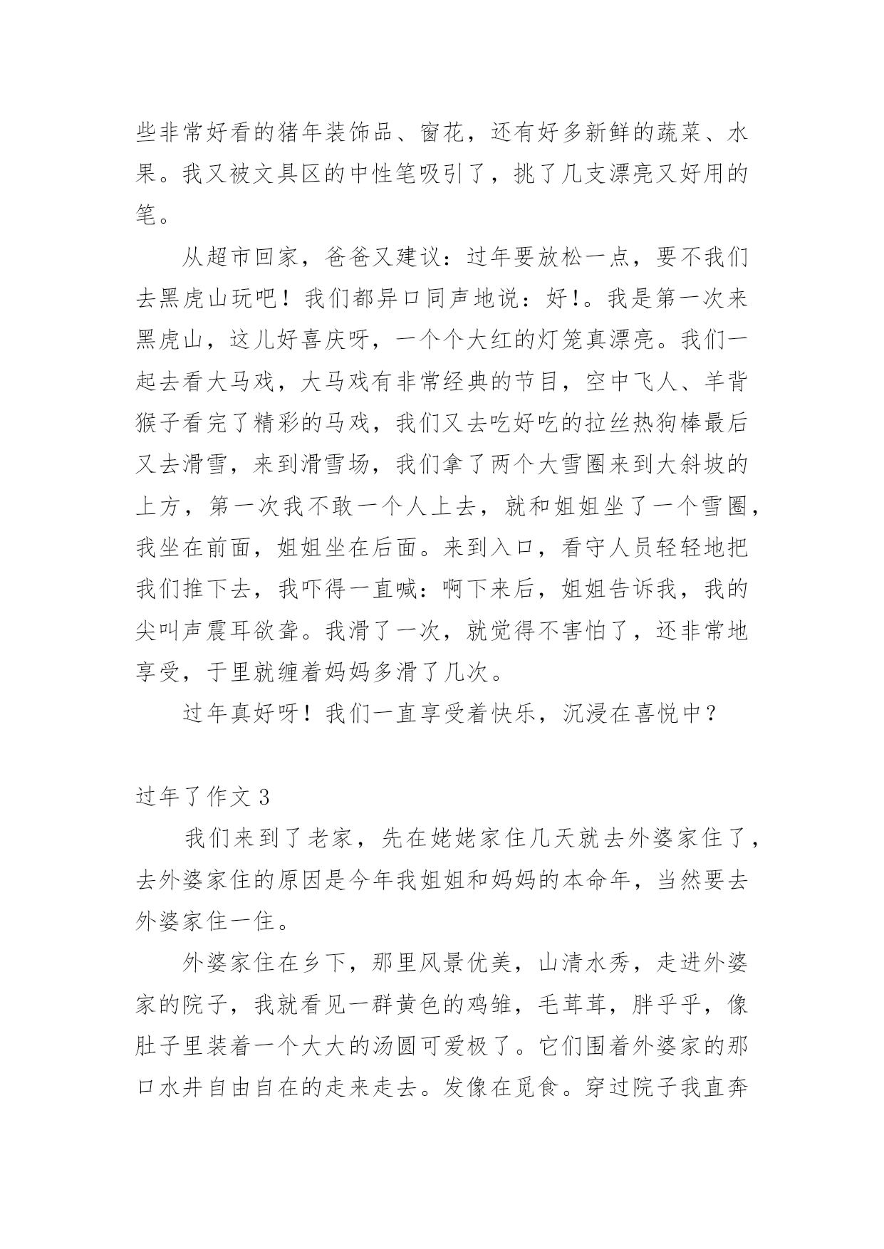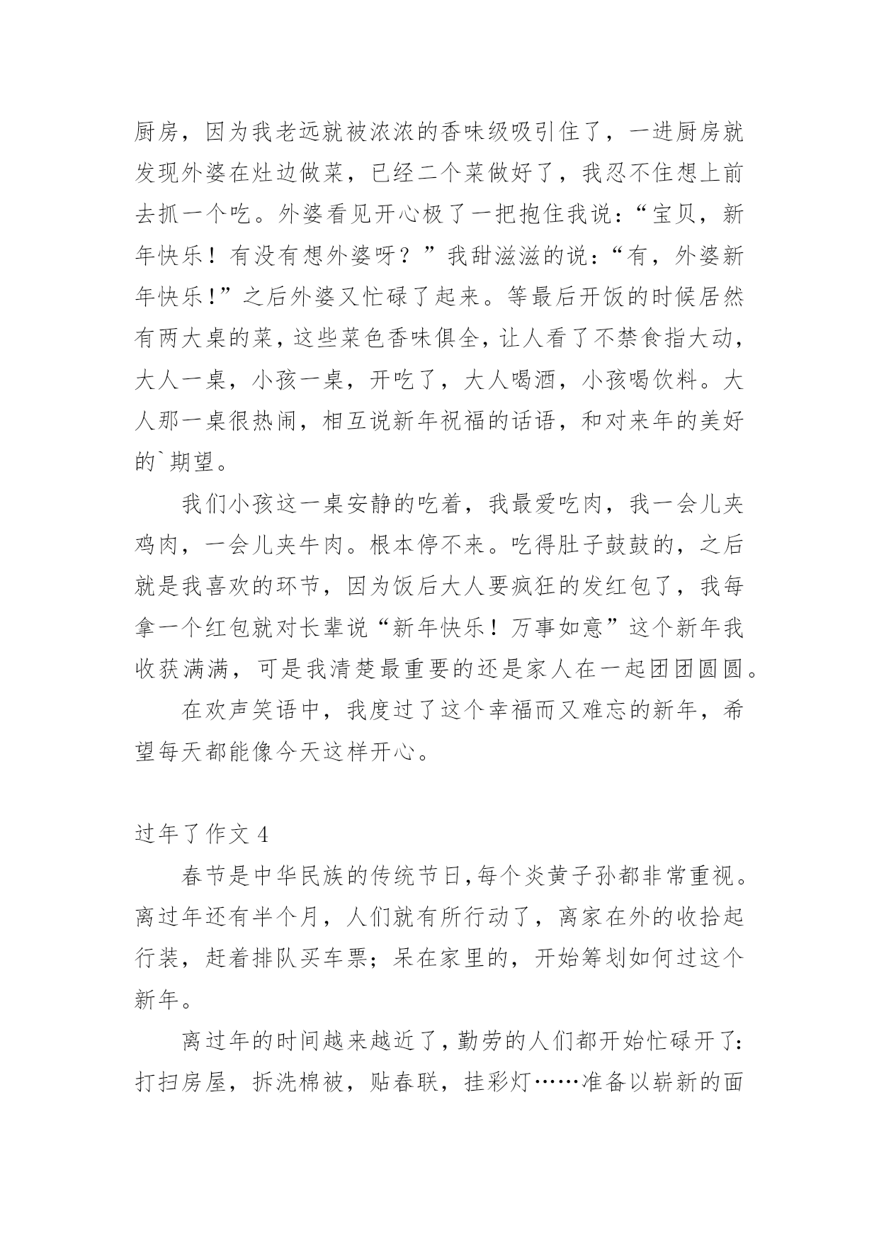 过年了作文 过年了作文大全(15篇)在日常学习、工作和生活中,大家都跟作文打过交道吧,作文是一种言语活动,具有高度的综合性和创造性。相信很多朋友都对写作文感到非常苦恼吧,以下是小编帮大家整理的过年了作文,欢迎阅读与收藏。过年了作文1过年了“起床啦……”早晨,伴随着隆隆的鞭炮声,妈妈喊我起床。听着外面的声音,我不由得大喊一声:“过年了!”我开始了第一项任务:和爸爸贴福字。我帮助爸爸拿了福字和剪刀,贴的时候,我发现贴倒了,不解地问:“爸爸,为什么这样贴呢?”“这是一种讨吉利的说法,”爸爸说,“福倒了,就是说明福到了咱们家了。”贴完以后,刚一进家门,就看到妈妈已挂上了“百福图”,上面有各种各样字体的福字,足足有一百个哟!看来,今年我们家的福气一定旺。去姥姥家之前,爸爸下楼去放鞭炮,不过我希望大家都不要放烟花爆竹,对空气不好!在去姥姥家的路上,我明显感到放烟花的少了。在以前,人们大量燃放,上午一停也不停,对环境造成污染。而今年,人们呼吁“绿色低碳过新年”,听到的鞭炮声也稀稀啦啦地,少了很多。我们都应保护环境。路上,只见人人脸上洋溢着欢快的笑容,说着吉利的.话。干枯的树枝上,鸟儿也在庆祝新年,你听,它们唱起了欢乐的歌:“新年好呀,新年好呀……”路灯挺直了腰杆,在它的肩上扛着火红的、代表希望的灯笼。在灯笼下,是像征着丰收的麦田的黄穗。跨入姥姥家,我祝大家新年好。接着,祝福语就从四面八方涌了过来,新年快乐、过年好、马年吉祥、心想事成……我还收到了压岁钱,好开心呀!新年好呀,新年好呀,祝福大家新年好,我们唱歌,我们跳舞,祝福大家新年好……过年了作文2新年好呀,新年好呀,祝贺大家新年好。我们唱歌,我们跳舞,祝贺大家新年好又过新年了,大家都喜气洋洋的,每个人脸上都洋溢着欢乐的笑容。今天是除夕,我和爸爸正在贴春联儿呢!我觉得今年我们家非常喜庆,因为之前好久都没有贴春联了,现在那大门上终于有了点红色。这副春联,是我选的,上联是福旺财旺日子旺,下联是家好人好运气好,非常的喜庆。我急忙拿起胶带,撒腿就往外跑,一不小心把摆在桌子上的.杯子弄掉了,眼看着杯子掉到地上碎成了几半,爸爸急忙说:没关系。我又笑着附加了一句:岁岁平安!看着新贴上的春联,我和爸爸都非常地高兴。贴完对联后,妈妈说:要不去超市买点果汁,过年喝吧。我和弟弟开心地说:太棒了!一来到超市,我和弟弟就兴奋地跑到饮料区。我们选了两瓶大号的汇源果汁。爸妈选了一些非常好看的猪年装饰品、窗花,还有好多新鲜的蔬菜、水果。我又被文具区的中性笔吸引了,挑了几支漂亮又好用的笔。从超市回家,爸爸又建议:过年要放松一点,要不我们去黑虎山玩吧!我们都异口同声地说:好!。我是第一次来黑虎山,这儿好喜庆呀,一个个大红的灯笼真漂亮。我们一起去看大马戏,大马戏有非常经典的节目,空中飞人、羊背猴子看完了精彩的马戏,我们又去吃好吃的拉丝热狗棒最后又去滑雪,来到滑雪场,我们拿了两个大雪圈来到大斜坡的上方,第一次我不敢一个人上去,就和姐姐坐了一个雪圈,我坐在前面,姐姐坐在后面。来到入口,看守人员轻轻地把我们推下去,我吓得一直喊:啊下来后,姐姐告诉我,我的尖叫声震耳欲聋。我滑了一次,就觉得不害怕了,还非常地享受,于里就缠着妈妈多滑了几次。过年真好呀!我们一直享受着快乐,沉浸在喜悦中?过年了作文3我们来到了老家,先在姥姥家住几天就去外婆家住了,去外婆家住的原因是今年我姐姐和妈妈的本命年,当然要去外婆家住一住。外婆家住在乡下,那里风景优美,山清水秀,走进外婆家的院子,我就看见一群黄色的鸡雏,毛茸茸,胖乎乎,像肚子里装着一个大大的汤圆可爱极了。它们围着外婆家的那口水井自由自在的走来走去。发像在觅食。穿过院子我直奔厨房,因为我老远就被浓浓的香味级吸引住了,一进厨房就发现外婆在灶边做菜,已经二个菜做好了,我忍不住想上前去抓一个吃。外婆看见开心极了一把抱住我说:“宝贝,新年快乐!有没有想外婆呀?”我甜滋滋的说:“有,外婆新年快乐!”之后外婆又忙碌了起来。等最后开饭的时候居然有两大桌的菜,这些菜色香味俱全,让人看了不禁食指大动,大人一桌,小孩一桌,开吃了,大人喝酒,小孩喝饮料。大人那一桌很热闹,相互说新年祝福的话语,和对来年的美好的`期望。我们小孩这一桌安静的吃着,我最爱吃肉,我一会儿夹鸡肉,一会儿夹牛肉。根本停不来。吃得肚子鼓鼓的,之后就是我喜欢的环节,因为饭后大人要疯狂的发红包了,我每拿一个红包就对长辈说“新年快乐!万事如意”这个新年我收获满满,可是我清楚最重要的还是家人在一起团团圆圆。在欢声笑语中,我度过了这个幸福而又难忘的新年,希望每天都能像今天这样开心。过年了作文4春节是中华民族的传统节日,每个炎黄子孙都非常重视。离过年还有半个月,人们就有所行动了,离家在外的收拾起行装,赶着排队买车票;呆在家里的,开始筹划如何过这个新年。离过年的时间越来