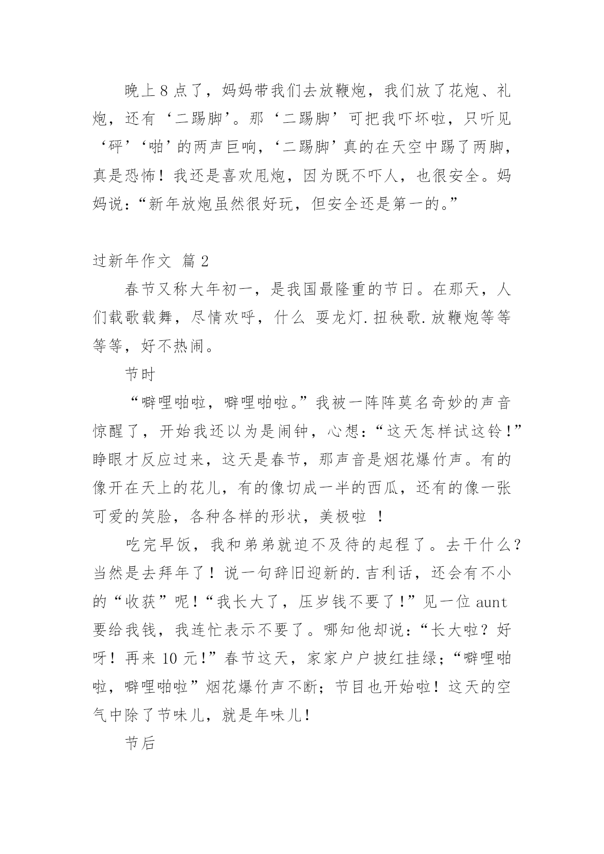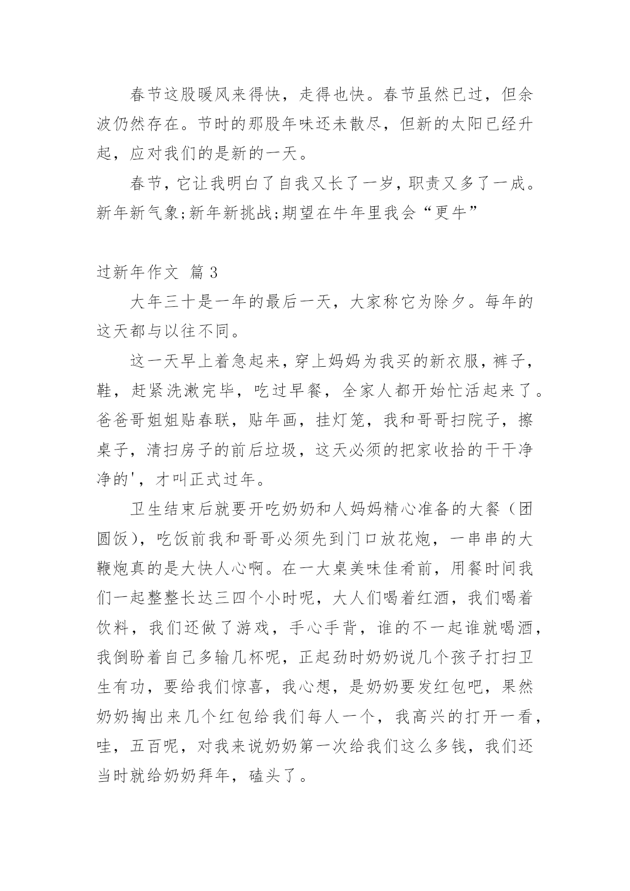 过新年作文 关于过新年作文三篇在日常生活或是工作学习中,大家总免不了要接触或使用作文吧,写作文是培养人们的观察力、联想力、想象力、思考力和记忆力的重要手段。那么一般作文是怎么写的呢?下面是小编为大家收集的过新年作文3篇,仅供参考,欢迎大家阅读。过新年作文篇1新年到了,许多人到商店里买炮。妈妈爸爸也带我去买炮,爸爸说我们是在‘烧’钱,可我调皮的告诉爸爸:“我们是要赶走‘年兽’,干的可是有意义的事呢!”我们买了好多炮,有能喷出彩色火花的花炮、有能射出彩珠的礼炮,当然还有我最喜欢的甩炮。街上还有很多商人拿着五颜六色的气球在向小朋友叫卖,气球上还有各种各样的图案,形状也各不相同,非常漂亮。我挑了一个我最喜欢的蓝色奥特曼的气球。大年三十那天,我上海的‘奇奇’姐姐和广州的‘妹朵’妹妹都回来了。我在家里上窜下跳,恨不得一眨眼就到奶奶家,跟她们玩。到了奶奶家,我跟她们下围棋、看电视、打游戏、包饺子,包完饺子,奶奶给我们煮好,我们津津有味的吃着自己包的'饺子,心里美滋滋的。晚上8点了,妈妈带我们去放鞭炮,我们放了花炮、礼炮,还有‘二踢脚’。那‘二踢脚’可把我吓坏啦,只听见‘砰’‘啪’的两声巨响,‘二踢脚’真的在天空中踢了两脚,真是恐怖!我还是喜欢甩炮,因为既不吓人,也很安全。妈妈说:“新年放炮虽然很好玩,但安全还是第一的。”过新年作文篇2春节又称大年初一,是我国最隆重的节日。在那天,人们载歌载舞,尽情欢呼,什么耍龙灯.扭秧歌.放鞭炮等等等等,好不热闹。节时“噼哩啪啦,噼哩啪啦。”我被一阵阵莫名奇妙的声音惊醒了,开始我还以为是闹钟,心想:“这天怎样试这铃!”睁眼才反应过来,这天是春节,那声音是烟花爆竹声。有的像开在天上的花儿,有的像切成一半的西瓜,还有的像一张可爱的笑脸,各种各样的形状,美极啦!吃完早饭,我和弟弟就迫不及待的起程了。去干什么?当然是去拜年了!说一句辞旧迎新的.吉利话,还会有不小的“收获”呢!“我长大了,压岁钱不要了!”见一位aunt要给我钱,我连忙表示不要了。哪知他却说:“长大啦?好呀!再来10元!”春节这天,家家户户披红挂绿;“噼哩啪啦,噼哩啪啦”烟花爆竹声不断;节目也开始啦!这天的空气中除了节味儿,就是年味儿!节后春节这股暖风来得快,走得也快。春节虽然已过,但余波仍然存在。节时的那股年味还未散尽,但新的太阳已经升起,应对我们的是新的一天。春节,它让我明白了自我又长了一岁,职责又多了一成。新年新气象;新年新挑战;期望在牛年里我会“更牛”过新年作文篇3大年三十是一年的最后一天,大家称它为除夕。每年的这天都与以往不同。这一天早上着急起来,穿上妈妈为我买的新衣服,裤子,鞋,赶紧洗漱完毕,吃过早餐,全家人都开始忙活起来了。爸爸哥姐姐贴春联,贴年画,挂灯笼,我和哥哥扫院子,擦桌子,清扫房子的前后垃圾,这天必须的把家收拾的干干净净的',才叫正式过年。卫生结束后就要开吃奶奶和人妈妈精心准备的大餐(团圆饭),吃饭前我和哥哥必须先到门口放花炮,一串串的大鞭炮真的是大快人心啊。在一大桌美味佳肴前,用餐时间我们一起整整长达三四个小时呢,大人们喝着红酒,我们喝着饮料,我们还做了游戏,手心手背,谁的不一起谁就喝酒,我倒盼着自己多输几杯呢,正起劲时奶奶说几个孩子打扫卫生有功,要给我们惊喜,我心想,是奶奶要发红包吧,果然奶奶掏出来几个红包给我们每人一个,我高兴的打开一看,哇,五百呢,对我来说奶奶第一次给我们这么多钱,我们还当时就给奶奶拜年,磕头了。接下来大人们都在看联欢晚会就,我们几个开始出去找玩伴,正式进入放炮时刻,这一天实在是太开心!