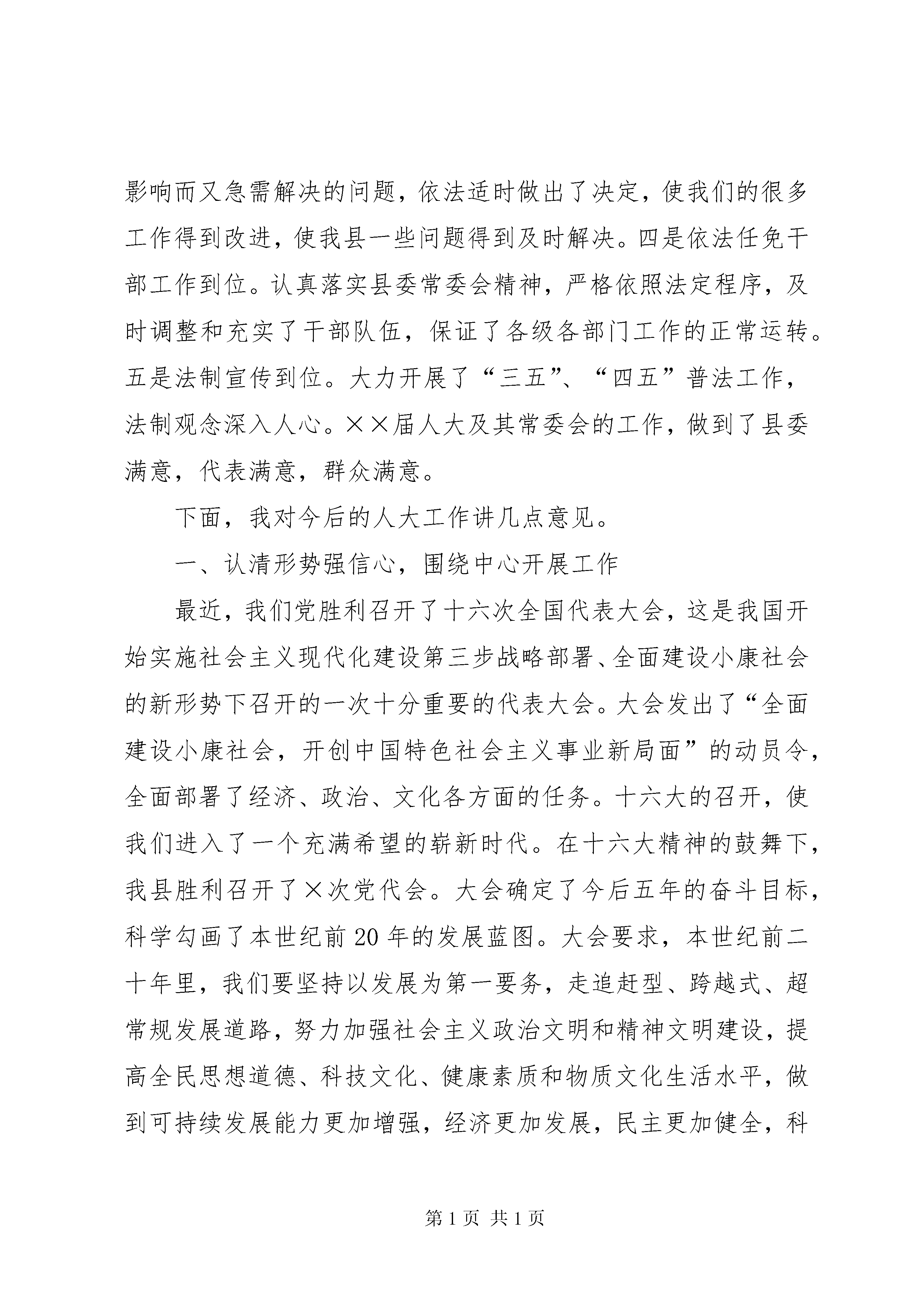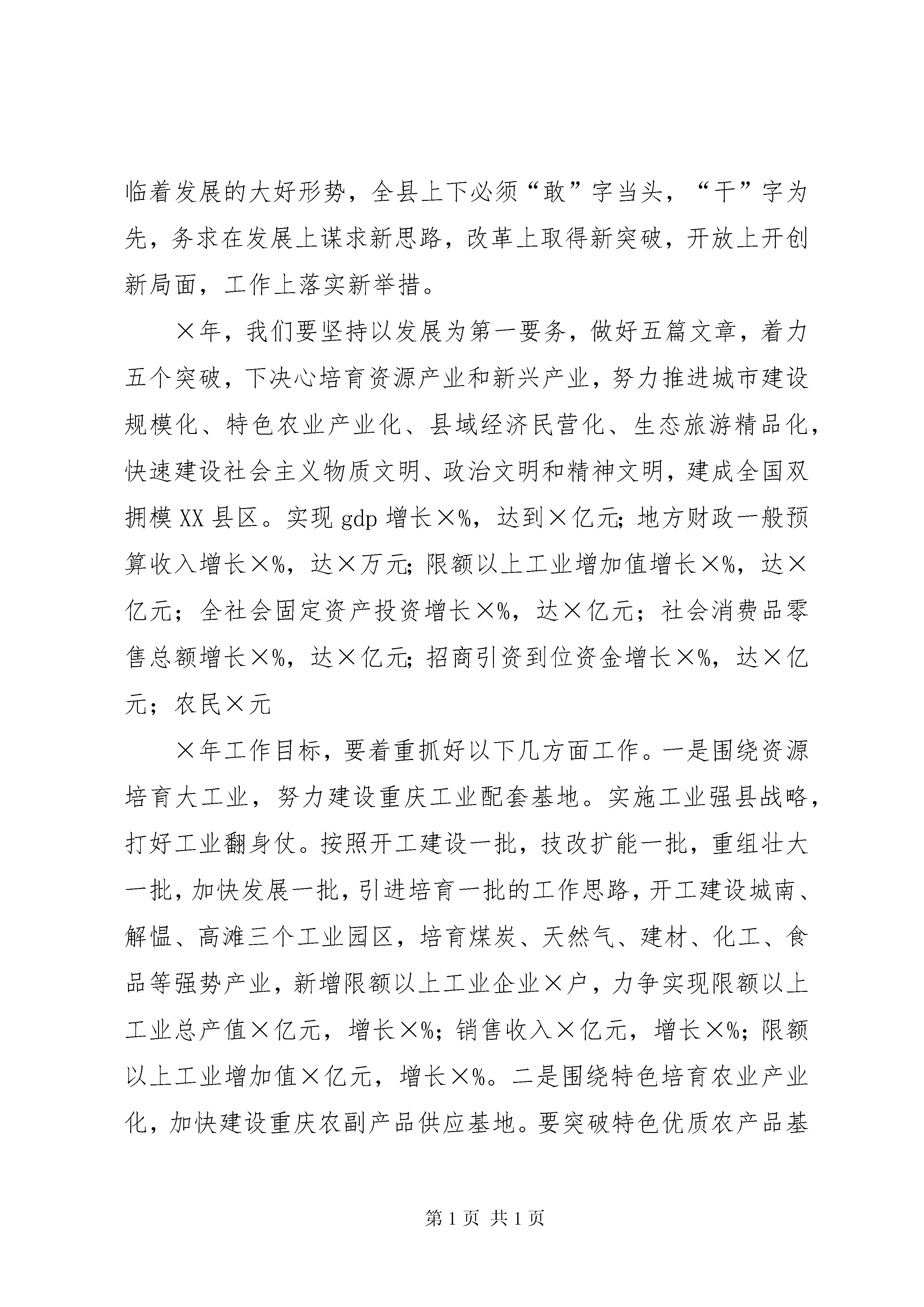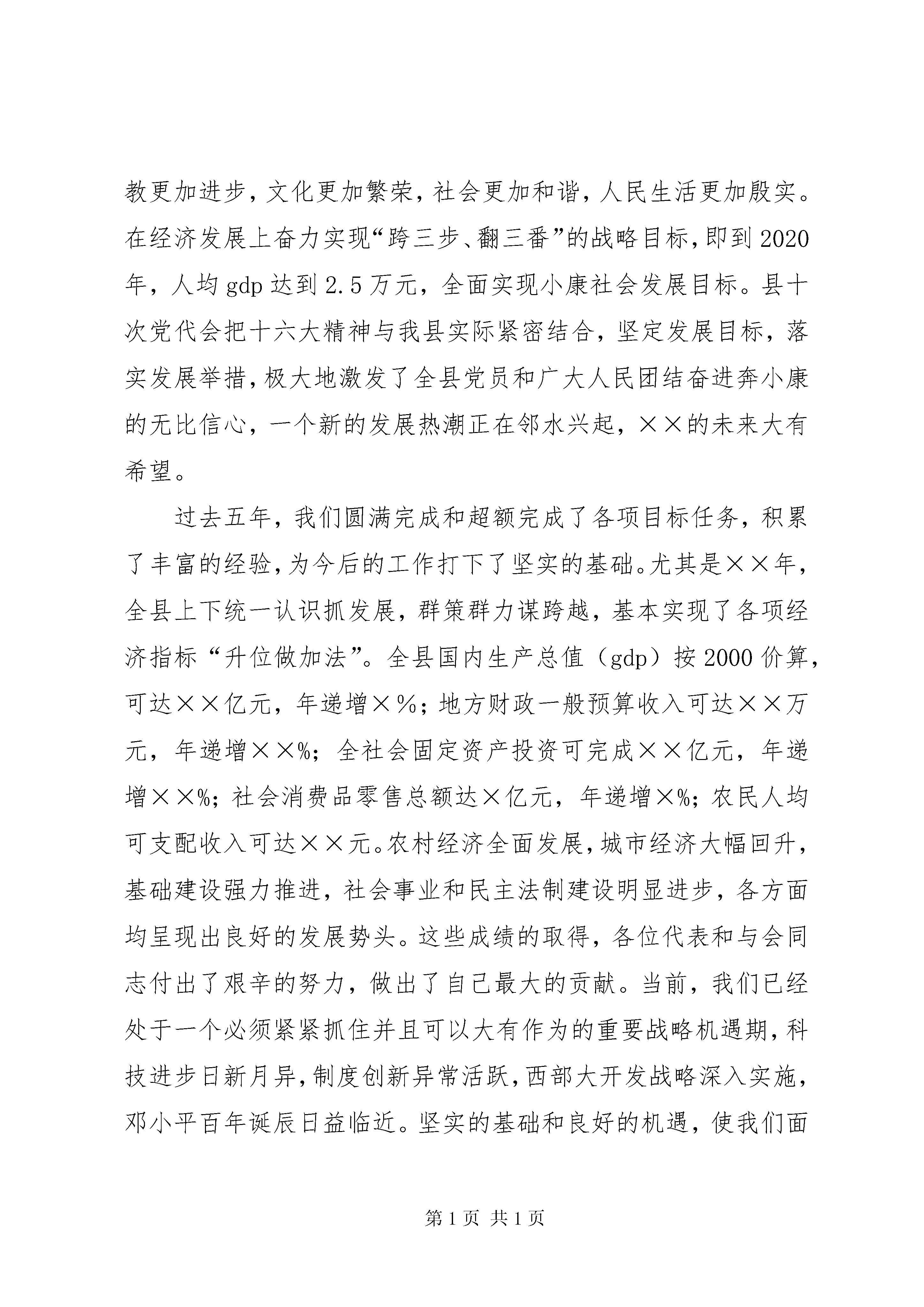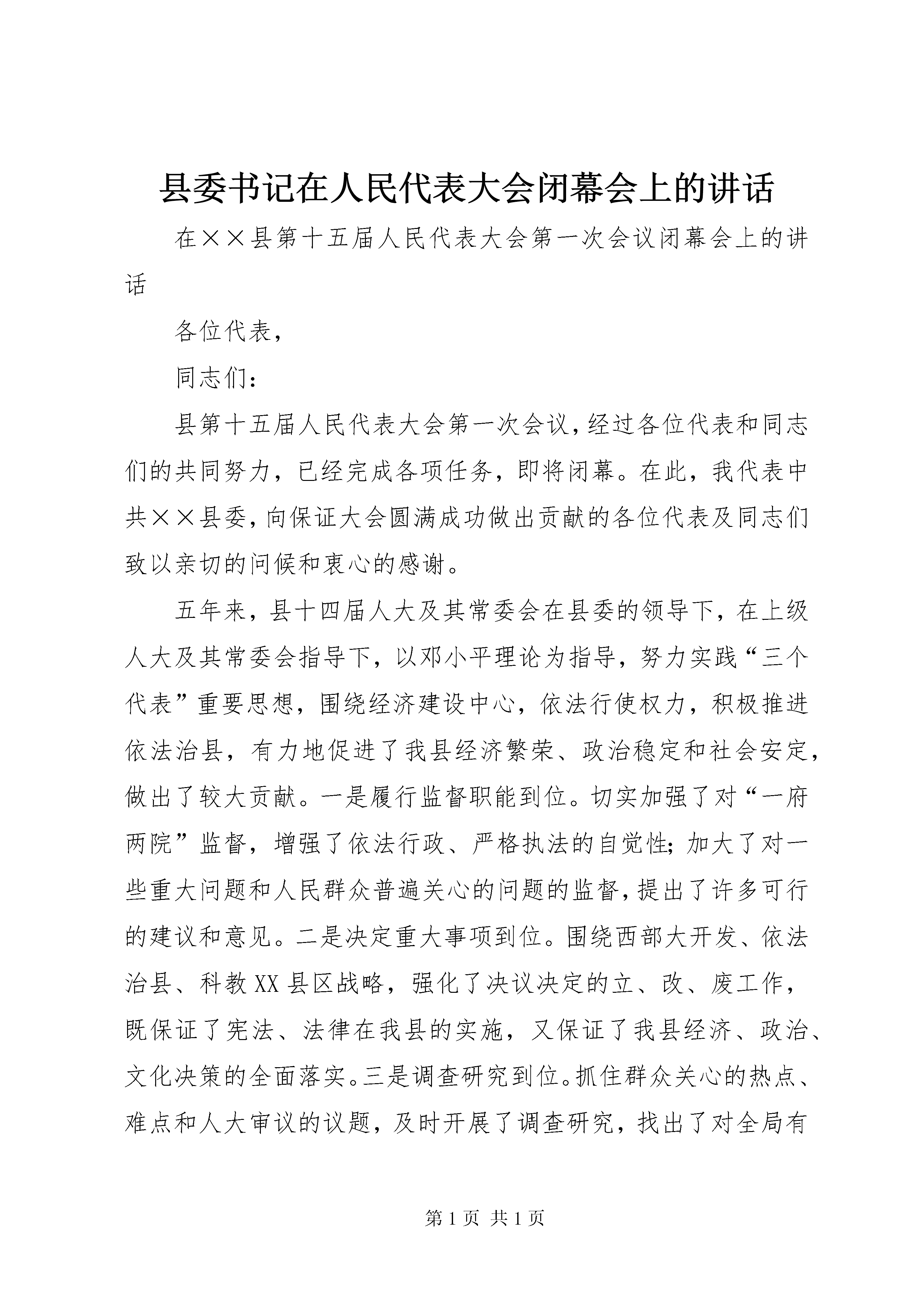 县委书记在人民代表大会闭幕会上的讲话在××县第十五届人民代表大会第一次会议闭幕会上的讲话各位代表,同志们:县第十五届人民代表大会第一次会议,经过各位代表和同志们的共同努力,已经完成各项任务,即将闭幕。在此,我代表中共××县委,向保证大会圆满成功做出贡献的各位代表及同志们致以亲切的问候和衷心的感谢。五年来,县十四届人大及其常委会在县委的领导下,在上级人大及其常委会指导下,以邓小平理论为指导,努力实践“三个代表”重要思想,围绕经济建设中心,依法行使权力,积极推进依法治县,有力地促进了我县经济繁荣、政治稳定和社会安定,做出了较大贡献。一是履行监督职能到位。切实加强了对“一府两院”监督,增强了依法行政、严格执法的自觉性;加大了对一些重大问题和人民群众普遍关心的问题的监督,提出了许多可行的建议和意见。二是决定重大事项到位。围绕西部大开发、依法治县、科教XX县区战略,强化了决议决定的立、改、废工作,既保证了宪法、法律在我县的实施,又保证了我县经济、政治、文化决策的全面落实。三是调查研究到位。抓住群众关心的热点、难点和人大审议的议题,及时开展了调查研究,找出了对全局有影响而又急需解决的问题,依法适时做出了决定,使我们的很多工作得到改进,使我县一些问题得到及时解决。四是依法任免干部工作到位。认真落实县委常委会精神,严格依照法定程序,及时调整和充实了干部队伍,保证了各级各部门工作的正常运转。五是法制宣传到位。大力开展了“三五”、“四五”普法工作,法制观念深入人心。××届人大及其常委会的工作,做到了县委满意,代表满意,群众满意。下面,我对今后的人大工作讲几点意见。一、认清形势强信心,围绕中心开展工作最近,我们党胜利召开了十六次全国代表大会,这是我国开始实施社会主义现代化建设第三步战略部署、全面建设小康社会的新形势下召开的一次十分重要的代表大会。大会发出了“全面建设小康社会,开创中国特色社会主义事业新局面”的动员令,全面部署了经济、政治、文化各方面的任务。十六大的召开,使我们进入了一个充满希望的崭新时代。在十六大精神的鼓舞下,我县胜利召开了×次党代会。大会确定了今后五年的奋斗目标,科学勾画了本世纪前20年的发展蓝图。大会要求,本世纪前二十年里,我们要坚持以发展为第一要务,走追赶型、跨越式、超常规发展道路,努力加强社会主义政治文明和精神文明建设,提高全民思想道德、科技文化、健康素质和物质文化生活水平,做到可持续发展能力更加增强,经济更加发展,民主更加健全,科教更加进步,文化更加繁荣,社会更加和谐,人民生活更加殷实。在经济发展上奋力实现“跨三步、翻三番”的战略目标,即到2020年,人均gdp达到2.5万元,全面实现小康社会发展目标。县十次党代会把十六大精神与我县实际紧密结合,坚定发展目标,落实发展举措,极大地激发了全县党员和广大人民团结奋进奔小康的无比信心,一个新的发展热潮正在邻水兴起,××的未来大有希望。过去五年,我们圆满完成和超额完成了各项目标任务,积累了丰富的经验,为今后的工作打下了坚实的基础。尤其是××年,全县上下统一认识抓发展,群策群力谋跨越,基本实现了各项经济指标“升位做加法”。全县国内生产总值(gdp)按2000价算,可达××亿元,年递增×%;地方财政一般预算收入可达××万元,年递增××%;全社会固定资产投资可完成××亿元,年递增××%;社会消费品零售总额达×亿元,年递增×%;农民人均可支配收入可达××元。农村经济全面发展,城市经济大幅回升,基础建设强力推进,社会事业和民主法制建设明显进步,各方面均呈现出良好的发展势头。这些成绩的取得,各位代表和与会同志付出了艰辛的努力,做出了自己最大的贡献。当前,我们已经处于一个必须紧紧抓住并且可以大有作为的重要战略机遇期,科技进步日新月异,制度创新异常活跃,西部大开发战略深入实施,邓小平百年诞辰日益临近。坚实的基础和良好的机遇,使我们面临着发展的大好形势,全县上下必须“敢”字当头,“干”字为先,务求在发展上谋求新思路,改革上取得新突破,开放上开创新局面,工作上落实新举措。×年,我们要坚持以发展为第一要务,做好五篇文章,着力五个突破,下决心培育资源产业和新兴产业,努力推进城市建设规模化、特色农业产业化、县域经济民营化、生态旅游精品化,快速建设社会主义物质文明、政治文明和精神文明,建成全国双拥模XX县区。实现gdp增长×%,达到×亿元;地方财政一般预算收入增长×%,达×万元;限额以上工业增加值增长×%,达×亿元;全社会固定资产投资增长×%,达×亿元;社会消费品零售总额增长×%,达×亿元;招商引资到位资金增长×%,达×亿元;农民×元×年工作目标,要着重抓好以下几方面工作。一是围绕资源培育大工业,努力建设重庆工业配套基地。实施工业强县战略,打好工业翻身仗。按照开工建设一批,技改扩能一