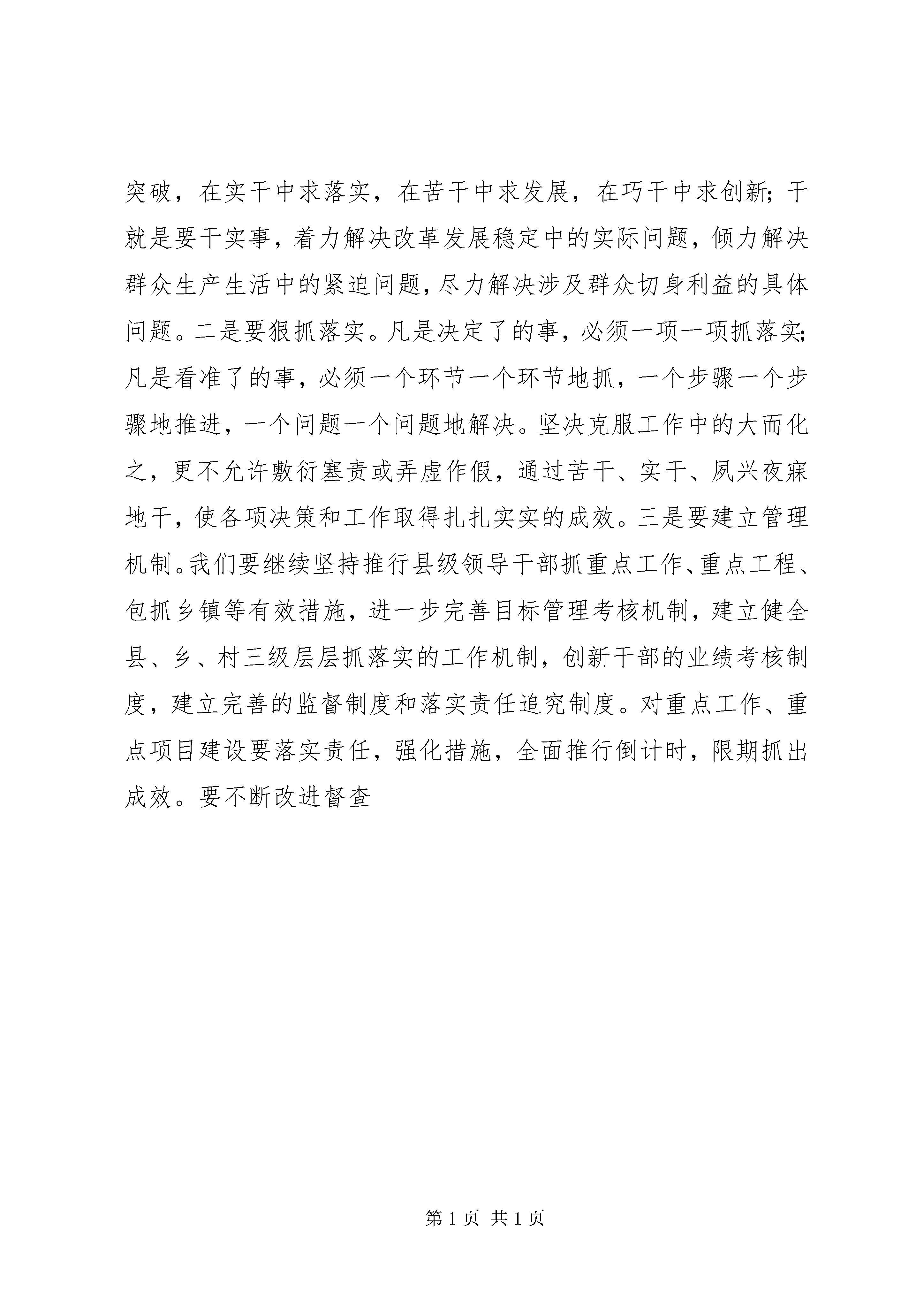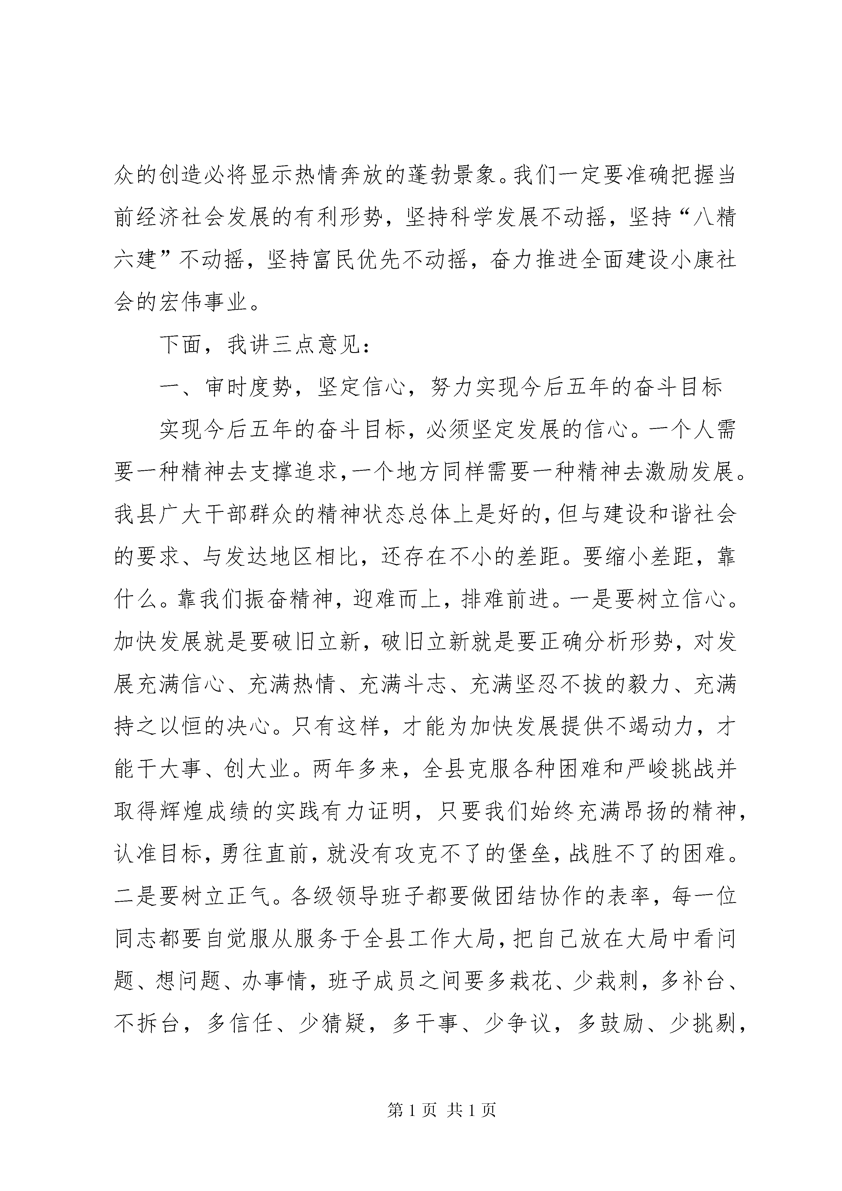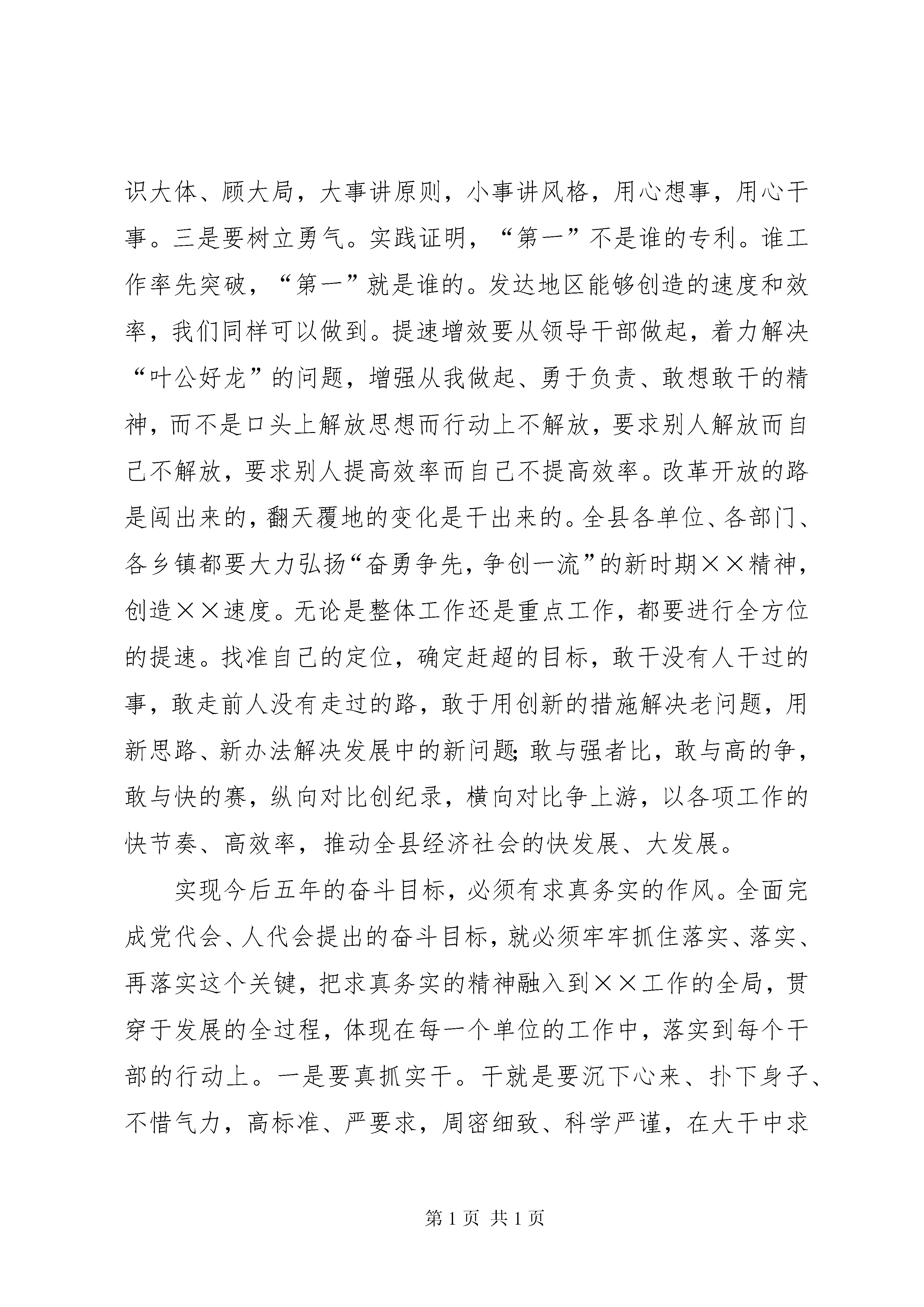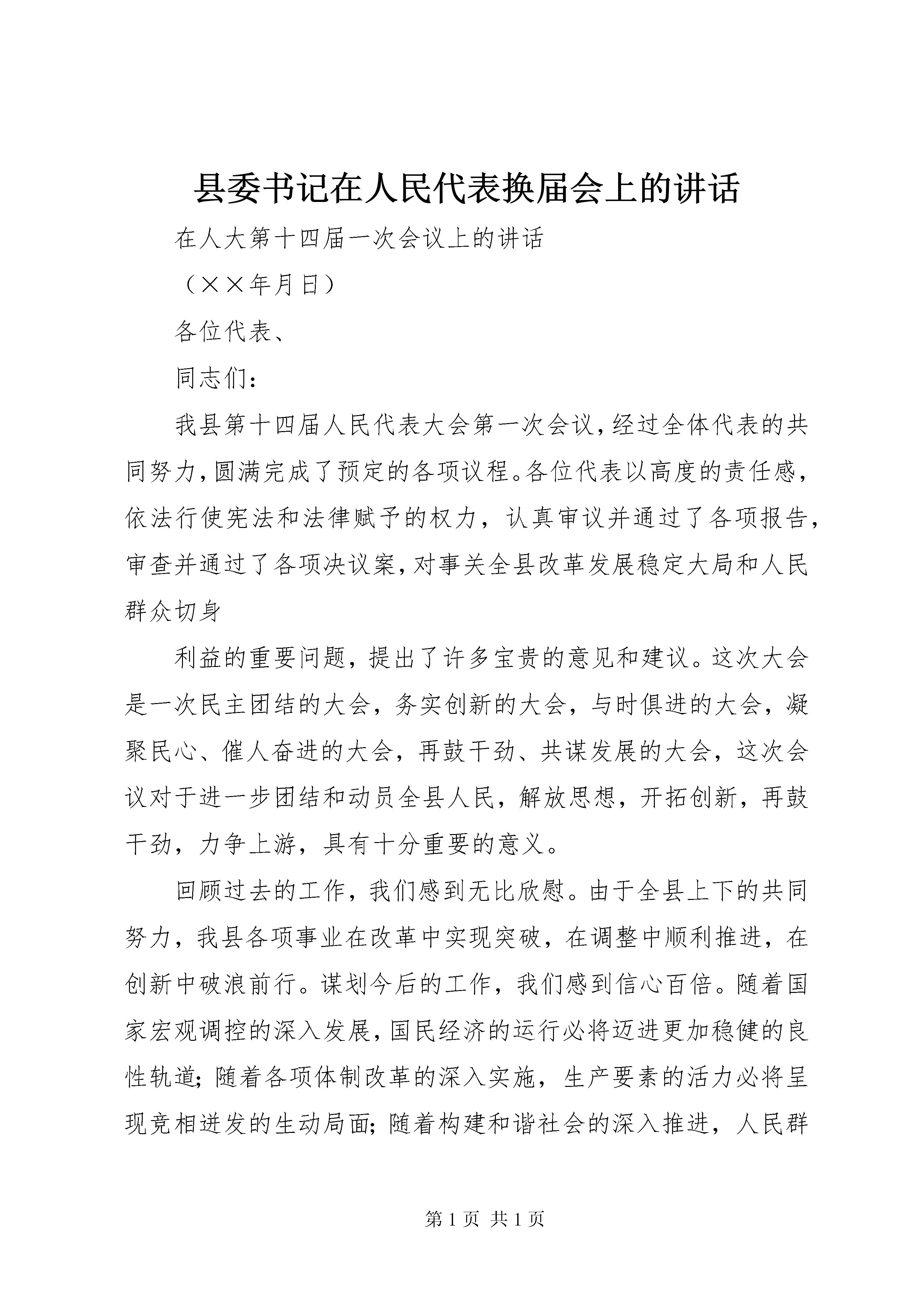 县委书记在人民代表换届会上的讲话在人大第十四届一次会议上的讲话(××年月日)各位代表、同志们:我县第十四届人民代表大会第一次会议,经过全体代表的共同努力,圆满完成了预定的各项议程。各位代表以高度的责任感,依法行使宪法和法律赋予的权力,认真审议并通过了各项报告,审查并通过了各项决议案,对事关全县改革发展稳定大局和人民群众切身利益的重要问题,提出了许多宝贵的意见和建议。这次大会是一次民主团结的大会,务实创新的大会,与时俱进的大会,凝聚民心、催人奋进的大会,再鼓干劲、共谋发展的大会,这次会议对于进一步团结和动员全县人民,解放思想,开拓创新,再鼓干劲,力争上游,具有十分重要的意义。回顾过去的工作,我们感到无比欣慰。由于全县上下的共同努力,我县各项事业在改革中实现突破,在调整中顺利推进,在创新中破浪前行。谋划今后的工作,我们感到信心百倍。随着国家宏观调控的深入发展,国民经济的运行必将迈进更加稳健的良性轨道;随着各项体制改革的深入实施,生产要素的活力必将呈现竞相迸发的生动局面;随着构建和谐社会的深入推进,人民群众的创造必将显示热情奔放的蓬勃景象。我们一定要准确把握当前经济社会发展的有利形势,坚持科学发展不动摇,坚持“八精六建”不动摇,坚持富民优先不动摇,奋力推进全面建设小康社会的宏伟事业。下面,我讲三点意见:一、审时度势,坚定信心,努力实现今后五年的奋斗目标实现今后五年的奋斗目标,必须坚定发展的信心。一个人需要一种精神去支撑追求,一个地方同样需要一种精神去激励发展。我县广大干部群众的精神状态总体上是好的,但与建设和谐社会的要求、与发达地区相比,还存在不小的差距。要缩小差距,靠什么。靠我们振奋精神,迎难而上,排难前进。一是要树立信心。加快发展就是要破旧立新,破旧立新就是要正确分析形势,对发展充满信心、充满热情、充满斗志、充满坚忍不拔的毅力、充满持之以恒的决心。只有这样,才能为加快发展提供不竭动力,才能干大事、创大业。两年多来,全县克服各种困难和严峻挑战并取得辉煌成绩的实践有力证明,只要我们始终充满昂扬的精神,认准目标,勇往直前,就没有攻克不了的堡垒,战胜不了的困难。二是要树立正气。各级领导班子都要做团结协作的表率,每一位同志都要自觉服从服务于全县工作大局,把自己放在大局中看问题、想问题、办事情,班子成员之间要多栽花、少栽刺,多补台、不拆台,多信任、少猜疑,多干事、少争议,多鼓励、少挑剔,识大体、顾大局,大事讲原则,小事讲风格,用心想事,用心干事。三是要树立勇气。实践证明,“第一”不是谁的专利。谁工作率先突破,“第一”就是谁的。发达地区能够创造的速度和效率,我们同样可以做到。提速增效要从领导干部做起,着力解决“叶公好龙”的问题,增强从我做起、勇于负责、敢想敢干的精神,而不是口头上解放思想而行动上不解放,要求别人解放而自己不解放,要求别人提高效率而自己不提高效率。改革开放的路是闯出来的,翻天覆地的变化是干出来的。全县各单位、各部门、各乡镇都要大力弘扬“奋勇争先,争创一流”的新时期××精神,创造××速度。无论是整体工作还是重点工作,都要进行全方位的提速。找准自己的定位,确定赶超的目标,敢干没有人干过的事,敢走前人没有走过的路,敢于用创新的措施解决老问题,用新思路、新办法解决发展中的新问题;敢与强者比,敢与高的争,敢与快的赛,纵向对比创纪录,横向对比争上游,以各项工作的快节奏、高效率,推动全县经济社会的快发展、大发展。实现今后五年的奋斗目标,必须有求真务实的作风。全面完成党代会、人代会提出的奋斗目标,就必须牢牢抓住落实、落实、再落实这个关键,把求真务实的精神融入到××工作的全局,贯穿于发展的全过程,体现在每一个单位的工作中,落实到每个干部的行动上。一是要真抓实干。干就是要沉下心来、扑下身子、不惜气力,高标准、严要求,周密细致、科学严谨,在大干中求突破,在实干中求落实,在苦干中求发展,在巧干中求创新;干就是要干实事,着力解决改革发展稳定中的实际问题,倾力解决群众生产生活中的紧迫问题,尽力解决涉及群众切身利益的具体问题。二是要狠抓落实。凡是决定了的事,必须一项一项抓落实;凡是看准了的事,必须一个环节一个环节地抓,一个步骤一个步骤地推进,一个问题一个问题地解决。坚决克服工作中的大而化之,更不允许敷衍塞责或弄虚作假,通过苦干、实干、夙兴夜寐地干,使各项决策和工作取得扎扎实实的成效。三是要建立管理机制。我们要继续坚持推行县级领导干部抓重点工作、重点工程、包抓乡镇等有效措施,进一步完善目标管理考核机制,建立健全县、乡、村三级层层抓落实的工作机制,创新干部的业绩考核制度,建立完善的监督制度和落实责任追究制度。对重点工作、重点项目建设要落实责任,强化措施,全面推行倒计时,限期抓出成效。要不断改进督查