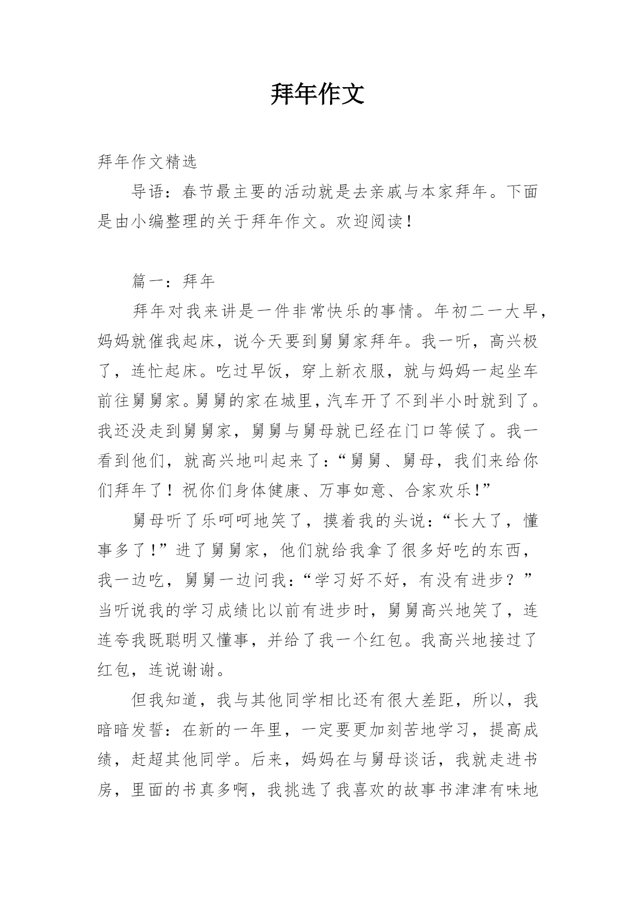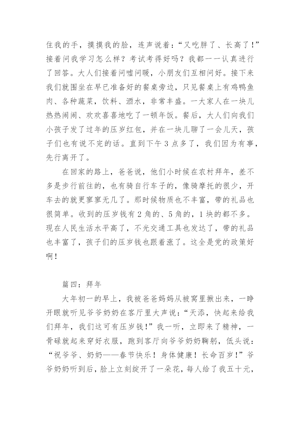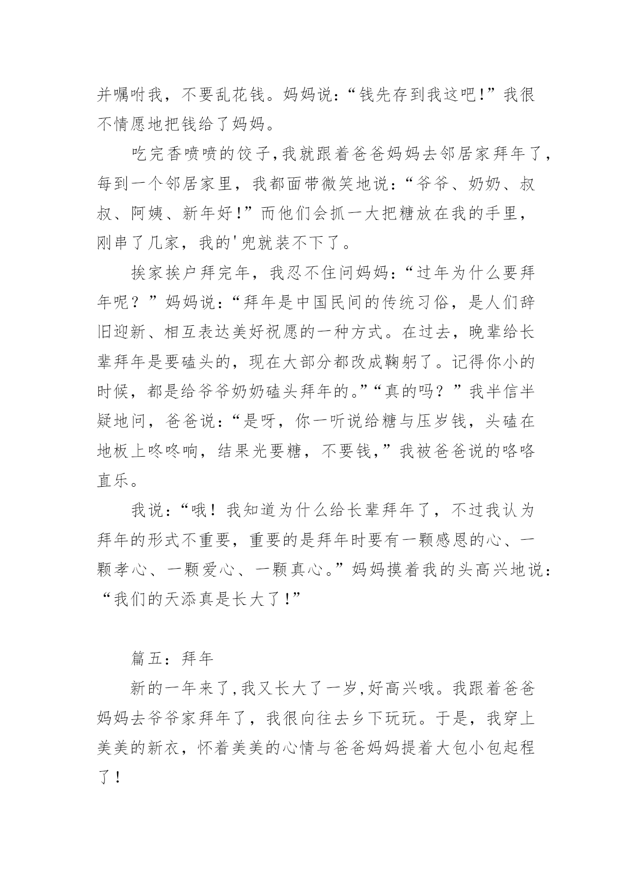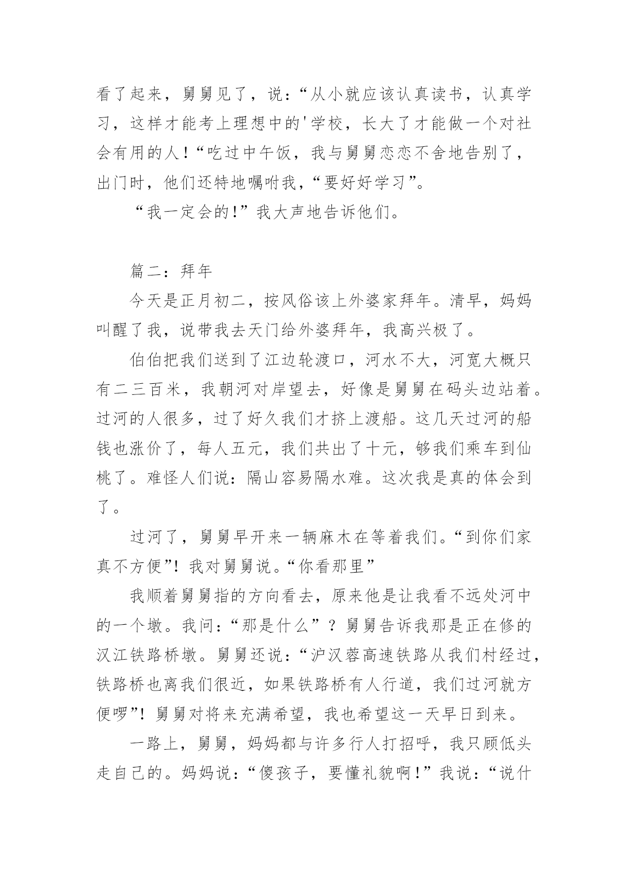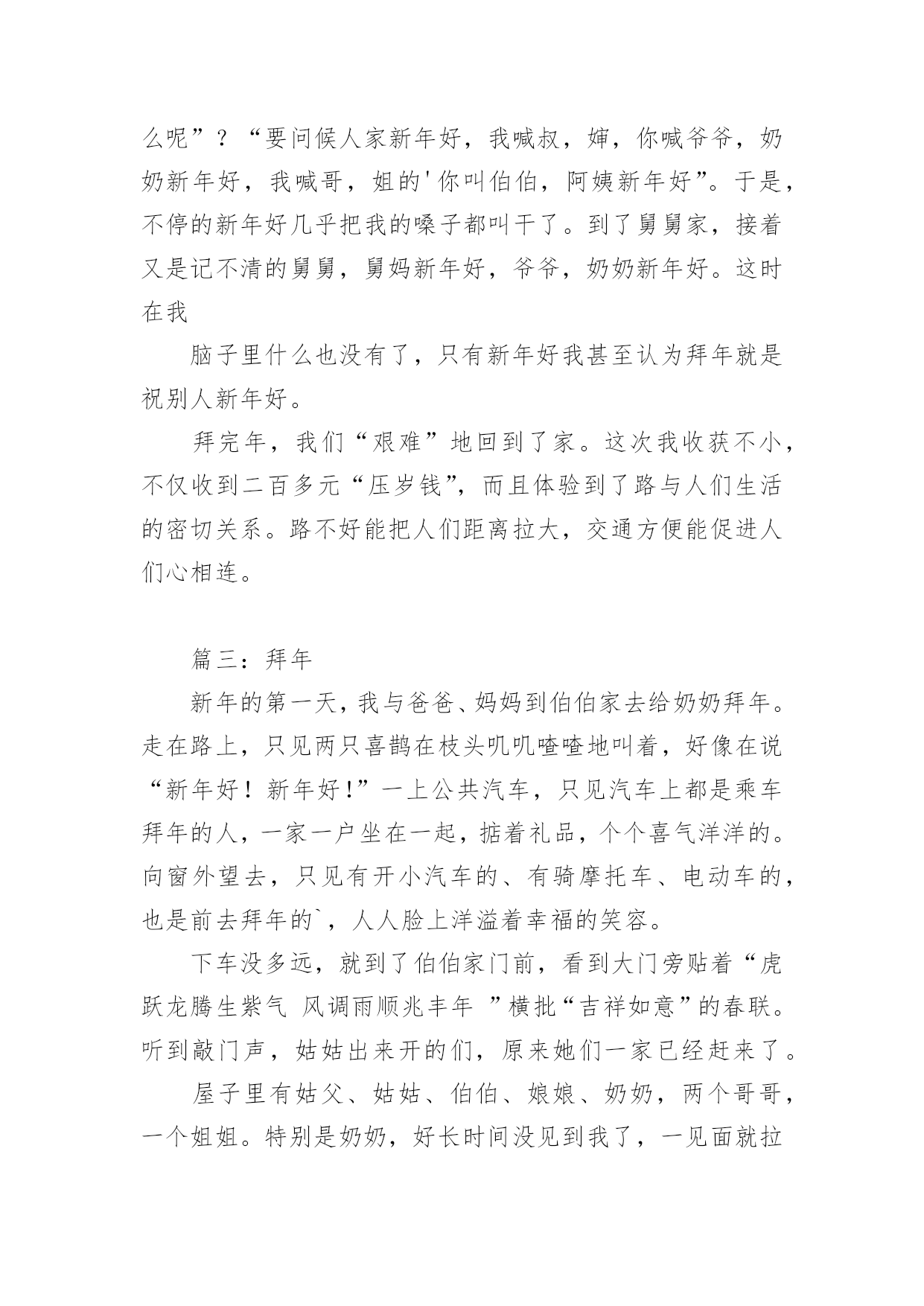 拜年作文 拜年作文精选导语:春节最主要的活动就是去亲戚与本家拜年。下面是由小编整理的关于拜年作文。欢迎阅读!篇一:拜年拜年对我来讲是一件非常快乐的事情。年初二一大早,妈妈就催我起床,说今天要到舅舅家拜年。我一听,高兴极了,连忙起床。吃过早饭,穿上新衣服,就与妈妈一起坐车前往舅舅家。舅舅的家在城里,汽车开了不到半小时就到了。我还没走到舅舅家,舅舅与舅母就已经在门口等候了。我一看到他们,就高兴地叫起来了:“舅舅、舅母,我们来给你们拜年了!祝你们身体健康、万事如意、合家欢乐!”舅母听了乐呵呵地笑了,摸着我的头说:“长大了,懂事多了!”进了舅舅家,他们就给我拿了很多好吃的东西,我一边吃,舅舅一边问我:“学习好不好,有没有进步?”当听说我的学习成绩比以前有进步时,舅舅高兴地笑了,连连夸我既聪明又懂事,并给了我一个红包。我高兴地接过了红包,连说谢谢。但我知道,我与其他同学相比还有很大差距,所以,我暗暗发誓:在新的一年里,一定要更加刻苦地学习,提高成绩,赶超其他同学。后来,妈妈在与舅母谈话,我就走进书房,里面的书真多啊,我挑选了我喜欢的故事书津津有味地看了起来,舅舅见了,说:“从小就应该认真读书,认真学习,这样才能考上理想中的'学校,长大了才能做一个对社会有用的人!“吃过中午饭,我与舅舅恋恋不舍地告别了,出门时,他们还特地嘱咐我,“要好好学习”。“我一定会的!”我大声地告诉他们。篇二:拜年今天是正月初二,按风俗该上外婆家拜年。清早,妈妈叫醒了我,说带我去天门给外婆拜年,我高兴极了。伯伯把我们送到了江边轮渡口,河水不大,河宽大概只有二三百米,我朝河对岸望去,好像是舅舅在码头边站着。过河的人很多,过了好久我们才挤上渡船。这几天过河的船钱也涨价了,每人五元,我们共出了十元,够我们乘车到仙桃了。难怪人们说:隔山容易隔水难。这次我是真的体会到了。过河了,舅舅早开来一辆麻木在等着我们。“到你们家真不方便”!我对舅舅说。“你看那里”我顺着舅舅指的方向看去,原来他是让我看不远处河中的一个墩。我问:“那是什么”?舅舅告诉我那是正在修的汉江铁路桥墩。舅舅还说:“沪汉蓉高速铁路从我们村经过,铁路桥也离我们很近,如果铁路桥有人行道,我们过河就方便啰”!舅舅对将来充满希望,我也希望这一天早日到来。一路上,舅舅,妈妈都与许多行人打招呼,我只顾低头走自己的。妈妈说:“傻孩子,要懂礼貌啊!”我说:“说什么呢”?“要问候人家新年好,我喊叔,婶,你喊爷爷,奶奶新年好,我喊哥,姐的'你叫伯伯,阿姨新年好”。于是,不停的新年好几乎把我的嗓子都叫干了。到了舅舅家,接着又是记不清的舅舅,舅妈新年好,爷爷,奶奶新年好。这时在我脑子里什么也没有了,只有新年好我甚至认为拜年就是祝别人新年好。拜完年,我们“艰难”地回到了家。这次我收获不小,不仅收到二百多元“压岁钱”,而且体验到了路与人们生活的密切关系。路不好能把人们距离拉大,交通方便能促进人们心相连。篇三:拜年新年的第一天,我与爸爸、妈妈到伯伯家去给奶奶拜年。走在路上,只见两只喜鹊在枝头叽叽喳喳地叫着,好像在说“新年好!新年好!”一上公共汽车,只见汽车上都是乘车拜年的人,一家一户坐在一起,掂着礼品,个个喜气洋洋的。向窗外望去,只见有开小汽车的、有骑摩托车、电动车的,也是前去拜年的`,人人脸上洋溢着幸福的笑容。下车没多远,就到了伯伯家门前,看到大门旁贴着“虎跃龙腾生紫气风调雨顺兆丰年”横批“吉祥如意”的春联。听到敲门声,姑姑出来开的们,原来她们一家已经赶来了。屋子里有姑父、姑姑、伯伯、娘娘、奶奶,两个哥哥,一个姐姐。特别是奶奶,好长时间没见到我了,一见面就拉住我的手,摸摸我的脸,连声说着:“又吃胖了、长高了!”接着问我学习怎么样?考试考得好吗?我都一一认真进行了回答。大人们接着问嘘问暖,小朋友们互相问好。接下来我们就围坐在早已准备好的餐桌旁边,只见餐桌上有鸡鸭鱼肉、各种蔬菜,饮料、酒水,非常丰盛。一大家人在一块儿热热闹闹、欢欢喜喜地吃了一顿年饭。餐后,大人们向我们小孩子发了过年的压岁红包,并在一块儿聊了一会儿天,孩子们也有说不完的话。直到下午3点多了,我们因为有事,先行离开了。在回家的路上,爸爸说,他们小时候在农村拜年,差不多是步行前往的,也有骑自行车子的,像骑摩托的很少,开车去的就更寥寥无几了。那时候物质也不丰富,带的礼品也很简单。收到的压岁钱有2角的、5角的,1块的都不多。现在人民生活水平高了,不光交通工具也发达了,带的礼品也丰富了,孩子们的压岁钱也跟着涨了。这全是党的政策好啊!篇四:拜年大年初一的早上,我被爸爸妈妈从被窝里揪出来,一睁开眼就听见爷爷奶奶在客厅里大声说:“天添,快起来给我们拜年,我们这可有压岁钱!”我一听,立即来了精神,一骨碌就起来穿好衣服,跑到客厅向爷爷奶奶鞠躬,低头说:“祝爷爷、奶奶——春节快乐!身体健康!长命百岁!