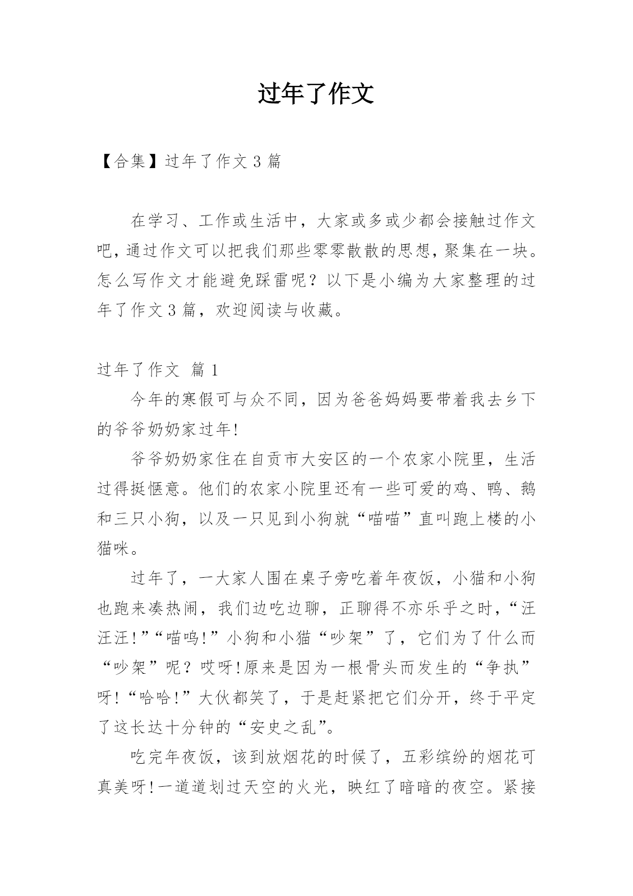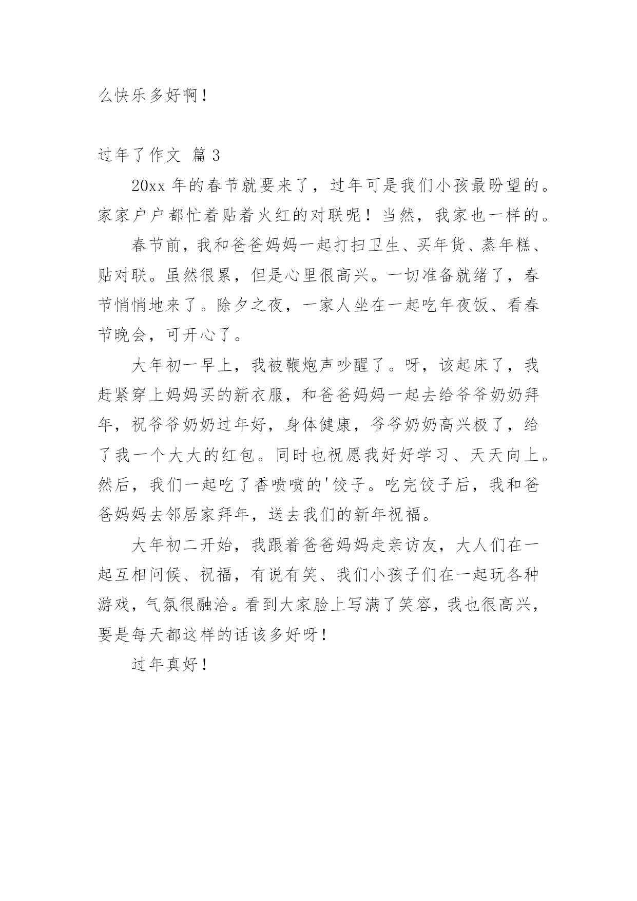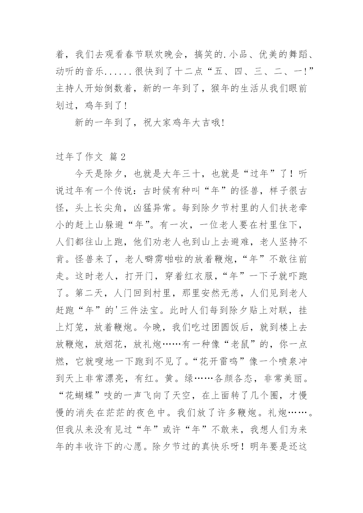 过年了作文 【合集】过年了作文3篇在学习、工作或生活中,大家或多或少都会接触过作文吧,通过作文可以把我们那些零零散散的思想,聚集在一块。怎么写作文才能避免踩雷呢?以下是小编为大家整理的过年了作文3篇,欢迎阅读与收藏。过年了作文篇1今年的寒假可与众不同,因为爸爸妈妈要带着我去乡下的爷爷奶奶家过年!爷爷奶奶家住在自贡市大安区的一个农家小院里,生活过得挺惬意。他们的农家小院里还有一些可爱的鸡、鸭、鹅和三只小狗,以及一只见到小狗就“喵喵”直叫跑上楼的小猫咪。过年了,一大家人围在桌子旁吃着年夜饭,小猫和小狗也跑来凑热闹,我们边吃边聊,正聊得不亦乐乎之时,“汪汪汪!”“喵呜!”小狗和小猫“吵架”了,它们为了什么而“吵架”呢?哎呀!原来是因为一根骨头而发生的“争执”呀!“哈哈!”大伙都笑了,于是赶紧把它们分开,终于平定了这长达十分钟的“安史之乱”。吃完年夜饭,该到放烟花的时候了,五彩缤纷的烟花可真美呀!一道道划过天空的火光,映红了暗暗的夜空。紧接着,我们去观看春节联欢晚会,搞笑的.小品、优美的舞蹈、动听的音乐......很快到了十二点“五、四、三、二、一!”主持人开始倒数着,新的一年到了,猴年的生活从我们眼前划过,鸡年到了!新的一年到了,祝大家鸡年大吉哦!过年了作文篇2今天是除夕,也就是大年三十,也就是“过年”了!听说过年有一个传说:古时候有种叫“年”的怪兽,样子很古怪,头上长尖角,凶猛异常。每到除夕节村里的人们扶老牵小的赶上山躲避“年”。有一次,一位老人要在村里住下,人们都往山上跑,他们劝老人也到山上去避难,老人坚持不肯。怪兽来了,老人噼雳啪啦的放着鞭炮,“年”不敢往前走。这时老人,打开门,穿着红衣服,“年”一下子就吓跑了。第二天,人门回到村里,那里安然无恙,人们见到老人赶跑“年”的'三件法宝。此时人们每到除夕贴上对联,挂上灯笼,放着鞭炮。今晚,我们吃过团圆饭后,就到楼上去放鞭炮,放烟花,放礼炮……有一种像“老鼠”的,你一点燃,它就嗖地一下跑到不见了。“花开雷鸣”像一个喷泉冲到天上非常漂亮,有红。黄。绿……各颜各态,非常美丽。“花蝴蝶”吱的一声飞向了天空,在上面转了几个圈,才慢慢的消失在茫茫的夜色中。我们放了许多鞭炮。礼炮……。但我从来没有见过“年”或许“年”不敢来,我想人们为来年的丰收许下的心愿。除夕节过的真快乐呀!明年要是还这么快乐多好啊!过年了作文篇320xx年的春节就要来了,过年可是我们小孩最盼望的。家家户户都忙着贴着火红的对联呢!当然,我家也一样的。春节前,我和爸爸妈妈一起打扫卫生、买年货、蒸年糕、贴对联。虽然很累,但是心里很高兴。一切准备就绪了,春节悄悄地来了。除夕之夜,一家人坐在一起吃年夜饭、看春节晚会,可开心了。大年初一早上,我被鞭炮声吵醒了。呀,该起床了,我赶紧穿上妈妈买的新衣服,和爸爸妈妈一起去给爷爷奶奶拜年,祝爷爷奶奶过年好,身体健康,爷爷奶奶高兴极了,给了我一个大大的红包。同时也祝愿我好好学习、天天向上。然后,我们一起吃了香喷喷的'饺子。吃完饺子后,我和爸爸妈妈去邻居家拜年,送去我们的新年祝福。大年初二开始,我跟着爸爸妈妈走亲访友,大人们在一起互相问候、祝福,有说有笑、我们小孩子们在一起玩各种游戏,气氛很融洽。看到大家脸上写满了笑容,我也很高兴,要是每天都这样的话该多好呀!过年真好!