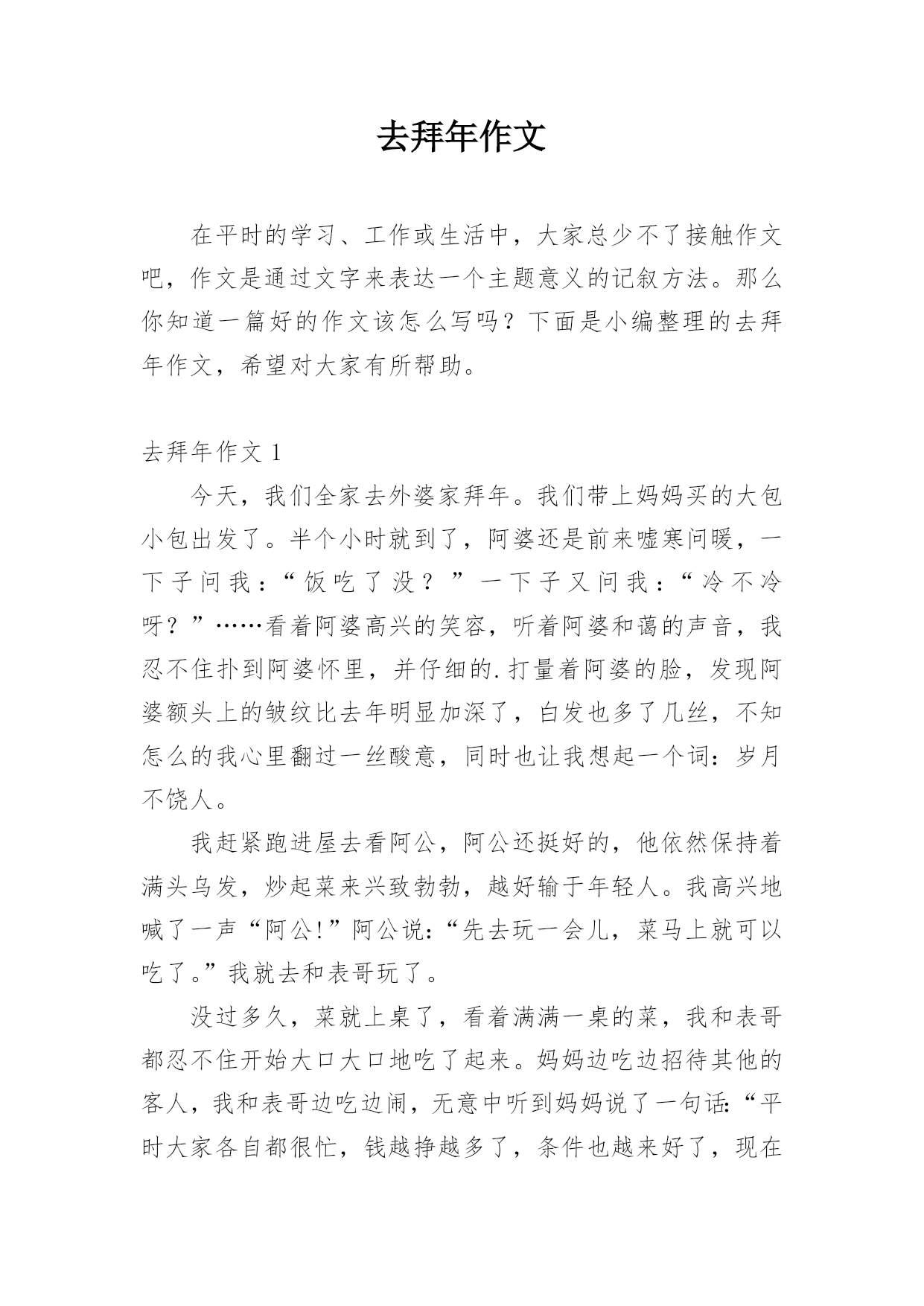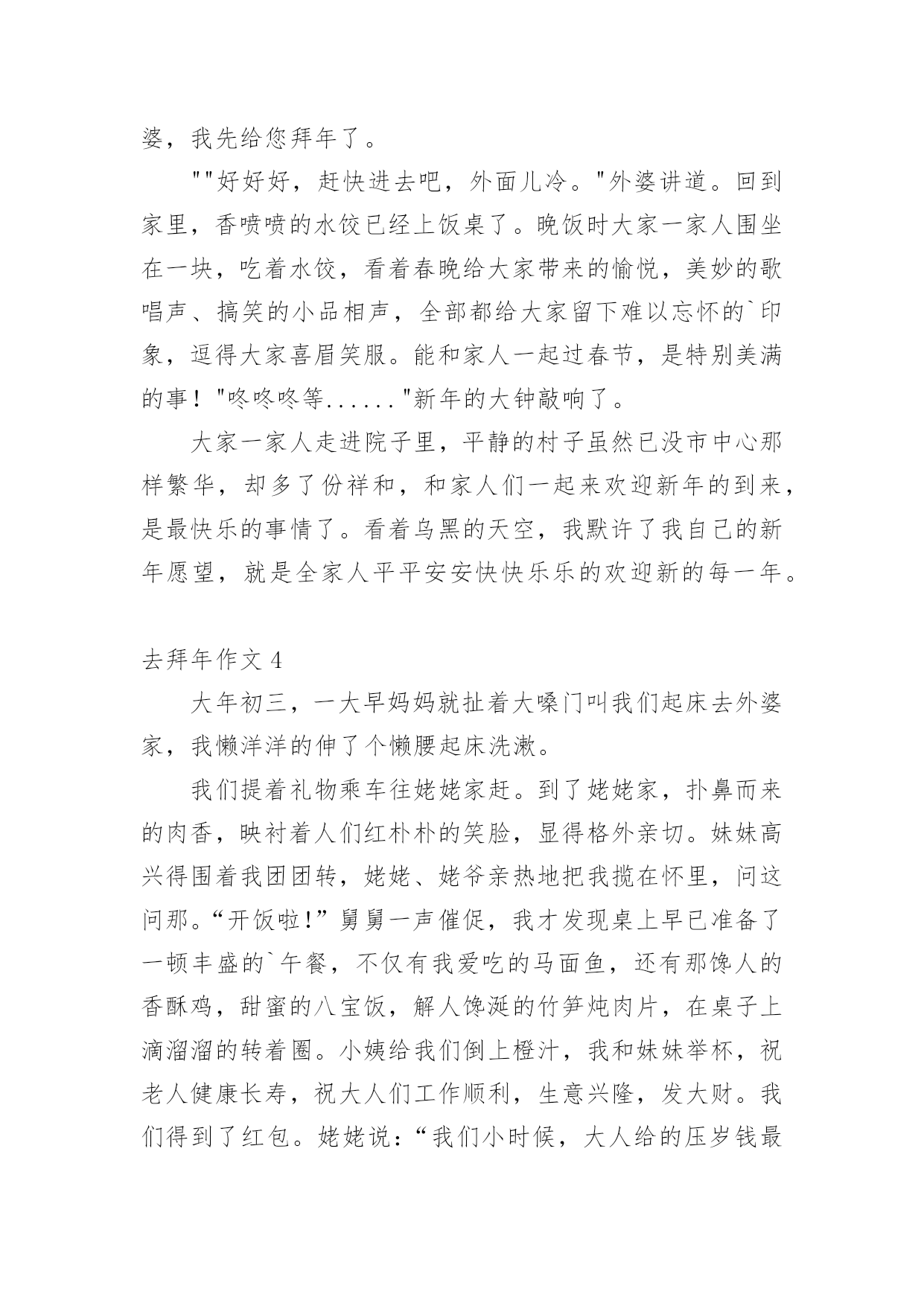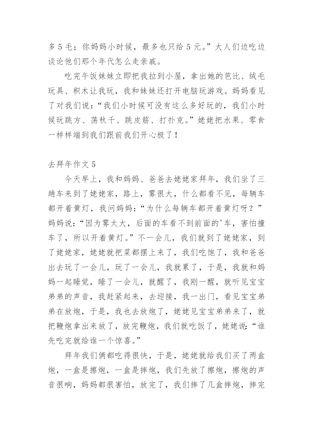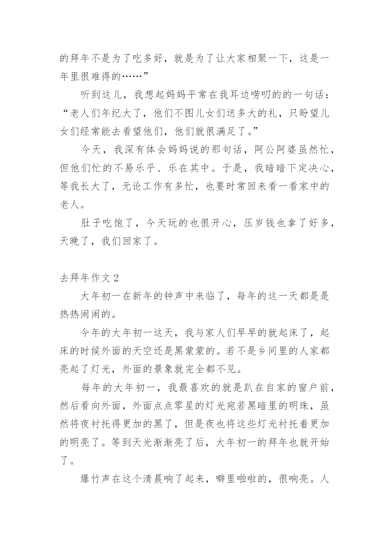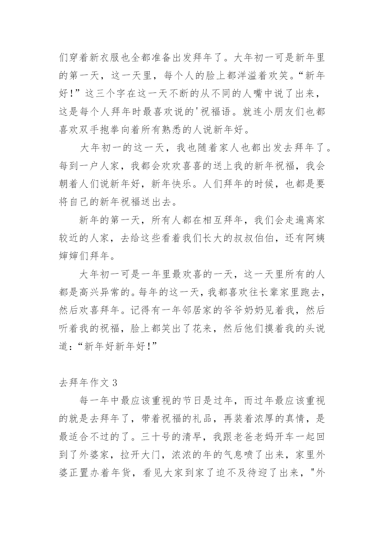 去拜年作文 在平时的学习、工作或生活中,大家总少不了接触作文吧,作文是通过文字来表达一个主题意义的记叙方法。那么你知道一篇好的作文该怎么写吗?下面是小编整理的去拜年作文,希望对大家有所帮助。去拜年作文1今天,我们全家去外婆家拜年。我们带上妈妈买的大包小包出发了。半个小时就到了,阿婆还是前来嘘寒问暖,一下子问我:“饭吃了没?”一下子又问我:“冷不冷呀?”……看着阿婆高兴的笑容,听着阿婆和蔼的声音,我忍不住扑到阿婆怀里,并仔细的.打量着阿婆的脸,发现阿婆额头上的皱纹比去年明显加深了,白发也多了几丝,不知怎么的我心里翻过一丝酸意,同时也让我想起一个词:岁月不饶人。我赶紧跑进屋去看阿公,阿公还挺好的,他依然保持着满头乌发,炒起菜来兴致勃勃,越好输于年轻人。我高兴地喊了一声“阿公!”阿公说:“先去玩一会儿,菜马上就可以吃了。”我就去和表哥玩了。没过多久,菜就上桌了,看着满满一桌的菜,我和表哥都忍不住开始大口大口地吃了起来。妈妈边吃边招待其他的客人,我和表哥边吃边闹,无意中听到妈妈说了一句话:“平时大家各自都很忙,钱越挣越多了,条件也越来好了,现在的拜年不是为了吃多好,就是为了让大家相聚一下,这是一年里很难得的……”听到这儿,我想起妈妈平常在我耳边唠叨的的一句话:“老人们年纪大了,他们不图儿女们送多大的礼,只盼望儿女们经常能去看望他们,他们就很满足了。”今天,我深有体会妈妈说的那句话,阿公阿婆虽然忙,但他们忙的不易乐乎、乐在其中。于是,我暗暗下定决心,等我长大了,无论工作有多忙,也要时常回来看一看家中的老人。肚子吃饱了,今天玩的也很开心,压岁钱也拿了好多,天晚了,我们回家了。去拜年作文2大年初一在新年的钟声中来临了,每年的这一天都是是热热闹闹的。今年的大年初一这天,我与家人们早早的就起床了,起床的时候外面的天空还是黑蒙蒙的。若不是乡间里的人家都亮起了灯光,外面的景象就完全都不见。每年的大年初一,我最喜欢的就是趴在自家的窗户前,然后看向外面,外面点点零星的灯光宛若黑暗里的明珠,虽然将夜衬托得更加的黑了,但是夜也将这些灯光衬托着更加的明亮了。等到天光渐渐亮了后,大年初一的拜年也就开始了。爆竹声在这个清晨响了起来,噼里啪啦的,很响亮。人们穿着新衣服也全都准备出发拜年了。大年初一可是新年里的第一天,这一天里,每个人的脸上都洋溢着欢笑。“新年好!”这三个字在这一天不断的从不同的人嘴中说了出来,这是每个人拜年时最喜欢说的'祝福语。就连小朋友们也都喜欢双手抱拳向着所有熟悉的人说新年好。大年初一的这一天,我也随着家人也都出发去拜年了。每到一户人家,我都会欢欢喜喜的送上我的新年祝福,我会朝着人们说新年好,新年快乐。人们拜年的时候,也都是要将自己的新年祝福送出去。新年的第一天,所有人都在相互拜年,我们会走遍离家较近的人家,去给这些看着我们长大的叔叔伯伯,还有阿姨婶婶们拜年。大年初一可是一年里最欢喜的一天,这一天里所有的人都是高兴异常的。每年的这一天,我都喜欢往长辈家里跑去,然后欢喜拜年。记得有一年邻居家的爷爷奶奶见着我,然后听着我的祝福,脸上都笑出了花来,然后他们摸着我的头说道:“新年好新年好!”去拜年作文3每一年中最应该重视的节日是过年,而过年最应该重视的就是去拜年了,带着祝福的礼品,再装着浓厚的真情,是最适合不过的了。三十号的清早,我跟老爸老妈开车一起回到了外婆家,拉开大门,浓浓的年的气息喷了出来,家里外婆正置办着年货,看见大家到家了迫不及待迎了出来,"外婆,我先给您拜年了。""好好好,赶快进去吧,外面儿冷。"外婆讲道。回到家里,香喷喷的水饺已经上饭桌了。晚饭时大家一家人围坐在一块,吃着水饺,看着春晚给大家带来的愉悦,美妙的歌唱声、搞笑的小品相声,全部都给大家留下难以忘怀的`印象,逗得大家喜眉笑服。能和家人一起过春节,是特别美满的事!"咚咚咚等......"新年的大钟敲响了。大家一家人走进院子里,平静的村子虽然已没市中心那样繁华,却多了份祥和,和家人们一起来欢迎新年的到来,是最快乐的事情了。看着乌黑的天空,我默许了我自己的新年愿望,就是全家人平平安安快快乐乐的欢迎新的每一年。去拜年作文4大年初三,一大早妈妈就扯着大嗓门叫我们起床去外婆家,我懒洋洋的伸了个懒腰起床洗漱。我们提着礼物乘车往姥姥家赶。到了姥姥家,扑鼻而来的肉香,映衬着人们红朴朴的笑脸,显得格外亲切。妹妹高兴得围着我团团转,姥姥、姥爷亲热地把我揽在怀里,问这问那。“开饭啦!”舅舅一声催促,我才发现桌上早已准备了一顿丰盛的`午餐,不仅有我爱吃的马面鱼,还有那馋人的香酥鸡,甜蜜的八宝饭,解人馋涎的竹笋炖肉片,在桌子上滴溜溜的转着圈。小姨给我们倒上橙汁,我和妹妹举杯,祝老人健康长寿,祝大人们工作顺利,生意兴隆,发大财。我们得到了红包。姥姥说:“我们小时候,大人给的压岁钱最多5毛;你妈妈小时候,最多也