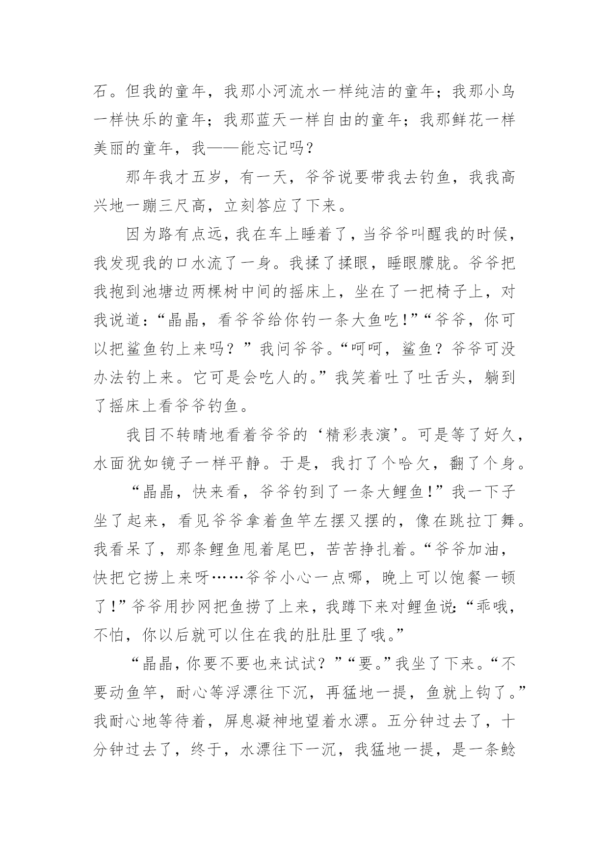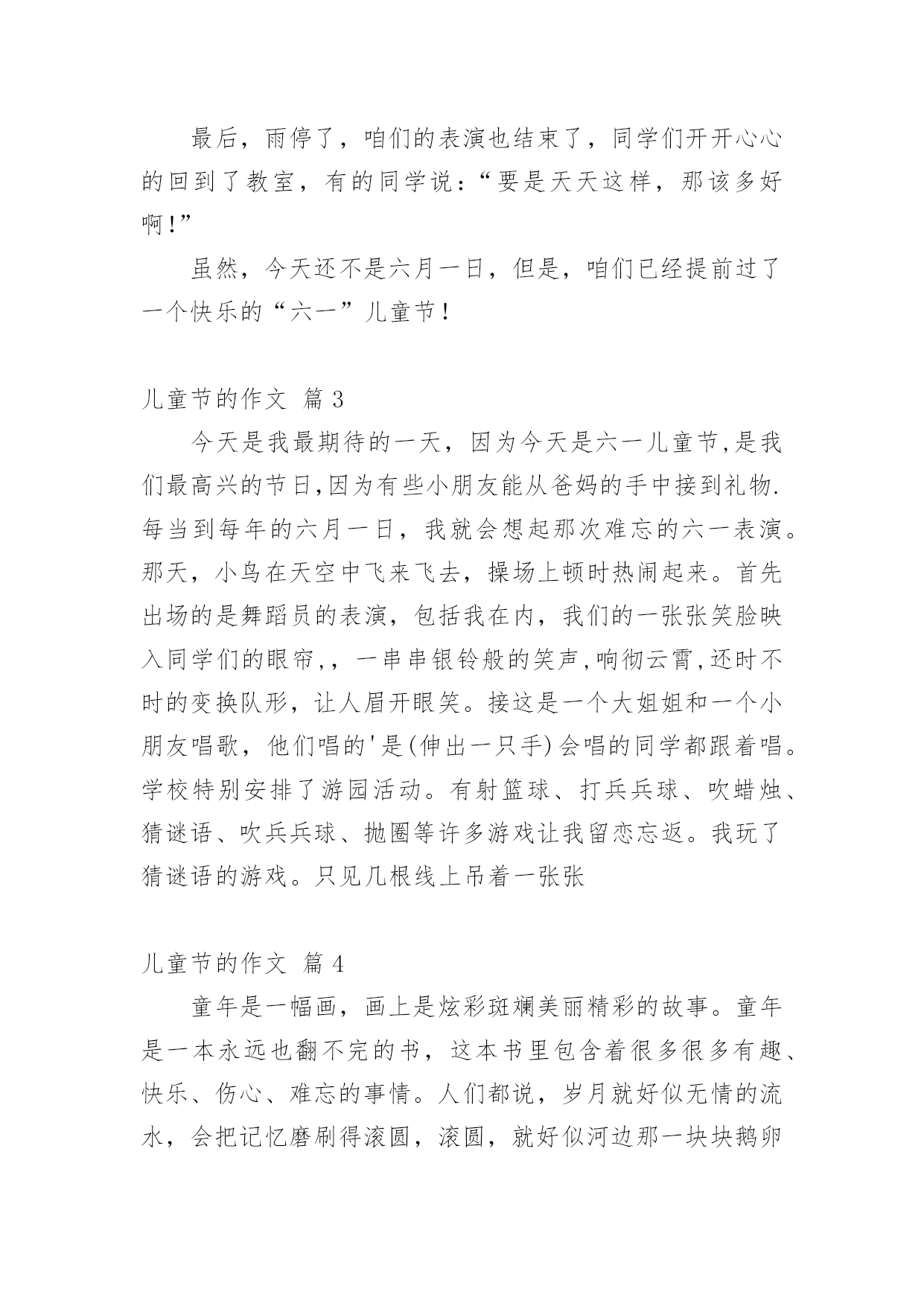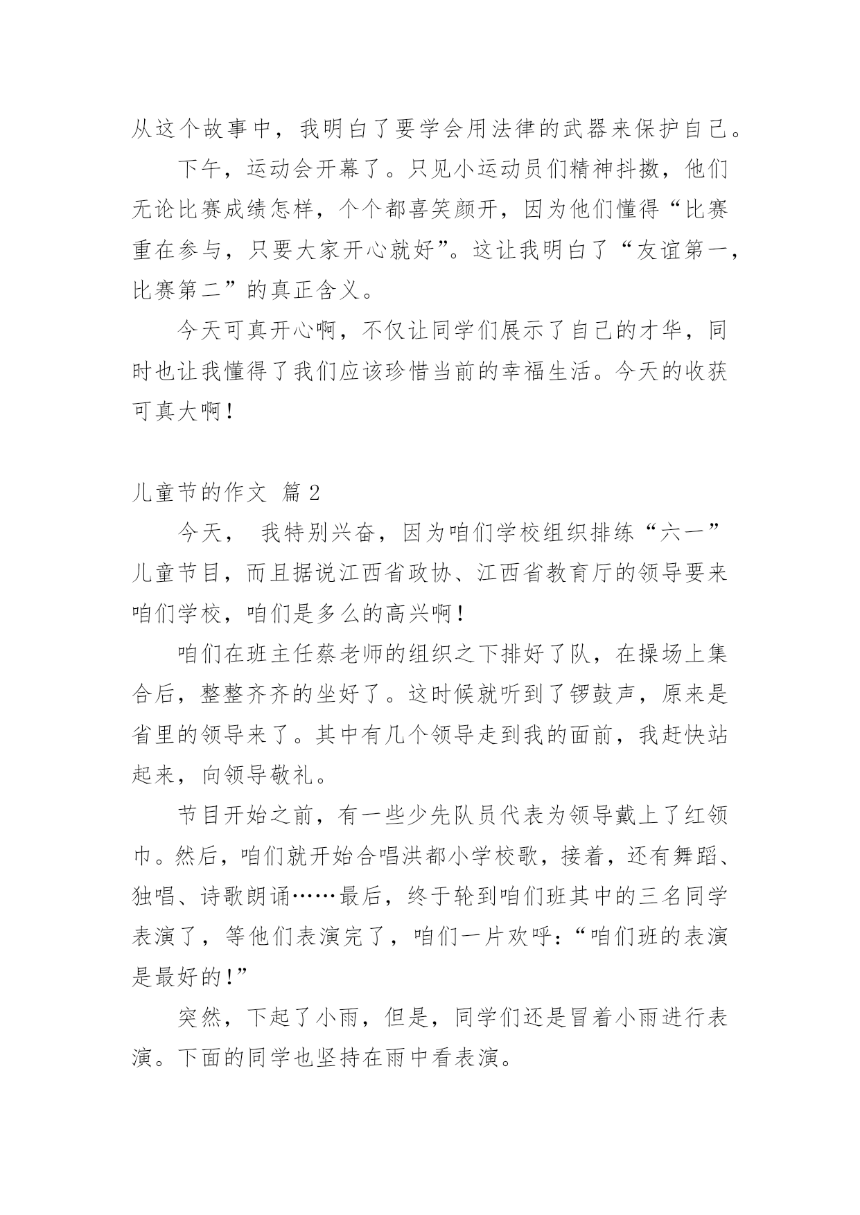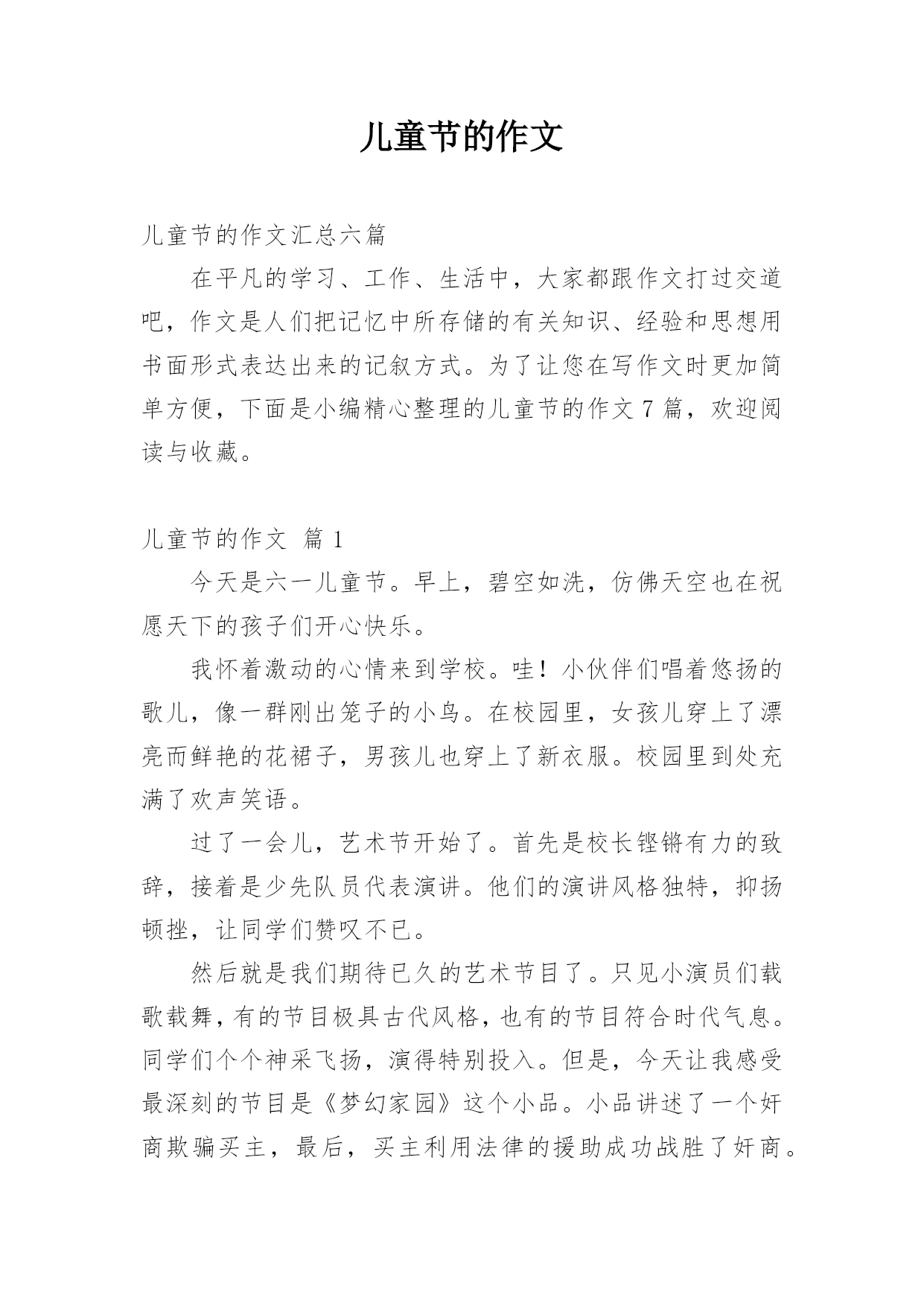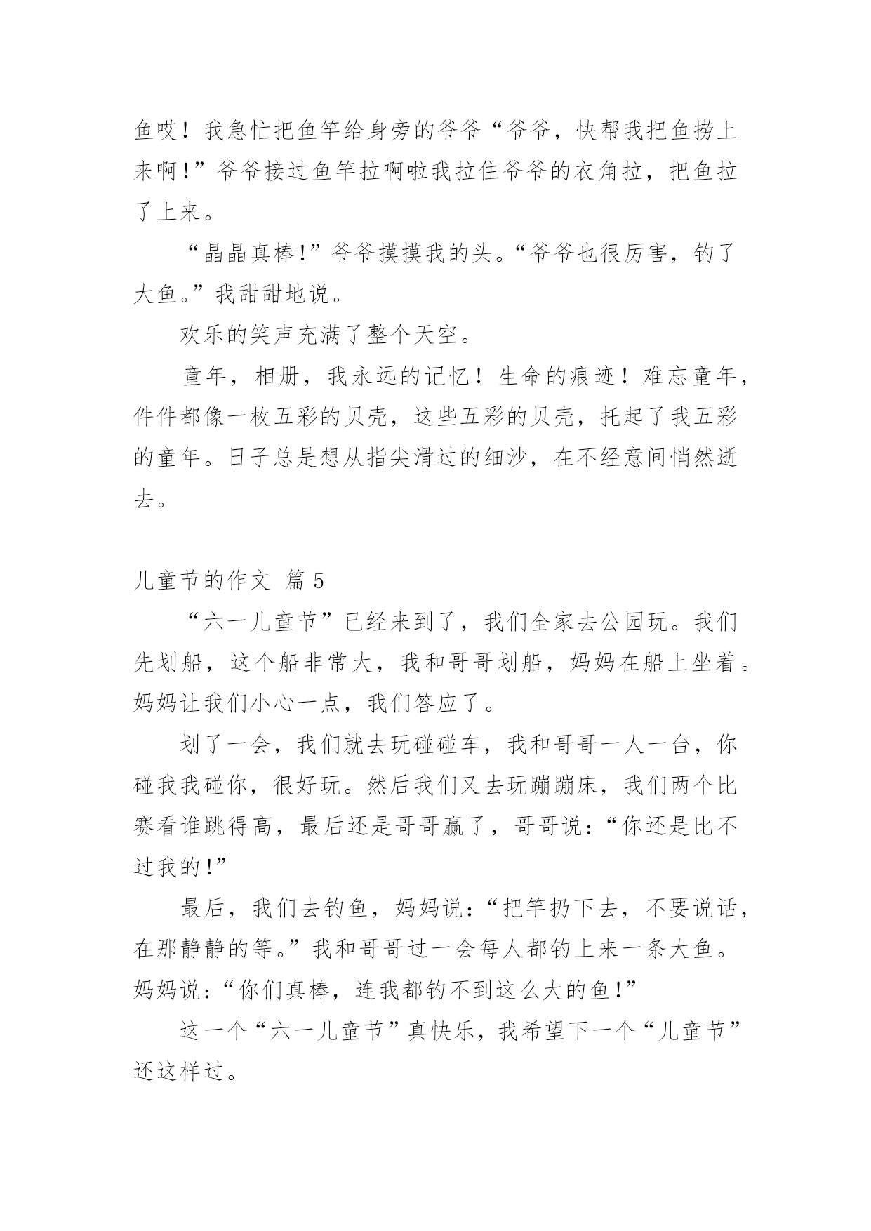 儿童节的作文 儿童节的作文汇总六篇在平凡的学习、工作、生活中,大家都跟作文打过交道吧,作文是人们把记忆中所存储的有关知识、经验和思想用书面形式表达出来的记叙方式。为了让您在写作文时更加简单方便,下面是小编精心整理的儿童节的作文7篇,欢迎阅读与收藏。儿童节的作文篇1今天是六一儿童节。早上,碧空如洗,仿佛天空也在祝愿天下的孩子们开心快乐。我怀着激动的心情来到学校。哇!小伙伴们唱着悠扬的歌儿,像一群刚出笼子的小鸟。在校园里,女孩儿穿上了漂亮而鲜艳的花裙子,男孩儿也穿上了新衣服。校园里到处充满了欢声笑语。过了一会儿,艺术节开始了。首先是校长铿锵有力的致辞,接着是少先队员代表演讲。他们的演讲风格独特,抑扬顿挫,让同学们赞叹不已。然后就是我们期待已久的艺术节目了。只见小演员们载歌载舞,有的节目极具古代风格,也有的节目符合时代气息。同学们个个神采飞扬,演得特别投入。但是,今天让我感受最深刻的节目是《梦幻家园》这个小品。小品讲述了一个奸商欺骗买主,最后,买主利用法律的援助成功战胜了奸商。从这个故事中,我明白了要学会用法律的武器来保护自己。下午,运动会开幕了。只见小运动员们精神抖擞,他们无论比赛成绩怎样,个个都喜笑颜开,因为他们懂得“比赛重在参与,只要大家开心就好”。这让我明白了“友谊第一,比赛第二”的真正含义。今天可真开心啊,不仅让同学们展示了自己的才华,同时也让我懂得了我们应该珍惜当前的幸福生活。今天的收获可真大啊!儿童节的作文篇2今天,我特别兴奋,因为咱们学校组织排练“六一”儿童节目,而且据说江西省政协、江西省教育厅的领导要来咱们学校,咱们是多么的高兴啊!咱们在班主任蔡老师的组织之下排好了队,在操场上集合后,整整齐齐的坐好了。这时候就听到了锣鼓声,原来是省里的领导来了。其中有几个领导走到我的面前,我赶快站起来,向领导敬礼。节目开始之前,有一些少先队员代表为领导戴上了红领巾。然后,咱们就开始合唱洪都小学校歌,接着,还有舞蹈、独唱、诗歌朗诵……最后,终于轮到咱们班其中的三名同学表演了,等他们表演完了,咱们一片欢呼:“咱们班的表演是最好的!”突然,下起了小雨,但是,同学们还是冒着小雨进行表演。下面的同学也坚持在雨中看表演。最后,雨停了,咱们的表演也结束了,同学们开开心心的回到了教室,有的同学说:“要是天天这样,那该多好啊!”虽然,今天还不是六月一日,但是,咱们已经提前过了一个快乐的“六一”儿童节!儿童节的作文篇3今天是我最期待的一天,因为今天是六一儿童节,是我们最高兴的节日,因为有些小朋友能从爸妈的手中接到礼物.每当到每年的六月一日,我就会想起那次难忘的六一表演。那天,小鸟在天空中飞来飞去,操场上顿时热闹起来。首先出场的是舞蹈员的表演,包括我在内,我们的一张张笑脸映入同学们的眼帘,,一串串银铃般的笑声,响彻云霄,还时不时的变换队形,让人眉开眼笑。接这是一个大姐姐和一个小朋友唱歌,他们唱的'是(伸出一只手)会唱的同学都跟着唱。学校特别安排了游园活动。有射篮球、打兵兵球、吹蜡烛、猜谜语、吹兵兵球、抛圈等许多游戏让我留恋忘返。我玩了猜谜语的游戏。只见几根线上吊着一张张儿童节的作文篇4童年是一幅画,画上是炫彩斑斓美丽精彩的故事。童年是一本永远也翻不完的书,这本书里包含着很多很多有趣、快乐、伤心、难忘的事情。人们都说,岁月就好似无情的流水,会把记忆磨刷得滚圆,滚圆,就好似河边那一块块鹅卵石。但我的童年,我那小河流水一样纯洁的童年;我那小鸟一样快乐的童年;我那蓝天一样自由的童年;我那鲜花一样美丽的童年,我——能忘记吗?那年我才五岁,有一天,爷爷说要带我去钓鱼,我我高兴地一蹦三尺高,立刻答应了下来。因为路有点远,我在车上睡着了,当爷爷叫醒我的时候,我发现我的口水流了一身。我揉了揉眼,睡眼朦胧。爷爷把我抱到池塘边两棵树中间的摇床上,坐在了一把椅子上,对我说道:“晶晶,看爷爷给你钓一条大鱼吃!”“爷爷,你可以把鲨鱼钓上来吗?”我问爷爷。“呵呵,鲨鱼?爷爷可没办法钓上来。它可是会吃人的。”我笑着吐了吐舌头,躺到了摇床上看爷爷钓鱼。我目不转睛地看着爷爷的‘精彩表演’。可是等了好久,水面犹如镜子一样平静。于是,我打了个哈欠,翻了个身。“晶晶,快来看,爷爷钓到了一条大鲤鱼!”我一下子坐了起来,看见爷爷拿着鱼竿左摆又摆的,像在跳拉丁舞。我看呆了,那条鲤鱼甩着尾巴,苦苦挣扎着。“爷爷加油,快把它捞上来呀……爷爷小心一点哪,晚上可以饱餐一顿了!”爷爷用抄网把鱼捞了上来,我蹲下来对鲤鱼说:“乖哦,不怕,你以后就可以住在我的肚肚里了哦。”“晶晶,你要不要也来试试?”“要。”我坐了下来。“不要动鱼竿,耐心等浮漂往下沉,再猛地一提,鱼就上钩了。”我耐心地等待着,屏息凝神地望着水漂。五分钟过去了,十分钟过去了,终于,水漂往下一沉,我猛地一提,是一条鲶鱼哎!我急忙把鱼竿给身旁的爷爷“爷