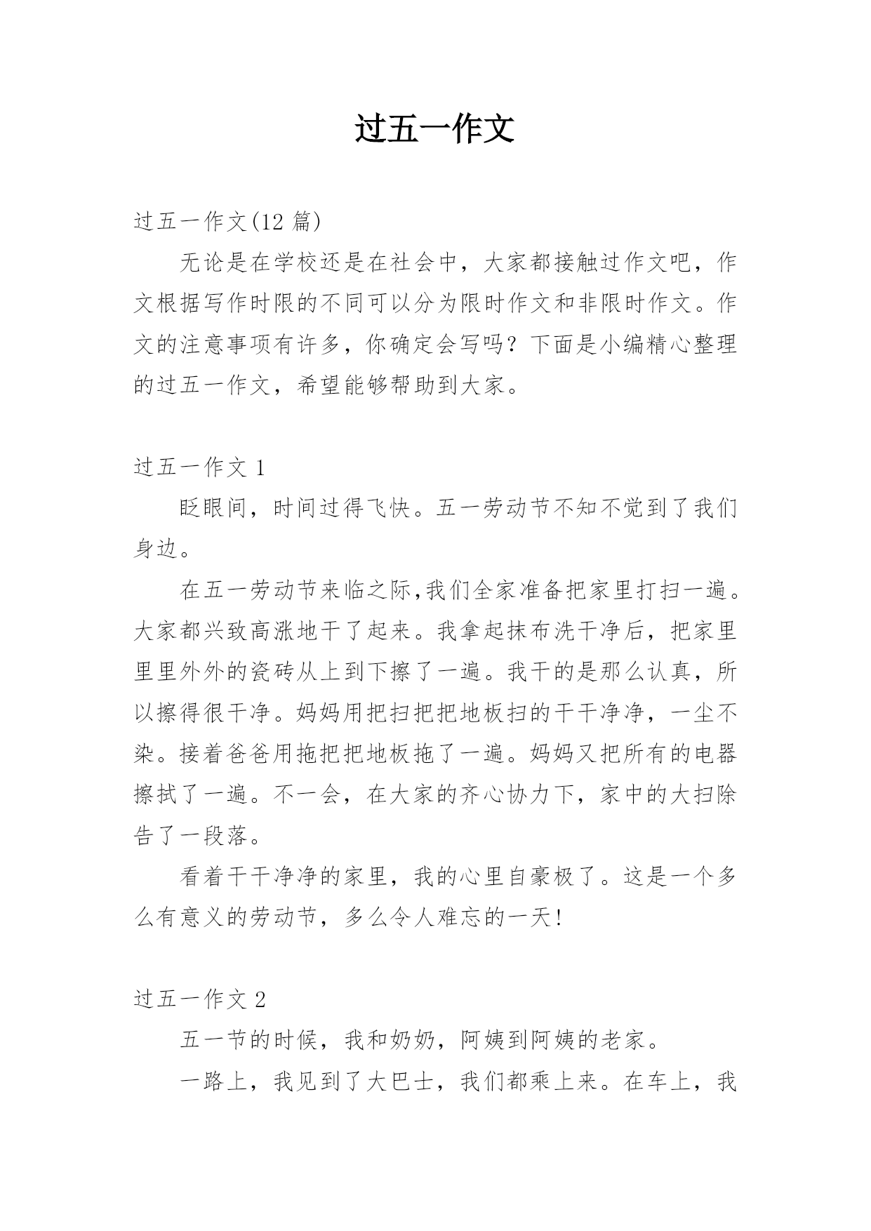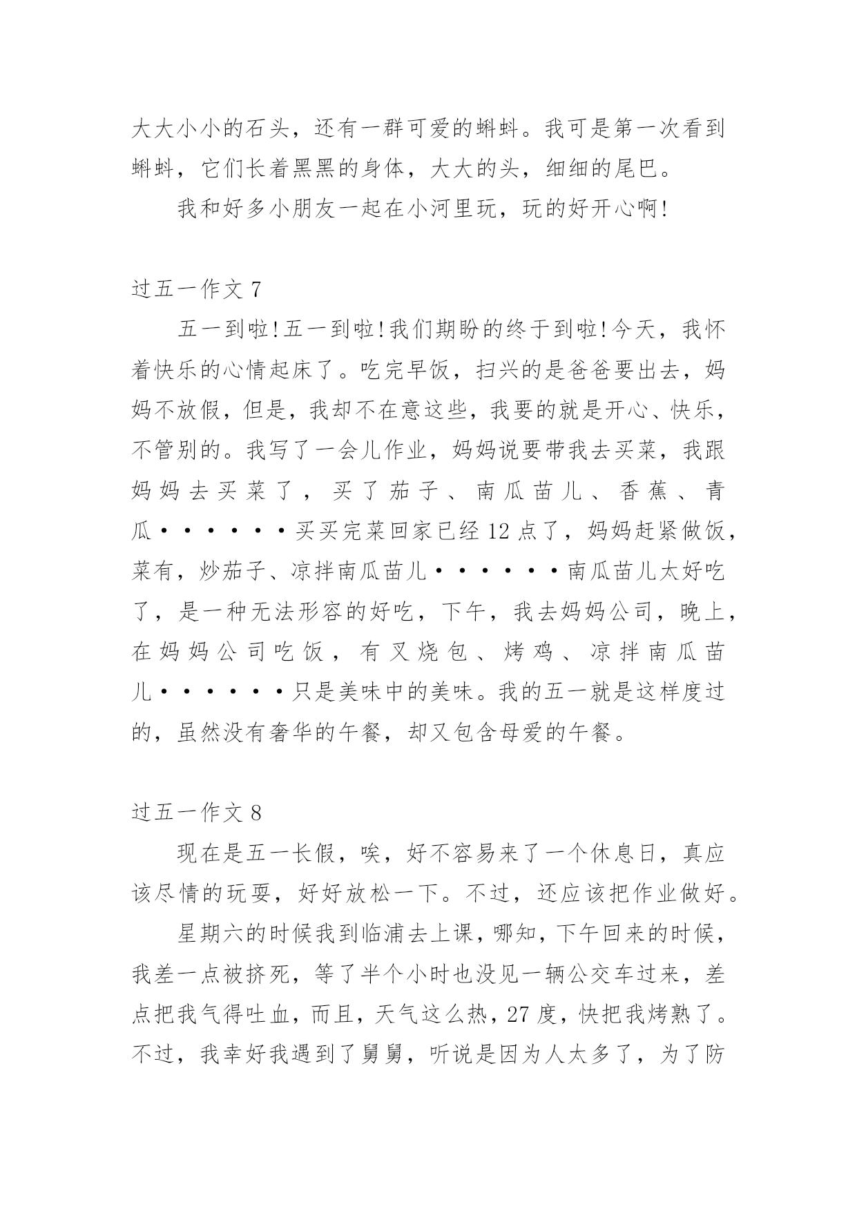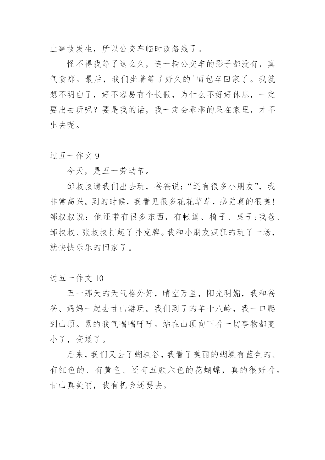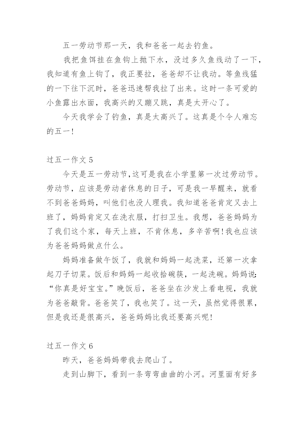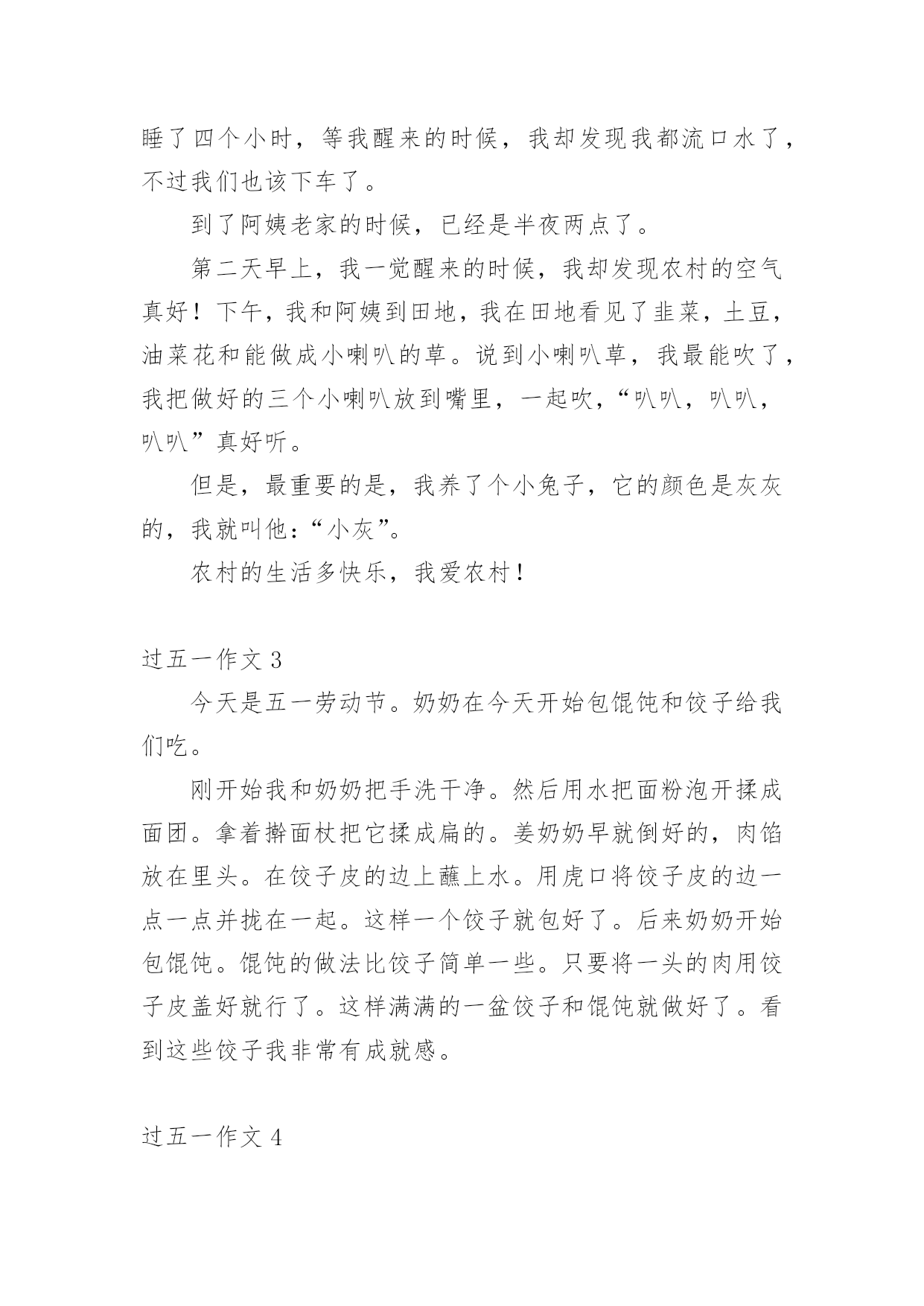 过五一作文 过五一作文(12篇)无论是在学校还是在社会中,大家都接触过作文吧,作文根据写作时限的不同可以分为限时作文和非限时作文。作文的注意事项有许多,你确定会写吗?下面是小编精心整理的过五一作文,希望能够帮助到大家。过五一作文1眨眼间,时间过得飞快。五一劳动节不知不觉到了我们身边。在五一劳动节来临之际,我们全家准备把家里打扫一遍。大家都兴致高涨地干了起来。我拿起抹布洗干净后,把家里里里外外的瓷砖从上到下擦了一遍。我干的是那么认真,所以擦得很干净。妈妈用把扫把把地板扫的干干净净,一尘不染。接着爸爸用拖把把地板拖了一遍。妈妈又把所有的电器擦拭了一遍。不一会,在大家的齐心协力下,家中的大扫除告了一段落。看着干干净净的家里,我的心里自豪极了。这是一个多么有意义的劳动节,多么令人难忘的一天!过五一作文2五一节的时候,我和奶奶,阿姨到阿姨的老家。一路上,我见到了大巴士,我们都乘上来。在车上,我睡了四个小时,等我醒来的时候,我却发现我都流口水了,不过我们也该下车了。到了阿姨老家的时候,已经是半夜两点了。第二天早上,我一觉醒来的时候,我却发现农村的空气真好!下午,我和阿姨到田地,我在田地看见了韭菜,土豆,油菜花和能做成小喇叭的草。说到小喇叭草,我最能吹了,我把做好的三个小喇叭放到嘴里,一起吹,“叭叭,叭叭,叭叭”真好听。但是,最重要的是,我养了个小兔子,它的颜色是灰灰的,我就叫他:“小灰”。农村的生活多快乐,我爱农村!过五一作文3今天是五一劳动节。奶奶在今天开始包馄饨和饺子给我们吃。刚开始我和奶奶把手洗干净。然后用水把面粉泡开揉成面团。拿着擀面杖把它揉成扁的。姜奶奶早就倒好的,肉馅放在里头。在饺子皮的边上蘸上水。用虎口将饺子皮的边一点一点并拢在一起。这样一个饺子就包好了。后来奶奶开始包馄饨。馄饨的做法比饺子简单一些。只要将一头的肉用饺子皮盖好就行了。这样满满的一盆饺子和馄饨就做好了。看到这些饺子我非常有成就感。过五一作文4五一劳动节那一天,我和爸爸一起去钓鱼。我把鱼饵挂在鱼钩上抛下水,没过多久鱼线动了一下,我知道有鱼上钩了,我正要拉,爸爸却不让我动。等鱼线猛的一下往下沉时,爸爸迅速帮我拉了出来。这时一条可爱的小鱼露出水面,我高兴的又蹦又跳,真是太开心了。今天我学会了钓鱼,真是太高兴了。这真是个令人难忘的五一!过五一作文5今天是五一劳动节,这可是我在小学里第一次过劳动节。劳动节,应该是劳动者休息的日子,可是我一早醒来,就看不到爸爸妈妈,叫他们也没人理我。我知道爸爸肯定又去上班了,妈妈肯定又在洗衣服,打扫卫生。我想,爸爸妈妈为了我们这个家,每天上班,不肯休息,多辛苦啊!我也应该为爸爸妈妈做点什么。妈妈准备做午饭了,我就和妈妈一起洗菜,还第一次拿起刀子切菜。饭后和妈妈一起收拾碗筷,一起洗碗。妈妈说:“你真是好宝宝。”晚饭后,爸爸坐在沙发上看电视,我就为爸爸敲背。爸爸笑了,我也笑了。这一天,虽然觉得很累,但是我还是很高兴,爸爸妈妈比我还要高兴呢!过五一作文6昨天,爸爸妈妈带我去爬山了。走到山脚下,看到一条弯弯曲曲的小河。河里面有好多大大小小的石头,还有一群可爱的蝌蚪。我可是第一次看到蝌蚪,它们长着黑黑的身体,大大的头,细细的尾巴。我和好多小朋友一起在小河里玩,玩的好开心啊!过五一作文7五一到啦!五一到啦!我们期盼的终于到啦!今天,我怀着快乐的心情起床了。吃完早饭,扫兴的是爸爸要出去,妈妈不放假,但是,我却不在意这些,我要的就是开心、快乐,不管别的。我写了一会儿作业,妈妈说要带我去买菜,我跟妈妈去买菜了,买了茄子、南瓜苗儿、香蕉、青瓜······买买完菜回家已经12点了,妈妈赶紧做饭,菜有,炒茄子、凉拌南瓜苗儿······南瓜苗儿太好吃了,是一种无法形容的好吃,下午,我去妈妈公司,晚上,在妈妈公司吃饭,有叉烧包、烤鸡、凉拌南瓜苗儿······只是美味中的美味。我的五一就是这样度过的,虽然没有奢华的午餐,却又包含母爱的午餐。过五一作文8现在是五一长假,唉,好不容易来了一个休息日,真应该尽情的玩耍,好好放松一下。不过,还应该把作业做好。星期六的时候我到临浦去上课,哪知,下午回来的时候,我差一点被挤死,等了半个小时也没见一辆公交车过来,差点把我气得吐血,而且,天气这么热,27度,快把我烤熟了。不过,我幸好我遇到了舅舅,听说是因为人太多了,为了防止事故发生,所以公交车临时改路线了。怪不得我等了这么久,连一辆公交车的影子都没有,真气愤那。最后,我们坐着等了好久的'面包车回家了。我就想不明白了,好不容易有个长假,为什么不好好休息,一定要出去玩呢?要是我的话,我一定会乖乖的呆在家里,才不出去呢。过五一作文9今天,是五一劳动节。邹叔叔请我们出去玩,爸爸说:“还有很多小朋友”,我非常高兴。到的时候,我看见很多花花草草,感觉真的很美!邹叔叔说:他还带有很多东西,有帐篷