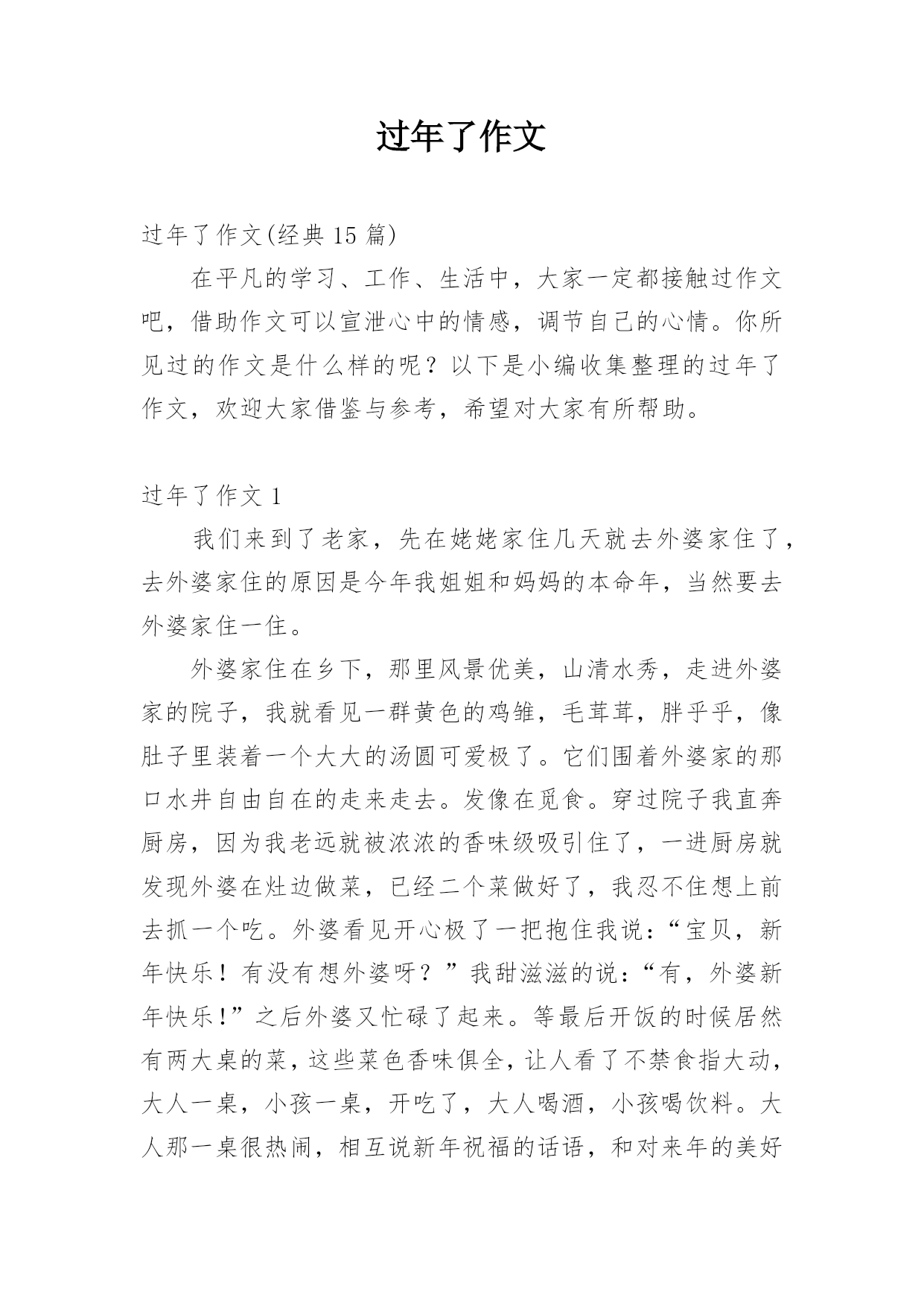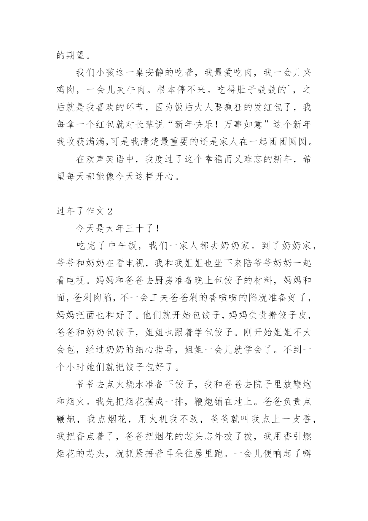 过年了作文 过年了作文(经典15篇)在平凡的学习、工作、生活中,大家一定都接触过作文吧,借助作文可以宣泄心中的情感,调节自己的心情。你所见过的作文是什么样的呢?以下是小编收集整理的过年了作文,欢迎大家借鉴与参考,希望对大家有所帮助。过年了作文1我们来到了老家,先在姥姥家住几天就去外婆家住了,去外婆家住的原因是今年我姐姐和妈妈的本命年,当然要去外婆家住一住。外婆家住在乡下,那里风景优美,山清水秀,走进外婆家的院子,我就看见一群黄色的鸡雏,毛茸茸,胖乎乎,像肚子里装着一个大大的汤圆可爱极了。它们围着外婆家的那口水井自由自在的走来走去。发像在觅食。穿过院子我直奔厨房,因为我老远就被浓浓的香味级吸引住了,一进厨房就发现外婆在灶边做菜,已经二个菜做好了,我忍不住想上前去抓一个吃。外婆看见开心极了一把抱住我说:“宝贝,新年快乐!有没有想外婆呀?”我甜滋滋的说:“有,外婆新年快乐!”之后外婆又忙碌了起来。等最后开饭的时候居然有两大桌的菜,这些菜色香味俱全,让人看了不禁食指大动,大人一桌,小孩一桌,开吃了,大人喝酒,小孩喝饮料。大人那一桌很热闹,相互说新年祝福的话语,和对来年的美好的期望。我们小孩这一桌安静的吃着,我最爱吃肉,我一会儿夹鸡肉,一会儿夹牛肉。根本停不来。吃得肚子鼓鼓的`,之后就是我喜欢的环节,因为饭后大人要疯狂的发红包了,我每拿一个红包就对长辈说“新年快乐!万事如意”这个新年我收获满满,可是我清楚最重要的还是家人在一起团团圆圆。在欢声笑语中,我度过了这个幸福而又难忘的新年,希望每天都能像今天这样开心。过年了作文2今天是大年三十了!吃完了中午饭,我们一家人都去奶奶家。到了奶奶家,爷爷和奶奶在看电视,我和我姐姐也坐下来陪爷爷奶奶一起看电视。妈妈和爸爸去厨房准备晚上包饺子的材料,妈妈和面,爸剁肉陷,不一会工夫爸爸剁的香喷喷的陷就准备好了,妈妈把面也和好了。他们就开始包饺子,妈妈负责擀饺子皮,爸爸和奶奶包饺子,姐姐也跟着学包饺子。刚开始姐姐不大会包,经过奶奶的细心指导,姐姐一会儿就学会了。不到一个小时她们就把饺子包好了。爷爷去点火烧水准备下饺子,我和爸爸去院子里放鞭炮和烟火。我先把烟花摆成一排,鞭炮铺在地上。爸爸负责点鞭炮,我点烟花,用火机我不敢,爸爸就叫我点上一支香,我把香点着了,爸爸把烟花的芯头忘外拨了拨,我用香引燃烟花的芯头,就抓紧捂着耳朵往屋里跑。一会儿便响起了噼里啪啦的鞭炮声,五颜六色的`烟花好看极了。放完了烟花,饺子也出锅了,我们一家人高高兴兴地去吃饺子,边吃饺子边看春晚。过年了!过年了!过年是我们小孩最高兴的事!过年了作文3过年了“起床啦……”早晨,伴随着隆隆的鞭炮声,妈妈喊我起床。听着外面的声音,我不由得大喊一声:“过年了!”我开始了第一项任务:和爸爸贴福字。我帮助爸爸拿了福字和剪刀,贴的时候,我发现贴倒了,不解地问:“爸爸,为什么这样贴呢?”“这是一种讨吉利的说法,”爸爸说,“福倒了,就是说明福到了咱们家了。”贴完以后,刚一进家门,就看到妈妈已挂上了“百福图”,上面有各种各样字体的福字,足足有一百个哟!看来,今年我们家的福气一定旺。去姥姥家之前,爸爸下楼去放鞭炮,不过我希望大家都不要放烟花爆竹,对空气不好!在去姥姥家的路上,我明显感到放烟花的少了。在以前,人们大量燃放,上午一停也不停,对环境造成污染。而今年,人们呼吁“绿色低碳过新年”,听到的.鞭炮声也稀稀啦啦地,少了很多。我们都应保护环境。路上,只见人人脸上洋溢着欢快的笑容,说着吉利的话。干枯的树枝上,鸟儿也在庆祝新年,你听,它们唱起了欢乐的歌:“新年好呀,新年好呀……”路灯挺直了腰杆,在它的肩上扛着火红的、代表希望的灯笼。在灯笼下,是像征着丰收的麦田的黄穗。跨入姥姥家,我祝大家新年好。接着,祝福语就从四面八方涌了过来,新年快乐、过年好、马年吉祥、心想事成……我还收到了压岁钱,好开心呀!新年好呀,新年好呀,祝福大家新年好,我们唱歌,我们跳舞,祝福大家新年好……过年了作文4过年了,过年了,人人都盼望过年。大人们希望家人聚在一起吃顿团圆饭,小孩子可以穿上新衣裳,吃好吃的,玩好玩的,开开心心地拿压岁钱。听啊,从远处传来的鞭炮声……象征着新一年的红红火火。每当过年我们最喜欢放各种各样的烟花:有扔的,有会飞的,还有会喷出火花的,想想就好玩。但是为了环卫工人尽量少放烟花。大年初一一大早,爸爸妈妈就带我去外婆家拜年。外婆家离得不远,一会儿就到了。一进门我就对外公外婆说“新年快乐!祝你们身体健康,长命百岁。”说完,外公外婆就给了我一个大红包。我开心极了,这是我新年收到的第一个红包。接着外婆拿来了许多各色各样的零食和水果。正吃得开心的时候,外婆家那几只可爱的狗狗冲了出来。瞬间把我的小白鞋变成了小黑鞋,可热情了!到了吃饭的'时间,各色各样香喷喷的农家小菜就把桌子给挤满了。开吃!喝酒的杯