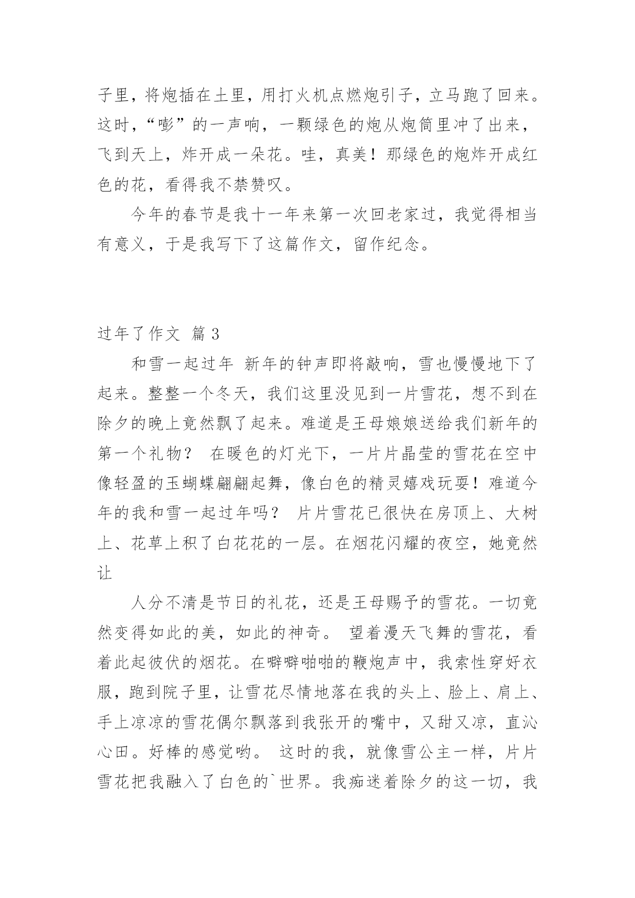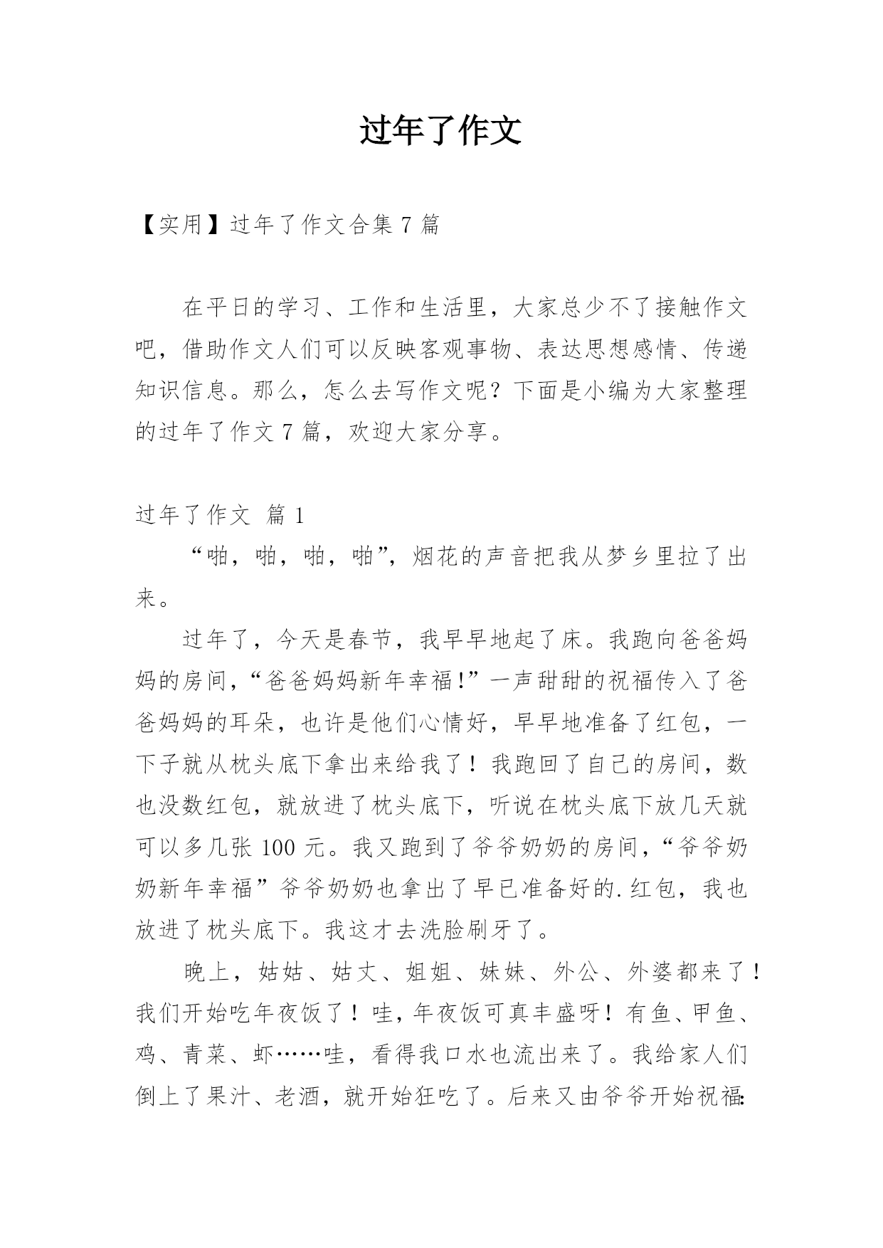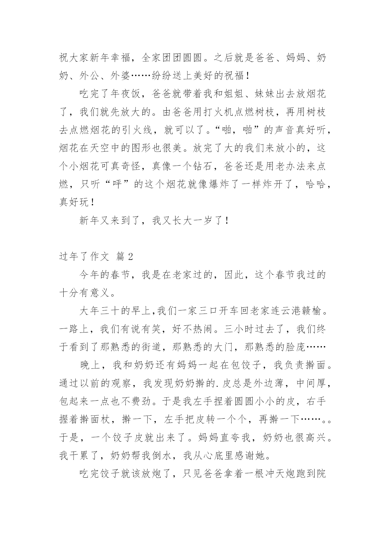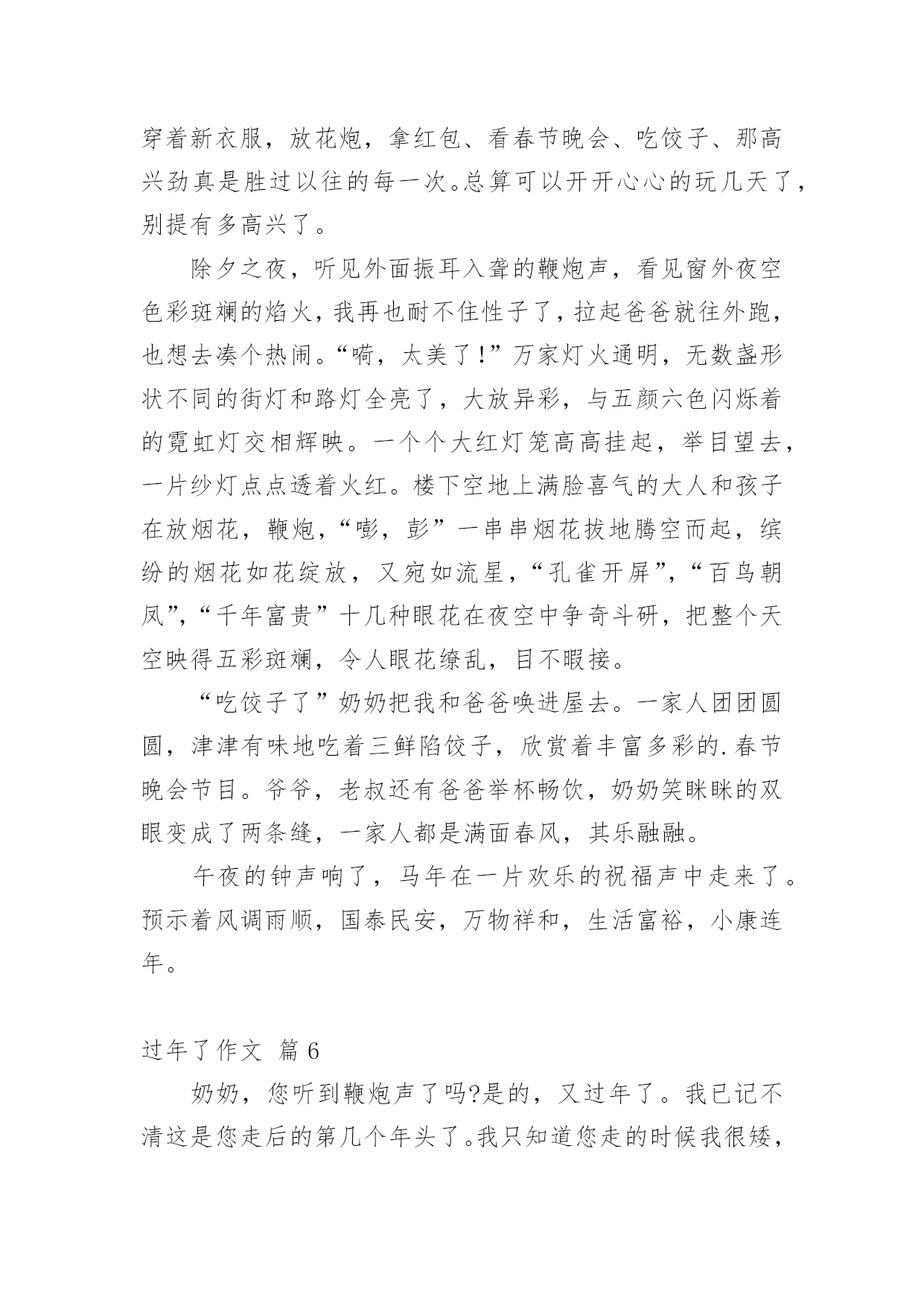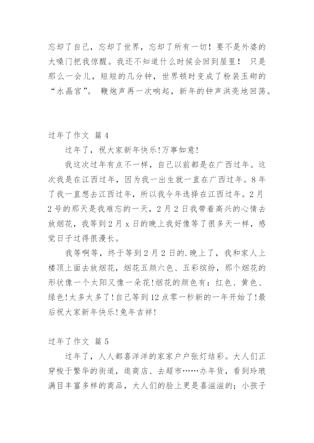 过年了作文 【实用】过年了作文合集7篇在平日的学习、工作和生活里,大家总少不了接触作文吧,借助作文人们可以反映客观事物、表达思想感情、传递知识信息。那么,怎么去写作文呢?下面是小编为大家整理的过年了作文7篇,欢迎大家分享。过年了作文篇1“啪,啪,啪,啪”,烟花的声音把我从梦乡里拉了出来。过年了,今天是春节,我早早地起了床。我跑向爸爸妈妈的房间,“爸爸妈妈新年幸福!”一声甜甜的祝福传入了爸爸妈妈的耳朵,也许是他们心情好,早早地准备了红包,一下子就从枕头底下拿出来给我了!我跑回了自己的房间,数也没数红包,就放进了枕头底下,听说在枕头底下放几天就可以多几张100元。我又跑到了爷爷奶奶的房间,“爷爷奶奶新年幸福”爷爷奶奶也拿出了早已准备好的.红包,我也放进了枕头底下。我这才去洗脸刷牙了。晚上,姑姑、姑丈、姐姐、妹妹、外公、外婆都来了!我们开始吃年夜饭了!哇,年夜饭可真丰盛呀!有鱼、甲鱼、鸡、青菜、虾……哇,看得我口水也流出来了。我给家人们倒上了果汁、老酒,就开始狂吃了。后来又由爷爷开始祝福:祝大家新年幸福,全家团团圆圆。之后就是爸爸、妈妈、奶奶、外公、外婆……纷纷送上美好的祝福!吃完了年夜饭,爸爸就带着我和姐姐、妹妹出去放烟花了,我们就先放大的。由爸爸用打火机点燃树枝,再用树枝去点燃烟花的引火线,就可以了。“啪,啪”的声音真好听,烟花在天空中的图形也很美。放完了大的我们来放小的,这个小烟花可真奇怪,真像一个钻石,爸爸还是用老办法来点燃,只听“呯”的这个烟花就像爆炸了一样炸开了,哈哈,真好玩!新年又来到了,我又长大一岁了!过年了作文篇2今年的春节,我是在老家过的,因此,这个春节我过的十分有意义。大年三十的早上,我们一家三口开车回老家连云港赣榆。一路上,我们有说有笑,好不热闹。三小时过去了,我们终于看到了那熟悉的街道,那熟悉的大门,那熟悉的脸庞……晚上,我和奶奶还有妈妈一起在包饺子,我负责擀面。通过以前的观察,我发现奶奶擀的.皮总是外边薄,中间厚,包起来一点也不费劲。于是我左手捏着圆圆小小的皮,右手握着擀面杖,擀一下,左手把皮转一个个,再擀一下……。。于是,一个饺子皮就出来了。妈妈直夸我,奶奶也很高兴。我干累了,奶奶帮我倒水,我从心底里感谢她。吃完饺子就该放炮了,只见爸爸拿着一根冲天炮跑到院子里,将炮插在土里,用打火机点燃炮引子,立马跑了回来。这时,“嘭”的一声响,一颗绿色的炮从炮筒里冲了出来,飞到天上,炸开成一朵花。哇,真美!那绿色的炮炸开成红色的花,看得我不禁赞叹。今年的春节是我十一年来第一次回老家过,我觉得相当有意义,于是我写下了这篇作文,留作纪念。过年了作文篇3和雪一起过年新年的钟声即将敲响,雪也慢慢地下了起来。整整一个冬天,我们这里没见到一片雪花,想不到在除夕的晚上竟然飘了起来。难道是王母娘娘送给我们新年的第一个礼物?在暖色的灯光下,一片片晶莹的雪花在空中像轻盈的玉蝴蝶翩翩起舞,像白色的精灵嬉戏玩耍!难道今年的我和雪一起过年吗?片片雪花已很快在房顶上、大树上、花草上积了白花花的一层。在烟花闪耀的夜空,她竟然让人分不清是节日的礼花,还是王母赐予的雪花。一切竟然变得如此的美,如此的神奇。望着漫天飞舞的雪花,看着此起彼伏的烟花。在噼噼啪啪的鞭炮声中,我索性穿好衣服,跑到院子里,让雪花尽情地落在我的头上、脸上、肩上、手上凉凉的雪花偶尔飘落到我张开的嘴中,又甜又凉,直沁心田。好棒的感觉哟。这时的我,就像雪公主一样,片片雪花把我融入了白色的`世界。我痴迷着除夕的这一切,我忘却了自己,忘却了世界,忘却了所有一切!要不是外婆的大嗓门把我惊醒。我还不知道什么时候会回到屋里!只是那么一会儿,短短的几分钟,世界顿时变成了粉装玉砌的“水晶宫”。鞭炮声再一次响起,新年的钟声洪亮地回荡。过年了作文篇4过年了,祝大家新年快乐!万事如意!我这次过年有点不一样,自己以前都是在广西过年。这次我是在江西过年,因为我一出生就一直在广西过年。8年了我一直想去江西过年,所以我今年选择在江西过年。2月2号的那天是我难忘的一天,2月2日我带着高兴的心情去放烟花,我等到2月x日的晚上我好像等了很多天一样,感觉日子过得很漫长。我等啊等,终于等到2月2日的.晚上了,我和家人上楼顶上面去放烟花,烟花五颜六色、五彩缤纷,那个烟花的形状像一个太阳又像一朵花!烟花的颜色有:红色、黄色、绿色!太多太多了!自己等到12点零一秒新的一年开始了!最后祝大家新年快乐!兔年吉祥!过年了作文篇5过年了,人人都喜洋洋的家家户户张灯结彩。大人们正穿梭于繁华的街道,逛商店、去超市……办年货,看到玲琅满目丰富多样的商品,大人们的脸上更是喜滋滋的;小孩子穿着新衣服,放花炮,拿红包、看春节晚会、吃饺子、那高兴劲真是胜过以往的每一次。总算可以开开心心的玩几天了,别提有多高兴了。除夕之夜,听见外面振耳入聋的鞭炮声,看