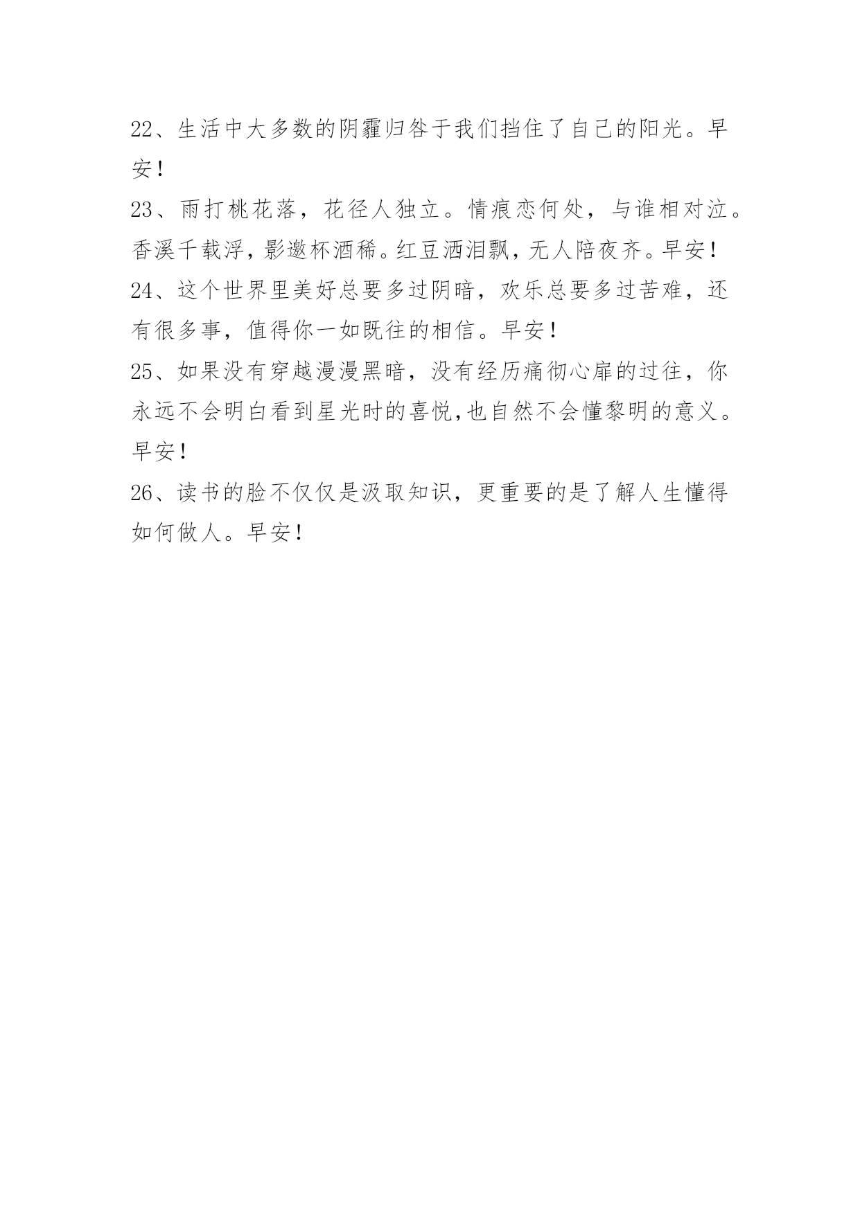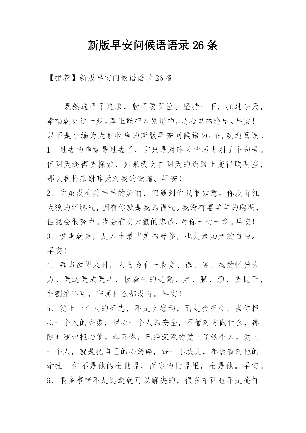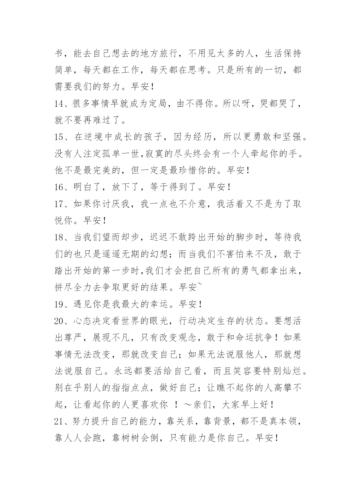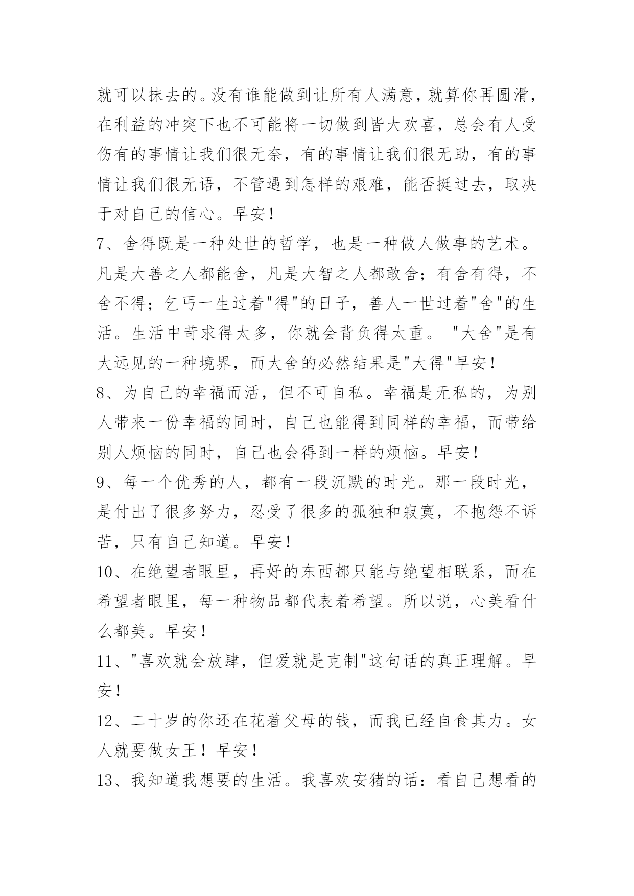 新版早安问候语语录26条 【推荐】新版早安问候语语录26条既然选择了追求,就不要哭泣。坚持一下,扛过今天,幸福就更近一步。真正能把人累垮的,是心里的绝望。早安!以下是小编为大家收集的新版早安问候语26条,欢迎阅读。1、过去的毕竟是过去了,它只是对昨天的历史划了个句号。但明天还需要探索,如果我会在明天的道路上变得聪明些,那么我将感谢昨天对我的馈赠。早安!2、你虽没有美羊羊的美丽,但遇到你我很如意。你没有红太狼的坏脾气,拥有你就是我的福气。我没有喜羊羊的聪明,但我会很努力。我会有灰太狼的忠诚,对你一心一意。早安!3、说走就走,是人生最华美的奢侈,也是最灿烂的自由。早安!4、每当欲望来时,人自会有一股贪、谗、倔、拗的怪异大力。既达既成既毕,接着来的是熟、烂、腻、烦,要抛开,非割绝不可,宁愿什么都没有。早安!5、爱上一个人的标志,不是会感动,而是会担心。当你担心一个人的冷暖,担心一个人的安全,不管对方做什么,都随时随地担心他。恭喜你,已经深深的爱上了这个人。爱上一个人,就是把自己的心掰碎,每一小块儿,都装着对他的牵挂。你不是他的全世界,而你的世界里,全是他。早安。6、很多事情不是逃避就可以解决的,很多东西也不是掩饰就可以抹去的。没有谁能做到让所有人满意,就算你再圆滑,在利益的冲突下也不可能将一切做到皆大欢喜,总会有人受伤有的事情让我们很无奈,有的事情让我们很无助,有的事情让我们很无语,不管遇到怎样的艰难,能否挺过去,取决于对自己的信心。早安!7、舍得既是一种处世的哲学,也是一种做人做事的艺术。凡是大善之人都能舍,凡是大智之人都敢舍;有舍有得,不舍不得;乞丐一生过着"得"的日子,善人一世过着"舍"的生活。生活中苛求得太多,你就会背负得太重。"大舍"是有大远见的一种境界,而大舍的必然结果是"大得"早安!8、为自己的幸福而活,但不可自私。幸福是无私的,为别人带来一份幸福的同时,自己也能得到同样的幸福,而带给别人烦恼的同时,自己也会得到一样的烦恼。早安!9、每一个优秀的人,都有一段沉默的时光。那一段时光,是付出了很多努力,忍受了很多的孤独和寂寞,不抱怨不诉苦,只有自己知道。早安!10、在绝望者眼里,再好的东西都只能与绝望相联系,而在希望者眼里,每一种物品都代表着希望。所以说,心美看什么都美。早安!11、"喜欢就会放肆,但爱就是克制"这句话的真正理解。早安!12、二十岁的你还在花着父母的钱,而我已经自食其力。女人就要做女王!早安!13、我知道我想要的生活。我喜欢安猪的话:看自己想看的书,能去自己想去的地方旅行,不用见太多的人,生活保持简单,每天都在工作,每天都在思考。只是所有的一切,都需要我们的努力。早安!14、很多事情早就成为定局,由不得你。所以呀,哭都哭了,就不要再难过了。15、在逆境中成长的孩子,因为经历,所以更勇敢和坚强。没有人注定孤单一世,寂寞的尽头终会有一个人牵起你的手。他不是最完美的,但一定是最珍惜你的。早安!16、明白了,放下了,等于得到了。早安!17、如果你讨厌我,我一点也不介意,我活着又不是为了取悦你。早安!18、当我们望而却步,迟迟不敢跨出开始的脚步时,等待我们的也只是遥遥无期的幻想;而当我们不害怕来不及,敢于踏出开始的第一步时,我们才会把自己所有的勇气都拿出来,拼尽全力去争取更好的结果。早安~19、遇见你是我最大的幸运。早安!20、心态决定看世界的眼光,行动决定生存的状态。要想活出尊严,展现不凡,只有改变观念,敢于和命运抗争!如果事情无法改变,那就改变自己;如果无法说服他人,那就想法说服自己。永远都要活给自己看,而且笑容要特别灿烂。别在乎别人的指指点点,做好自己;让瞧不起你的人高攀不起,让看起你的人更喜欢你!~亲们,大家早上好!21、努力提升自己的能力,靠关系,靠背景,都不是真本领,靠人人会跑,靠树树会倒,只有能力是你自己。早安!22、生活中大多数的阴霾归咎于我们挡住了自己的阳光。早安!23、雨打桃花落,花径人独立。情痕恋何处,与谁相对泣。香溪千载浮,影邀杯酒稀。红豆洒泪飘,无人陪夜齐。早安!24、这个世界里美好总要多过阴暗,欢乐总要多过苦难,还有很多事,值得你一如既往的相信。早安!25、如果没有穿越漫漫黑暗,没有经历痛彻心扉的过往,你永远不会明白看到星光时的喜悦,也自然不会懂黎明的意义。早安!26、读书的脸不仅仅是汲取知识,更重要的是了解人生懂得如何做人。早安!