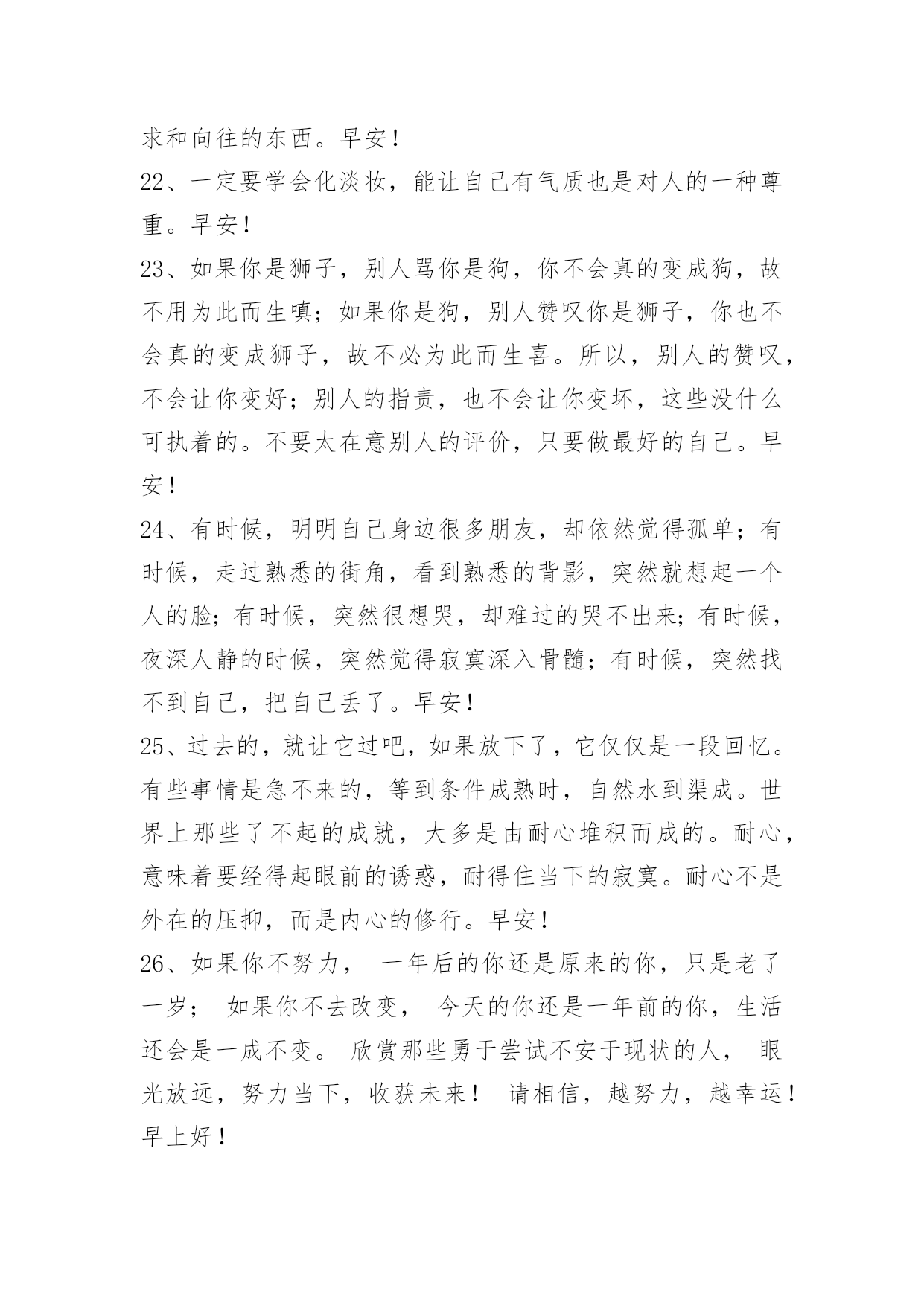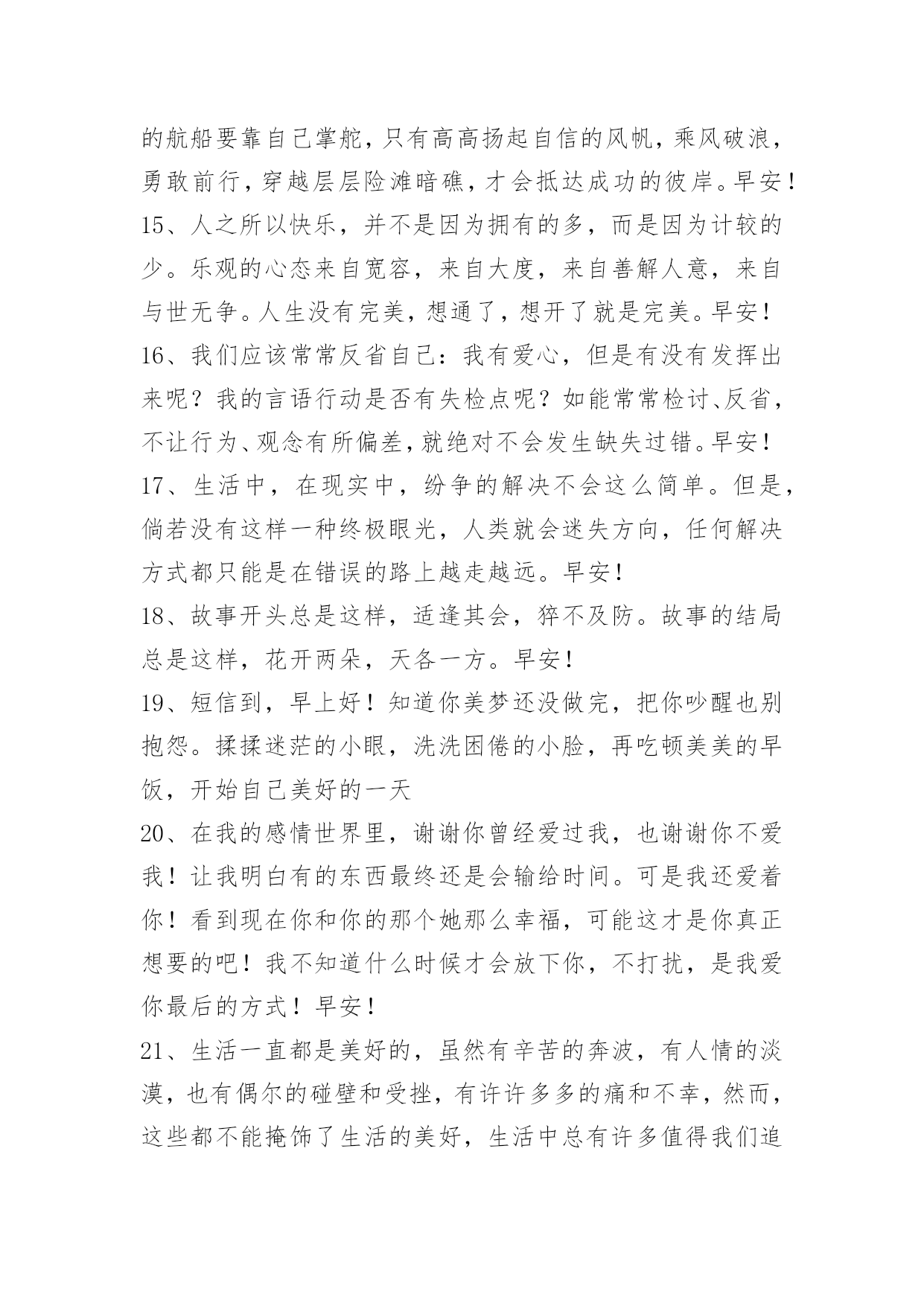 新版早安问候语语录39条 【热门】新版早安问候语语录39条不管发生什么,都不要放弃,坚持走下去,肯定会有意想不到的风景。也许不是你本来想走的路,也不是你本来想登临的山顶,可另一条路有另一条路的风景,不同的山顶也一样会有美丽的日出。朋友早安!以下是小编为大家收集的新版早安问候语39条,希望大家喜欢。1、当初有些事,让我们刻骨铭心;曾经有些人,令我们难以释怀。我们一路走来,告别一段往事,走入下一段风景。路在延伸,风景在变幻,人生没有不变的永恒。生命的精彩,以一种无法想象的形式展现出来,我们只能描摹。早安!2、人最多情,也最无情。爱的时候海誓山盟,许下天荒地老。厌的时候,恨不能立刻从生命中抽离,一刀两断,再无瓜葛。早安!3、其实我们缺乏的不是够好够对够靠谱的那个人,而是最后的最后,大家变成了彼此都需要的那一个人。如果你给他多一点时间,他也多给你一点时间,多好。来,我们来谈一场不赶时间的恋爱。早安!4、两个人在一起久了,就像左手和右手,即使不再相爱也会选择相守。因为放弃这么多年的时光需要很大的勇气。也许生命中会出现你爱的人,但那终归是过客,你还是会牵着你的左手或者右手一直走下去,幸福真的和爱情无关。早安!5、真正难过的时候是说不出话来的,不是想和别人说自己的悲欢那么多,只是想静静的坐在阴影下,不说一句话,睁大眼睛,可却一滴眼泪也流不出来。早安!6、做任何事都要付出成本,人生最大的成本不是金钱和时间,而是机会。一个人越是什么也不愿放弃,就越容易错过人生中最宝贵的机会!早安!7、知道,是知而行道;能"行道"才是真"知道"。早安!8、处世人言不可轻信,为人唯行方是真凭。早安!9、有时候,是我们自己想太多,才让自己如此难受。别在喜悦时许诺,别在忧伤时回答,别在愤怒时做决定。生命中总有那么一段时光,充满不安,可是除了勇敢面对,我们别无选择。早安!10、给过我最痛的那个人,却是我为他付出过最多的那个人。早安!11、看,在这个爱与被爱、伤害与被伤害的世界里,生命对我们是吝啬的。因为它总是让我们失望。可是,生命又是那么的慷慨,总会在失望之后给予我们拯救。我想,因为这生命的慷慨,我们必须有尊严地过下去。就如同生命本身就尊重我们的存在。早安!12、留不住的心,不如就让它飞吧。早安!13、初恋的爱,像时钟针摆,一直循环,却从未停止。初初恋的情,像墙上旧画,时光流逝,却从未忘记;初初恋,只在特别日子,才会有意义。早安!14、人生就如牌局,发牌的是上天,而出牌的是自己,人生的航船要靠自己掌舵,只有高高扬起自信的风帆,乘风破浪,勇敢前行,穿越层层险滩暗礁,才会抵达成功的彼岸。早安!15、人之所以快乐,并不是因为拥有的多,而是因为计较的少。乐观的心态来自宽容,来自大度,来自善解人意,来自与世无争。人生没有完美,想通了,想开了就是完美。早安!16、我们应该常常反省自己:我有爱心,但是有没有发挥出来呢?我的言语行动是否有失检点呢?如能常常检讨、反省,不让行为、观念有所偏差,就绝对不会发生缺失过错。早安!17、生活中,在现实中,纷争的解决不会这么简单。但是,倘若没有这样一种终极眼光,人类就会迷失方向,任何解决方式都只能是在错误的路上越走越远。早安!18、故事开头总是这样,适逢其会,猝不及防。故事的结局总是这样,花开两朵,天各一方。早安!19、短信到,早上好!知道你美梦还没做完,把你吵醒也别抱怨。揉揉迷茫的小眼,洗洗困倦的小脸,再吃顿美美的早饭,开始自己美好的一天20、在我的感情世界里,谢谢你曾经爱过我,也谢谢你不爱我!让我明白有的东西最终还是会输给时间。可是我还爱着你!看到现在你和你的那个她那么幸福,可能这才是你真正想要的吧!我不知道什么时候才会放下你,不打扰,是我爱你最后的方式!早安!21、生活一直都是美好的,虽然有辛苦的奔波,有人情的淡漠,也有偶尔的碰壁和受挫,有许许多多的痛和不幸,然而,这些都不能掩饰了生活的美好,生活中总有许多值得我们追求和向往的东西。早安!22、一定要学会化淡妆,能让自己有气质也是对人的一种尊重。早安!23、如果你是狮子,别人骂你是狗,你不会真的变成狗,故不用为此而生嗔;如果你是狗,别人赞叹你是狮子,你也不会真的变成狮子,故不必为此而生喜。所以,别人的赞叹,不会让你变好;别人的指责,也不会让你变坏,这些没什么可执着的。不要太在意别人的评价,只要做最好的自己。早安!24、有时候,明明自己身边很多朋友,却依然觉得孤单;有时候,走过熟悉的街角,看到熟悉的背影,突然就想起一个人的脸;有时候,突然很想哭,却难过的哭不出来;有时候,夜深人静的时候,突然觉得寂寞深入骨髓;有时候,突然找不到自己,把自己丢了。早安!25、过去的,就让它过吧,如果放下了,它仅仅是一段回忆。有些事情是急不来的,等到条件成熟时,自然水到渠成。世界上那些了不起的成就,大多是由耐心堆积
