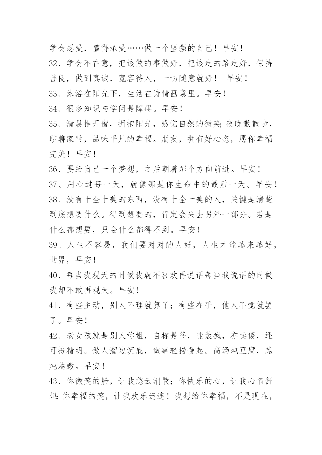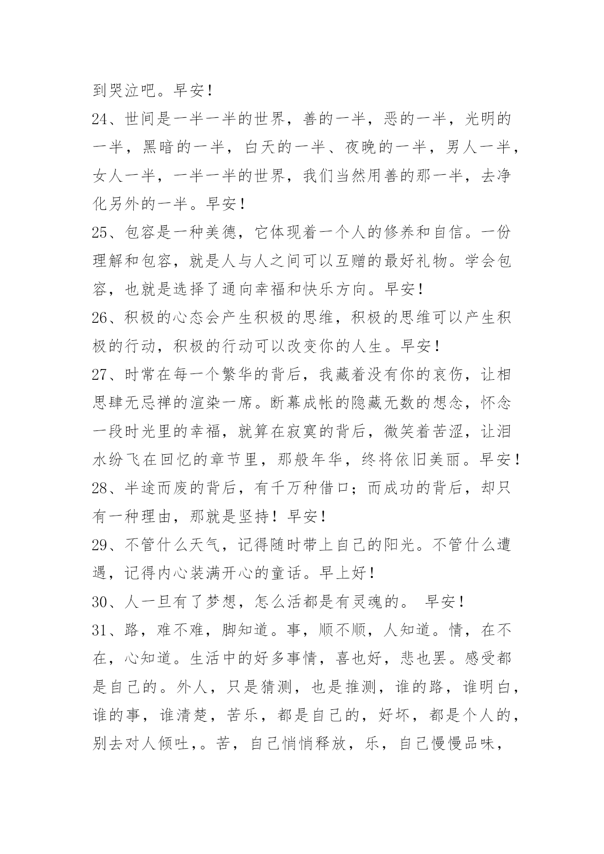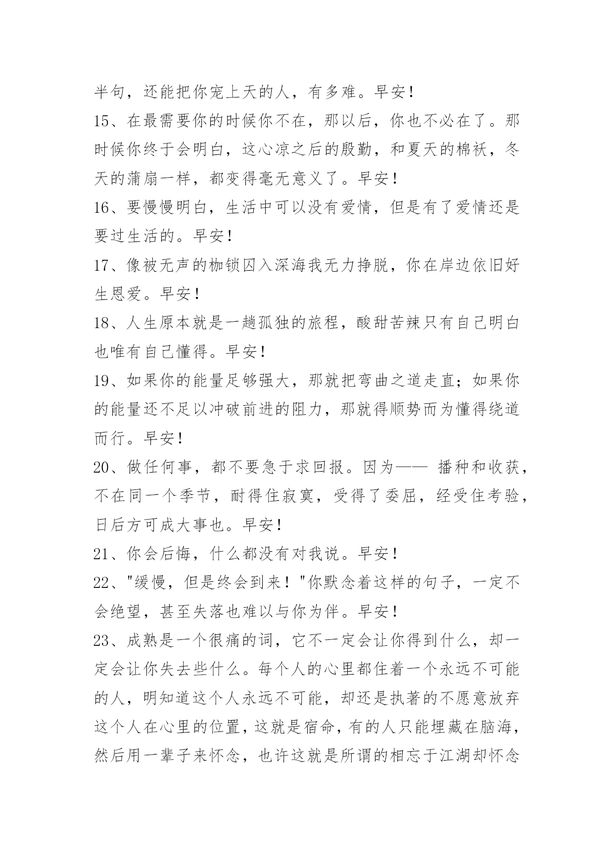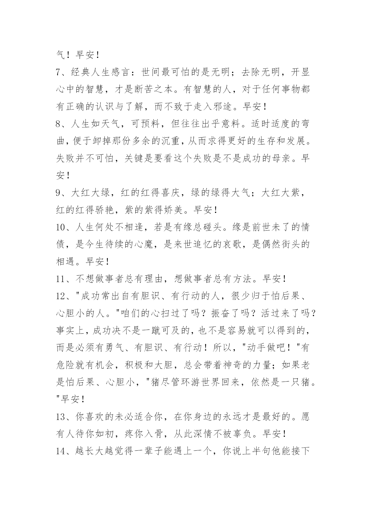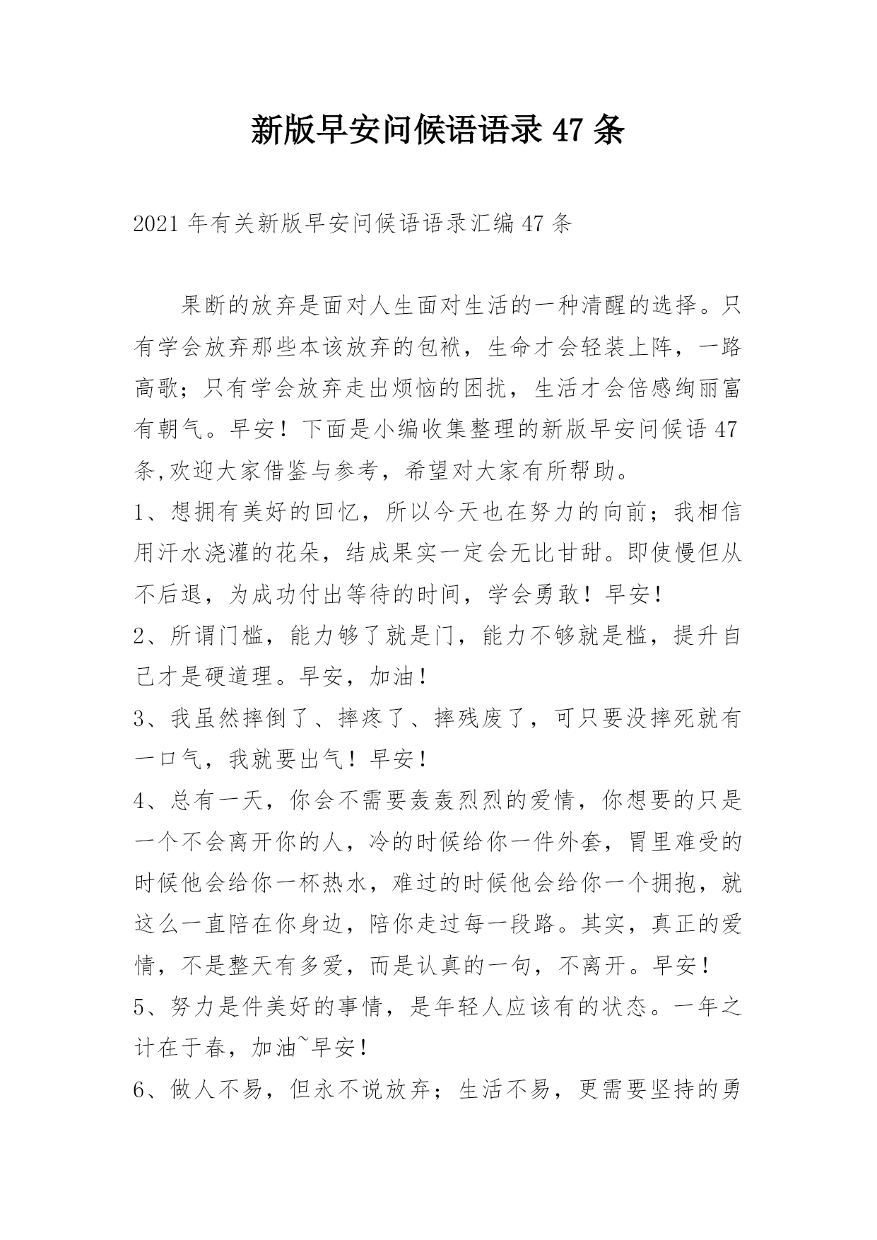 新版早安问候语语录47条 2021年有关新版早安问候语语录汇编47条果断的放弃是面对人生面对生活的一种清醒的选择。只有学会放弃那些本该放弃的包袱,生命才会轻装上阵,一路高歌;只有学会放弃走出烦恼的困扰,生活才会倍感绚丽富有朝气。早安!下面是小编收集整理的新版早安问候语47条,欢迎大家借鉴与参考,希望对大家有所帮助。1、想拥有美好的回忆,所以今天也在努力的向前;我相信用汗水浇灌的花朵,结成果实一定会无比甘甜。即使慢但从不后退,为成功付出等待的时间,学会勇敢!早安!2、所谓门槛,能力够了就是门,能力不够就是槛,提升自己才是硬道理。早安,加油!3、我虽然摔倒了、摔疼了、摔残废了,可只要没摔死就有一口气,我就要出气!早安!4、总有一天,你会不需要轰轰烈烈的爱情,你想要的只是一个不会离开你的人,冷的时候给你一件外套,胃里难受的时候他会给你一杯热水,难过的时候他会给你一个拥抱,就这么一直陪在你身边,陪你走过每一段路。其实,真正的爱情,不是整天有多爱,而是认真的一句,不离开。早安!5、努力是件美好的事情,是年轻人应该有的状态。一年之计在于春,加油~早安!6、做人不易,但永不说放弃;生活不易,更需要坚持的勇气!早安!7、经典人生感言:世间最可怕的是无明;去除无明,开显心中的智慧,才是断苦之本。有智慧的人,对于任何事物都有正确的认识与了解,而不致于走入邪途。早安!8、人生如天气,可预料,但往往出乎意料。适时适度的弯曲,便于卸掉那份多余的沉重,从而求得更好的生存和发展。失败并不可怕,关键是要看这个失败是不是成功的母亲。早安!9、大红大绿,红的红得喜庆,绿的绿得大气;大红大紫,红的红得骄艳,紫的紫得娇美。早安!10、人生何处不相逢,若是有缘总碰头。缘是前世未了的情债,是今生待续的心魔,是来世追忆的哀歌,是偶然街头的相遇。早安!11、不想做事者总有理由,想做事者总有方法。早安!12、"成功常出自有胆识、有行动的人,很少归于怕后果、心胆小的人。"咱们的心扫过了吗?振奋了吗?活过来了吗?事实上,成功决不是一蹴可及的,也不是容易就可以得到的,而是必须有勇气、有胆识、有行动!所以,"动手做吧!"有危险就有机会,积极和大胆,总会带着神奇的力量;如果老是怕后果、心胆小,"猪尽管环游世界回来,依然是一只猪。"早安!13、你喜欢的未必适合你,在你身边的永远才是最好的。愿有人待你如初,疼你入骨,从此深情不被辜负。早安!14、越长大越觉得一辈子能遇上一个,你说上半句他能接下半句,还能把你宠上天的人,有多难。早安!15、在最需要你的时候你不在,那以后,你也不必在了。那时候你终于会明白,这心凉之后的殷勤,和夏天的棉袄,冬天的蒲扇一样,都变得毫无意义了。早安!16、要慢慢明白,生活中可以没有爱情,但是有了爱情还是要过生活的。早安!17、像被无声的枷锁囚入深海我无力挣脱,你在岸边依旧好生恩爱。早安!18、人生原本就是一趟孤独的旅程,酸甜苦辣只有自己明白也唯有自己懂得。早安!19、如果你的能量足够强大,那就把弯曲之道走直;如果你的能量还不足以冲破前进的阻力,那就得顺势而为懂得绕道而行。早安!20、做任何事,都不要急于求回报。因为——播种和收获,不在同一个季节,耐得住寂寞,受得了委屈,经受住考验,日后方可成大事也。早安!21、你会后悔,什么都没有对我说。早安!22、"缓慢,但是终会到来!"你默念着这样的句子,一定不会绝望,甚至失落也难以与你为伴。早安!23、成熟是一个很痛的词,它不一定会让你得到什么,却一定会让你失去些什么。每个人的心里都住着一个永远不可能的人,明知道这个人永远不可能,却还是执著的不愿意放弃这个人在心里的位置,这就是宿命,有的人只能埋藏在脑海,然后用一辈子来怀念,也许这就是所谓的相忘于江湖却怀念到哭泣吧。早安!24、世间是一半一半的世界,善的一半,恶的一半,光明的一半,黑暗的一半,白天的一半、夜晚的一半,男人一半,女人一半,一半一半的世界,我们当然用善的那一半,去净化另外的一半。早安!25、包容是一种美德,它体现着一个人的修养和自信。一份理解和包容,就是人与人之间可以互赠的最好礼物。学会包容,也就是选择了通向幸福和快乐方向。早安!26、积极的心态会产生积极的思维,积极的思维可以产生积极的行动,积极的行动可以改变你的人生。早安!27、时常在每一个繁华的背后,我藏着没有你的哀伤,让相思肆无忌禅的渲染一席。断幕成帐的隐藏无数的想念,怀念一段时光里的幸福,就算在寂寞的背后,微笑着苦涩,让泪水纷飞在回忆的章节里,那般年华,终将依旧美丽。早安!28、半途而废的背后,有千万种借口;而成功的背后,却只有一种理由,那就是坚持!早安!29、不管什么天气,记得随时带上自己的阳光。不管什么遭遇,记得内心装满开心的童话。早上好!30、人一旦有了梦想,怎么活都是有灵魂的。早安!31、路,难不