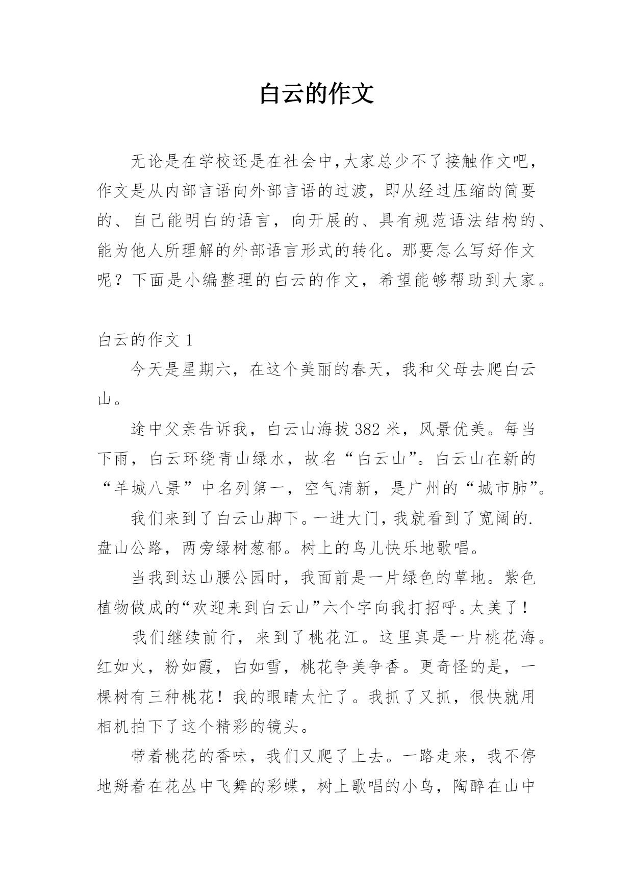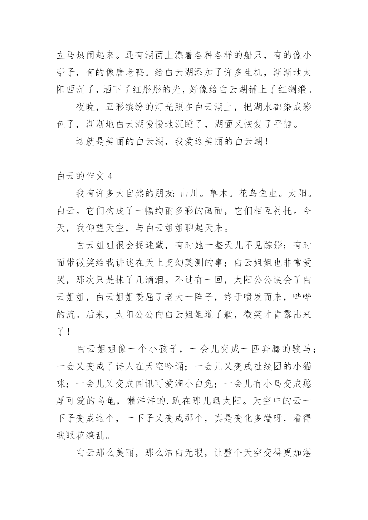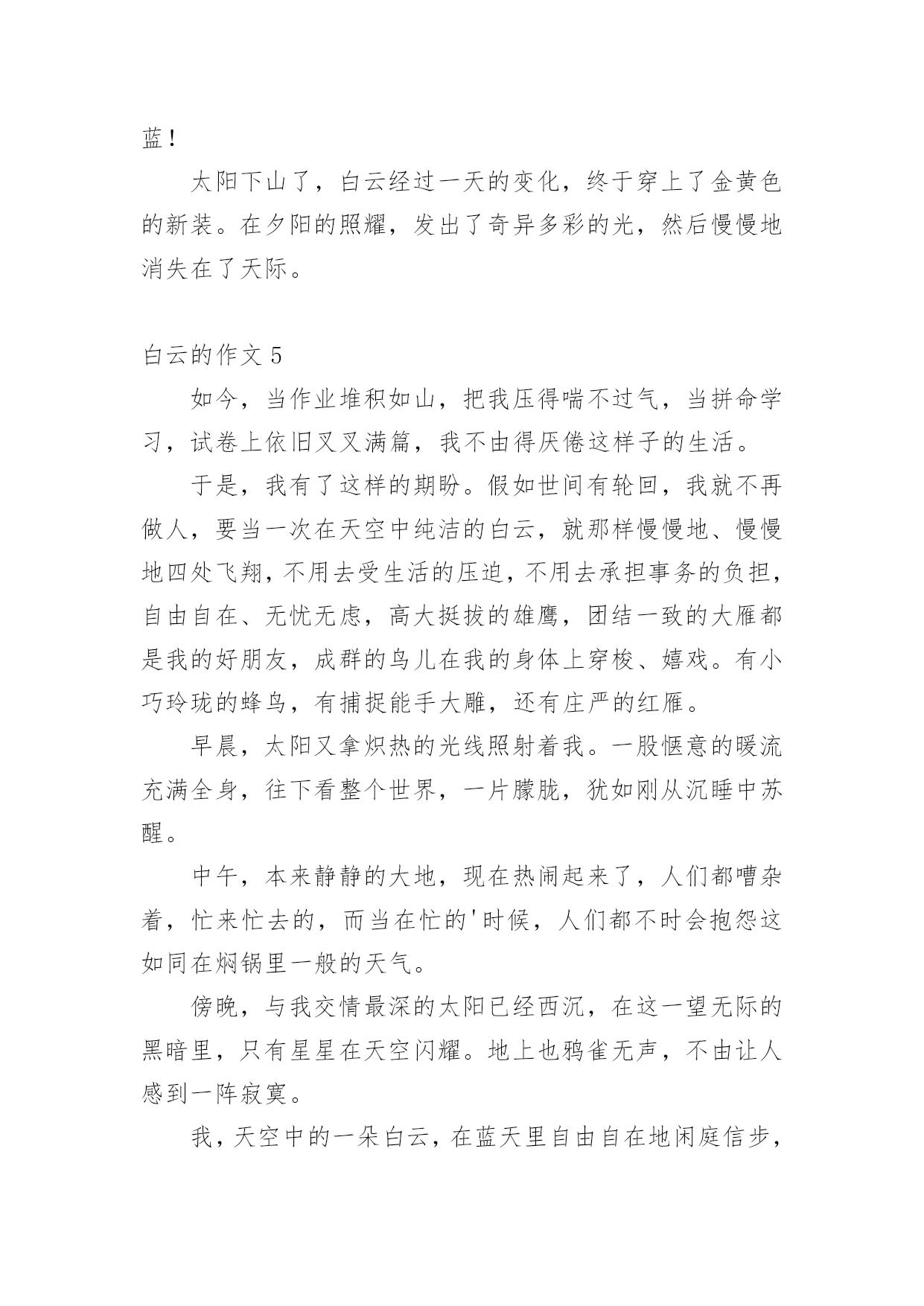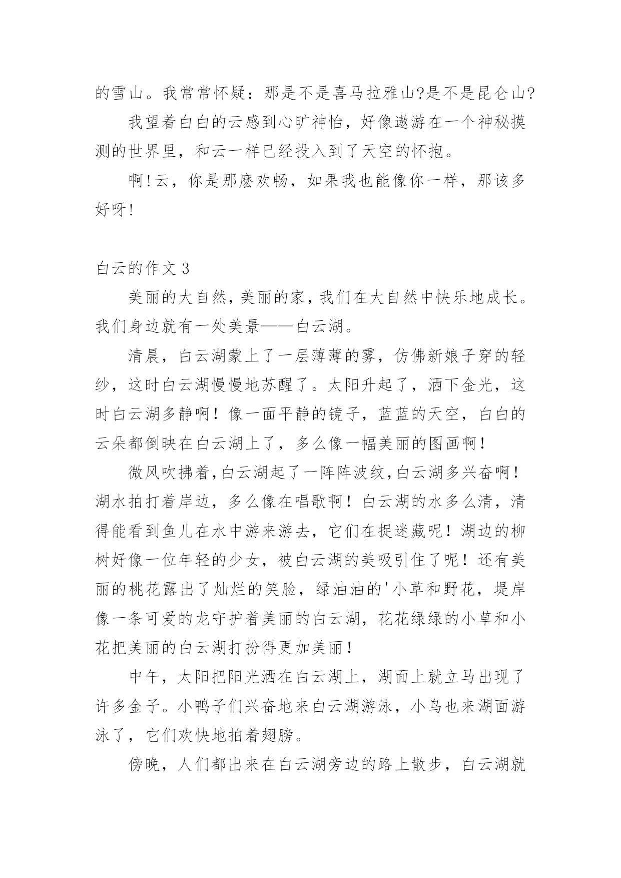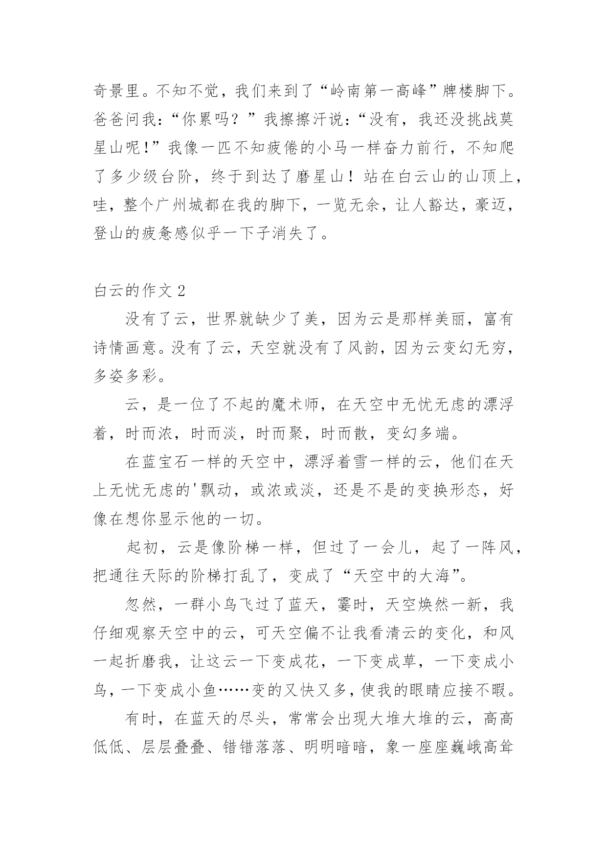 白云的作文 无论是在学校还是在社会中,大家总少不了接触作文吧,作文是从内部言语向外部言语的过渡,即从经过压缩的简要的、自己能明白的语言,向开展的、具有规范语法结构的、能为他人所理解的外部语言形式的转化。那要怎么写好作文呢?下面是小编整理的白云的作文,希望能够帮助到大家。白云的作文1今天是星期六,在这个美丽的春天,我和父母去爬白云山。途中父亲告诉我,白云山海拔382米,风景优美。每当下雨,白云环绕青山绿水,故名“白云山”。白云山在新的“羊城八景”中名列第一,空气清新,是广州的“城市肺”。我们来到了白云山脚下。一进大门,我就看到了宽阔的.盘山公路,两旁绿树葱郁。树上的鸟儿快乐地歌唱。当我到达山腰公园时,我面前是一片绿色的草地。紫色植物做成的“欢迎来到白云山”六个字向我打招呼。太美了!我们继续前行,来到了桃花江。这里真是一片桃花海。红如火,粉如霞,白如雪,桃花争美争香。更奇怪的是,一棵树有三种桃花!我的眼睛太忙了。我抓了又抓,很快就用相机拍下了这个精彩的镜头。带着桃花的香味,我们又爬了上去。一路走来,我不停地掰着在花丛中飞舞的彩蝶,树上歌唱的小鸟,陶醉在山中奇景里。不知不觉,我们来到了“岭南第一高峰”牌楼脚下。爸爸问我:“你累吗?”我擦擦汗说:“没有,我还没挑战莫星山呢!”我像一匹不知疲倦的小马一样奋力前行,不知爬了多少级台阶,终于到达了磨星山!站在白云山的山顶上,哇,整个广州城都在我的脚下,一览无余,让人豁达,豪迈,登山的疲惫感似乎一下子消失了。白云的作文2没有了云,世界就缺少了美,因为云是那样美丽,富有诗情画意。没有了云,天空就没有了风韵,因为云变幻无穷,多姿多彩。云,是一位了不起的魔术师,在天空中无忧无虑的漂浮着,时而浓,时而淡,时而聚,时而散,变幻多端。在蓝宝石一样的天空中,漂浮着雪一样的云,他们在天上无忧无虑的'飘动,或浓或淡,还是不是的变换形态,好像在想你显示他的一切。起初,云是像阶梯一样,但过了一会儿,起了一阵风,把通往天际的阶梯打乱了,变成了“天空中的大海”。忽然,一群小鸟飞过了蓝天,霎时,天空焕然一新,我仔细观察天空中的云,可天空偏不让我看清云的变化,和风一起折磨我,让这云一下变成花,一下变成草,一下变成小鸟,一下变成小鱼……变的又快又多,使我的眼睛应接不暇。有时,在蓝天的尽头,常常会出现大堆大堆的云,高高低低、层层叠叠、错错落落、明明暗暗,象一座座巍峨高耸的雪山。我常常怀疑:那是不是喜马拉雅山?是不是昆仑山?我望着白白的云感到心旷神怡,好像遨游在一个神秘摸测的世界里,和云一样已经投入到了天空的怀抱。啊!云,你是那麽欢畅,如果我也能像你一样,那该多好呀!白云的作文3美丽的大自然,美丽的家,我们在大自然中快乐地成长。我们身边就有一处美景——白云湖。清晨,白云湖蒙上了一层薄薄的雾,仿佛新娘子穿的轻纱,这时白云湖慢慢地苏醒了。太阳升起了,洒下金光,这时白云湖多静啊!像一面平静的镜子,蓝蓝的天空,白白的云朵都倒映在白云湖上了,多么像一幅美丽的图画啊!微风吹拂着,白云湖起了一阵阵波纹,白云湖多兴奋啊!湖水拍打着岸边,多么像在唱歌啊!白云湖的水多么清,清得能看到鱼儿在水中游来游去,它们在捉迷藏呢!湖边的柳树好像一位年轻的少女,被白云湖的美吸引住了呢!还有美丽的桃花露出了灿烂的笑脸,绿油油的'小草和野花,堤岸像一条可爱的龙守护着美丽的白云湖,花花绿绿的小草和小花把美丽的白云湖打扮得更加美丽!中午,太阳把阳光洒在白云湖上,湖面上就立马出现了许多金子。小鸭子们兴奋地来白云湖游泳,小鸟也来湖面游泳了,它们欢快地拍着翅膀。傍晚,人们都出来在白云湖旁边的路上散步,白云湖就立马热闹起来。还有湖面上漂着各种各样的船只,有的像小亭子,有的像唐老鸭。给白云湖添加了许多生机,渐渐地太阳西沉了,洒下了红彤彤的光,好像给白云湖铺上了红绸缎。夜晚,五彩缤纷的灯光照在白云湖上,把湖水都染成彩色了,渐渐地白云湖慢慢地沉睡了,湖面又恢复了平静。这就是美丽的白云湖,我爱这美丽的白云湖!白云的作文4我有许多大自然的朋友:山川。草木。花鸟鱼虫。太阳。白云。它们构成了一幅绚丽多彩的画面,它们相互衬托。今天,我仰望天空,与白云姐姐聊起天来。白云姐姐很会捉迷藏,有时她一整天儿不见踪影;有时面带微笑给我讲述在天上变幻莫测的事;白云姐姐也非常爱哭,那次只是抹了几滴泪。不过有一回,太阳公公误会了白云姐姐,白云姐姐委屈了老大一阵子,终于喷发而来,哗哗的流。后来,太阳公公向白云姐姐道了歉,微笑才肯露出来了!白云姐姐像一个小孩子,一会儿变成一匹奔腾的骏马;一会又变成了诗人在天空吟诵;一会儿又变成扯线团的小猫咪;一会儿又变成闻讯可爱滴小白兔;一会儿有小鸟变成憨厚可爱的乌龟,懒洋洋的.趴在那儿晒太阳。天空中的云一下子变成这个,一下子又变成那个,真是变化多端呀,看得我眼花缭乱。白云那么美