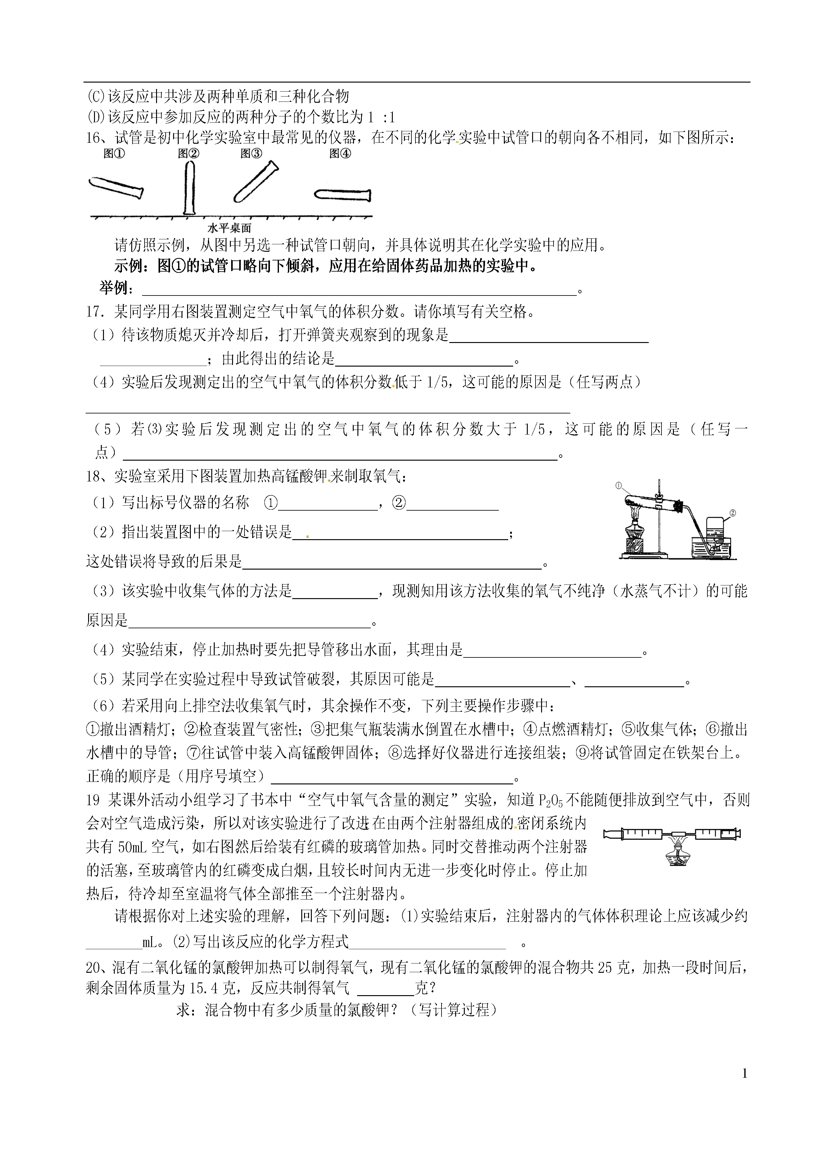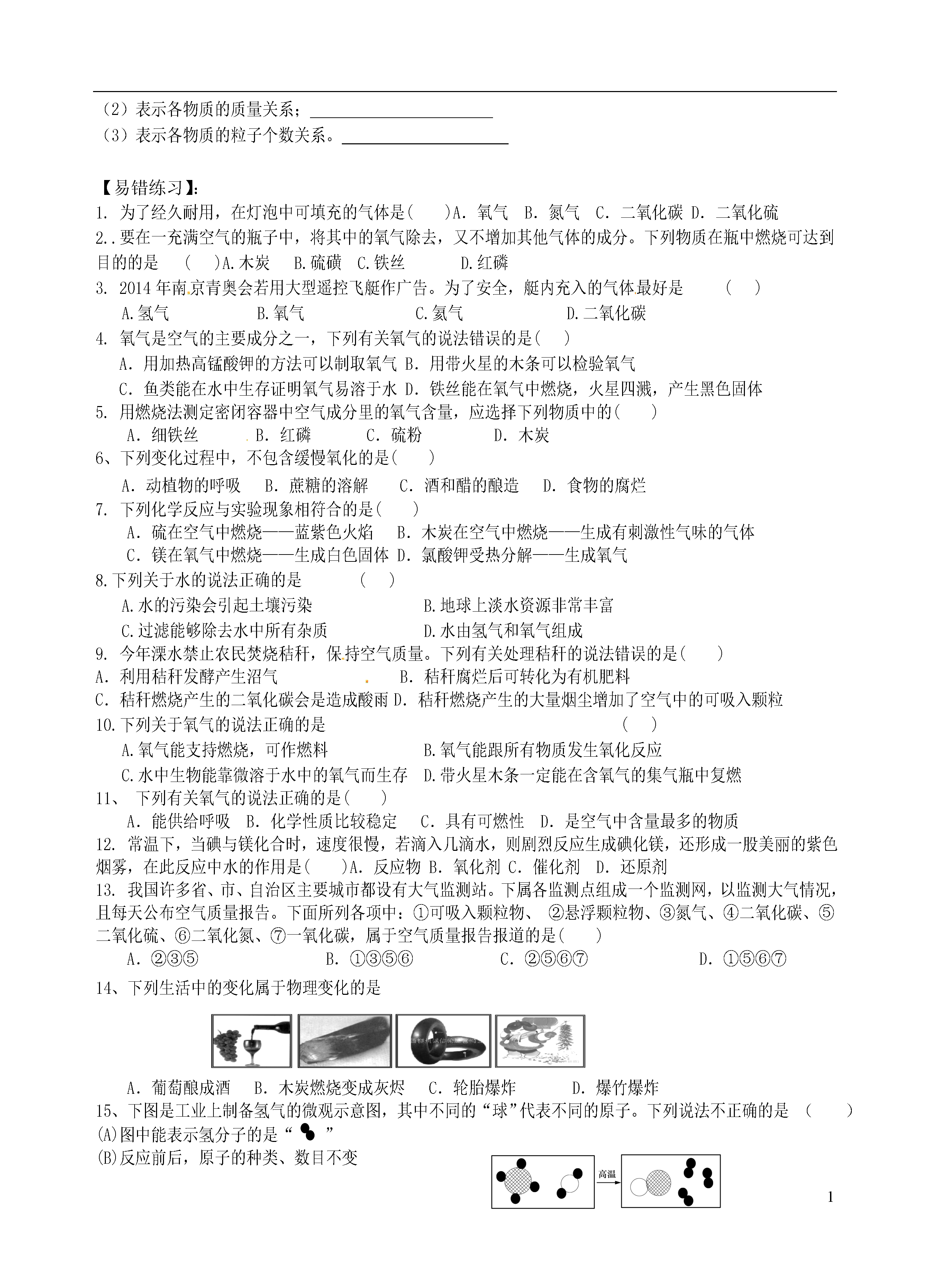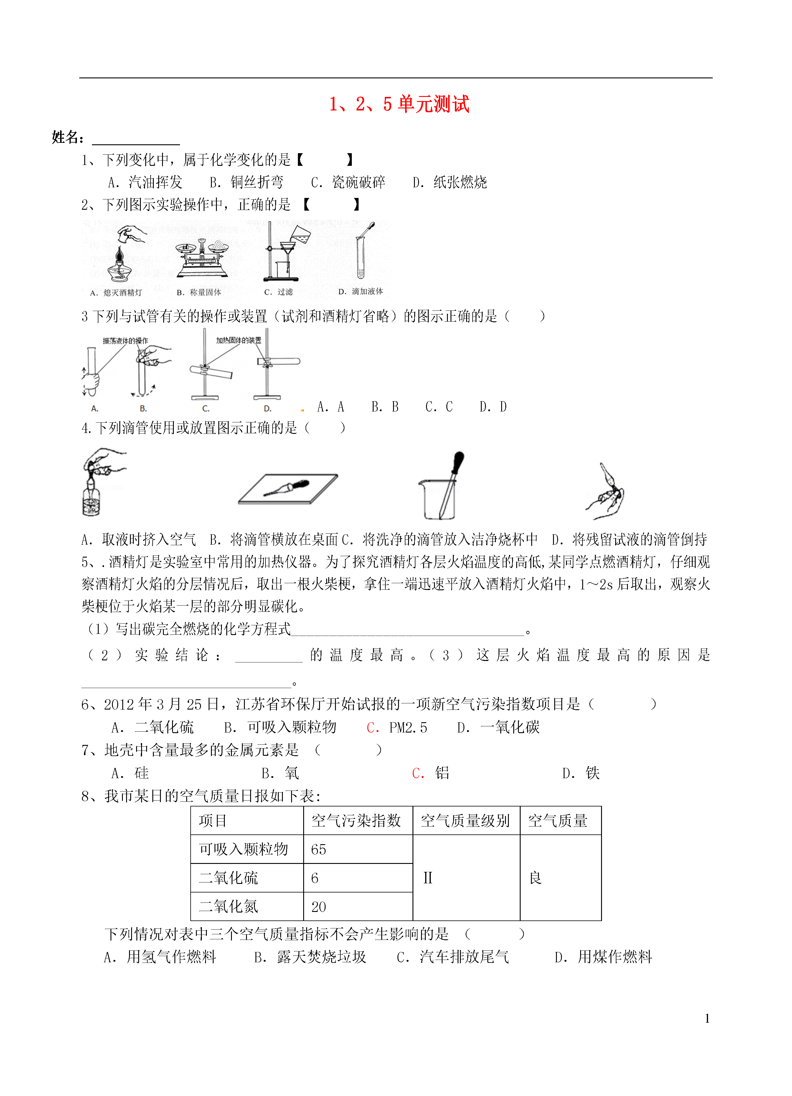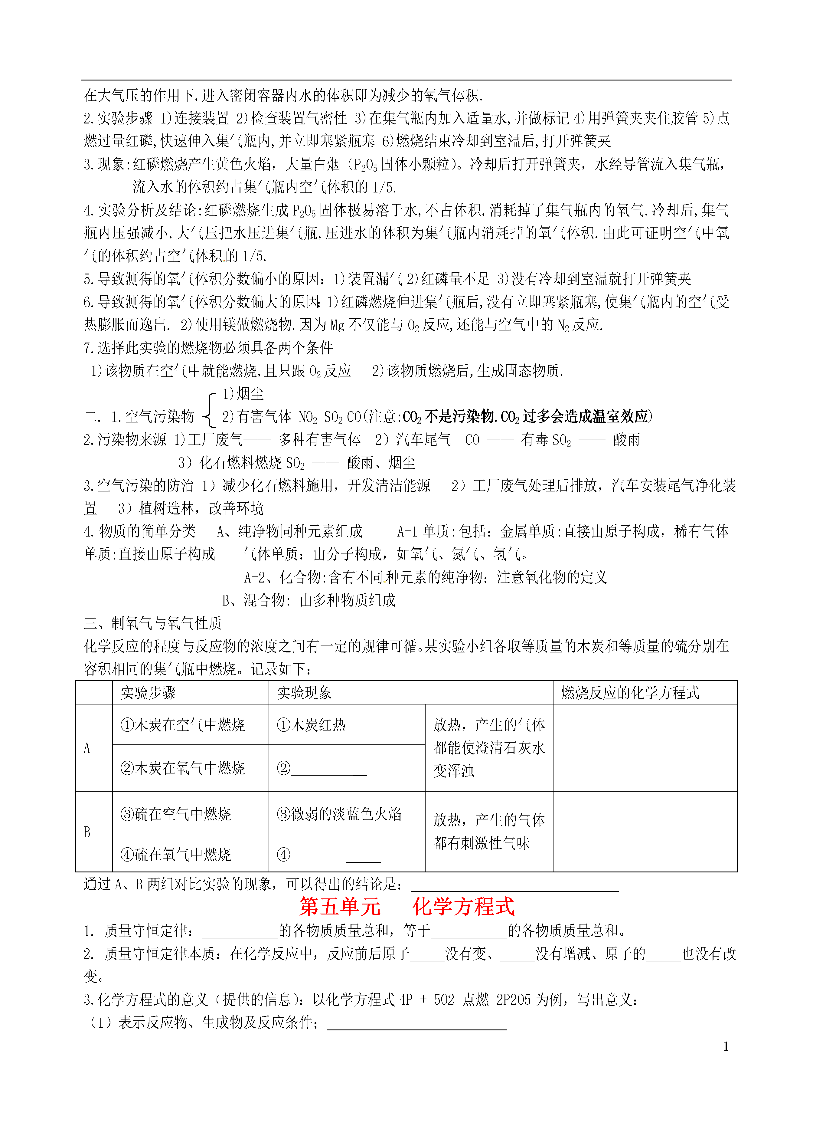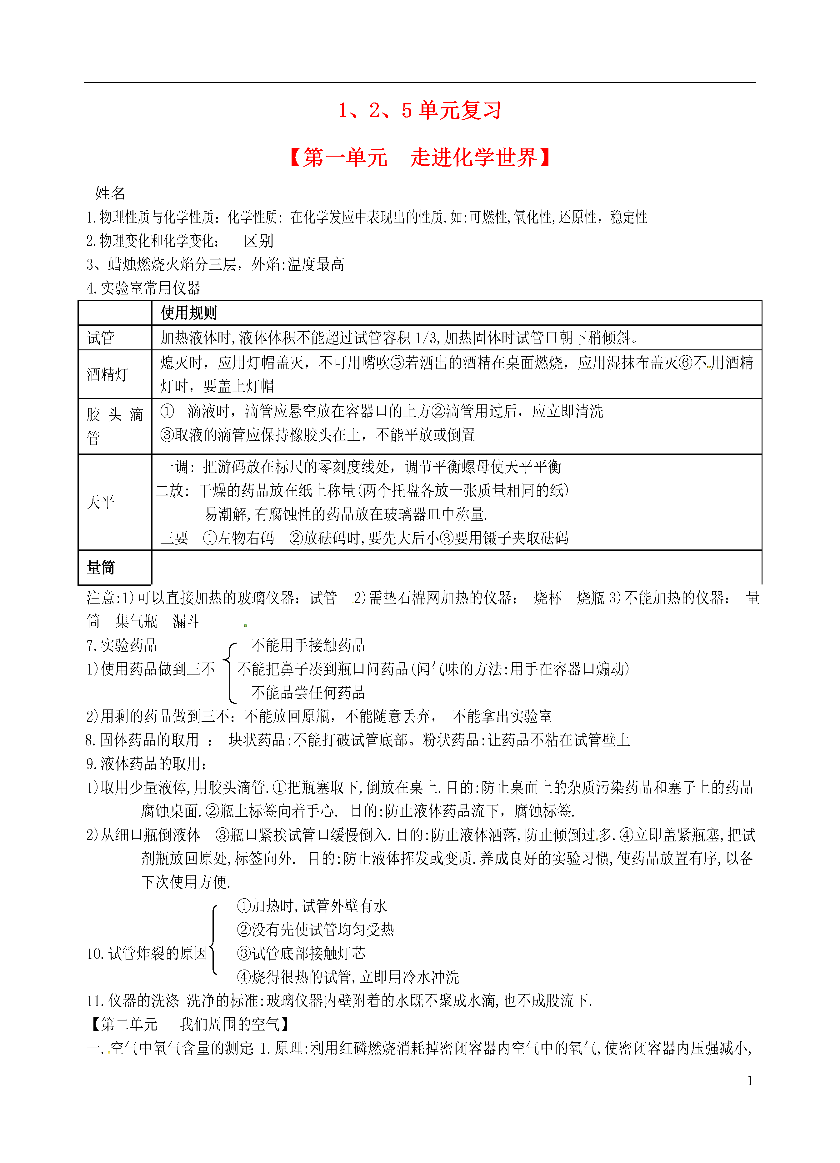 11、2、5单元复习【第一单元走进化学世界】姓名1.物理性质与化学性质:化学性质:在化学发应中表现出的性质.如:可燃性,氧化性,还原性,稳定性2.物理变化和化学变化:区别3、蜡烛燃烧火焰分三层,外焰:温度最高4.实验室常用仪器使用规则试管加热液体时,液体体积不能超过试管容积1/3,加热固体时试管口朝下稍倾斜。酒精灯熄灭时,应用灯帽盖灭,不可用嘴吹⑤若洒出的酒精在桌面燃烧,应用湿抹布盖灭⑥不用酒精灯时,要盖上灯帽胶头滴管滴液时,滴管应悬空放在容器口的上方②滴管用过后,应立即清洗③取液的滴管应保持橡胶头在上,不能平放或倒置天平一调:把游码放在标尺的零刻度线处,调节平衡螺母使天平平衡二放:干燥的药品放在纸上称量(两个托盘各放一张质量相同的纸)易潮解,有腐蚀性的药品放在玻璃器皿中称量.三要①左物右码②放砝码时,要先大后小③要用镊子夹取砝码量筒注意:1)可以直接加热的玻璃仪器:试管2)需垫石棉网加热的仪器:烧杯烧瓶3)不能加热的仪器:量筒集气瓶漏斗7.实验药品不能用手接触药品1)使用药品做到三不不能把鼻子凑到瓶口问药品(闻气味的方法:用手在容器口煽动)不能品尝任何药品2)用剩的药品做到三不:不能放回原甁,不能随意丢弃,不能拿出实验室8.固体药品的取用:块状药品:不能打破试管底部。粉状药品:让药品不粘在试管壁上9.液体药品的取用:1)取用少量液体,用胶头滴管.①把瓶塞取下,倒放在桌上.目的:防止桌面上的杂质污染药品和塞子上的药品腐蚀桌面.②瓶上标签向着手心.目的:防止液体药品流下,腐蚀标签.2)从细口瓶倒液体③瓶口紧挨试管口缓慢倒入.目的:防止液体洒落,防止倾倒过多.④立即盖紧瓶塞,把试剂瓶放回原处,标签向外.目的:防止液体挥发或变质.养成良好的实验习惯,使药品放置有序,以备下次使用方便.①加热时,试管外壁有水②没有先使试管均匀受热10.试管炸裂的原因③试管底部接触灯芯④烧得很热的试管,立即用冷水冲洗11.仪器的洗涤洗净的标准:玻璃仪器内壁附着的水既不聚成水滴,也不成股流下.【第二单元我们周围的空气】一.空气中氧气含量的测定:1.原理:利用红磷燃烧消耗掉密闭容器内空气中的氧气,使密闭容器内压强减小,在大气压的作用下,进入密闭容器内水的体积即为减少的氧气体积.2.实验步骤1)连接装置2)检查装置气密性3)在集气瓶内加入适量水,并做标记4)用弹簧夹夹住胶管5)点燃过量红磷,快速伸入集气瓶内,并立即塞紧瓶塞6)燃烧结束冷却到室温后,打开弹簧夹3.现象:红磷燃烧产生黄色火焰,大量白烟(P2O5固体小颗粒)。冷却后打开弹簧夹,水经导管流入集气瓶,流入水的体积约占集气瓶内空气体积的1/5.4.实验分析及结论:红磷燃烧生成P2O5固体极易溶于水,不占体积,消耗掉了集气瓶内的氧气.冷却后,集气瓶内压强减小,大气压把水压进集气瓶,压进水的体积为集气瓶内消耗掉的氧气体积.由此可证明空气中氧气的体积约占空气体积的1/5.5.导致测得的氧气体积分数偏小的原因:1)装置漏气2)红磷量不足3)没有冷却到室温就打开弹簧夹6.导致测得的氧气体积分数偏大的原因:1)红磷燃烧伸进集气瓶后,没有立即塞紧瓶塞,使集气瓶内的空气受热膨胀而逸出.2)使用镁做燃烧物.因为Mg不仅能与O2反应,还能与空气中的N2反应.7.选择此实验的燃烧物必须具备两个条件1)该物质在空气中就能燃烧,且只跟O2反应2)该物质燃烧后,生成固态物质.1)烟尘二.1.空气污染物2)有害气体NO2SO2CO(注意:CO2不是污染物.CO2过多会造成温室效应)2.污染物来源1)工厂废气——多种有害气体2)汽车尾气CO——有毒SO2——酸雨3)化石燃料燃烧SO2——酸雨、烟尘3.空气污染的防治1)减少化石燃料施用,开发清洁能源2)工厂废气处理后排放,汽车安装尾气净化装置3)植树造林,改善环境4.物质的简单分类A、纯净物同种元素组成A-1单质:包括:金属单质:直接由原子构成,稀有气体单质:直接由原子构成气体单质:由分子构成,如氧气、氮气、氢气。A-2、化合物:含有不同种元素的纯净物:注意氧化物的定义B、混合物:由多种物质组成三、制氧气与氧气性质化学反应的程度与反应物的浓度之间有一定的规律可循。某实验小组各取等质量的木炭和等质量的硫分别在容积相同的集气瓶中燃烧。记录如下:实验步骤实验现象燃烧反应的化学方程式A①木炭在空气中燃烧①木炭红热放热,产生的气体都能使澄清石灰水变浑浊______________________②木炭在氧气中燃烧②_________B③硫在空气中燃烧③微弱的淡蓝色火焰放热,产生的气体都有刺激性气味______________________④硫在氧气中燃烧④________通过A、B两组对比实验