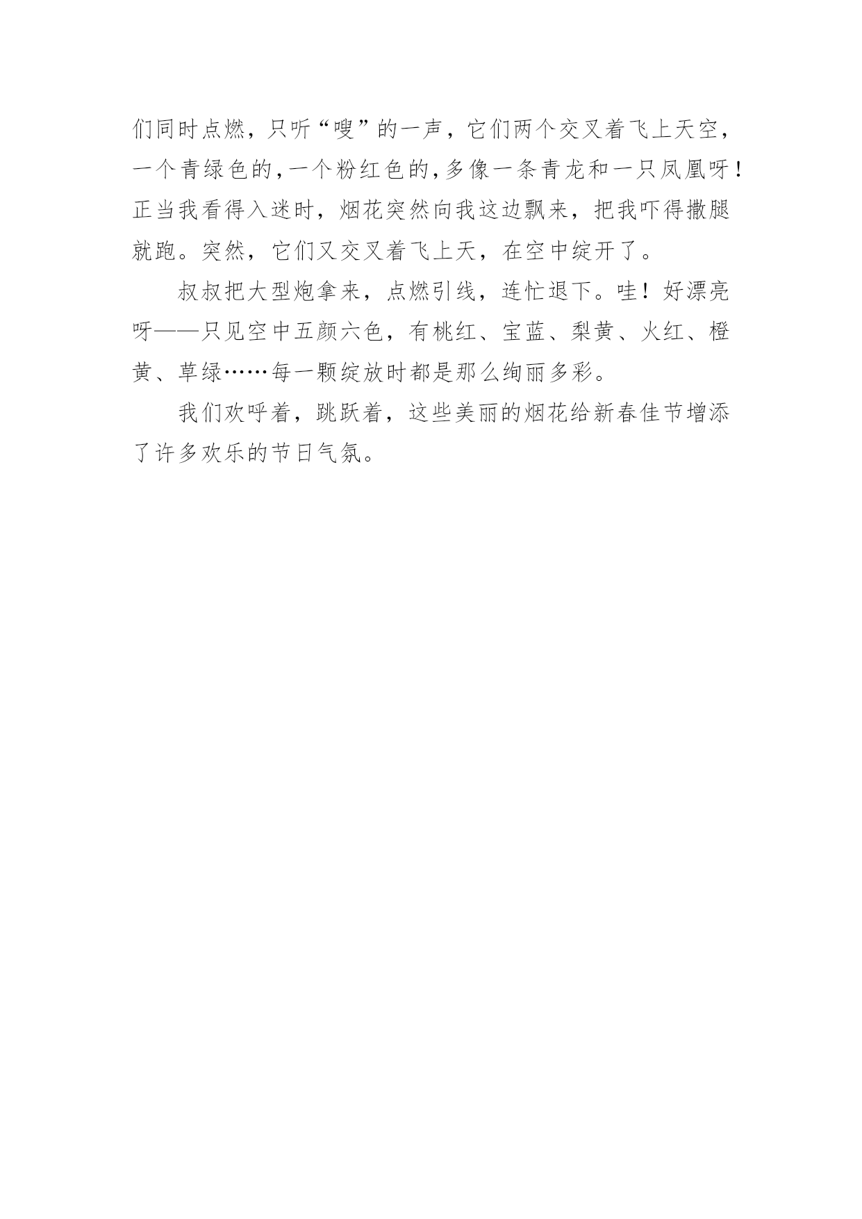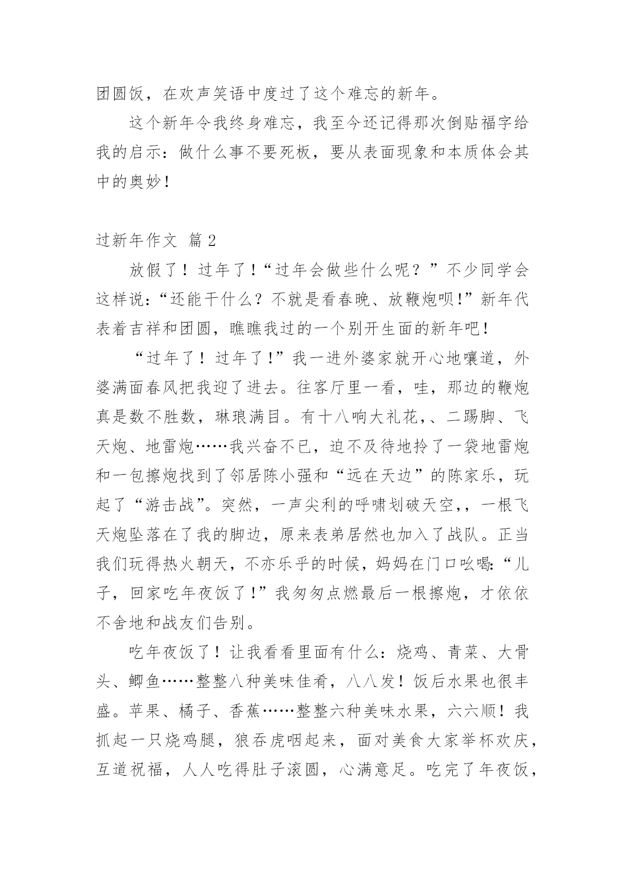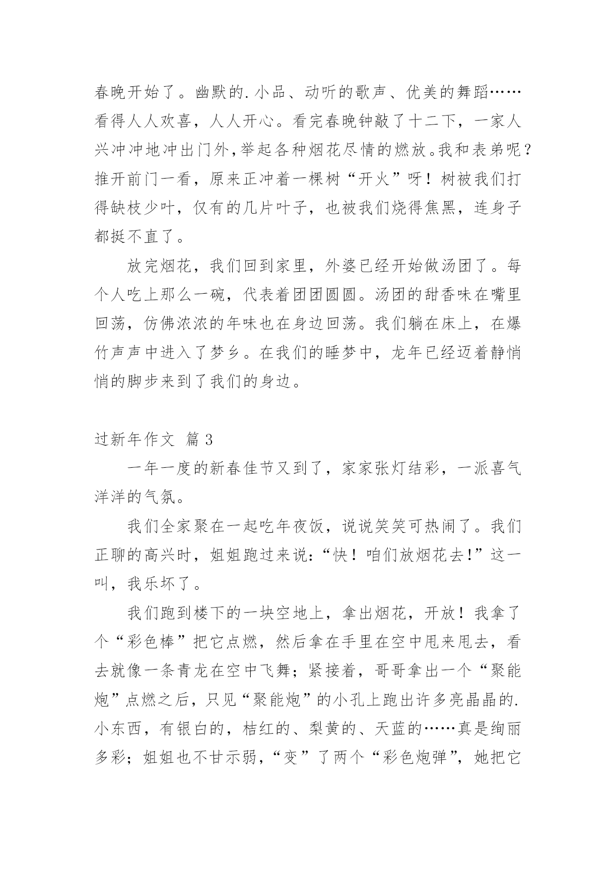 过新年作文 【精华】过新年作文3篇在日常学习、工作和生活中,大家都跟作文打过交道吧,通过作文可以把我们那些零零散散的思想,聚集在一块。你知道作文怎样才能写的好吗?以下是小编为大家整理的过新年作文4篇,欢迎阅读与收藏。过新年作文篇1“咚咚”新年的钟声,在荡起回肠的呐喊中,在十三亿兄弟姐妹的.呼唤中,在神洲大地深深的期盼中敲响了,这是一个辞旧迎新的时刻,告别了辉煌的过去,迎来更加璀璨的未来。当我从睡梦中醒来时,我已知道今天是我盼星星,盼月亮才盼来的春节。早上我早早地起了床和爸爸母亲去到奶奶家过年。我到的时候奶奶正在贴对联,我大声吵着:“我也要贴,我也要贴。”奶奶只好把福字让我贴,我心想,这还不好贴吗?说罢,我把胶水涂在上面往墙上一贴,母亲立刻跑了过来,用力把福字扯下来,我生气地说:“为什么把我贴的福取下来?”母亲一本正经地说:“福字应该倒着贴,这样福倒了福就到了呀!”“”噢!我惊叹地表示同意,我又拿起福字贴,倒着贴在了门上。这时,我就从一件小事中体会了中华传统习俗文化的博大精深。中午我们全家一起吃了团圆饭,在欢声笑语中度过了这个难忘的新年。这个新年令我终身难忘,我至今还记得那次倒贴福字给我的启示:做什么事不要死板,要从表面现象和本质体会其中的奥妙!过新年作文篇2放假了!过年了!“过年会做些什么呢?”不少同学会这样说:“还能干什么?不就是看春晚、放鞭炮呗!”新年代表着吉祥和团圆,瞧瞧我过的一个别开生面的新年吧!“过年了!过年了!”我一进外婆家就开心地嚷道,外婆满面春风把我迎了进去。往客厅里一看,哇,那边的鞭炮真是数不胜数,琳琅满目。有十八响大礼花,、二踢脚、飞天炮、地雷炮……我兴奋不已,迫不及待地拎了一袋地雷炮和一包擦炮找到了邻居陈小强和“远在天边”的陈家乐,玩起了“游击战”。突然,一声尖利的呼啸划破天空,,一根飞天炮坠落在了我的脚边,原来表弟居然也加入了战队。正当我们玩得热火朝天,不亦乐乎的时候,妈妈在门口吆喝:“儿子,回家吃年夜饭了!”我匆匆点燃最后一根擦炮,才依依不舍地和战友们告别。吃年夜饭了!让我看看里面有什么:烧鸡、青菜、大骨头、鲫鱼……整整八种美味佳肴,八八发!饭后水果也很丰盛。苹果、橘子、香蕉……整整六种美味水果,六六顺!我抓起一只烧鸡腿,狼吞虎咽起来,面对美食大家举杯欢庆,互道祝福,人人吃得肚子滚圆,心满意足。吃完了年夜饭,春晚开始了。幽默的.小品、动听的歌声、优美的舞蹈……看得人人欢喜,人人开心。看完春晚钟敲了十二下,一家人兴冲冲地冲出门外,举起各种烟花尽情的燃放。我和表弟呢?推开前门一看,原来正冲着一棵树“开火”呀!树被我们打得缺枝少叶,仅有的几片叶子,也被我们烧得焦黑,连身子都挺不直了。放完烟花,我们回到家里,外婆已经开始做汤团了。每个人吃上那么一碗,代表着团团圆圆。汤团的甜香味在嘴里回荡,仿佛浓浓的年味也在身边回荡。我们躺在床上,在爆竹声声中进入了梦乡。在我们的睡梦中,龙年已经迈着静悄悄的脚步来到了我们的身边。过新年作文篇3一年一度的新春佳节又到了,家家张灯结彩,一派喜气洋洋的气氛。我们全家聚在一起吃年夜饭,说说笑笑可热闹了。我们正聊的高兴时,姐姐跑过来说:“快!咱们放烟花去!”这一叫,我乐坏了。我们跑到楼下的一块空地上,拿出烟花,开放!我拿了个“彩色棒”把它点燃,然后拿在手里在空中甩来甩去,看去就像一条青龙在空中飞舞;紧接着,哥哥拿出一个“聚能炮”点燃之后,只见“聚能炮”的小孔上跑出许多亮晶晶的.小东西,有银白的,桔红的、梨黄的、天蓝的……真是绚丽多彩;姐姐也不甘示弱,“变”了两个“彩色炮弹”,她把它们同时点燃,只听“嗖”的一声,它们两个交叉着飞上天空,一个青绿色的,一个粉红色的,多像一条青龙和一只凤凰呀!正当我看得入迷时,烟花突然向我这边飘来,把我吓得撒腿就跑。突然,它们又交叉着飞上天,在空中绽开了。叔叔把大型炮拿来,点燃引线,连忙退下。哇!好漂亮呀——只见空中五颜六色,有桃红、宝蓝、梨黄、火红、橙黄、草绿……每一颗绽放时都是那么绚丽多彩。我们欢呼着,跳跃着,这些美丽的烟花给新春佳节增添了许多欢乐的节日气氛。