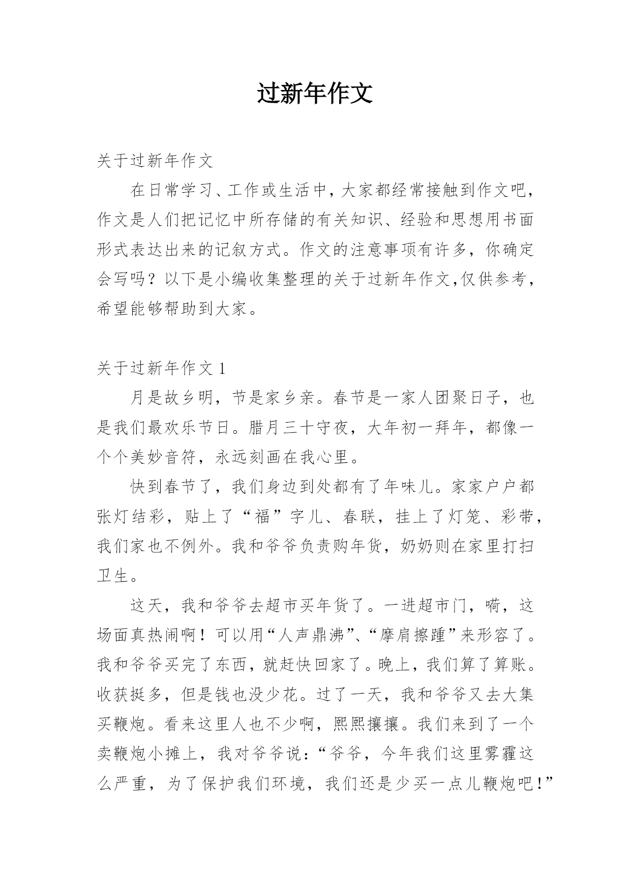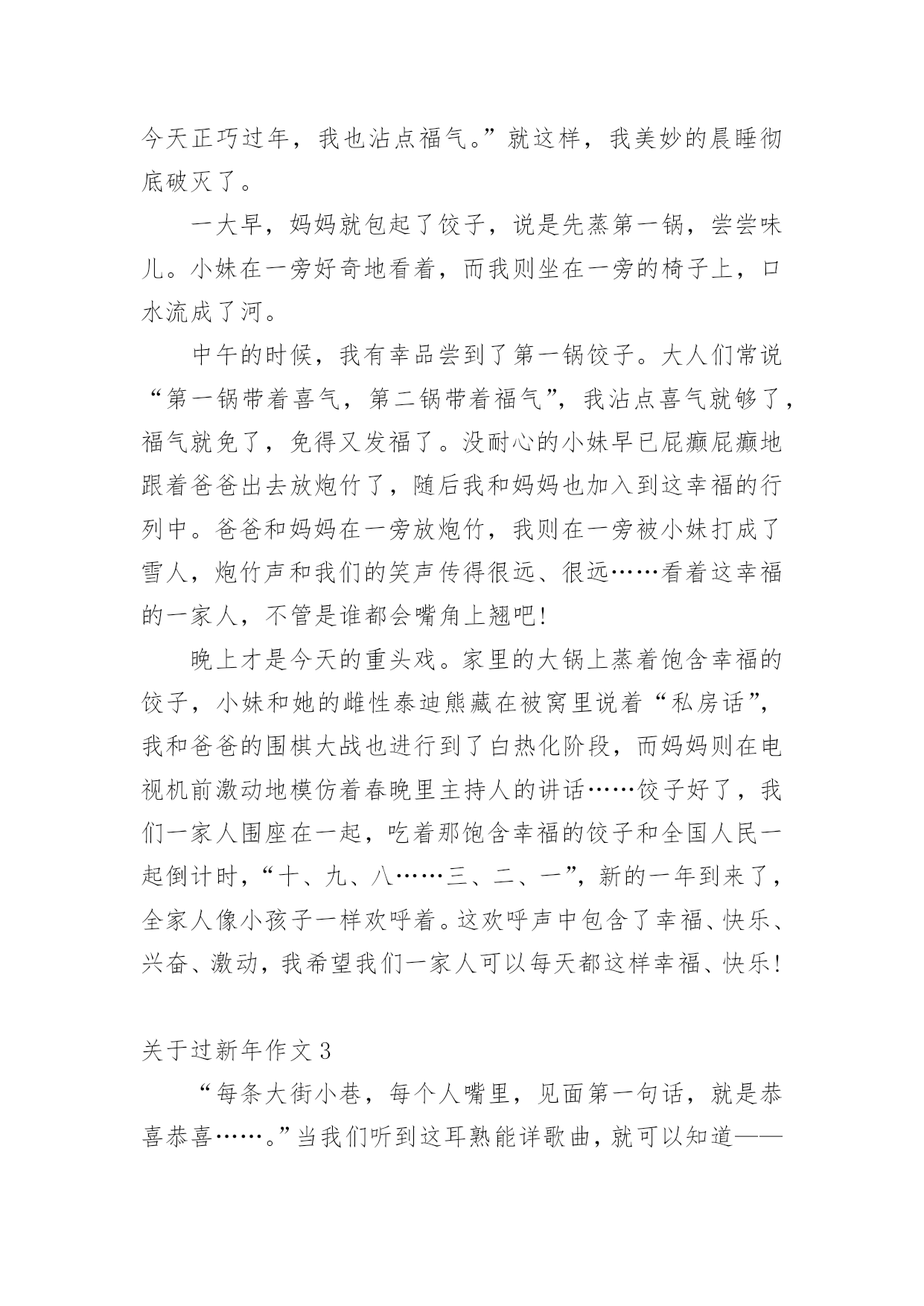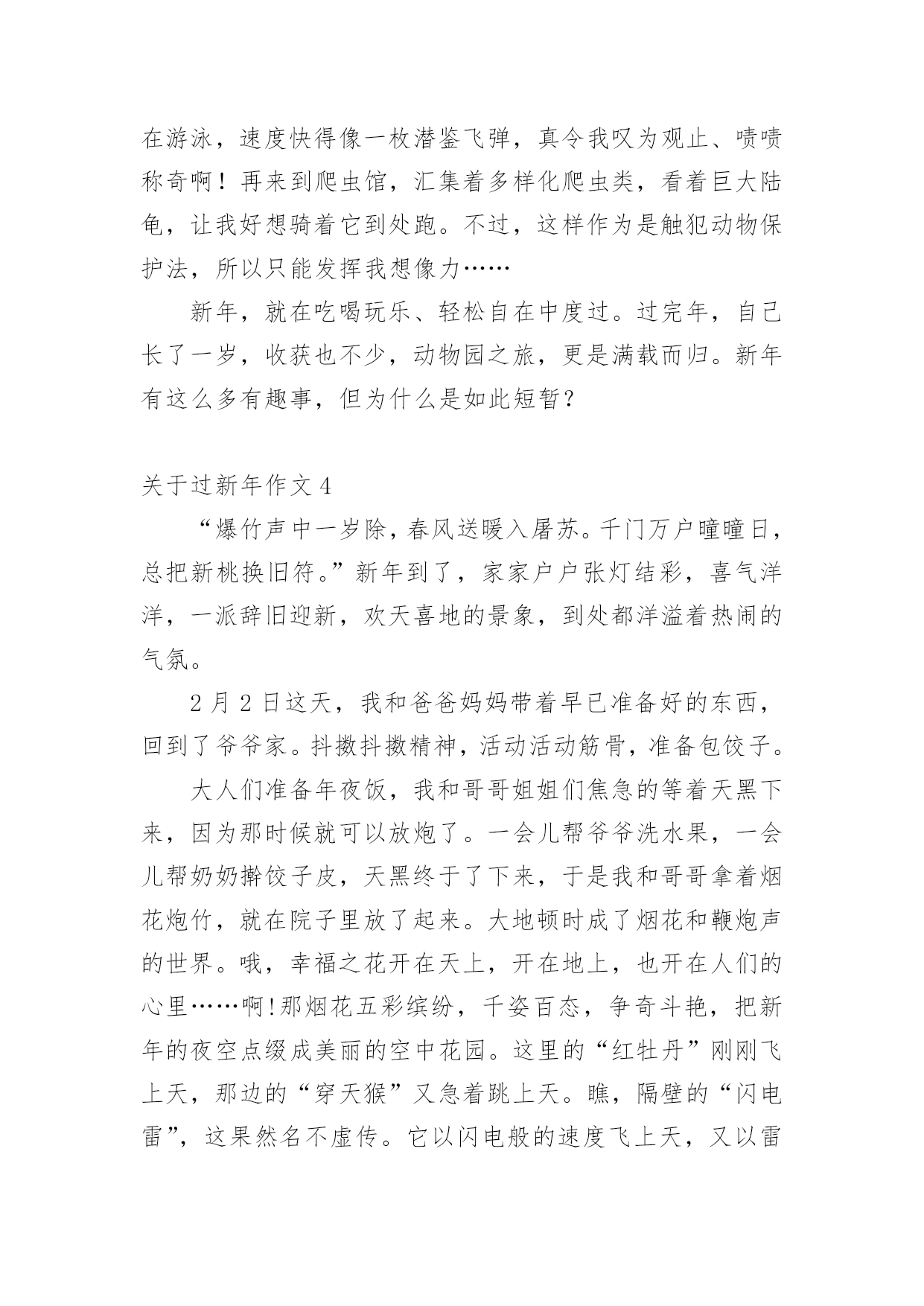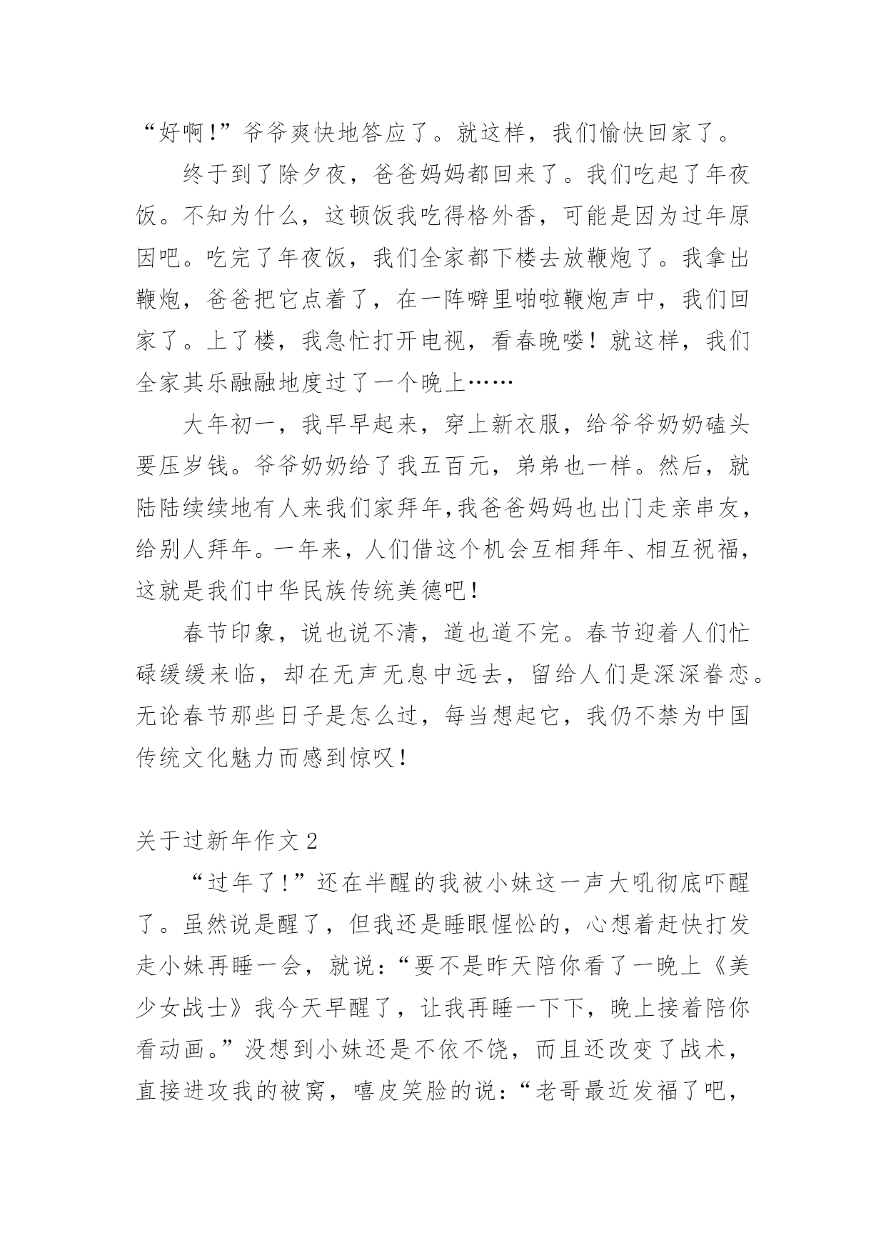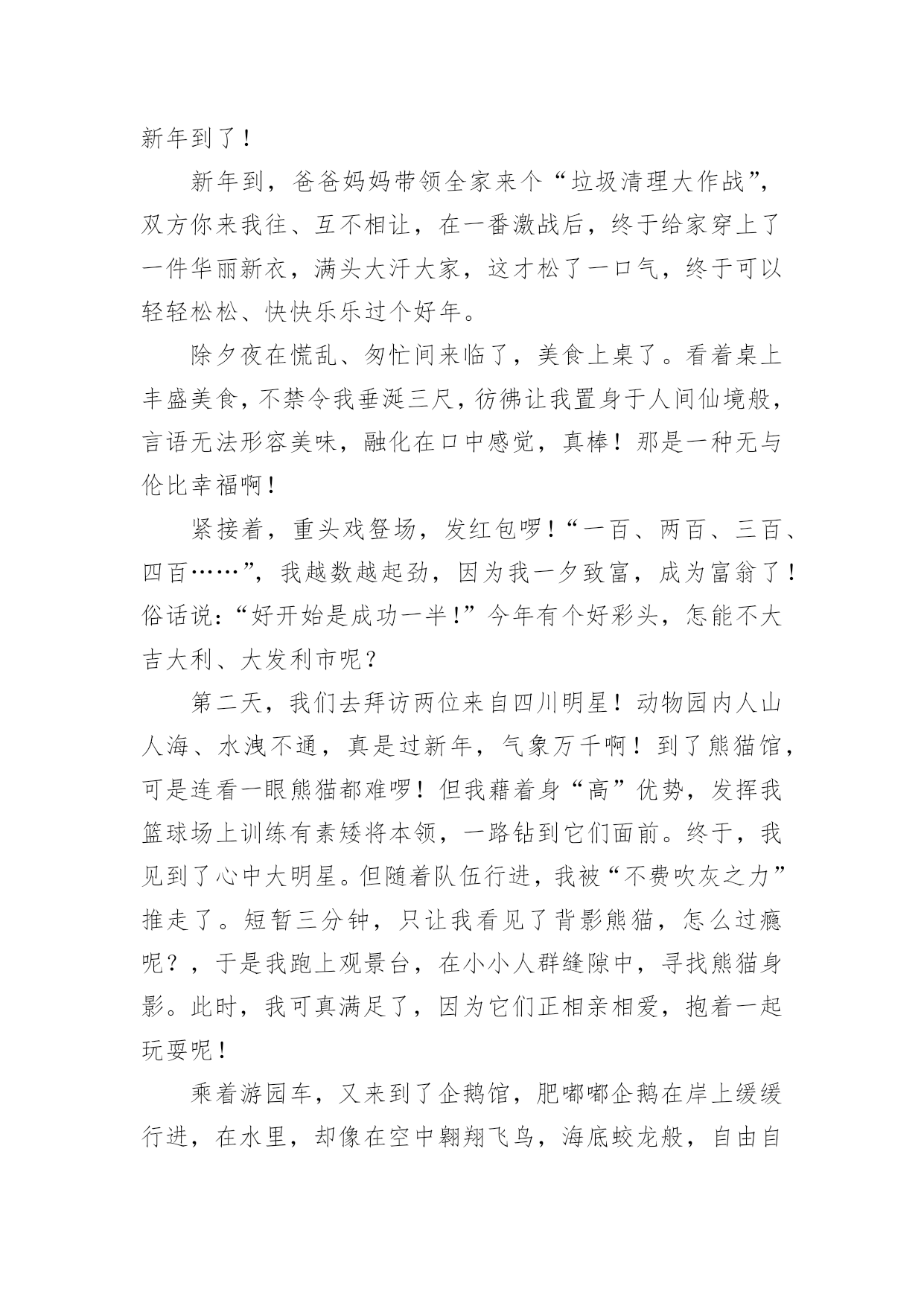 过新年作文 关于过新年作文在日常学习、工作或生活中,大家都经常接触到作文吧,作文是人们把记忆中所存储的有关知识、经验和思想用书面形式表达出来的记叙方式。作文的注意事项有许多,你确定会写吗?以下是小编收集整理的关于过新年作文,仅供参考,希望能够帮助到大家。关于过新年作文1月是故乡明,节是家乡亲。春节是一家人团聚日子,也是我们最欢乐节日。腊月三十守夜,大年初一拜年,都像一个个美妙音符,永远刻画在我心里。快到春节了,我们身边到处都有了年味儿。家家户户都张灯结彩,贴上了“福”字儿、春联,挂上了灯笼、彩带,我们家也不例外。我和爷爷负责购年货,奶奶则在家里打扫卫生。这天,我和爷爷去超市买年货了。一进超市门,嗬,这场面真热闹啊!可以用“人声鼎沸”、“摩肩擦踵”来形容了。我和爷爷买完了东西,就赶快回家了。晚上,我们算了算账。收获挺多,但是钱也没少花。过了一天,我和爷爷又去大集买鞭炮。看来这里人也不少啊,熙熙攘攘。我们来到了一个卖鞭炮小摊上,我对爷爷说:“爷爷,今年我们这里雾霾这么严重,为了保护我们环境,我们还是少买一点儿鞭炮吧!”“好啊!”爷爷爽快地答应了。就这样,我们愉快回家了。终于到了除夕夜,爸爸妈妈都回来了。我们吃起了年夜饭。不知为什么,这顿饭我吃得格外香,可能是因为过年原因吧。吃完了年夜饭,我们全家都下楼去放鞭炮了。我拿出鞭炮,爸爸把它点着了,在一阵噼里啪啦鞭炮声中,我们回家了。上了楼,我急忙打开电视,看春晚喽!就这样,我们全家其乐融融地度过了一个晚上……大年初一,我早早起来,穿上新衣服,给爷爷奶奶磕头要压岁钱。爷爷奶奶给了我五百元,弟弟也一样。然后,就陆陆续续地有人来我们家拜年,我爸爸妈妈也出门走亲串友,给别人拜年。一年来,人们借这个机会互相拜年、相互祝福,这就是我们中华民族传统美德吧!春节印象,说也说不清,道也道不完。春节迎着人们忙碌缓缓来临,却在无声无息中远去,留给人们是深深眷恋。无论春节那些日子是怎么过,每当想起它,我仍不禁为中国传统文化魅力而感到惊叹!关于过新年作文2“过年了!”还在半醒的我被小妹这一声大吼彻底吓醒了。虽然说是醒了,但我还是睡眼惺忪的,心想着赶快打发走小妹再睡一会,就说:“要不是昨天陪你看了一晚上《美少女战士》我今天早醒了,让我再睡一下下,晚上接着陪你看动画。”没想到小妹还是不依不饶,而且还改变了战术,直接进攻我的被窝,嘻皮笑脸的说:“老哥最近发福了吧,今天正巧过年,我也沾点福气。”就这样,我美妙的晨睡彻底破灭了。一大早,妈妈就包起了饺子,说是先蒸第一锅,尝尝味儿。小妹在一旁好奇地看着,而我则坐在一旁的椅子上,口水流成了河。中午的时候,我有幸品尝到了第一锅饺子。大人们常说“第一锅带着喜气,第二锅带着福气”,我沾点喜气就够了,福气就免了,免得又发福了。没耐心的小妹早已屁癫屁癫地跟着爸爸出去放炮竹了,随后我和妈妈也加入到这幸福的行列中。爸爸和妈妈在一旁放炮竹,我则在一旁被小妹打成了雪人,炮竹声和我们的笑声传得很远、很远……看着这幸福的一家人,不管是谁都会嘴角上翘吧!晚上才是今天的重头戏。家里的大锅上蒸着饱含幸福的饺子,小妹和她的雌性泰迪熊藏在被窝里说着“私房话”,我和爸爸的围棋大战也进行到了白热化阶段,而妈妈则在电视机前激动地模仿着春晚里主持人的讲话……饺子好了,我们一家人围座在一起,吃着那饱含幸福的饺子和全国人民一起倒计时,“十、九、八……三、二、一”,新的一年到来了,全家人像小孩子一样欢呼着。这欢呼声中包含了幸福、快乐、兴奋、激动,我希望我们一家人可以每天都这样幸福、快乐!关于过新年作文3“每条大街小巷,每个人嘴里,见面第一句话,就是恭喜恭喜……。”当我们听到这耳熟能详歌曲,就可以知道——新年到了!新年到,爸爸妈妈带领全家来个“垃圾清理大作战”,双方你来我往、互不相让,在一番激战后,终于给家穿上了一件华丽新衣,满头大汗大家,这才松了一口气,终于可以轻轻松松、快快乐乐过个好年。除夕夜在慌乱、匆忙间来临了,美食上桌了。看着桌上丰盛美食,不禁令我垂涎三尺,彷彿让我置身于人间仙境般,言语无法形容美味,融化在口中感觉,真棒!那是一种无与伦比幸福啊!紧接着,重头戏豋场,发红包啰!“一百、两百、三百、四百……”,我越数越起劲,因为我一夕致富,成为富翁了!俗话说:“好开始是成功一半!”今年有个好彩头,怎能不大吉大利、大发利市呢?第二天,我们去拜访两位来自四川明星!动物园内人山人海、水洩不通,真是过新年,气象万千啊!到了熊猫馆,可是连看一眼熊猫都难啰!但我藉着身“高”优势,发挥我篮球场上训练有素矮将本领,一路钻到它们面前。终于,我见到了心中大明星。但随着队伍行进,我被“不费吹灰之力”推走了。短暂三分钟,只让我看见了背影熊猫,怎么过瘾呢?,于是我跑上观景台,在小小人群缝隙中,寻找熊猫身影。此时,我可真满足了,因为它们正相亲相爱