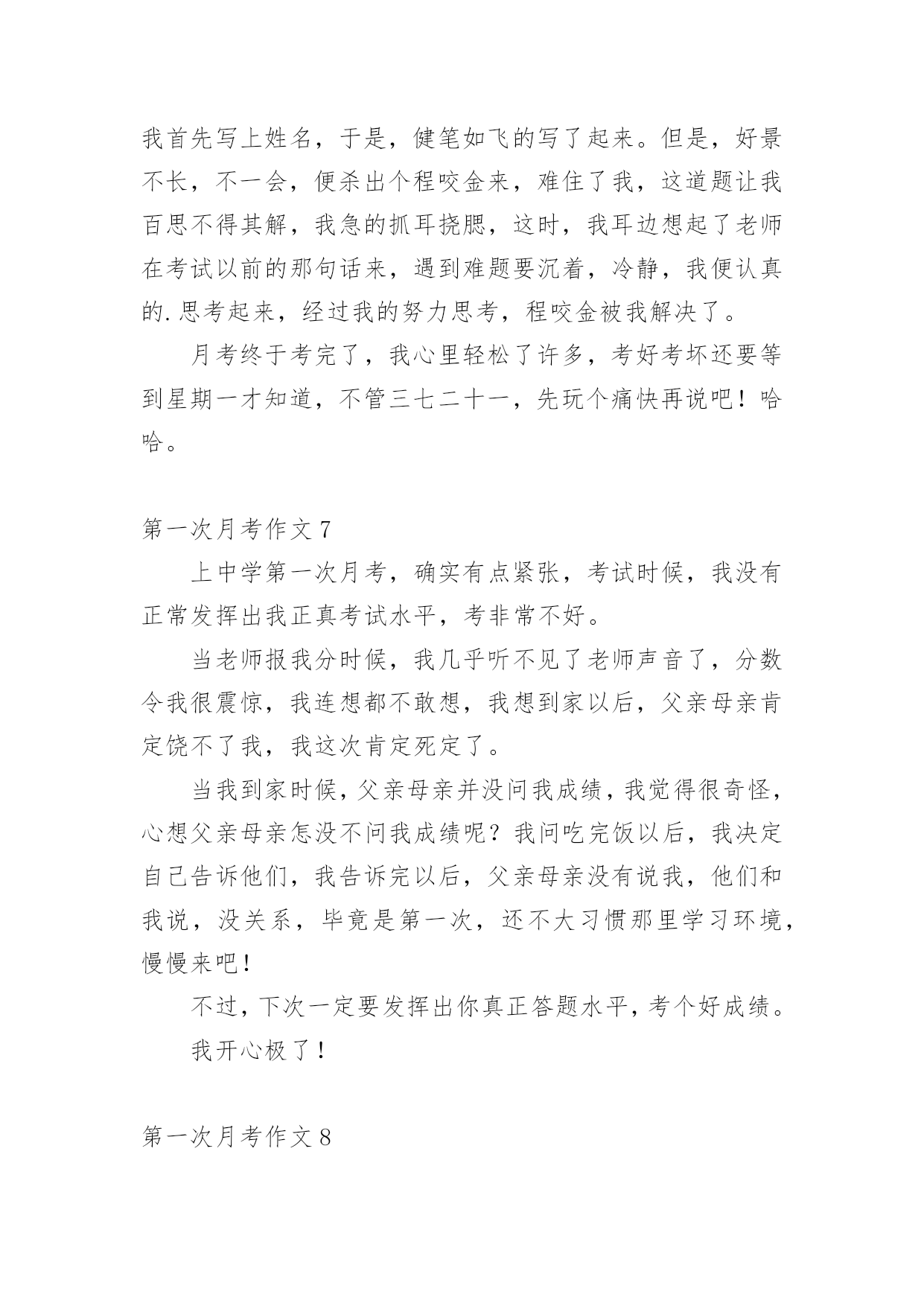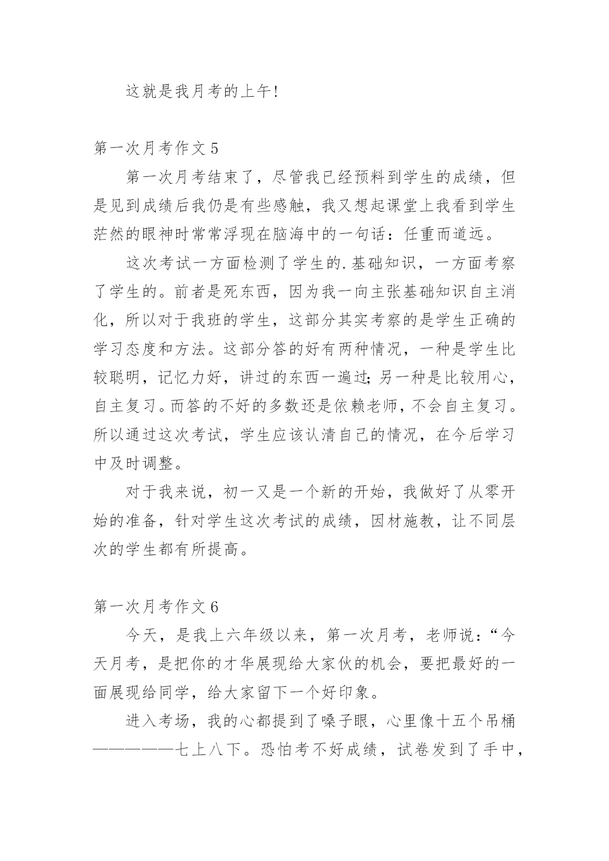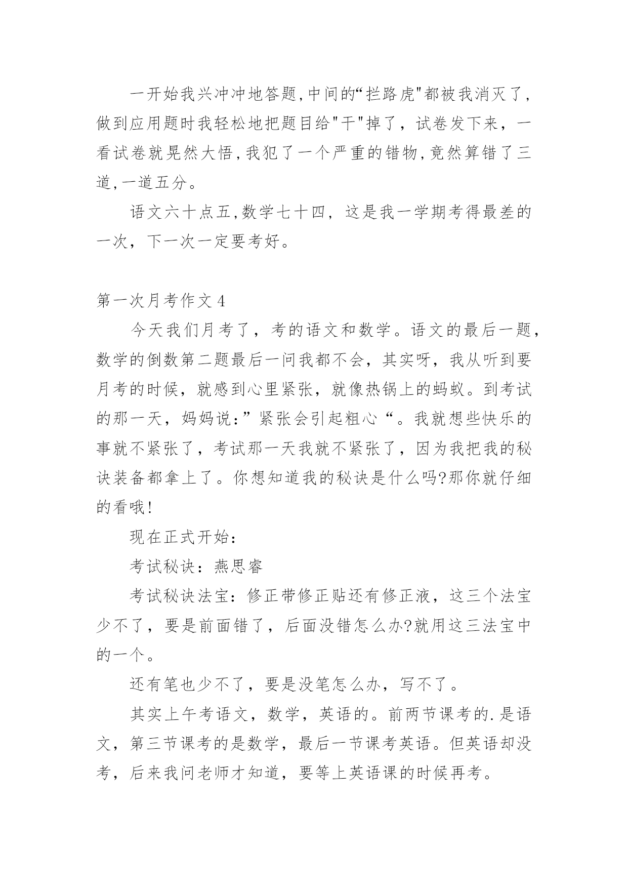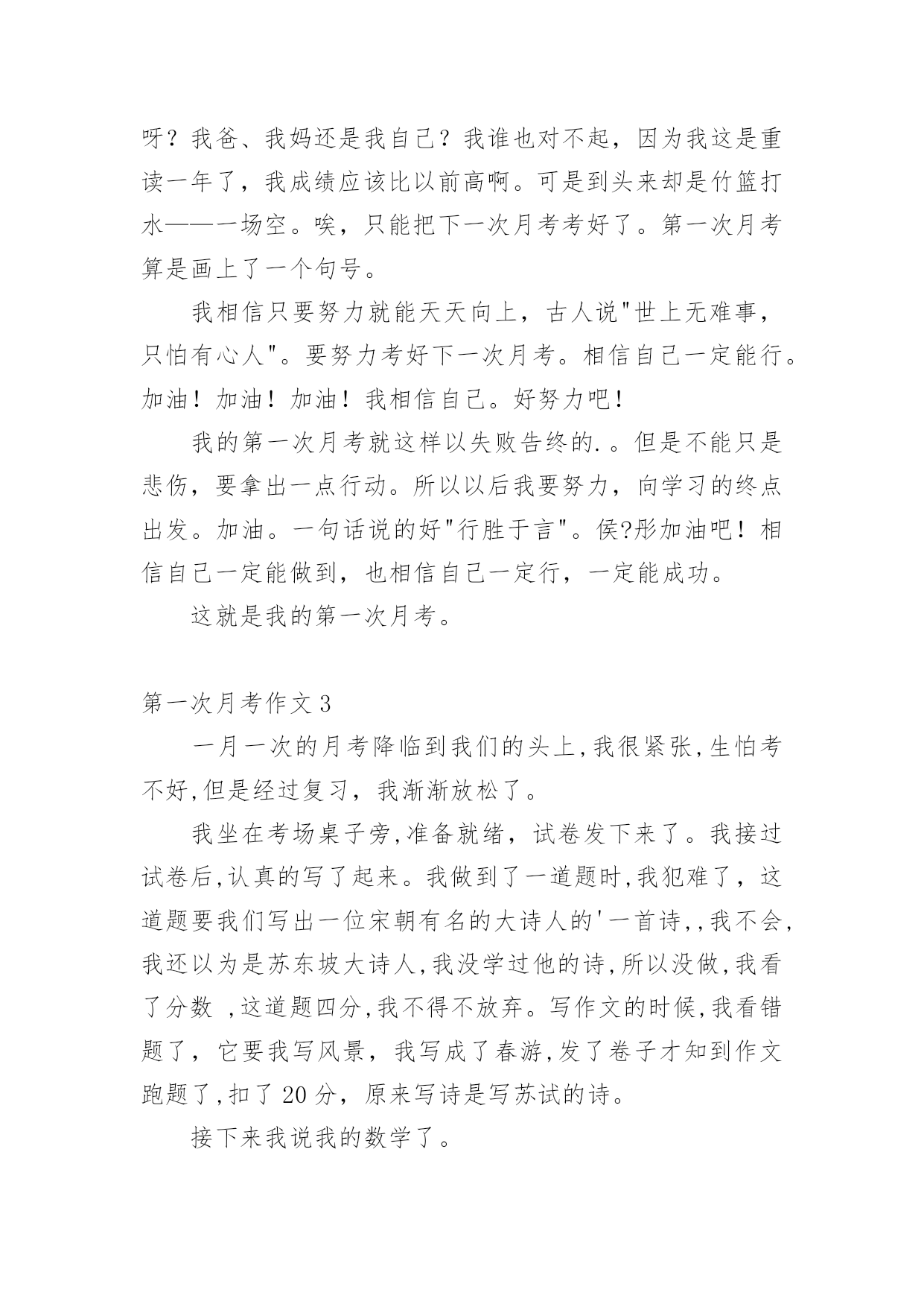 第一次月考作文 [精华]第一次月考作文在日复一日的学习、工作或生活中,许多人都有过写作文的经历,对作文都不陌生吧,写作文可以锻炼我们的独处习惯,让自己的心静下来,思考自己未来的方向。怎么写作文才能避免踩雷呢?下面是小编收集整理的第一次月考作文,欢迎大家分享。第一次月考作文1啊!第一次月考即将来临,“5555,不要啊。”这是差生们的呼救;“呵呵,又可以大显身手喽。”啊,好生们似乎很高兴啊。可考完了了呢??“考试结束,考试结束。”随着铃声,我们交卷了。“英国里去”(英语)好难啊。哎,肯定考不好,这不光是我的'感受,还是许多好生们的感受,(我都有十几题没做呢!)死定了。语文嘛,我考得一般般,没空题,不过作文写的不咋滴。啊!!!下午还要考数学,争取考到九十分以上。加油!第一次月考作文2盼望着,盼望着。我的第一次月考成绩终于下来了。语文九十五点五分,数学很遗憾是八十九分,英语一百零五分。全班排六十一名,共八十三人我排六十一。我对得起谁呀?我爸、我妈还是我自己?我谁也对不起,因为我这是重读一年了,我成绩应该比以前高啊。可是到头来却是竹篮打水——一场空。唉,只能把下一次月考考好了。第一次月考算是画上了一个句号。我相信只要努力就能天天向上,古人说"世上无难事,只怕有心人"。要努力考好下一次月考。相信自己一定能行。加油!加油!加油!我相信自己。好努力吧!我的第一次月考就这样以失败告终的.。但是不能只是悲伤,要拿出一点行动。所以以后我要努力,向学习的终点出发。加油。一句话说的好"行胜于言"。侯?彤加油吧!相信自己一定能做到,也相信自己一定行,一定能成功。这就是我的第一次月考。第一次月考作文3一月一次的月考降临到我们的头上,我很紧张,生怕考不好,但是经过复习,我渐渐放松了。我坐在考场桌子旁,准备就绪,试卷发下来了。我接过试卷后,认真的写了起来。我做到了一道题时,我犯难了,这道题要我们写出一位宋朝有名的大诗人的'一首诗,,我不会,我还以为是苏东坡大诗人,我没学过他的诗,所以没做,我看了分数,这道题四分,我不得不放弃。写作文的时候,我看错题了,它要我写风景,我写成了春游,发了卷子才知到作文跑题了,扣了20分,原来写诗是写苏试的诗。接下来我说我的数学了。一开始我兴冲冲地答题,中间的“拦路虎"都被我消灭了,做到应用题时我轻松地把题目给"干"掉了,试卷发下来,一看试卷就晃然大悟,我犯了一个严重的错物,竟然算错了三道,一道五分。语文六十点五,数学七十四,这是我一学期考得最差的一次,下一次一定要考好。第一次月考作文4今天我们月考了,考的语文和数学。语文的最后一题,数学的倒数第二题最后一问我都不会,其实呀,我从听到要月考的时候,就感到心里紧张,就像热锅上的蚂蚁。到考试的那一天,妈妈说:”紧张会引起粗心“。我就想些快乐的事就不紧张了,考试那一天我就不紧张了,因为我把我的秘诀装备都拿上了。你想知道我的秘诀是什么吗?那你就仔细的看哦!现在正式开始:考试秘诀:燕思睿考试秘诀法宝:修正带修正贴还有修正液,这三个法宝少不了,要是前面错了,后面没错怎么办?就用这三法宝中的一个。还有笔也少不了,要是没笔怎么办,写不了。其实上午考语文,数学,英语的。前两节课考的.是语文,第三节课考的是数学,最后一节课考英语。但英语却没考,后来我问老师才知道,要等上英语课的时候再考。这就是我月考的上午!第一次月考作文5第一次月考结束了,尽管我已经预料到学生的成绩,但是见到成绩后我仍是有些感触,我又想起课堂上我看到学生茫然的眼神时常常浮现在脑海中的一句话:任重而道远。这次考试一方面检测了学生的.基础知识,一方面考察了学生的。前者是死东西,因为我一向主张基础知识自主消化,所以对于我班的学生,这部分其实考察的是学生正确的学习态度和方法。这部分答的好有两种情况,一种是学生比较聪明,记忆力好,讲过的东西一遍过;另一种是比较用心,自主复习。而答的不好的多数还是依赖老师,不会自主复习。所以通过这次考试,学生应该认清自己的情况,在今后学习中及时调整。对于我来说,初一又是一个新的开始,我做好了从零开始的准备,针对学生这次考试的成绩,因材施教,让不同层次的学生都有所提高。第一次月考作文6今天,是我上六年级以来,第一次月考,老师说:“今天月考,是把你的才华展现给大家伙的机会,要把最好的一面展现给同学,给大家留下一个好印象。进入考场,我的心都提到了嗓子眼,心里像十五个吊桶—————七上八下。恐怕考不好成绩,试卷发到了手中,我首先写上姓名,于是,健笔如飞的写了起来。但是,好景不长,不一会,便杀出个程咬金来,难住了我,这道题让我百思不得其解,我急的抓耳挠腮,这时,我耳边想起了老师在考试以前的那句话来,遇到难题要沉着,冷静,我便认真的.思考起来,经过我的努力思考,程咬金被我解决了。月考终于考完了,我心里轻松了许多,考好考坏还要