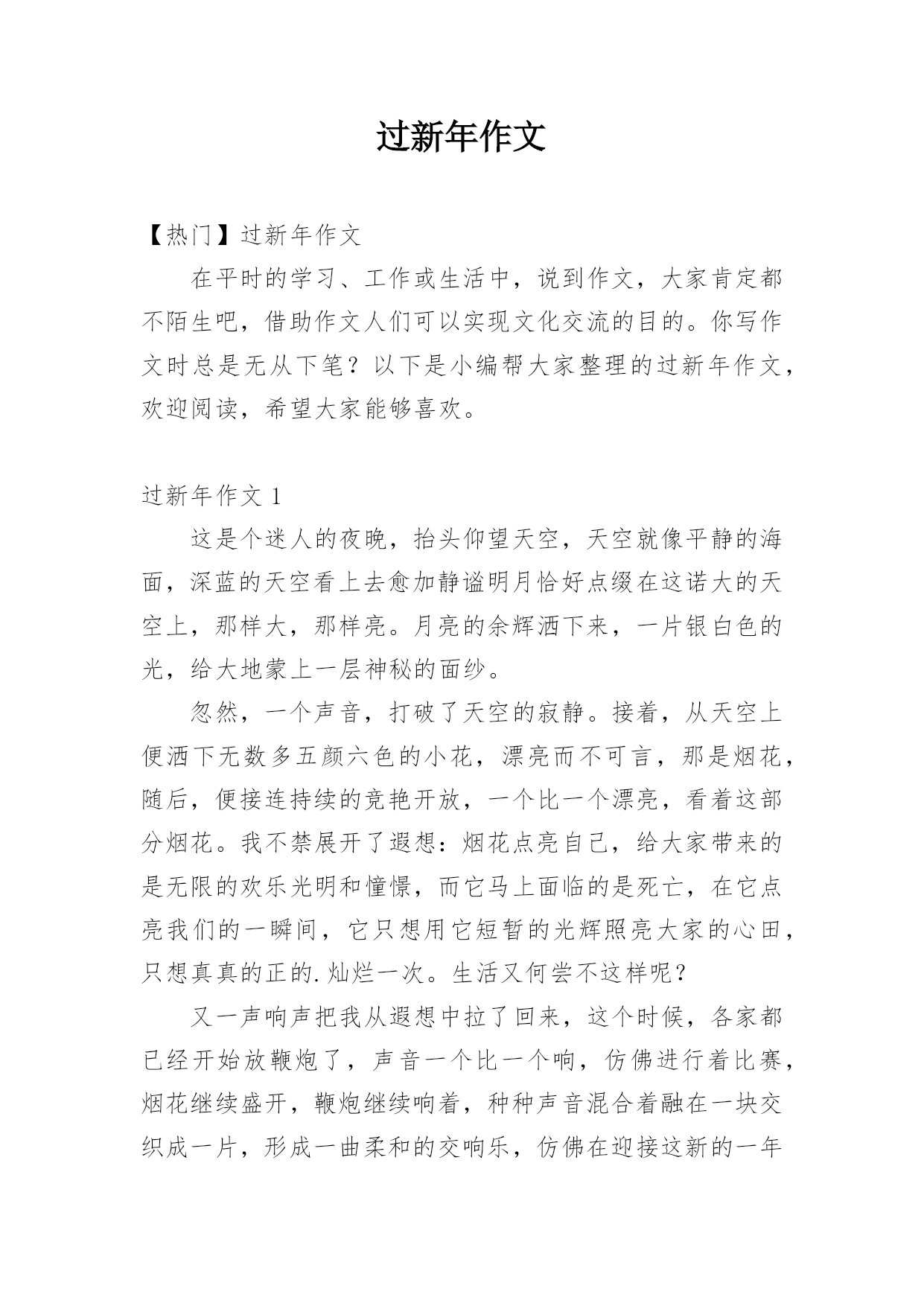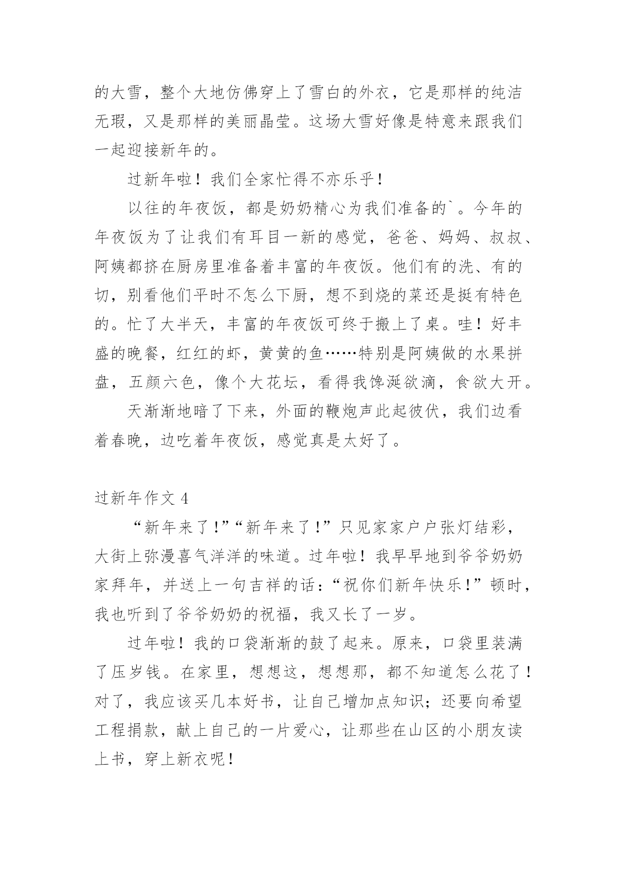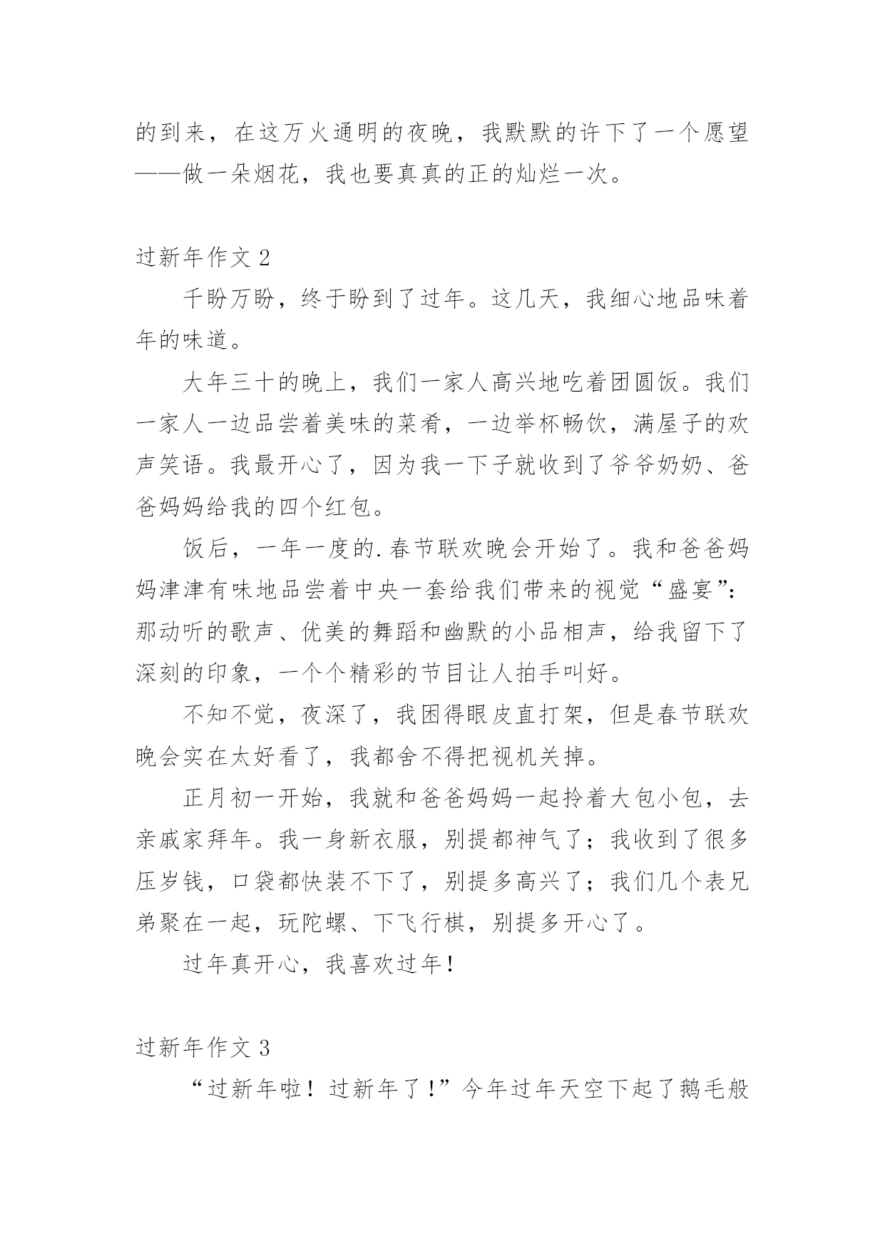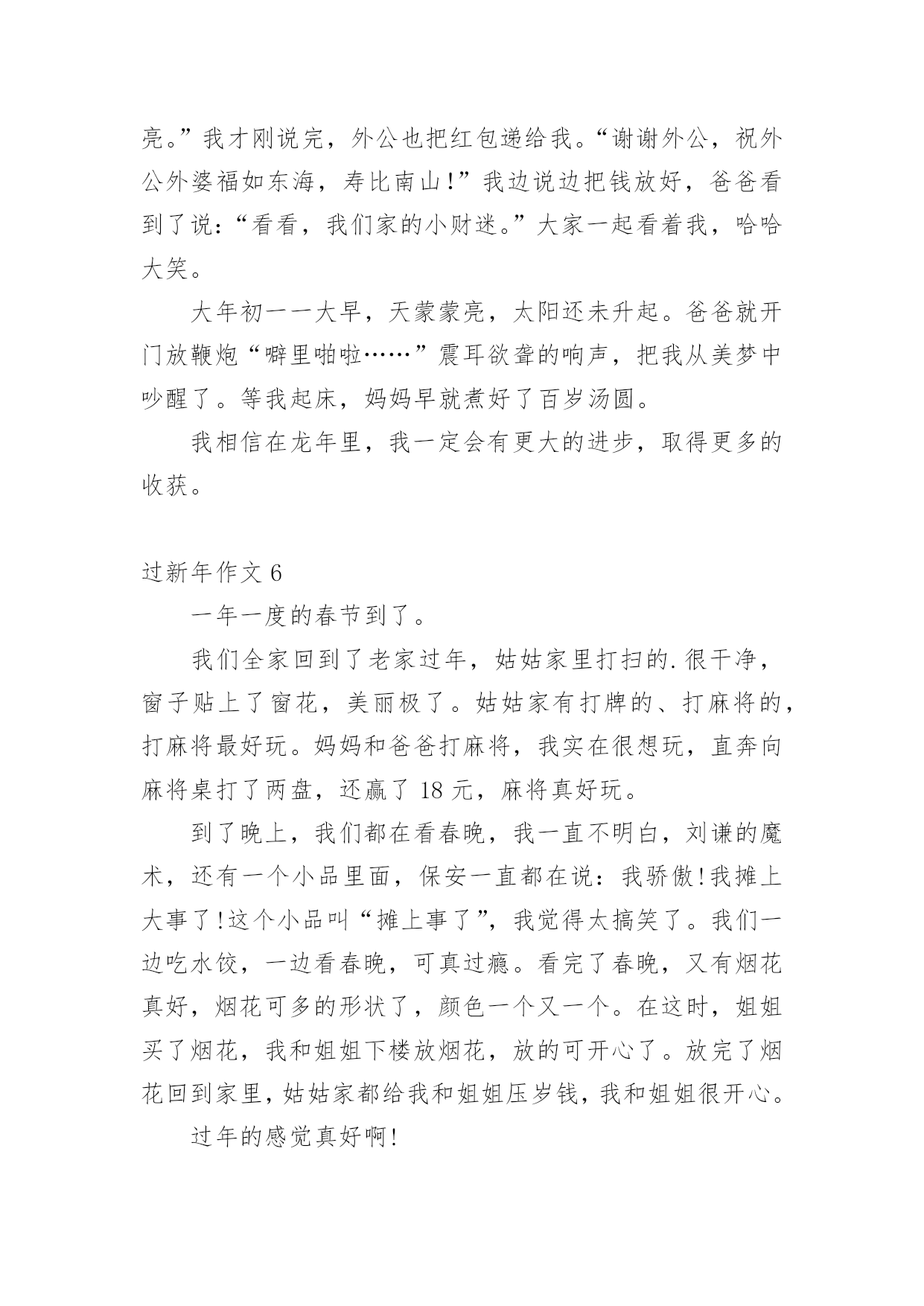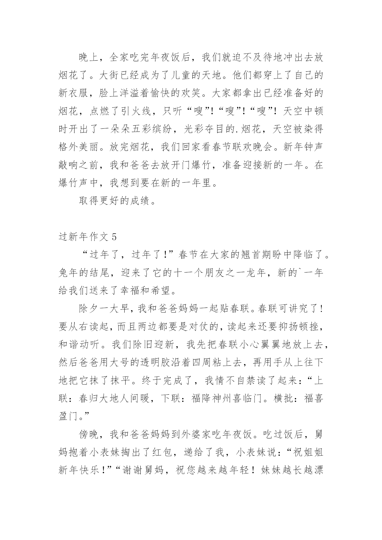 过新年作文 【热门】过新年作文在平时的学习、工作或生活中,说到作文,大家肯定都不陌生吧,借助作文人们可以实现文化交流的目的。你写作文时总是无从下笔?以下是小编帮大家整理的过新年作文,欢迎阅读,希望大家能够喜欢。过新年作文1这是个迷人的夜晚,抬头仰望天空,天空就像平静的海面,深蓝的天空看上去愈加静谧明月恰好点缀在这诺大的天空上,那样大,那样亮。月亮的余辉洒下来,一片银白色的光,给大地蒙上一层神秘的面纱。忽然,一个声音,打破了天空的寂静。接着,从天空上便洒下无数多五颜六色的小花,漂亮而不可言,那是烟花,随后,便接连持续的竞艳开放,一个比一个漂亮,看着这部分烟花。我不禁展开了遐想:烟花点亮自己,给大家带来的是无限的欢乐光明和憧憬,而它马上面临的是死亡,在它点亮我们的一瞬间,它只想用它短暂的光辉照亮大家的心田,只想真真的正的.灿烂一次。生活又何尝不这样呢?又一声响声把我从遐想中拉了回来,这个时候,各家都已经开始放鞭炮了,声音一个比一个响,仿佛进行着比赛,烟花继续盛开,鞭炮继续响着,种种声音混合着融在一块交织成一片,形成一曲柔和的交响乐,仿佛在迎接这新的一年的到来,在这万火通明的夜晚,我默默的许下了一个愿望——做一朵烟花,我也要真真的正的灿烂一次。过新年作文2千盼万盼,终于盼到了过年。这几天,我细心地品味着年的味道。大年三十的晚上,我们一家人高兴地吃着团圆饭。我们一家人一边品尝着美味的菜肴,一边举杯畅饮,满屋子的欢声笑语。我最开心了,因为我一下子就收到了爷爷奶奶、爸爸妈妈给我的四个红包。饭后,一年一度的.春节联欢晚会开始了。我和爸爸妈妈津津有味地品尝着中央一套给我们带来的视觉“盛宴”:那动听的歌声、优美的舞蹈和幽默的小品相声,给我留下了深刻的印象,一个个精彩的节目让人拍手叫好。不知不觉,夜深了,我困得眼皮直打架,但是春节联欢晚会实在太好看了,我都舍不得把视机关掉。正月初一开始,我就和爸爸妈妈一起拎着大包小包,去亲戚家拜年。我一身新衣服,别提都神气了;我收到了很多压岁钱,口袋都快装不下了,别提多高兴了;我们几个表兄弟聚在一起,玩陀螺、下飞行棋,别提多开心了。过年真开心,我喜欢过年!过新年作文3“过新年啦!过新年了!”今年过年天空下起了鹅毛般的大雪,整个大地仿佛穿上了雪白的外衣,它是那样的纯洁无瑕,又是那样的美丽晶莹。这场大雪好像是特意来跟我们一起迎接新年的。过新年啦!我们全家忙得不亦乐乎!以往的年夜饭,都是奶奶精心为我们准备的`。今年的年夜饭为了让我们有耳目一新的感觉,爸爸、妈妈、叔叔、阿姨都挤在厨房里准备着丰富的年夜饭。他们有的洗、有的切,别看他们平时不怎么下厨,想不到烧的菜还是挺有特色的。忙了大半天,丰富的年夜饭可终于搬上了桌。哇!好丰盛的晚餐,红红的虾,黄黄的鱼……特别是阿姨做的水果拼盘,五颜六色,像个大花坛,看得我馋涎欲滴,食欲大开。天渐渐地暗了下来,外面的鞭炮声此起彼伏,我们边看着春晚,边吃着年夜饭,感觉真是太好了。过新年作文4“新年来了!”“新年来了!”只见家家户户张灯结彩,大街上弥漫喜气洋洋的味道。过年啦!我早早地到爷爷奶奶家拜年,并送上一句吉祥的话:“祝你们新年快乐!”顿时,我也听到了爷爷奶奶的祝福,我又长了一岁。过年啦!我的口袋渐渐的鼓了起来。原来,口袋里装满了压岁钱。在家里,想想这,想想那,都不知道怎么花了!对了,我应该买几本好书,让自己增加点知识;还要向希望工程捐款,献上自己的一片爱心,让那些在山区的小朋友读上书,穿上新衣呢!晚上,全家吃完年夜饭后,我们就迫不及待地冲出去放烟花了。大街已经成为了儿童的天地。他们都穿上了自己的新衣服,脸上洋溢着愉快的欢笑。大家都拿出已经准备好的烟花,点燃了引火线,只听“嗖”!“嗖”!“嗖”!天空中顿时开出了一朵朵五彩缤纷,光彩夺目的.烟花,天空被染得格外美丽。放完烟花,我们回家看春节联欢晚会。新年钟声敲响之前,我和爸爸去放开门爆竹,准备迎接新的一年。在爆竹声中,我想到要在新的一年里。取得更好的成绩。过新年作文5“过年了,过年了!”春节在大家的翘首期盼中降临了。兔年的结尾,迎来了它的十一个朋友之一龙年,新的`一年给我们送来了幸福和希望。除夕一大早,我和爸爸妈妈一起贴春联。春联可讲究了!要从右读起,而且两边都要是对仗的,读起来还要抑扬顿挫,和谐动听。我们除旧迎新,我先把春联小心翼翼地放上去,然后爸爸用大号的透明胶沿着四周粘上去,再用手从上往下地把它抹了抹平。终于完成了,我情不自禁读了起来:“上联:春归大地人间暖,下联:福降神州喜临门。横批:福喜盈门。”傍晚,我和爸爸妈妈到外婆家吃年夜饭。吃过饭后,舅妈抱着小表妹掏出了红包,递给了我,小表妹说:“祝姐姐新年快乐!”“谢谢舅妈,祝您越来越年轻!妹妹越长越漂亮。”我才刚说完,外公也把红包递给我。“谢谢外公,祝外公外婆福如东海,寿比南山!”我边说