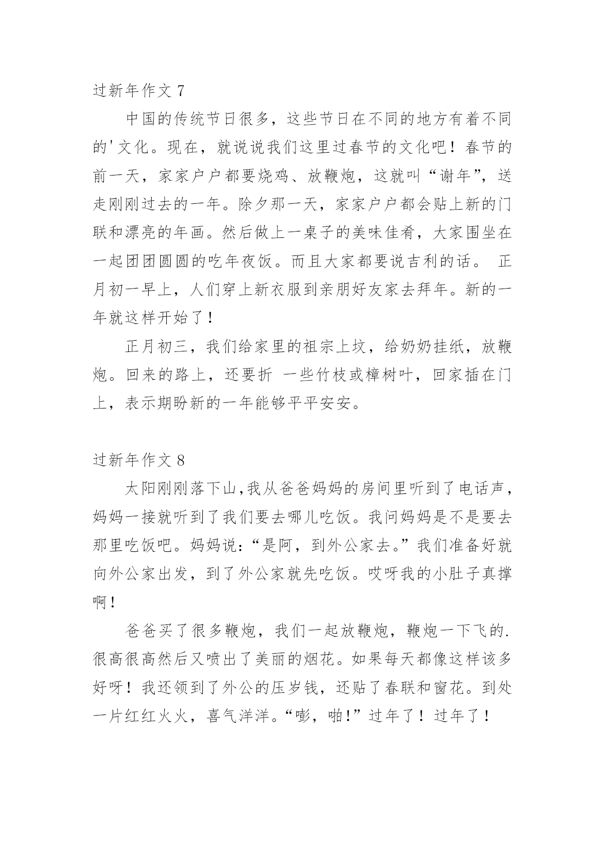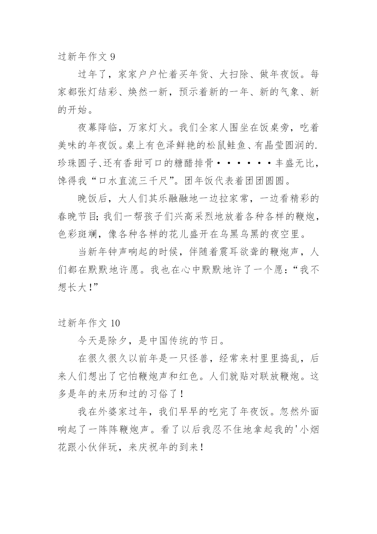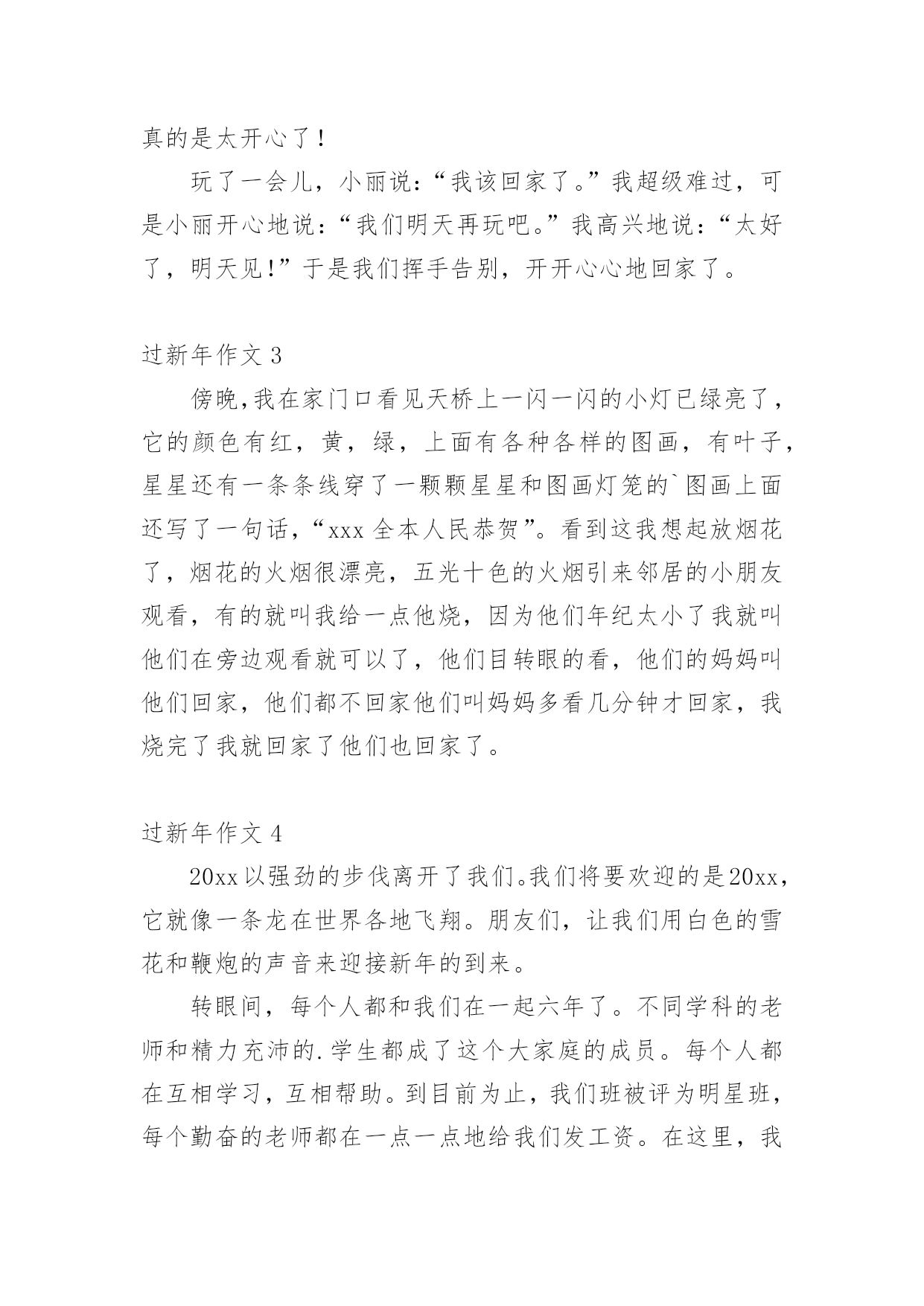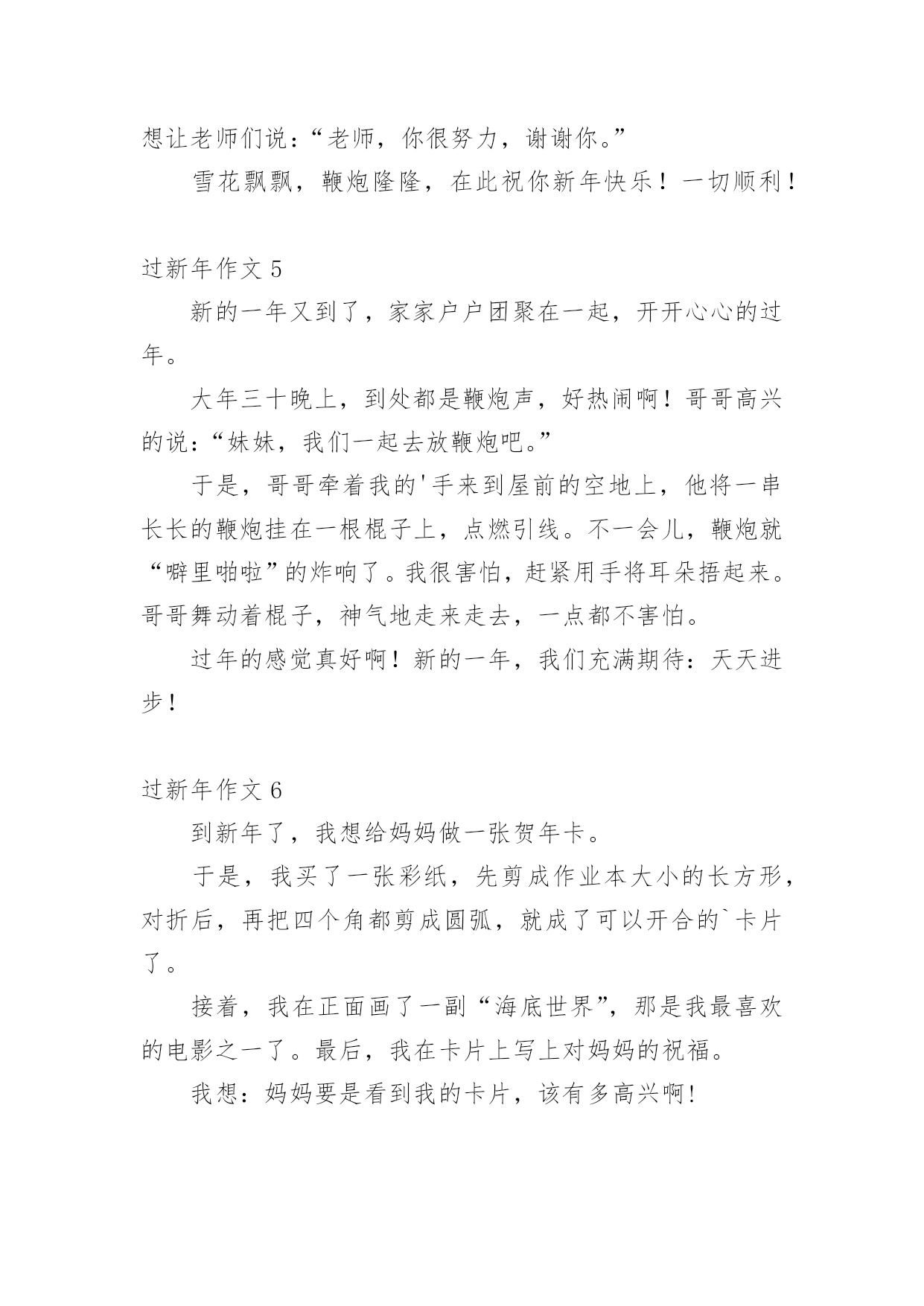 过新年作文 (精)过新年作文在学习、工作乃至生活中,大家都尝试过写作文吧,作文一定要做到主题集中,围绕同一主题作深入阐述,切忌东拉西扯,主题涣散甚至无主题。你写作文时总是无从下笔?下面是小编帮大家整理的过新年作文,欢迎大家借鉴与参考,希望对大家有所帮助。过新年作文1小朋友们盼望已久的新年终于到来了。窗外大雪纷飞。吃完年夜饭,霏霏和弟弟一起来到院子里放鞭炮。弟弟点燃了导火线,只听“啪啪”几声后,一条火龙从炮筒里钻出,直飞冲天,然后在天空中炸裂开来,像天女散花,又像一个花仙子舞动着……五颜六色的烟花点亮了夜空,霏霏和弟弟开心得跳了起来。“爆竹声中一岁除”,又是新的.一年,祝大家快乐开心每一天!过新年作文2不知不觉中,盼望已久的'新年来到了,一走出去就能听见噼噼啪啪放鞭炮的声音,热闹极了。我和好朋友小丽一起出去放鞭炮,鞭炮炸裂的声音震耳欲聋,小丽吓得赶紧捂住耳朵,但是,我们都觉得好刺激,真的是太开心了!玩了一会儿,小丽说:“我该回家了。”我超级难过,可是小丽开心地说:“我们明天再玩吧。”我高兴地说:“太好了,明天见!”于是我们挥手告别,开开心心地回家了。过新年作文3傍晚,我在家门口看见天桥上一闪一闪的小灯已绿亮了,它的颜色有红,黄,绿,上面有各种各样的图画,有叶子,星星还有一条条线穿了一颗颗星星和图画灯笼的`图画上面还写了一句话,“xxx全本人民恭贺”。看到这我想起放烟花了,烟花的火烟很漂亮,五光十色的火烟引来邻居的小朋友观看,有的就叫我给一点他烧,因为他们年纪太小了我就叫他们在旁边观看就可以了,他们目转眼的看,他们的妈妈叫他们回家,他们都不回家他们叫妈妈多看几分钟才回家,我烧完了我就回家了他们也回家了。过新年作文420xx以强劲的步伐离开了我们。我们将要欢迎的是20xx,它就像一条龙在世界各地飞翔。朋友们,让我们用白色的雪花和鞭炮的声音来迎接新年的到来。转眼间,每个人都和我们在一起六年了。不同学科的老师和精力充沛的.学生都成了这个大家庭的成员。每个人都在互相学习,互相帮助。到目前为止,我们班被评为明星班,每个勤奋的老师都在一点一点地给我们发工资。在这里,我想让老师们说:“老师,你很努力,谢谢你。”雪花飘飘,鞭炮隆隆,在此祝你新年快乐!一切顺利!过新年作文5新的一年又到了,家家户户团聚在一起,开开心心的过年。大年三十晚上,到处都是鞭炮声,好热闹啊!哥哥高兴的说:“妹妹,我们一起去放鞭炮吧。”于是,哥哥牵着我的'手来到屋前的空地上,他将一串长长的鞭炮挂在一根棍子上,点燃引线。不一会儿,鞭炮就“噼里啪啦”的炸响了。我很害怕,赶紧用手将耳朵捂起来。哥哥舞动着棍子,神气地走来走去,一点都不害怕。过年的感觉真好啊!新的一年,我们充满期待:天天进步!过新年作文6到新年了,我想给妈妈做一张贺年卡。于是,我买了一张彩纸,先剪成作业本大小的长方形,对折后,再把四个角都剪成圆弧,就成了可以开合的`卡片了。接着,我在正面画了一副“海底世界”,那是我最喜欢的电影之一了。最后,我在卡片上写上对妈妈的祝福。我想:妈妈要是看到我的卡片,该有多高兴啊!过新年作文7中国的传统节日很多,这些节日在不同的地方有着不同的'文化。现在,就说说我们这里过春节的文化吧!春节的前一天,家家户户都要烧鸡、放鞭炮,这就叫“谢年”,送走刚刚过去的一年。除夕那一天,家家户户都会贴上新的门联和漂亮的年画。然后做上一桌子的美味佳肴,大家围坐在一起团团圆圆的吃年夜饭。而且大家都要说吉利的话。正月初一早上,人们穿上新衣服到亲朋好友家去拜年。新的一年就这样开始了!正月初三,我们给家里的祖宗上坟,给奶奶挂纸,放鞭炮。回来的路上,还要折一些竹枝或樟树叶,回家插在门上,表示期盼新的一年能够平平安安。过新年作文8太阳刚刚落下山,我从爸爸妈妈的房间里听到了电话声,妈妈一接就听到了我们要去哪儿吃饭。我问妈妈是不是要去那里吃饭吧。妈妈说:“是阿,到外公家去。”我们准备好就向外公家出发,到了外公家就先吃饭。哎呀我的小肚子真撑啊!爸爸买了很多鞭炮,我们一起放鞭炮,鞭炮一下飞的.很高很高然后又喷出了美丽的烟花。如果每天都像这样该多好呀!我还领到了外公的压岁钱,还贴了春联和窗花。到处一片红红火火,喜气洋洋。“嘭,啪!”过年了!过年了!过新年作文9过年了,家家户户忙着买年货、大扫除、做年夜饭。每家都张灯结彩、焕然一新,预示着新的一年、新的气象、新的开始。夜幕降临,万家灯火。我们全家人围坐在饭桌旁,吃着美味的年夜饭。桌上有色泽鲜艳的松鼠鲑鱼、有晶莹圆润的.珍珠圆子、还有香甜可口的糖醋排骨······丰盛无比,馋得我“口水直流三千尺”。团年饭代表着团团圆圆。晚饭后,大人们其乐融融地一边拉家常,一边看精彩的春晚节目;我们一帮孩子们兴高采烈地放着各种各样的鞭炮,色彩斑斓,像各种各样的花儿盛开在乌黑乌黑的夜空里。当新年钟声响起的