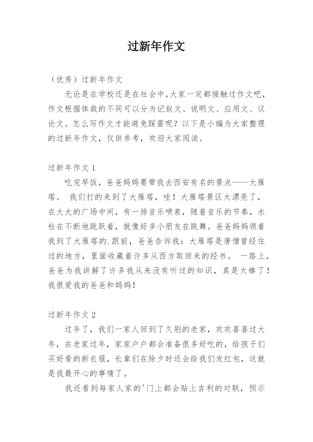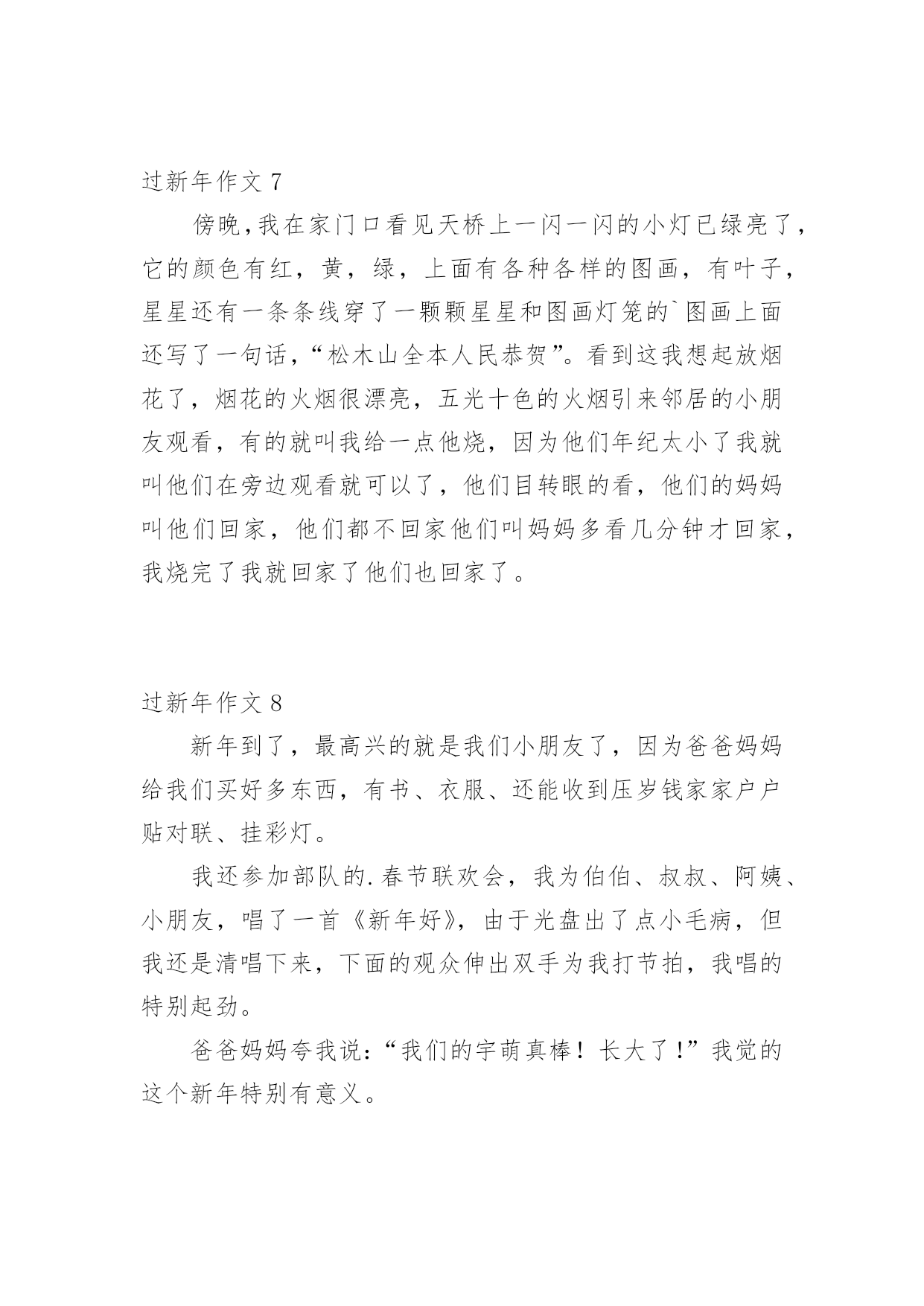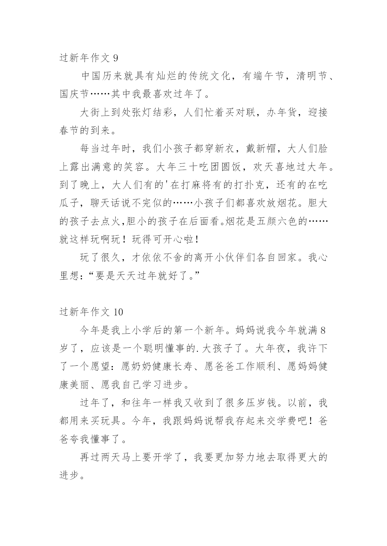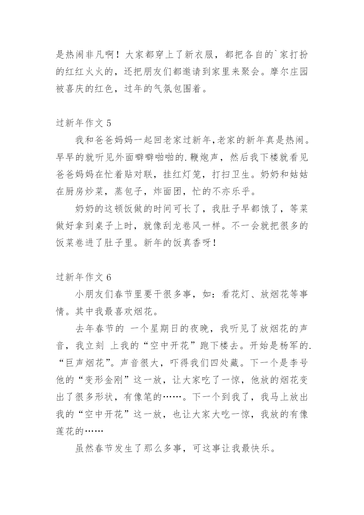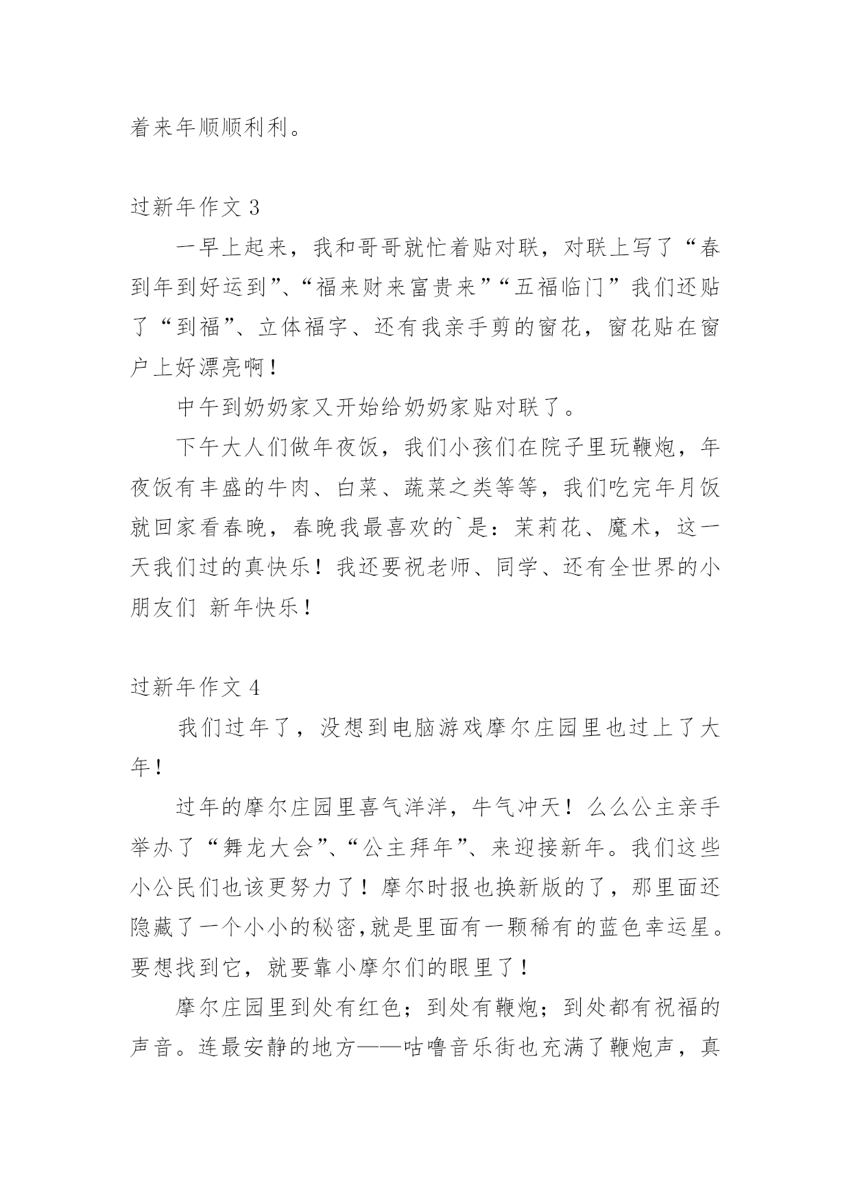 过新年作文 (优秀)过新年作文无论是在学校还是在社会中,大家一定都接触过作文吧,作文根据体裁的不同可以分为记叙文、说明文、应用文、议论文。怎么写作文才能避免踩雷呢?以下是小编为大家整理的过新年作文,仅供参考,欢迎大家阅读。过新年作文1吃完早饭,爸爸妈妈要带我去西安有名的景点——大雁塔。我们打的来到了大雁塔,哇!大雁塔景区太漂亮了,在大大的广场中间,有一排音乐喷泉,随着音乐的节奏,水柱在不断地跳跃着,就像好多小朋友在跳舞。爸爸妈妈领着我到了大雁塔的.跟前,爸爸告诉我:大雁塔是唐僧曾经住过的地方,里面收藏着许多从西方取回来的经书。一路上,爸爸为我讲解了许多我从来没有听过的知识,真是太棒了!我很爱我的爸爸和妈妈!过新年作文2过年了,我们一家人回到了久别的老家,欢欢喜喜过大年,在老家过年,家家户户都会准备很多好吃的,给孩子们买好看的新衣服,长辈们在除夕时还会给我们发红包,这就是我最开心的事情了。我还看到每家人家的'门上都会贴上吉利的对联,预示着来年顺顺利利。过新年作文3一早上起来,我和哥哥就忙着贴对联,对联上写了“春到年到好运到”、“福来财来富贵来”“五福临门”我们还贴了“到福”、立体福字、还有我亲手剪的窗花,窗花贴在窗户上好漂亮啊!中午到奶奶家又开始给奶奶家贴对联了。下午大人们做年夜饭,我们小孩们在院子里玩鞭炮,年夜饭有丰盛的牛肉、白菜、蔬菜之类等等,我们吃完年月饭就回家看春晚,春晚我最喜欢的`是:茉莉花、魔术,这一天我们过的真快乐!我还要祝老师、同学、还有全世界的小朋友们新年快乐!过新年作文4我们过年了,没想到电脑游戏摩尔庄园里也过上了大年!过年的摩尔庄园里喜气洋洋,牛气冲天!么么公主亲手举办了“舞龙大会”、“公主拜年”、来迎接新年。我们这些小公民们也该更努力了!摩尔时报也换新版的了,那里面还隐藏了一个小小的秘密,就是里面有一颗稀有的蓝色幸运星。要想找到它,就要靠小摩尔们的眼里了!摩尔庄园里到处有红色;到处有鞭炮;到处都有祝福的声音。连最安静的地方——咕噜音乐街也充满了鞭炮声,真是热闹非凡啊!大家都穿上了新衣服,都把各自的`家打扮的红红火火的,还把朋友们都邀请到家里来聚会。摩尔庄园被喜庆的红色,过年的气氛包围着。过新年作文5我和爸爸妈妈一起回老家过新年,老家的新年真是热闹。早早的就听见外面噼噼啪啪的.鞭炮声,然后我下楼就看见爸爸妈妈在忙着贴对联,挂红灯笼,打扫卫生。奶奶和姑姑在厨房炒菜,蒸包子,炸面团,忙的不亦乐乎。奶奶的这顿饭做的时间可长了,我肚子早都饿了,等菜做好拿到桌子上时,就像刮龙卷风一样。不一会就把很多的饭菜卷进了肚子里。新年的饭真香呀!过新年作文6小朋友们春节里要干很多事,如:看花灯、放烟花等事情。其中我最喜欢烟花。去年春节的一个星期日的夜晚,我听见了放烟花的声音,我立刻上我的“空中开花”跑下楼去。开始是杨军的.“巨声烟花”。声音很大,吓得我们四处藏。下一个是李号他的“变形金刚”这一放,让大家吃了一惊,他放的烟花变出了很多形状,有像笔的……。下一个到我了,我马上放出我的“空中开花”这一放,也让大家大吃一惊,我放的有像莲花的……虽然春节发生了那么多事,可这事让我最快乐。过新年作文7傍晚,我在家门口看见天桥上一闪一闪的小灯已绿亮了,它的颜色有红,黄,绿,上面有各种各样的图画,有叶子,星星还有一条条线穿了一颗颗星星和图画灯笼的`图画上面还写了一句话,“松木山全本人民恭贺”。看到这我想起放烟花了,烟花的火烟很漂亮,五光十色的火烟引来邻居的小朋友观看,有的就叫我给一点他烧,因为他们年纪太小了我就叫他们在旁边观看就可以了,他们目转眼的看,他们的妈妈叫他们回家,他们都不回家他们叫妈妈多看几分钟才回家,我烧完了我就回家了他们也回家了。过新年作文8新年到了,最高兴的就是我们小朋友了,因为爸爸妈妈给我们买好多东西,有书、衣服、还能收到压岁钱家家户户贴对联、挂彩灯。我还参加部队的.春节联欢会,我为伯伯、叔叔、阿姨、小朋友,唱了一首《新年好》,由于光盘出了点小毛病,但我还是清唱下来,下面的观众伸出双手为我打节拍,我唱的特别起劲。爸爸妈妈夸我说:“我们的宇萌真棒!长大了!”我觉的这个新年特别有意义。过新年作文9中国历来就具有灿烂的传统文化,有端午节,清明节、国庆节……其中我最喜欢过年了。大街上到处张灯结彩,人们忙着买对联,办年货,迎接春节的到来。每当过年时,我们小孩子都穿新衣,戴新帽,大人们脸上露出满意的笑容。大年三十吃团圆饭,欢天喜地过大年。到了晚上,大人们有的'在打麻将有的打扑克,还有的在吃瓜子,聊天话说不完似的……小孩子们都喜欢放烟花。胆大的孩子去点火,胆小的孩子在后面看。烟花是五颜六色的……就这样玩啊玩!玩得可开心啦!玩了很久,才依依不舍的离开小伙伴们各自回家。我心里想:“要是天天过年就好了。”过新年作文10今年是我上小学后的第一个新