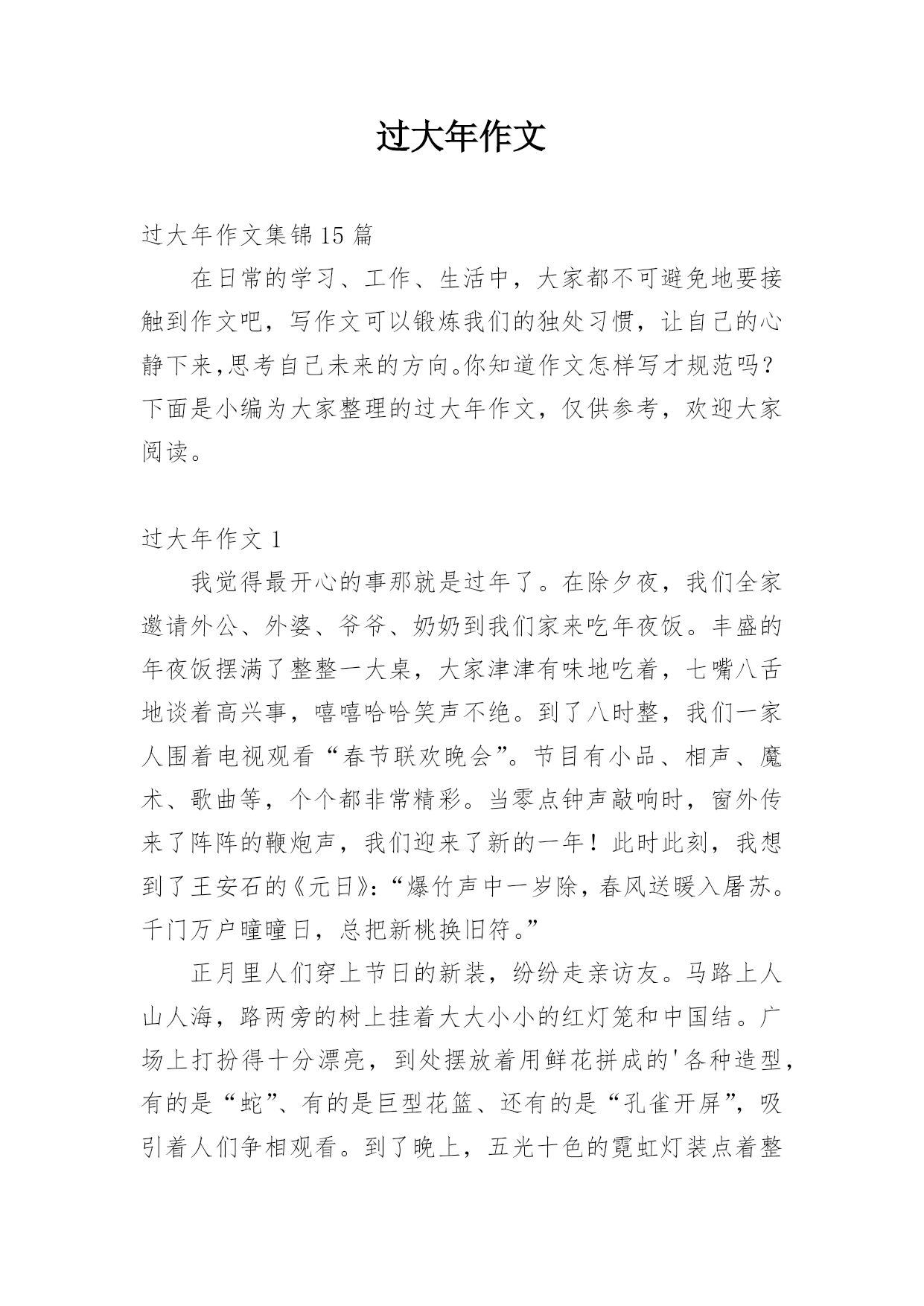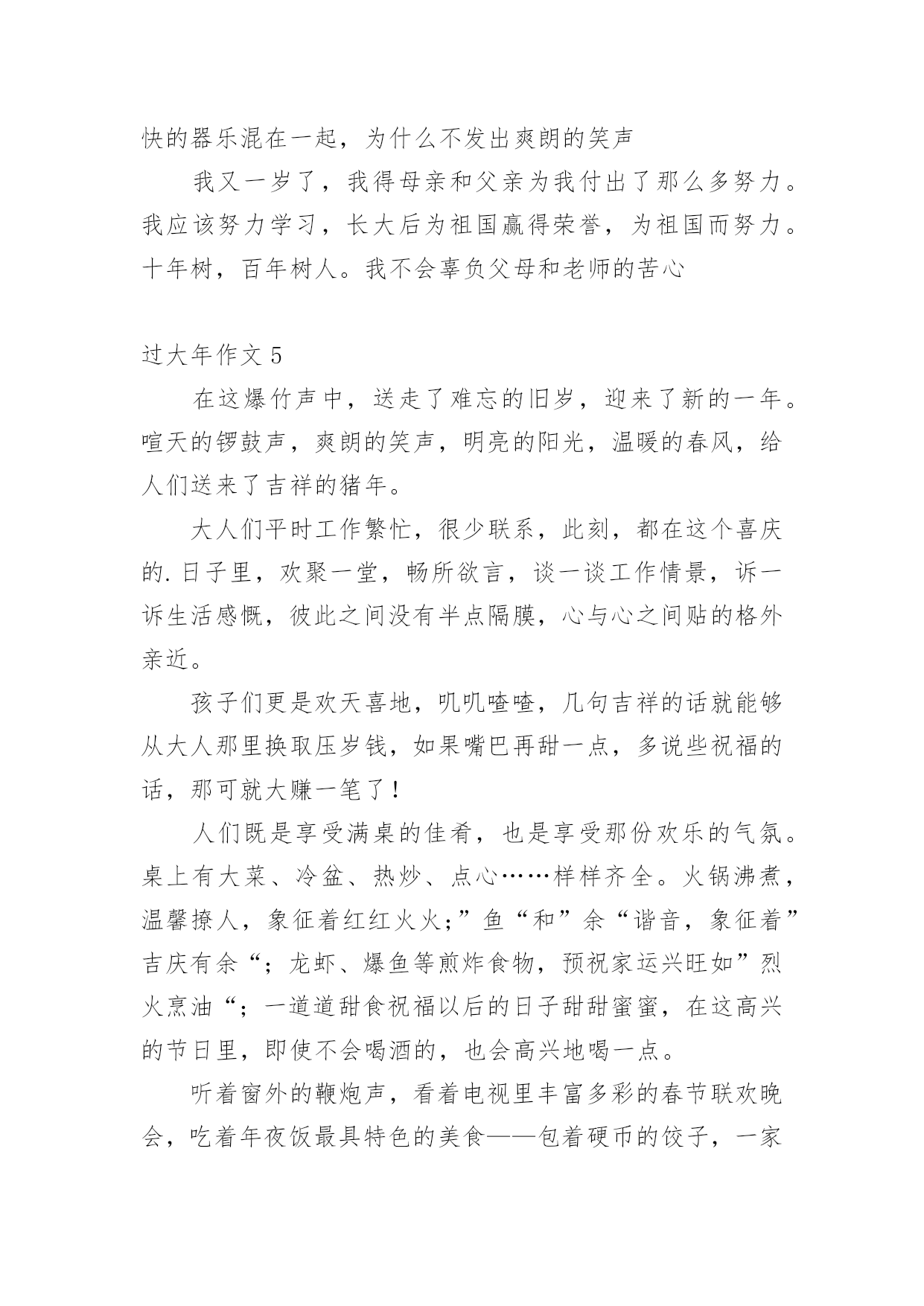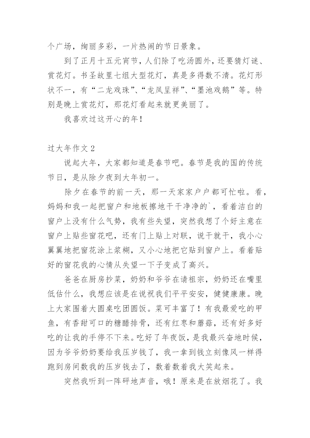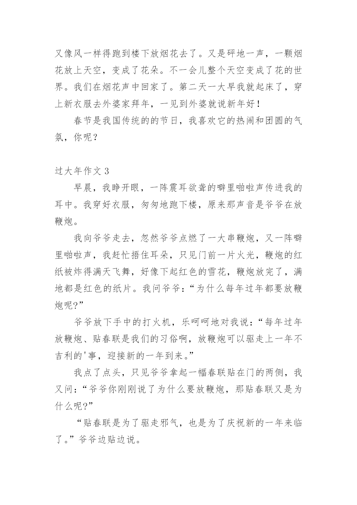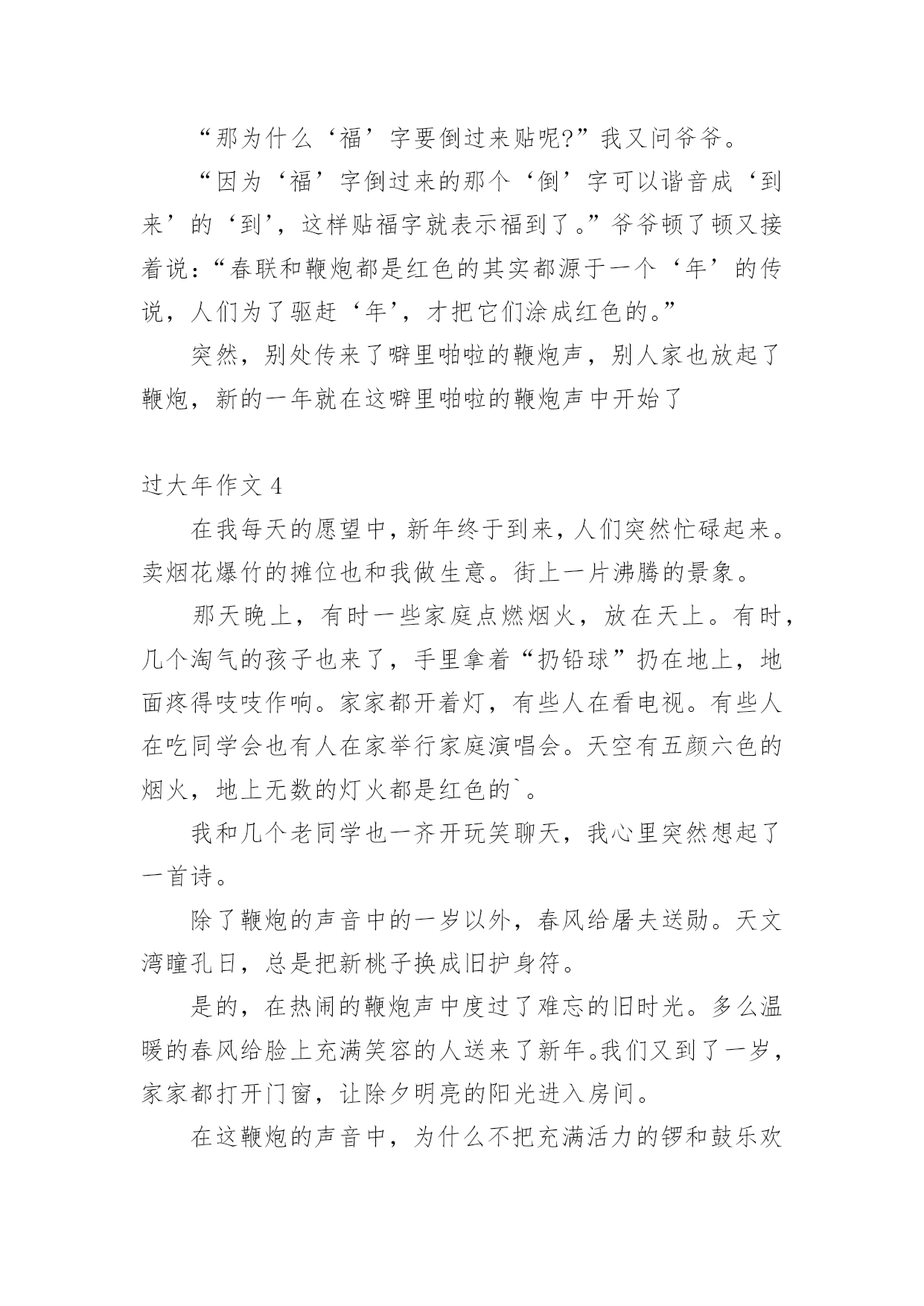 过大年作文 过大年作文集锦15篇在日常的学习、工作、生活中,大家都不可避免地要接触到作文吧,写作文可以锻炼我们的独处习惯,让自己的心静下来,思考自己未来的方向。你知道作文怎样写才规范吗?下面是小编为大家整理的过大年作文,仅供参考,欢迎大家阅读。过大年作文1我觉得最开心的事那就是过年了。在除夕夜,我们全家邀请外公、外婆、爷爷、奶奶到我们家来吃年夜饭。丰盛的年夜饭摆满了整整一大桌,大家津津有味地吃着,七嘴八舌地谈着高兴事,嘻嘻哈哈笑声不绝。到了八时整,我们一家人围着电视观看“春节联欢晚会”。节目有小品、相声、魔术、歌曲等,个个都非常精彩。当零点钟声敲响时,窗外传来了阵阵的鞭炮声,我们迎来了新的一年!此时此刻,我想到了王安石的《元日》:“爆竹声中一岁除,春风送暖入屠苏。千门万户曈曈日,总把新桃换旧符。”正月里人们穿上节日的新装,纷纷走亲访友。马路上人山人海,路两旁的树上挂着大大小小的红灯笼和中国结。广场上打扮得十分漂亮,到处摆放着用鲜花拼成的'各种造型,有的是“蛇”、有的是巨型花篮、还有的是“孔雀开屏”,吸引着人们争相观看。到了晚上,五光十色的霓虹灯装点着整个广场,绚丽多彩,一片热闹的节日景象。到了正月十五元宵节,人们除了吃汤圆外,还要猜灯谜、赏花灯。书圣故里七组大型花灯,真是多得数不清。花灯形状不一,有“二龙戏珠”、“龙凤呈祥”、“墨池戏鹅”等。特别是晚上赏花灯,那花灯看起来就更美丽了。我喜欢过这开心的年!过大年作文2说起大年,大家都知道是春节吧。春节是我的国的传统节日,是从除夕夜到大年初一。除夕在春节的前一天,那一天家家户户都可忙啦。看,妈妈和我一起把窗户和地板擦地干干净净的`,看着洁白的窗户上没有什么气势,我有些失望,突然我想了个好主意在窗户上贴些窗花吧,还有门上贴上对联,说干就干,我小心翼翼地把窗花涂上浆糊,又小心地把它贴到窗户上。看着贴好的窗花我的心情从失望一下子变成了高兴。爸爸在厨房抄菜,奶奶和爷爷在请祖宗,奶奶还在嘴里低估什么,我想应该是在说祝我们平平安安,健健康康。晚上大家围着大圆桌吃团圆饭。菜可丰富了!有我最爱吃的甲鱼,有香甜可口的糖醋排骨,还有红枣和蘑菇,还有好多好吃的让我的手停不下来。吃好了年夜饭,是我最兴奋地时候,因为爷爷奶奶要给我压岁钱了,我一拿到钱立刻像风一样得跑到房间数我的压岁钱去了,数着数着我大笑起来。突然我听到一阵砰地声音,哦!原来是在放烟花了。我又像风一样得跑到楼下放烟花去了。又是砰地一声,一颗烟花放上天空,变成了花朵。不一会儿整个天空变成了花的世界。我们在烟花声中回家了。第二天一大早我就起床了,穿上新衣服去外婆家拜年,一见到外婆就说新年好!春节是我国传统的的节日,我喜欢它的热闹和团圆的气氛,你呢?过大年作文3早晨,我睁开眼,一阵震耳欲聋的噼里啪啦声传进我的耳中。我穿好衣服,匆匆地跑下楼,原来那声音是爷爷在放鞭炮。我向爷爷走去,忽然爷爷点燃了一大串鞭炮,又一阵噼里啪啦声,我赶忙捂住耳朵,只见门前一片火光,鞭炮的红纸被炸得满天飞舞,好像下起红色的雪花,鞭炮放完了,满地都是红色的纸片。我问爷爷:“为什么每年过年都要放鞭炮呢?”爷爷放下手中的打火机,乐呵呵地对我说:“每年过年放鞭炮、贴春联是我们的习俗啊,放鞭炮可以驱走上一年不吉利的'事,迎接新的一年到来。”我点了点头,只见爷爷拿起一幅春联贴在门的两侧,我又问:“爷爷你刚刚说了为什么要放鞭炮,那贴春联又是为什么呢?”“贴春联是为了驱走邪气,也是为了庆祝新的一年来临了。”爷爷边贴边说。“那为什么‘福’字要倒过来贴呢?”我又问爷爷。“因为‘福’字倒过来的那个‘倒’字可以谐音成‘到来’的‘到’,这样贴福字就表示福到了。”爷爷顿了顿又接着说:“春联和鞭炮都是红色的其实都源于一个‘年’的传说,人们为了驱赶‘年’,才把它们涂成红色的。”突然,别处传来了噼里啪啦的鞭炮声,别人家也放起了鞭炮,新的一年就在这噼里啪啦的鞭炮声中开始了过大年作文4在我每天的愿望中,新年终于到来,人们突然忙碌起来。卖烟花爆竹的摊位也和我做生意。街上一片沸腾的景象。那天晚上,有时一些家庭点燃烟火,放在天上。有时,几个淘气的孩子也来了,手里拿着“扔铅球”扔在地上,地面疼得吱吱作响。家家都开着灯,有些人在看电视。有些人在吃同学会也有人在家举行家庭演唱会。天空有五颜六色的烟火,地上无数的灯火都是红色的`。我和几个老同学也一齐开玩笑聊天,我心里突然想起了一首诗。除了鞭炮的声音中的一岁以外,春风给屠夫送勋。天文湾瞳孔日,总是把新桃子换成旧护身符。是的,在热闹的鞭炮声中度过了难忘的旧时光。多么温暖的春风给脸上充满笑容的人送来了新年。我们又到了一岁,家家都打开门窗,让除夕明亮的阳光进入房间。在这鞭炮的声音中,为什么不把充满活力的锣和鼓乐欢快的器乐混在一起,为什么不发出爽朗的笑声我又一岁了,我得母亲和父亲为我