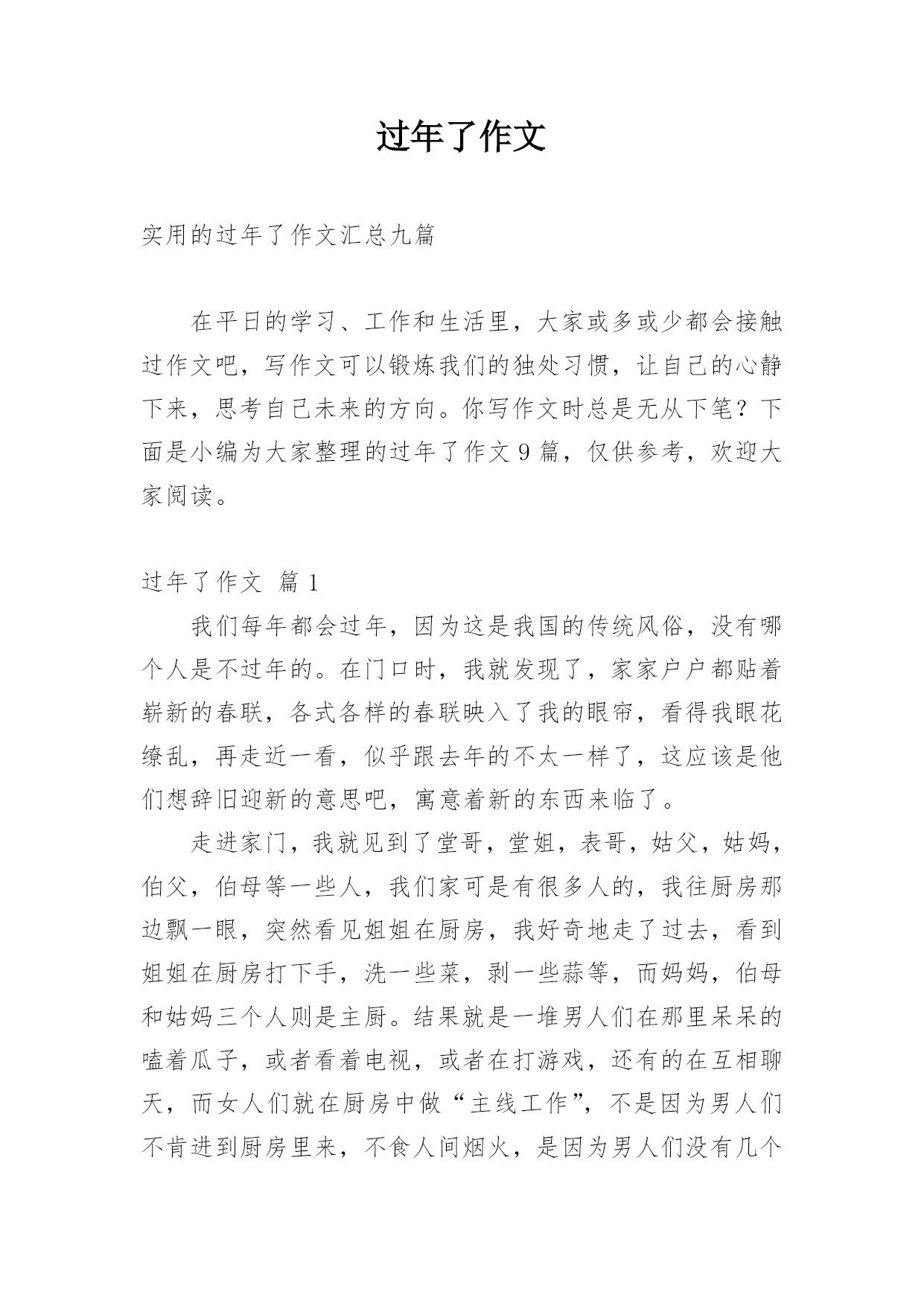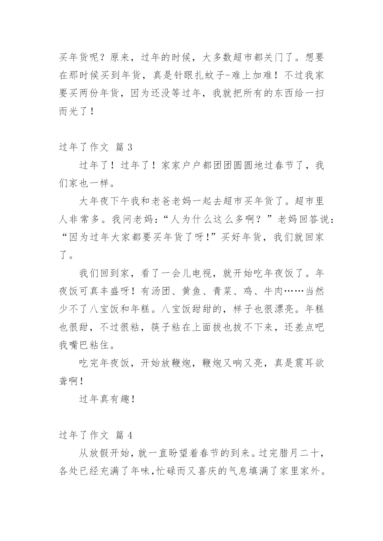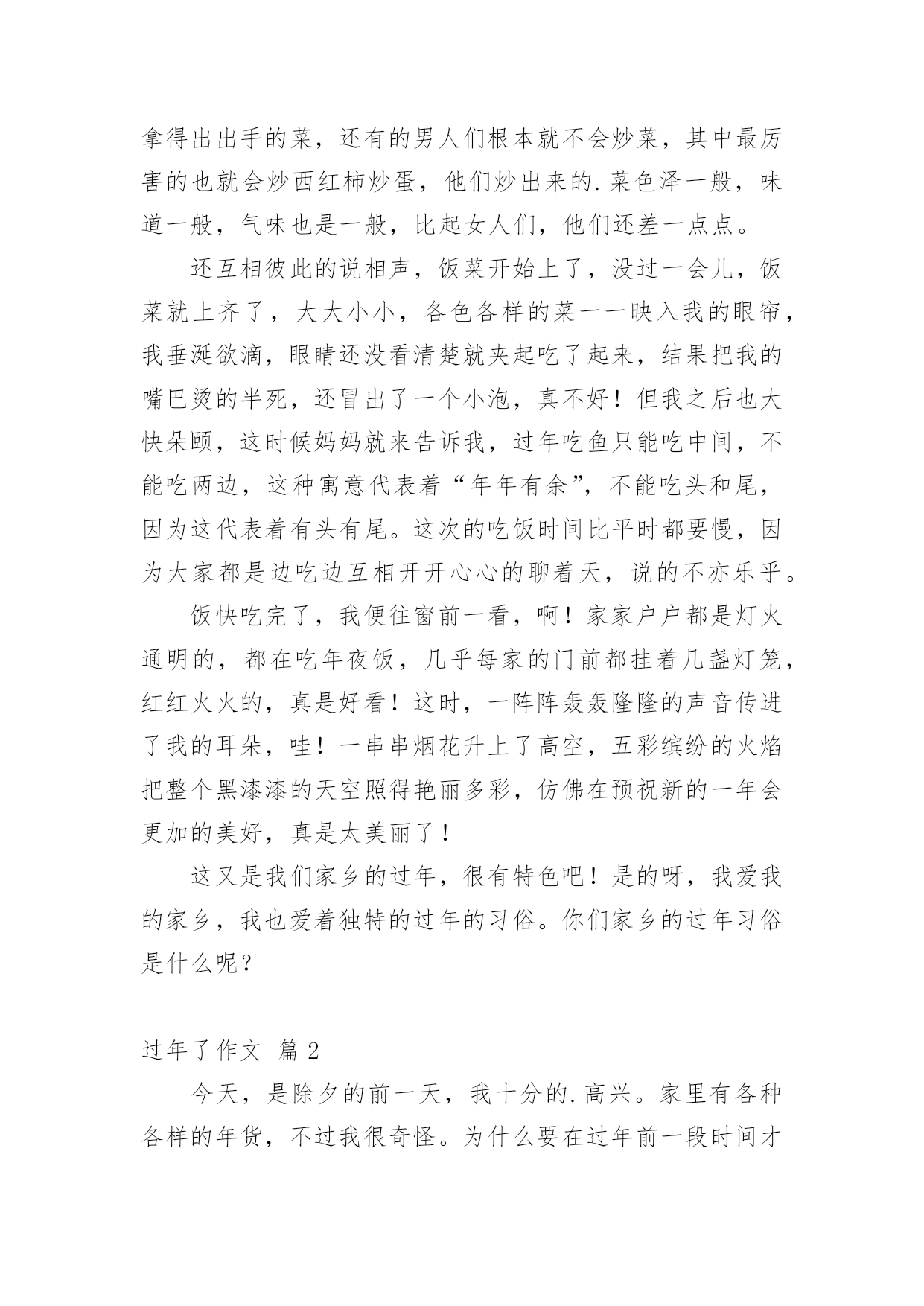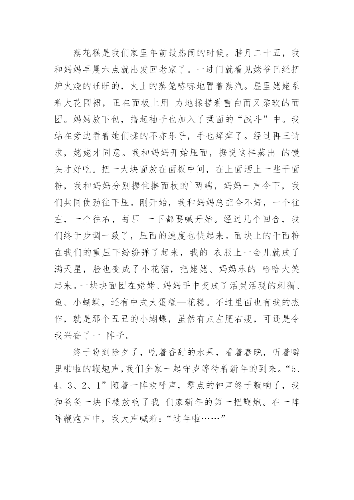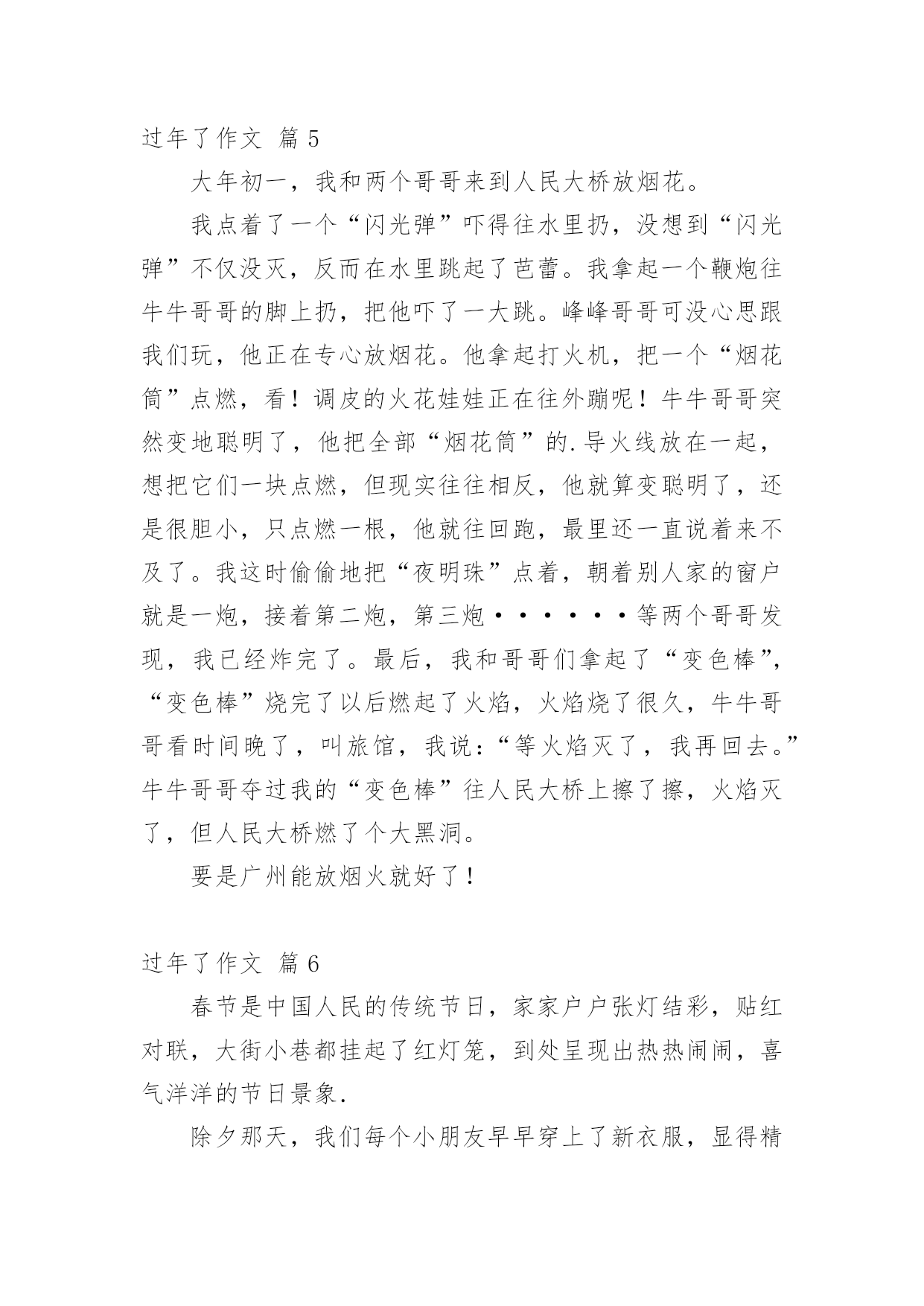 过年了作文 实用的过年了作文汇总九篇在平日的学习、工作和生活里,大家或多或少都会接触过作文吧,写作文可以锻炼我们的独处习惯,让自己的心静下来,思考自己未来的方向。你写作文时总是无从下笔?下面是小编为大家整理的过年了作文9篇,仅供参考,欢迎大家阅读。过年了作文篇1我们每年都会过年,因为这是我国的传统风俗,没有哪个人是不过年的。在门口时,我就发现了,家家户户都贴着崭新的春联,各式各样的春联映入了我的眼帘,看得我眼花缭乱,再走近一看,似乎跟去年的不太一样了,这应该是他们想辞旧迎新的意思吧,寓意着新的东西来临了。走进家门,我就见到了堂哥,堂姐,表哥,姑父,姑妈,伯父,伯母等一些人,我们家可是有很多人的,我往厨房那边飘一眼,突然看见姐姐在厨房,我好奇地走了过去,看到姐姐在厨房打下手,洗一些菜,剥一些蒜等,而妈妈,伯母和姑妈三个人则是主厨。结果就是一堆男人们在那里呆呆的嗑着瓜子,或者看着电视,或者在打游戏,还有的在互相聊天,而女人们就在厨房中做“主线工作”,不是因为男人们不肯进到厨房里来,不食人间烟火,是因为男人们没有几个拿得出出手的菜,还有的男人们根本就不会炒菜,其中最厉害的也就会炒西红柿炒蛋,他们炒出来的.菜色泽一般,味道一般,气味也是一般,比起女人们,他们还差一点点。还互相彼此的说相声,饭菜开始上了,没过一会儿,饭菜就上齐了,大大小小,各色各样的菜一一映入我的眼帘,我垂涎欲滴,眼睛还没看清楚就夹起吃了起来,结果把我的嘴巴烫的半死,还冒出了一个小泡,真不好!但我之后也大快朵颐,这时候妈妈就来告诉我,过年吃鱼只能吃中间,不能吃两边,这种寓意代表着“年年有余”,不能吃头和尾,因为这代表着有头有尾。这次的吃饭时间比平时都要慢,因为大家都是边吃边互相开开心心的聊着天,说的不亦乐乎。饭快吃完了,我便往窗前一看,啊!家家户户都是灯火通明的,都在吃年夜饭,几乎每家的门前都挂着几盏灯笼,红红火火的,真是好看!这时,一阵阵轰轰隆隆的声音传进了我的耳朵,哇!一串串烟花升上了高空,五彩缤纷的火焰把整个黑漆漆的天空照得艳丽多彩,仿佛在预祝新的一年会更加的美好,真是太美丽了!这又是我们家乡的过年,很有特色吧!是的呀,我爱我的家乡,我也爱着独特的过年的习俗。你们家乡的过年习俗是什么呢?过年了作文篇2今天,是除夕的前一天,我十分的.高兴。家里有各种各样的年货,不过我很奇怪。为什么要在过年前一段时间才买年货呢?原来,过年的时候,大多数超市都关门了。想要在那时候买到年货,真是针眼扎蚊子-难上加难!不过我家要买两份年货,因为还没等过年,我就把所有的东西给一扫而光了!过年了作文篇3过年了!过年了!家家户户都团团圆圆地过春节了,我们家也一样。大年夜下午我和老爸老妈一起去超市买年货了。超市里人非常多。我问老妈:“人为什么这么多啊?”老妈回答说:“因为过年大家都要买年货了呀!”买好年货,我们就回家了。我们回到家,看了一会儿电视,就开始吃年夜饭了。年夜饭可真丰盛呀!有汤团、黄鱼、青菜、鸡、牛肉……当然少不了八宝饭和年糕。八宝饭甜甜的,样子也很漂亮。年糕也很甜,不过很粘,筷子粘在上面拔也拔不下来,还差点吧我嘴巴粘住。吃完年夜饭,开始放鞭炮,鞭炮又响又亮,真是震耳欲聋啊!过年真有趣!过年了作文篇4从放假开始,就一直盼望着春节的到来。过完腊月二十,各处已经充满了年味,忙碌而又喜庆的气息填满了家里家外。蒸花糕是我们家里年前最热闹的时候。腊月二十五,我和妈妈早晨六点就出发回老家了。一进门就看见姥爷已经把炉火烧的旺旺的,火上的蒸笼哧哧地冒着蒸汽。屋里姥姥系着大花围裙,正在面板上用力地揉搓着雪白而又柔软的面团。妈妈放下包,撸起袖子也加入了揉面的“战斗”中。我站在旁边看着她们揉的不亦乐乎,手也痒痒了。经过再三请求,姥姥才同意。我和妈妈开始压面,据说这样蒸出的馒头才好吃。把一大块面放在面板中间,在上面洒上一些干面粉,我和妈妈分别握住擀面杖的`两端,妈妈一声令下,我们共同使劲往下压。刚开始,我和妈妈总配合不好,一个往左,一个往右,每压一下都要喊开始。经过几个回合,我们终于步调一致了,压面的速度也快起来。面块上的干面粉在我们的重压下纷纷弹了起来,我的衣服上一会儿就成了满天星,脸也变成了小花猫,把姥姥、妈妈乐的哈哈大笑起来。一块块面团在姥姥、妈妈手中变成了活灵活现的刺猬、鱼、小蝴蝶,还有中式大蛋糕—花糕。不过里面也有我的杰作,就是那个丑丑的小蝴蝶,虽然有点左肥右瘦,可还是令我兴奋了一阵子。终于盼到除夕了,吃着香甜的水果,看着春晚,听着噼里啪啦的鞭炮声,我们全家一起守岁等待着新年的到来。“5、4、3、2、1”随着一阵欢呼声,零点的钟声终于敲响了,我和爸爸一块下楼放响了我们家新年的第一把鞭炮。在一阵阵鞭炮声中,我大声喊着:“过年啦……”过年了作文篇5大年初一,我和两个哥哥来到人民大桥放烟花。我点着了一个“
