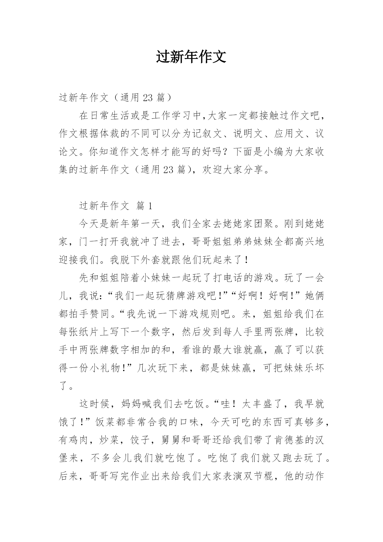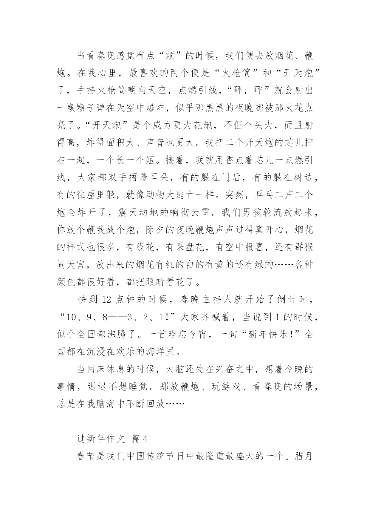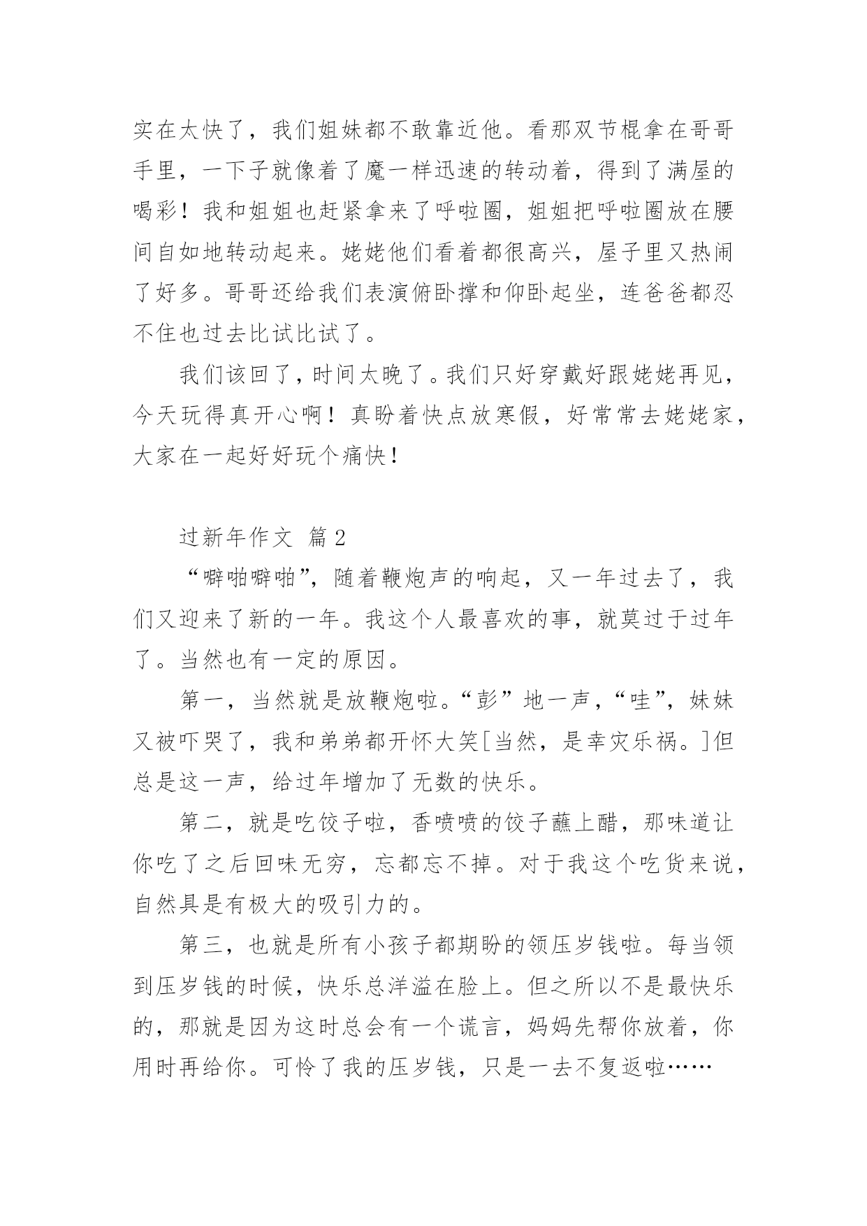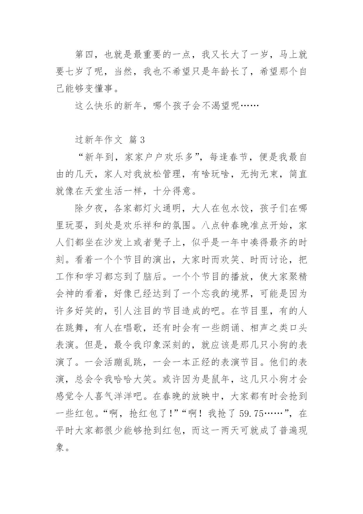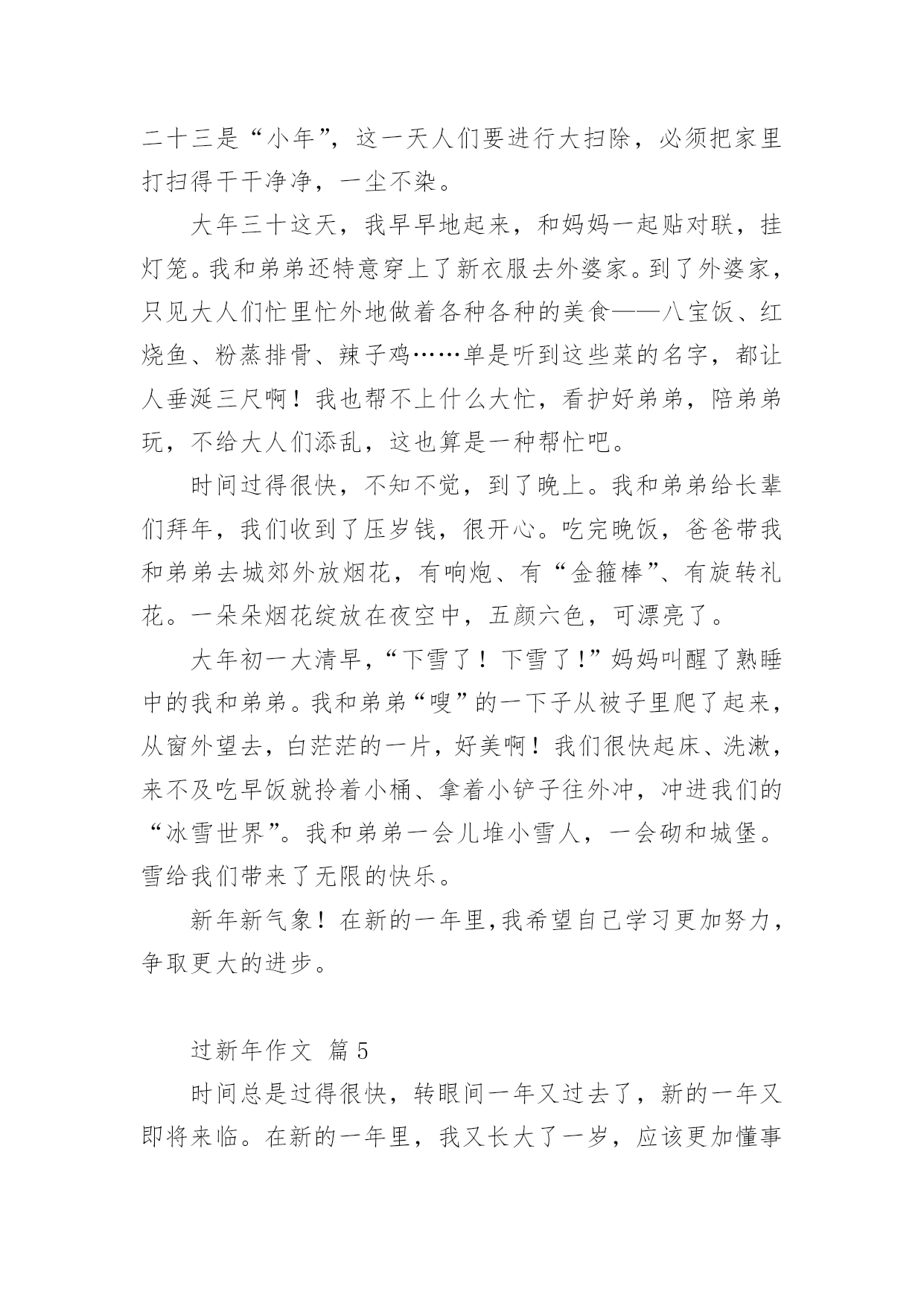 过新年作文 过新年作文(通用23篇)在日常生活或是工作学习中,大家一定都接触过作文吧,作文根据体裁的不同可以分为记叙文、说明文、应用文、议论文。你知道作文怎样才能写的好吗?下面是小编为大家收集的过新年作文(通用23篇),欢迎大家分享。过新年作文篇1今天是新年第一天,我们全家去姥姥家团聚。刚到姥姥家,门一打开我就冲了进去,哥哥姐姐弟弟妹妹全都高兴地迎接我们。我脱下外套就跟他们玩起来了!先和姐姐陪着小妹妹一起玩了打电话的游戏。玩了一会儿,我说:“我们一起玩猜牌游戏吧!”“好啊!好啊!”她俩都拍手赞同。“我先说一下游戏规则吧。来,姐姐给我们在每张纸片上写下一个数字,然后发到每人手里两张牌,比较手中两张牌数字相加的和,看谁的最大谁就赢,赢了可以获得一份小礼物!”几次玩下来,都是妹妹赢,可把妹妹乐坏了。这时候,妈妈喊我们去吃饭。“哇!太丰盛了,我早就饿了!”饭菜都非常合我的口味,今天可吃的东西可真够多,有鸡肉,炒菜,饺子,舅舅和哥哥还给我们带了肯德基的汉堡来,不多会儿我们就吃饱了。吃饱了我们就又跑去玩了。后来,哥哥写完作业出来给我们大家表演双节棍,他的动作实在太快了,我们姐妹都不敢靠近他。看那双节棍拿在哥哥手里,一下子就像着了魔一样迅速的转动着,得到了满屋的喝彩!我和姐姐也赶紧拿来了呼啦圈,姐姐把呼啦圈放在腰间自如地转动起来。姥姥他们看着都很高兴,屋子里又热闹了好多。哥哥还给我们表演俯卧撑和仰卧起坐,连爸爸都忍不住也过去比试比试了。我们该回了,时间太晚了。我们只好穿戴好跟姥姥再见,今天玩得真开心啊!真盼着快点放寒假,好常常去姥姥家,大家在一起好好玩个痛快!过新年作文篇2“噼啪噼啪”,随着鞭炮声的响起,又一年过去了,我们又迎来了新的一年。我这个人最喜欢的事,就莫过于过年了。当然也有一定的原因。第一,当然就是放鞭炮啦。“彭”地一声,“哇”,妹妹又被吓哭了,我和弟弟都开怀大笑[当然,是幸灾乐祸。]但总是这一声,给过年增加了无数的快乐。第二,就是吃饺子啦,香喷喷的饺子蘸上醋,那味道让你吃了之后回味无穷,忘都忘不掉。对于我这个吃货来说,自然具是有极大的吸引力的。第三,也就是所有小孩子都期盼的领压岁钱啦。每当领到压岁钱的时候,快乐总洋溢在脸上。但之所以不是最快乐的,那就是因为这时总会有一个谎言,妈妈先帮你放着,你用时再给你。可怜了我的压岁钱,只是一去不复返啦……第四,也就是最重要的一点,我又长大了一岁,马上就要七岁了呢,当然,我也不希望只是年龄长了,希望那个自己能够变懂事。这么快乐的新年,哪个孩子会不渴望呢……过新年作文篇3“新年到,家家户户欢乐多”,每逢春节,便是我最自由的几天,家人对我放松管理,有啥玩啥,无拘无束,简直就像在天堂生活一样,十分得意。除夕夜,各家都灯火通明,大人在包水饺,孩子们在哪里玩耍,到处是欢乐祥和的氛围。八点钟春晚准点开始,家人们都坐在沙发上或者凳子上,似乎是一年中凑得最齐的时刻。看着一个个节目的演出,大家时而欢笑、时而讨论,把工作和学习都忘到了脑后。一个个节目的播放,使大家聚精会神的看着,好像已经达到了一个忘我的境界,可能是因为许多好笑的,引人注目的节目造成的吧。在节目里,有的人在跳舞,有人在唱歌,还有时会有一些朗诵、相声之类口头表演。但是,最令我印象深刻的,就应该是那几只小狗的表演了。一会活蹦乱跳,一会一本正经的表演节目。他们的表演,总会令我哈哈大笑。或许因为是鼠年,这几只小狗才会感觉令人喜气洋洋吧。在春晚的放映中,大家都有时会抢到一些红包。“啊,抢红包了!”“啊!我抢了59.75……”,在平时大家都很少能够抢到红包,而这一两天可就成了普遍现象。当看春晚感觉有点“烦”的时候,我们便去放烟花、鞭炮。在我心里,最喜欢的两个便是“火枪筒”和“开天炮”了,手持火枪筒朝向天空,点燃引线,“砰,砰”就会射出一颗颗子弹在天空中爆炸,似乎那黑黑的夜晚都被那火花点亮了。“开天炮”是个威力更大花炮,不但个头大,而且射得高,炸得面积大、声音也更大。我把二个开天炮的芯儿拧在一起,一个长一个短。接着,我就用香点着芯儿一点燃引线,大家都双手捂着耳朵,有的躲在门后,有的躲在树边,有的往屋里躲,就像动物大逃亡一样。突然,乒乓二声二个炮全炸开了,震天动地的响彻云霄。我们男孩轮流放起来,你放个鞭我放个炮,除夕的夜晚鞭炮声声过得真开心,烟花的样式也很多,有线花,有采盘花,有空中报喜,还有群猴闹天宫,放出来的烟花有红的白的有黄的还有绿的……各种颜色都很好看,都把眼睛看花了。快到12点钟的时候,春晚主持人就开始了倒计时,“10、9、8——3、2、1!”大家齐喊着,当说到1的时候,似乎全国都沸腾了。一首难忘今宵,一句“新年快乐!”全国都在沉浸在欢乐的海洋里。当回床休息的时候,大脑还处在兴奋之中,想着今晚的事情,迟迟不想睡觉。那放鞭炮、玩游戏、看春晚的场景,总是在