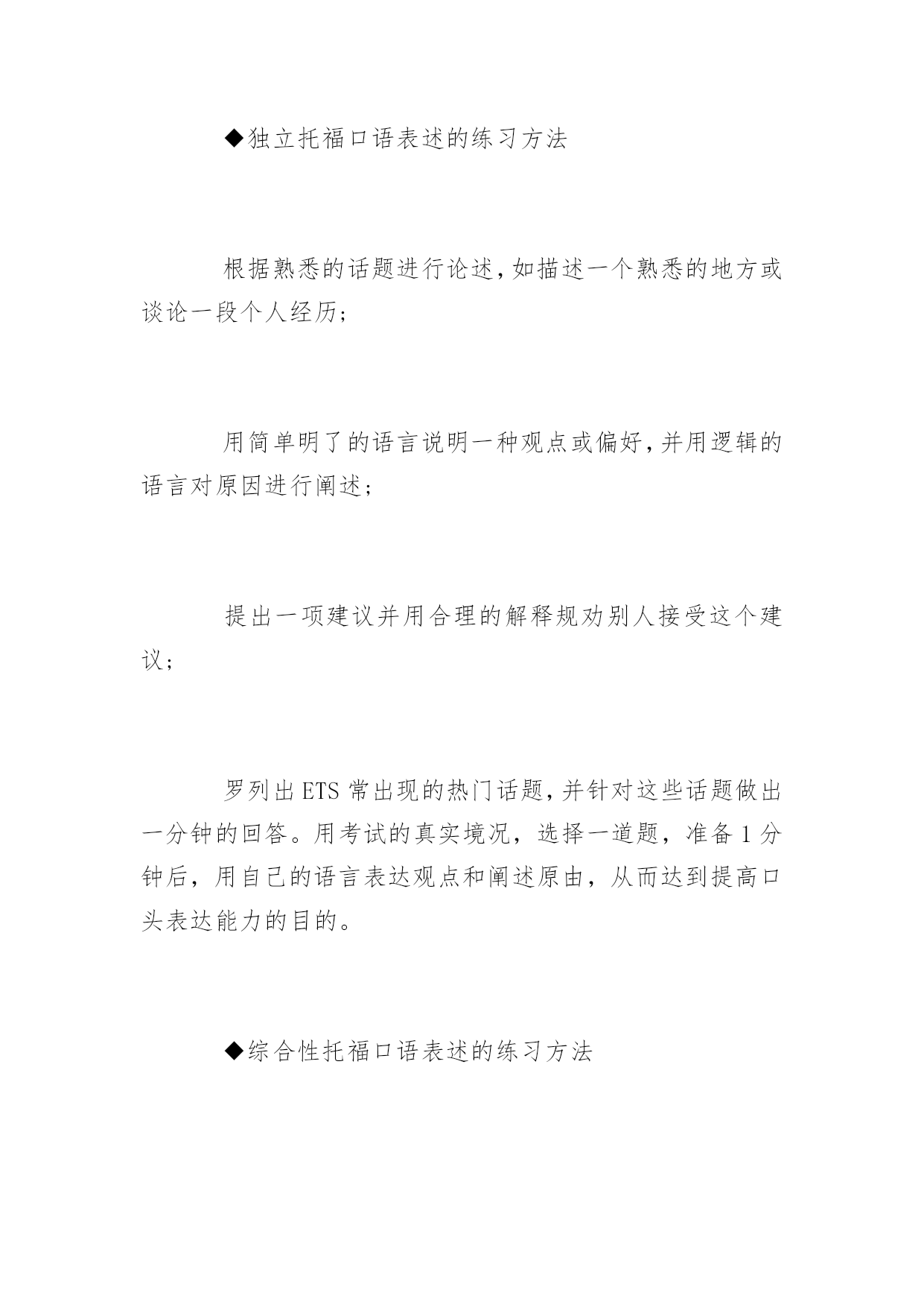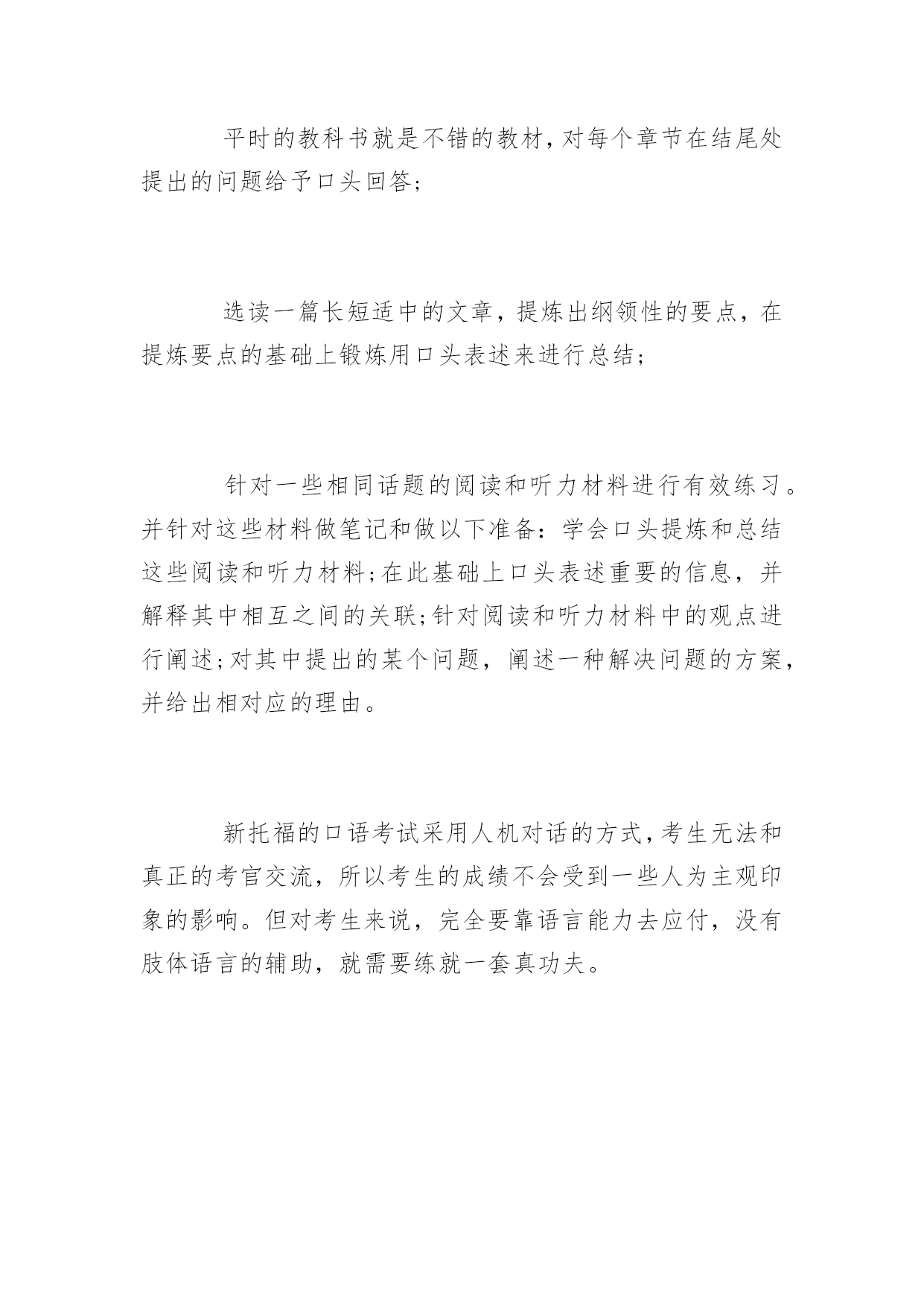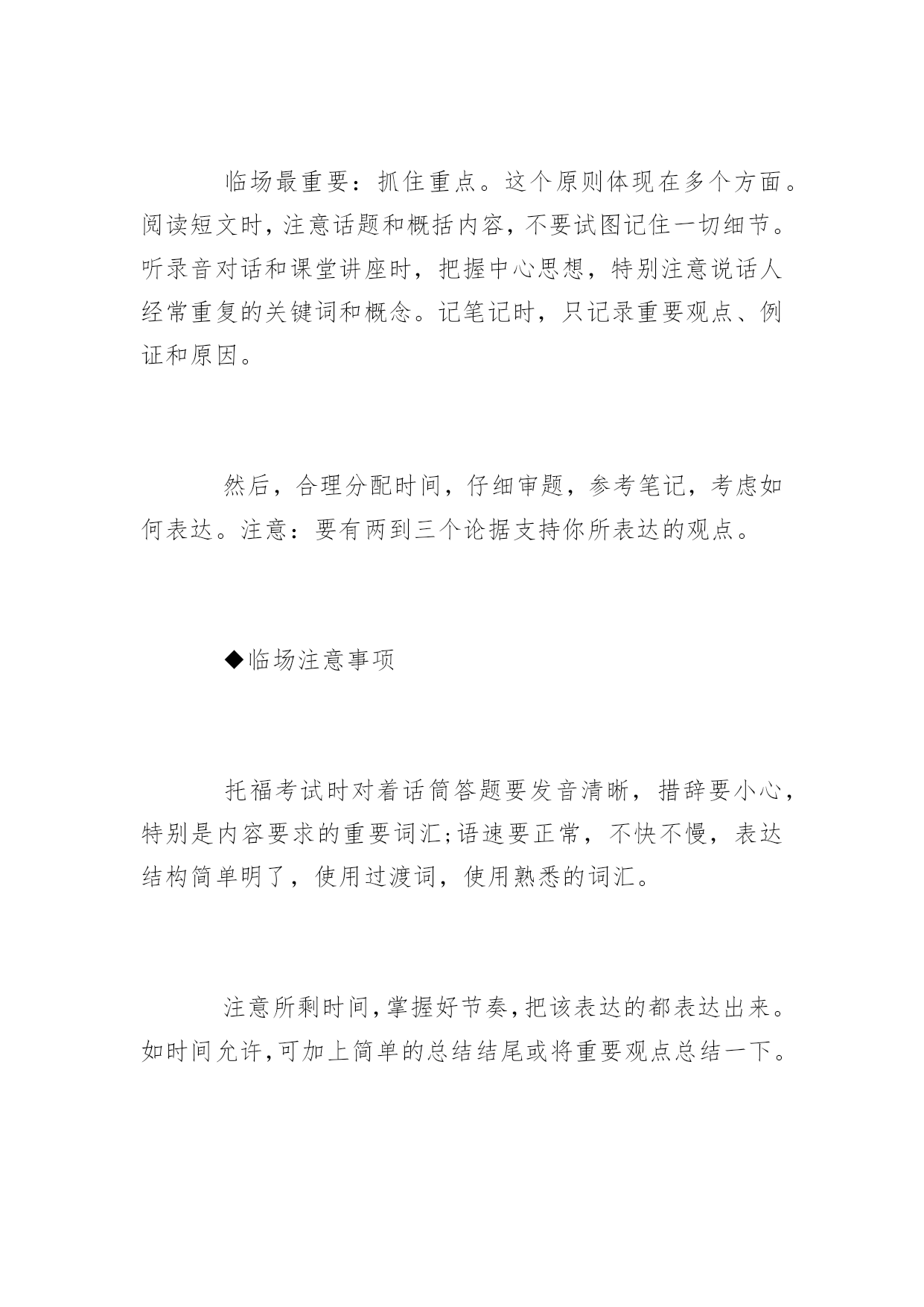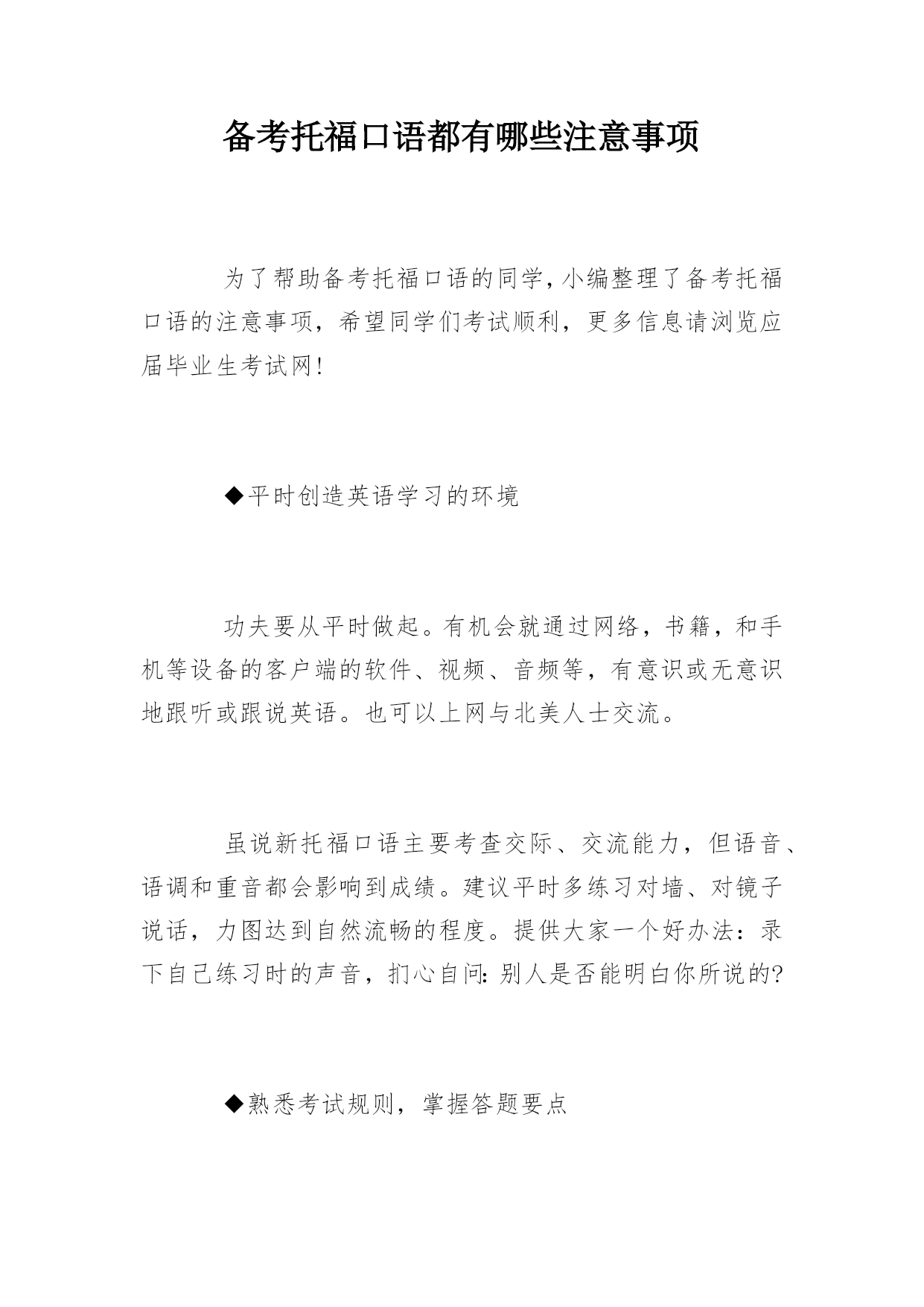 备考托福口语都有哪些注意事项 为了帮助备考托福口语的同学,小编整理了备考托福口语的注意事项,希望同学们考试顺利,更多信息请浏览应届毕业生考试网! ◆平时创造英语学习的环境 功夫要从平时做起。有机会就通过网络,书籍,和手机等设备的客户端的软件、视频、音频等,有意识或无意识地跟听或跟说英语。也可以上网与北美人士交流。 虽说新托福口语主要考查交际、交流能力,但语音、语调和重音都会影响到成绩。建议平时多练习对墙、对镜子说话,力图达到自然流畅的程度。提供大家一个好办法:录下自己练习时的声音,扪心自问:别人是否能明白你所说的? ◆熟悉考试规则,掌握答题要点 临场最重要:抓住重点。这个原则体现在多个方面。阅读短文时,注意话题和概括内容,不要试图记住一切细节。听录音对话和课堂讲座时,把握中心思想,特别注意说话人经常重复的关键词和概念。记笔记时,只记录重要观点、例证和原因。 然后,合理分配时间,仔细审题,参考笔记,考虑如何表达。注意:要有两到三个论据支持你所表达的观点。 ◆临场注意事项 托福考试时对着话筒答题要发音清晰,措辞要小心,特别是内容要求的重要词汇;语速要正常,不快不慢,表达结构简单明了,使用过渡词,使用熟悉的词汇。 注意所剩时间,掌握好节奏,把该表达的都表达出来。如时间允许,可加上简单的总结结尾或将重要观点总结一下。 ◆独立托福口语表述的练习方法 根据熟悉的话题进行论述,如描述一个熟悉的地方或谈论一段个人经历; 用简单明了的语言说明一种观点或偏好,并用逻辑的语言对原因进行阐述; 提出一项建议并用合理的解释规劝别人接受这个建议; 罗列出ETS常出现的热门话题,并针对这些话题做出一分钟的回答。用考试的真实境况,选择一道题,准备1分钟后,用自己的语言表达观点和阐述原由,从而达到提高口头表达能力的目的。 ◆综合性托福口语表述的练习方法 平时的教科书就是不错的教材,对每个章节在结尾处提出的问题给予口头回答; 选读一篇长短适中的文章,提炼出纲领性的要点,在提炼要点的基础上锻炼用口头表述来进行总结; 针对一些相同话题的阅读和听力材料进行有效练习。并针对这些材料做笔记和做以下准备:学会口头提炼和总结这些阅读和听力材料;在此基础上口头表述重要的信息,并解释其中相互之间的关联;针对阅读和听力材料中的观点进行阐述;对其中提出的某个问题,阐述一种解决问题的方案,并给出相对应的理由。 新托福的口语考试采用人机对话的方式,考生无法和真正的考官交流,所以考生的成绩不会受到一些人为主观印象的影响。但对考生来说,完全要靠语言能力去应付,没有肢体语言的辅助,就需要练就一套真功夫。