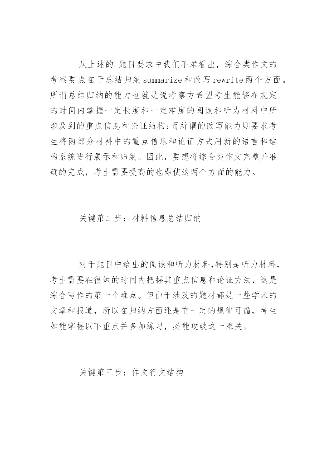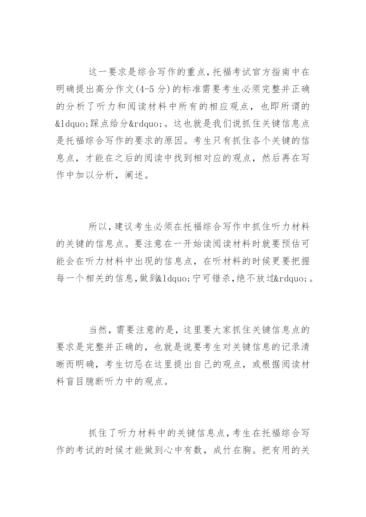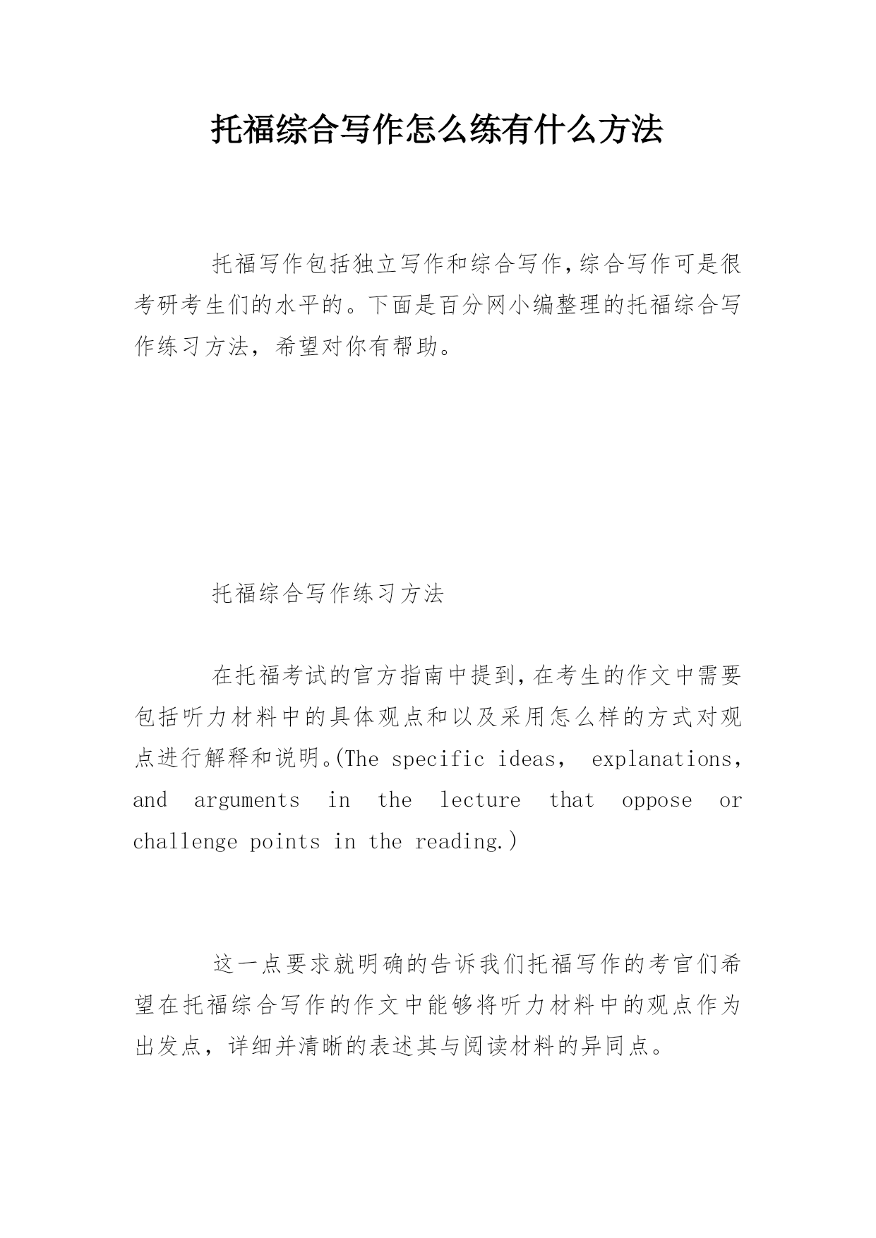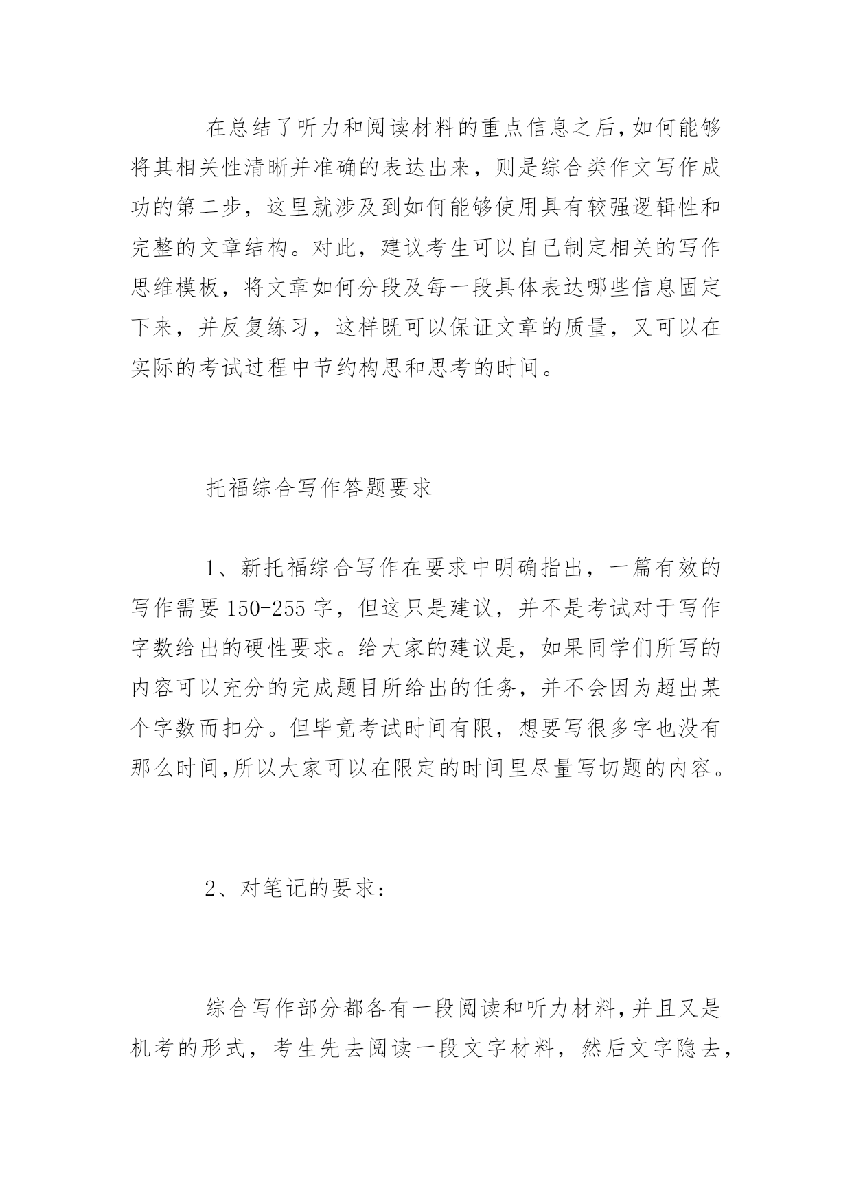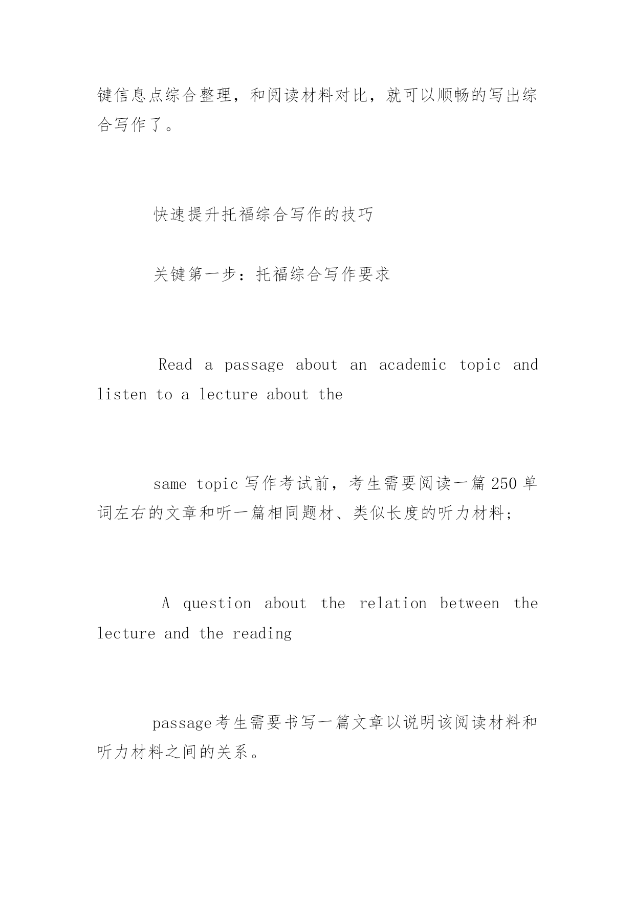 托福综合写作怎么练有什么方法 托福写作包括独立写作和综合写作,综合写作可是很考研考生们的水平的。下面是百分网小编整理的托福综合写作练习方法,希望对你有帮助。 托福综合写作练习方法 在托福考试的官方指南中提到,在考生的作文中需要包括听力材料中的具体观点和以及采用怎么样的方式对观点进行解释和说明。(Thespecificideas,explanations,andargumentsinthelecturethatopposeorchallengepointsinthereading.) 这一点要求就明确的告诉我们托福写作的考官们希望在托福综合写作的作文中能够将听力材料中的观点作为出发点,详细并清晰的表述其与阅读材料的异同点。 这一要求是综合写作的重点,托福考试官方指南中在明确提出高分作文(4-5分)的标准需要考生必须完整并正确的分析了听力和阅读材料中所有的相应观点,也即所谓的“踩点给分”。这也就是我们说抓住关键信息点是托福综合写作的要求的原因。考生只有抓住各个关键的信息点,才能在之后的阅读中找到相对应的观点,然后再在写作中加以分析,阐述。 所以,建议考生必须在托福综合写作中抓住听力材料的关键的信息点。要注意在一开始读阅读材料时就要预估可能会在听力材料中出现的信息点,在听材料的时候更要把握每一个相关的信息,做到“宁可错杀,绝不放过”。 当然,需要注意的是,这里要大家抓住关键信息点的要求是完整并正确的,也就是说要考生对关键信息的记录清晰而明确,考生切忌在这里提出自己的观点,或根据阅读材料盲目臆断听力中的观点。 抓住了听力材料中的关键信息点,考生在托福综合写作的考试的时候才能做到心中有数,成竹在胸。把有用的关键信息点综合整理,和阅读材料对比,就可以顺畅的写出综合写作了。 快速提升托福综合写作的技巧 关键第一步:托福综合写作要求 Readapassageaboutanacademictopicandlistentoalectureaboutthe sametopic写作考试前,考生需要阅读一篇250单词左右的文章和听一篇相同题材、类似长度的听力材料; Aquestionabouttherelationbetweenthelectureandthereading passage考生需要书写一篇文章以说明该阅读材料和听力材料之间的关系。 从上述的.题目要求中我们不难看出,综合类作文的考察要点在于总结归纳summarize和改写rewrite两个方面。所谓总结归纳的能力也就是说考察方希望考生能够在规定的时间内掌握一定长度和一定难度的阅读和听力材料中所涉及到的重点信息和论证结构;而所谓的改写能力则要求考生将两部分材料中的重点信息和论证方式用新的语言和结构系统进行展示和归纳。因此,要想将综合类作文完整并准确的完成,考生需要提高的也即使这两个方面的能力。 关键第二步:材料信息总结归纳 对于题目中给出的阅读和听力材料,特别是听力材料,考生需要在很短的时间内把握其重点信息和论证方法,这是综合写作的第一个难点。但由于涉及的题材都是一些学术的文章和报道,所以在归纳方面还是有一定的规律可循,考生如能掌握以下重点并多加练习,必能攻破这一难关。 关键第三步:作文行文结构 在总结了听力和阅读材料的重点信息之后,如何能够将其相关性清晰并准确的表达出来,则是综合类作文写作成功的第二步,这里就涉及到如何能够使用具有较强逻辑性和完整的文章结构。对此,建议考生可以自己制定相关的写作思维模板,将文章如何分段及每一段具体表达哪些信息固定下来,并反复练习,这样既可以保证文章的质量,又可以在实际的考试过程中节约构思和思考的时间。 托福综合写作答题要求 1、新托福综合写作在要求中明确指出,一篇有效的写作需要150-255字,但这只是建议,并不是考试对于写作字数给出的硬性要求。给大家的建议是,如果同学们所写的内容可以充分的完成题目所给出的任务,并不会因为超出某个字数而扣分。但毕竟考试时间有限,想要写很多字也没有那么时间,所以大家可以在限定的时间里尽量写切题的内容。 2、对笔记的要求: 综合写作部分都各有一段阅读和听力材料,并且又是机考的形式,考生先去阅读一段文字材料,然后文字隐去,听一段和阅读内容先关的录音,然后考生需要结合这两段内容按照题目要求完成写作。毕竟我们的短期记忆有限,想要将两段材料中的关键信息都记忆那么我们需要笔记来作为辅助了,考试过程中都会给考生提供纸和笔,我们可以将听到或者看到的重要信息做好记录。关键就在于大家会不会做笔记?有效的笔记内容是最后完成全面写作的关键因素,但有效的笔记并不是所有的内容都记下来,考试中也没有那么时间,所以通常建议考生记录阅读材料中的核心观点以及延伸出来的两只三个分论点都是哪些,在接下来的听力材