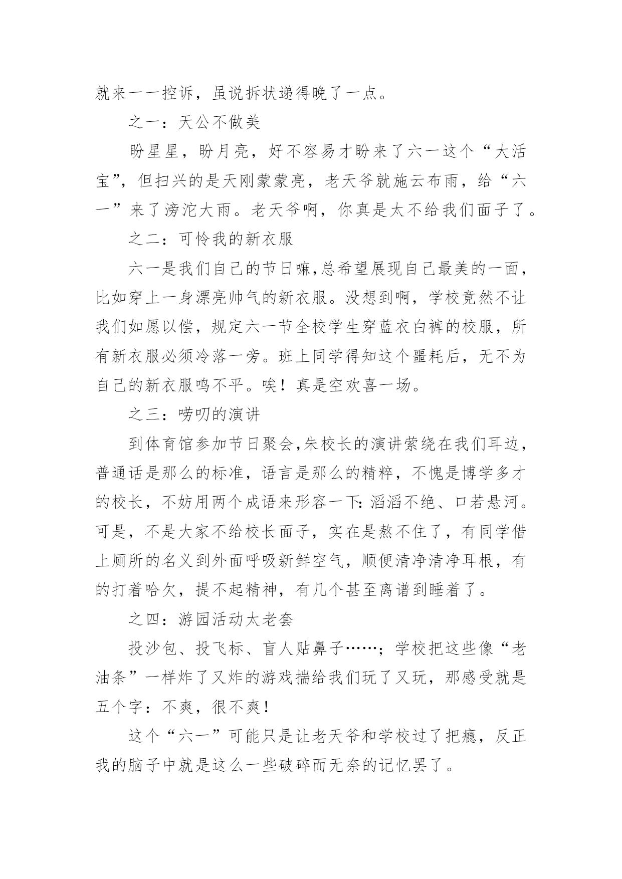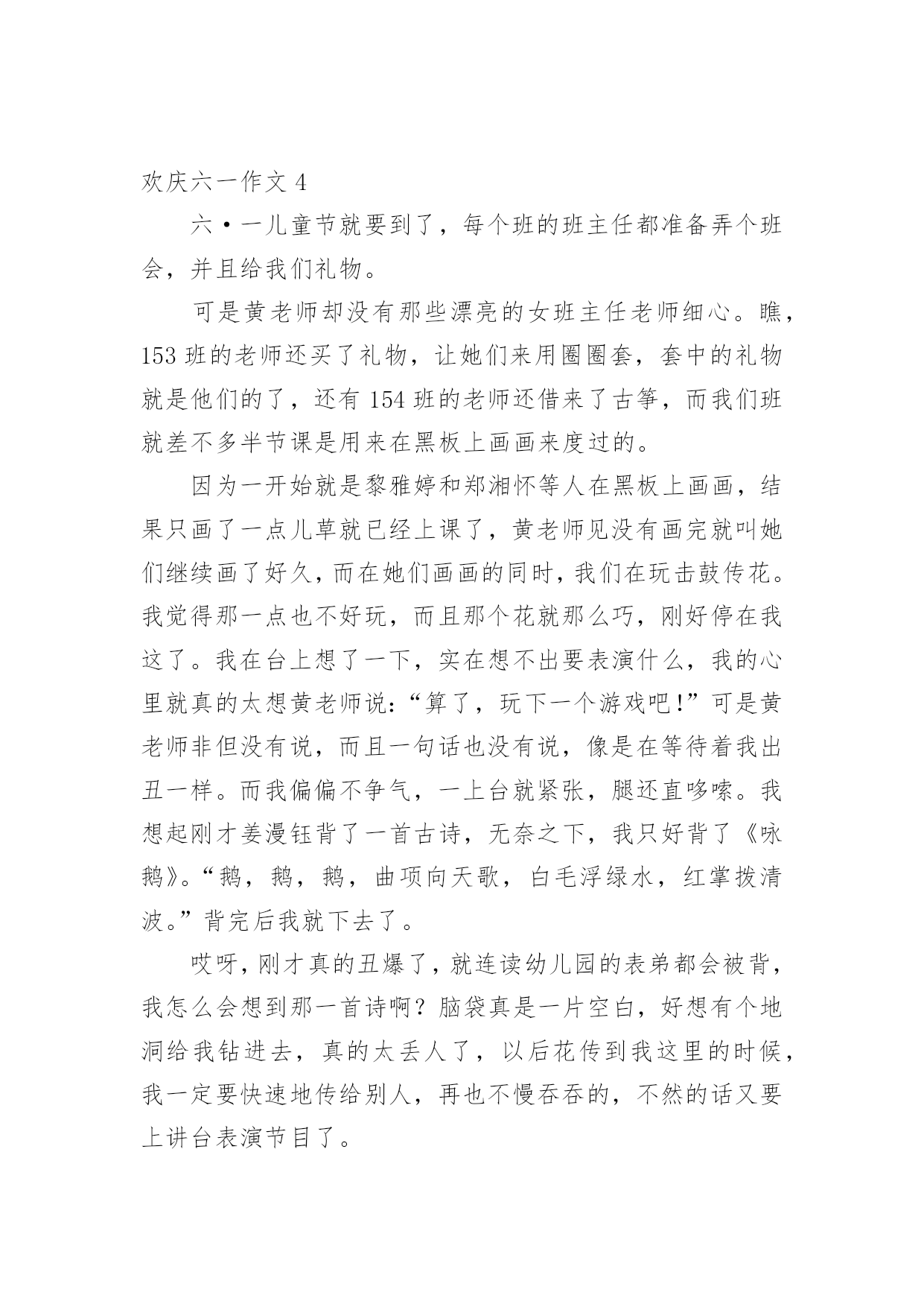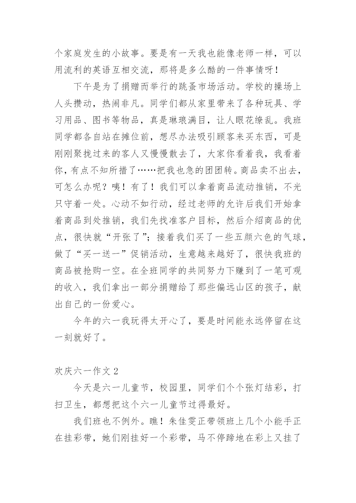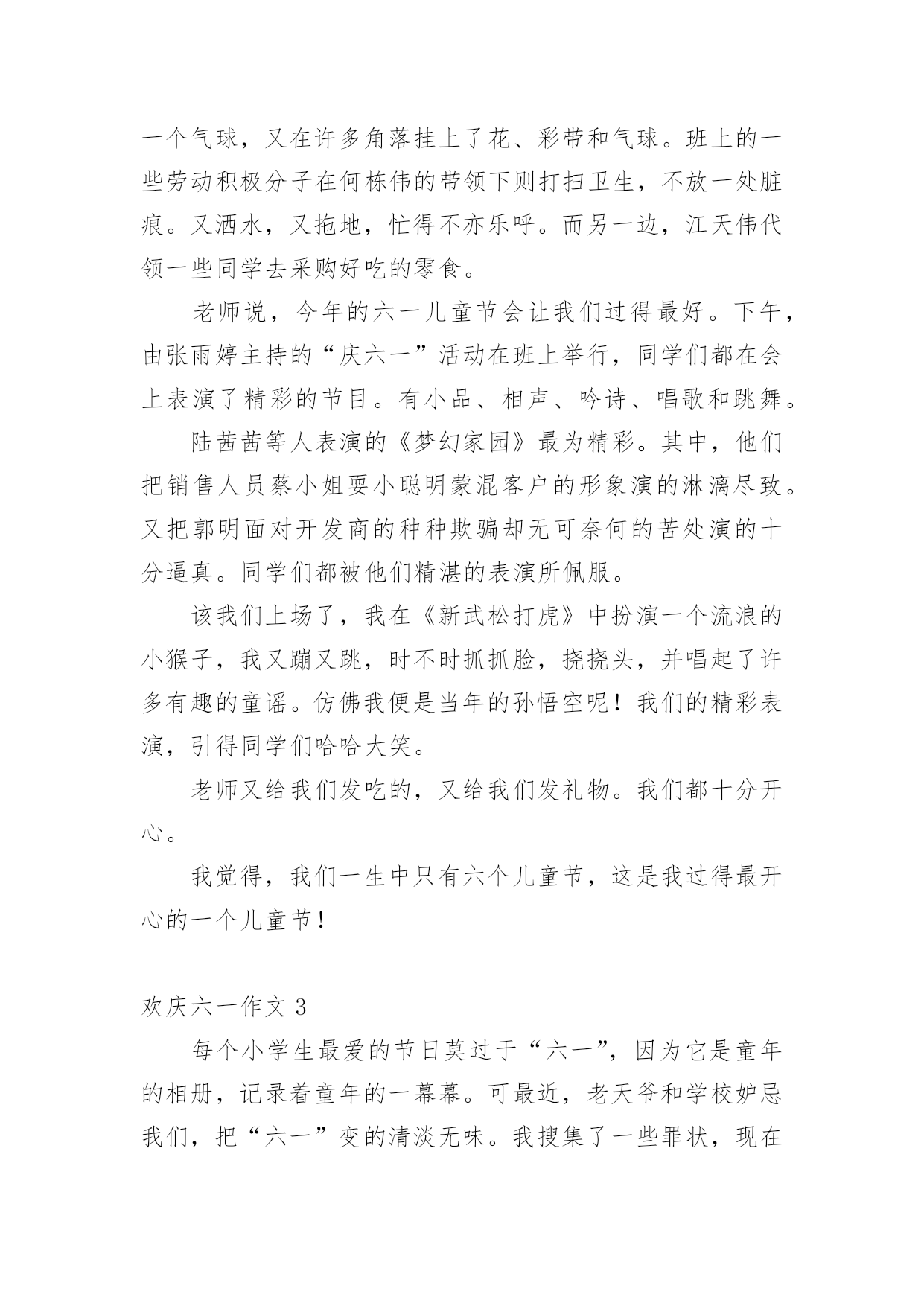 欢庆六一作文 欢庆六一作文合集15篇在学习、工作、生活中,大家都经常看到作文的身影吧,借助作文人们可以反映客观事物、表达思想感情、传递知识信息。还是对作文一筹莫展吗?以下是小编整理的欢庆六一作文,欢迎阅读,希望大家能够喜欢。欢庆六一作文1今天,我们期盼已久的六一儿童节终于到来了。同学们各个欢欣雀跃,学校也组织了一系列精彩纷呈的庆祝活动。上午是文艺汇演,我们满怀激情的坐在操场上,目不转睛地盯着舞台中央。随着主持人的开场白,文艺表演正式开始了。看着一个个精彩的节目,我不禁感叹真是“台上一分钟,台下十年工"啊,这需要花多长时间的排练才能呈现出这般的惟妙惟肖。终于轮到我们班表演了,作为小演员的我心里既激动又紧张,仿佛一下子忘记了所有动作,随着音乐前奏的响起,在领唱张耀匀同学的带动下,我渐渐找回了“失去的记忆”,伴着明快的音乐节奏,跳得越来越有感觉了!张耀匀妈妈用优美的歌声谢幕后,我轻轻地松了一口气,心想:“总算没有拖后腿,演出完美地结束了,真还有些意犹未尽呢!”在随后的节目中,我最感兴趣的就是《孔雀东南飞》了,这个节目是由可爱的老师们表演的,他们用英语演绎出了一个家庭发生的小故事。要是有一天我也能像老师一样,可以用流利的英语互相交流,那将是多么酷的一件事情呀!下午是为了捐赠而举行的跳蚤市场活动。学校的操场上人头攒动,热闹非凡。同学们都从家里带来了各种玩具、学习用品、图书等物品,真是琳琅满目,让人眼花缭乱。我班同学都各自站在摊位前,想尽办法吸引顾客来买东西,可是刚刚聚拢过来的客人又慢慢散去了,大家你看着我,我看着你,有点不知所措了……把我也急的团团转。商品卖不出去,可怎么办呢?咦!有了!我们可以拿着商品流动推销,不光只守着一处。心动不如行动,经过老师的允许后我们开始拿着商品到处推销,我们先找准客户目标,然后介绍商品的优点,很快就“开张了”;接着我们买了一些五颜六色的气球,做了“买一送一”促销活动,生意越来越好了,很快我班的商品被抢购一空。在全班同学的共同努力下赚到了一笔可观的收入,我们拿出一部分捐赠给了那些偏远山区的孩子,献出自己的一份爱心。今年的六一我玩得太开心了,要是时间能永远停留在这一刻就好了。欢庆六一作文2今天是六一儿童节,校园里,同学们个个张灯结彩,打扫卫生,都想把这个六一儿童节过得最好。我们班也不例外。瞧!朱佳雯正带领班上几个小能手正在挂彩带,她们刚挂好一个彩带,马不停蹄地在彩上又挂了一个气球,又在许多角落挂上了花、彩带和气球。班上的一些劳动积极分子在何栋伟的带领下则打扫卫生,不放一处脏痕。又洒水,又拖地,忙得不亦乐呼。而另一边,江天伟代领一些同学去采购好吃的零食。老师说,今年的六一儿童节会让我们过得最好。下午,由张雨婷主持的“庆六一”活动在班上举行,同学们都在会上表演了精彩的节目。有小品、相声、吟诗、唱歌和跳舞。陆茜茜等人表演的《梦幻家园》最为精彩。其中,他们把销售人员蔡小姐耍小聪明蒙混客户的形象演的淋漓尽致。又把郭明面对开发商的种种欺骗却无可奈何的苦处演的十分逼真。同学们都被他们精湛的表演所佩服。该我们上场了,我在《新武松打虎》中扮演一个流浪的小猴子,我又蹦又跳,时不时抓抓脸,挠挠头,并唱起了许多有趣的童谣。仿佛我便是当年的孙悟空呢!我们的精彩表演,引得同学们哈哈大笑。老师又给我们发吃的,又给我们发礼物。我们都十分开心。我觉得,我们一生中只有六个儿童节,这是我过得最开心的一个儿童节!欢庆六一作文3每个小学生最爱的节日莫过于“六一”,因为它是童年的相册,记录着童年的一幕幕。可最近,老天爷和学校妒忌我们,把“六一”变的清淡无味。我搜集了一些罪状,现在就来一一控诉,虽说拆状递得晚了一点。之一:天公不做美盼星星,盼月亮,好不容易才盼来了六一这个“大活宝”,但扫兴的是天刚蒙蒙亮,老天爷就施云布雨,给“六一”来了滂沱大雨。老天爷啊,你真是太不给我们面子了。之二:可怜我的新衣服六一是我们自己的节日嘛,总希望展现自己最美的一面,比如穿上一身漂亮帅气的新衣服。没想到啊,学校竟然不让我们如愿以偿,规定六一节全校学生穿蓝衣白裤的校服,所有新衣服必须冷落一旁。班上同学得知这个噩耗后,无不为自己的新衣服鸣不平。唉!真是空欢喜一场。之三:唠叨的演讲到体育馆参加节日聚会,朱校长的演讲萦绕在我们耳边,普通话是那么的标准,语言是那么的精粹,不愧是博学多才的校长,不妨用两个成语来形容一下:滔滔不绝、口若悬河。可是,不是大家不给校长面子,实在是熬不住了,有同学借上厕所的名义到外面呼吸新鲜空气,顺便清净清净耳根,有的打着哈欠,提不起精神,有几个甚至离谱到睡着了。之四:游园活动太老套投沙包、投飞标、盲人贴鼻子……;学校把这些像“老油条”一样炸了又炸的游戏揣给我们玩了又玩,那感受就是五个字:不爽,很不爽!这个“六一”可能只是让老天爷和学校过了把瘾,反正我的脑子中