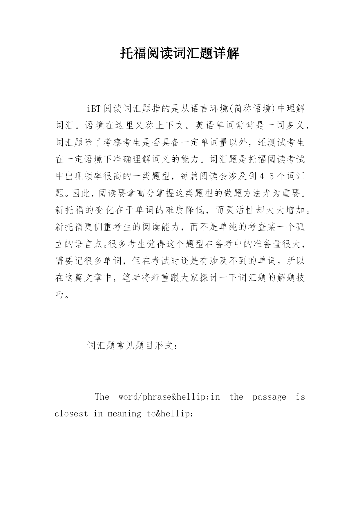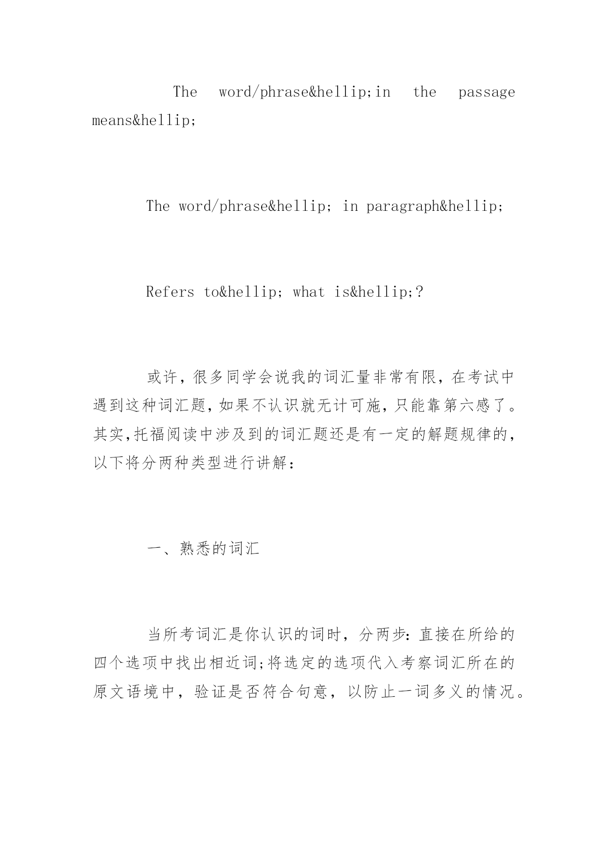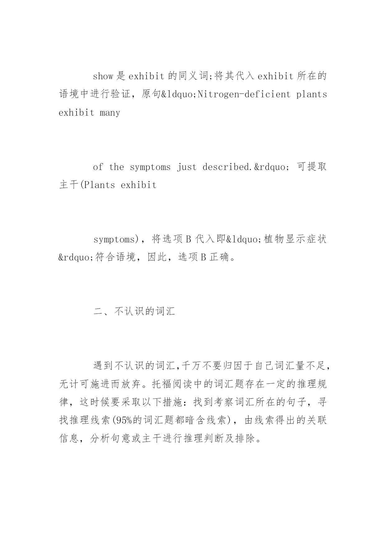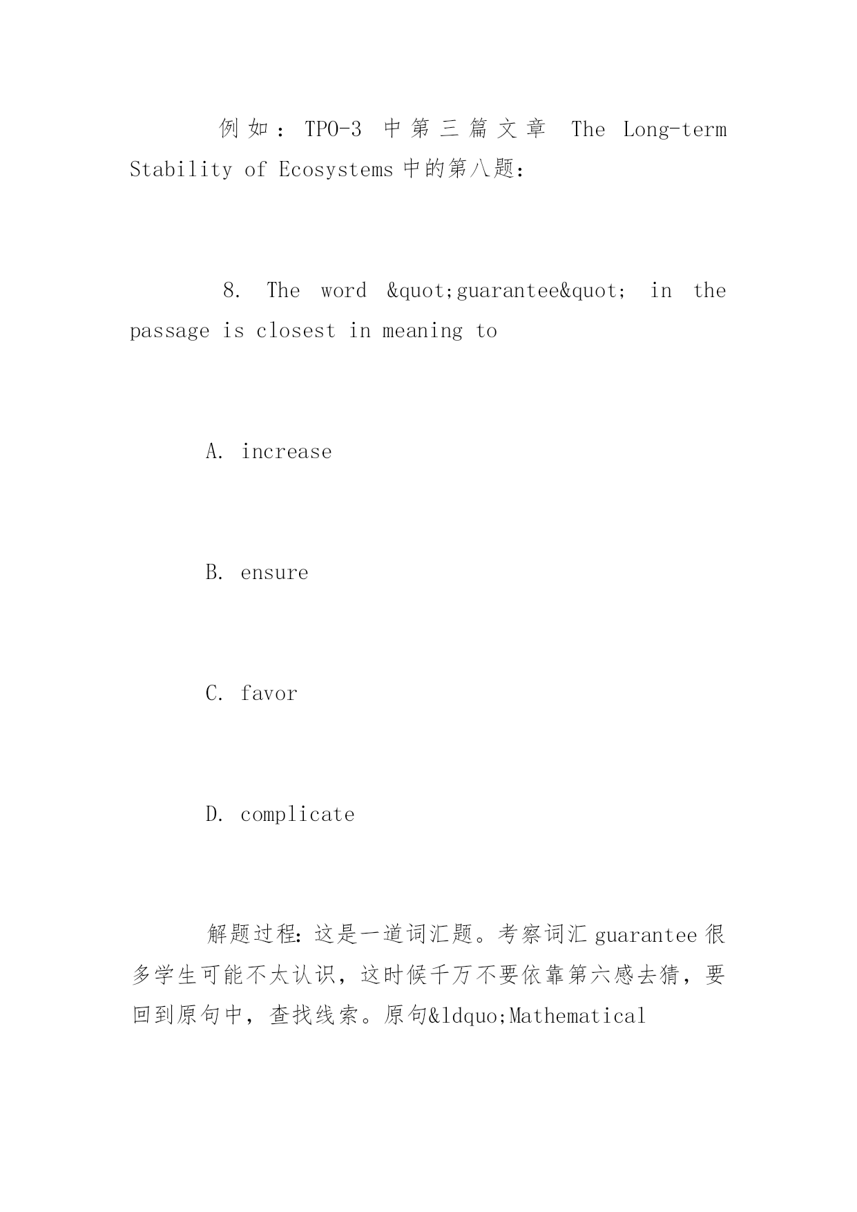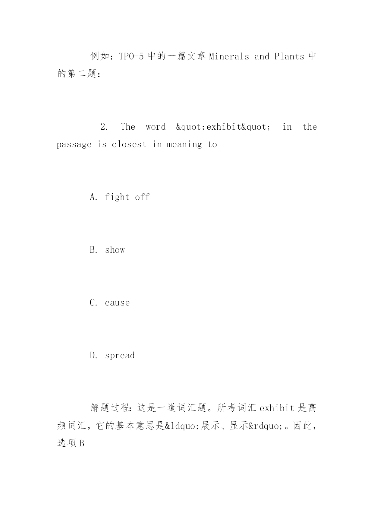 托福阅读词汇题详解 iBT阅读词汇题指的是从语言环境(简称语境)中理解词汇。语境在这里又称上下文。英语单词常常是一词多义,词汇题除了考察考生是否具备一定单词量以外,还测试考生在一定语境下准确理解词义的能力。词汇题是托福阅读考试中出现频率很高的一类题型,每篇阅读会涉及到4-5个词汇题。因此,阅读要拿高分掌握这类题型的做题方法尤为重要。新托福的变化在于单词的难度降低,而灵活性却大大增加。新托福更侧重考生的阅读能力,而不是单纯的考查某一个孤立的语言点。很多考生觉得这个题型在备考中的准备量很大,需要记很多单词,但在考试时还是有涉及不到的单词。所以在这篇文章中,笔者将着重跟大家探讨一下词汇题的解题技巧。 词汇题常见题目形式: Theword/phrase…inthepassageisclosestinmeaningto… Theword/phrase…inthepassagemeans… Theword/phrase…inparagraph… Refersto…whatis…? 或许,很多同学会说我的词汇量非常有限,在考试中遇到这种词汇题,如果不认识就无计可施,只能靠第六感了。其实,托福阅读中涉及到的词汇题还是有一定的解题规律的,以下将分两种类型进行讲解: 一、熟悉的词汇 当所考词汇是你认识的词时,分两步:直接在所给的四个选项中找出相近词;将选定的选项代入考察词汇所在的原文语境中,验证是否符合句意,以防止一词多义的情况。 例如:TPO-5中的一篇文章MineralsandPlants中的第二题: 2.Theword"exhibit"inthepassageisclosestinmeaningto A.fightoff B.show C.cause D.spread 解题过程:这是一道词汇题。所考词汇exhibit是高频词汇,它的基本意思是“展示、显示”。因此,选项B show是exhibit的同义词;将其代入exhibit所在的语境中进行验证,原句“Nitrogen-deficientplantsexhibitmany ofthesymptomsjustdescribed.”可提取主干(Plantsexhibit symptoms),将选项B代入即“植物显示症状”符合语境,因此,选项B正确。 二、不认识的词汇 遇到不认识的词汇,千万不要归因于自己词汇量不足,无计可施进而放弃。托福阅读中的词汇题存在一定的推理规律,这时候要采取以下措施:找到考察词汇所在的句子,寻找推理线索(95%的词汇题都暗含线索),由线索得出的关联信息,分析句意或主干进行推理判断及排除。 例如:TPO-3中第三篇文章TheLong-termStabilityofEcosystems中的第八题: 8.Theword"guarantee"inthepassageisclosestinmeaningto A.increase B.ensure C.favor D.complicate 解题过程:这是一道词汇题。考察词汇guarantee很多学生可能不太认识,这时候千万不要依靠第六感去猜,要回到原句中,查找线索。原句“Mathematical modelsofecosystemslikewisesuggestthatpersitydoesnotguarantee ecosystemstability—justtheopposite,infact.”存在两处线索:1.suggest that(表明)…可见此that句为观点结论句;2. likewise指“也、同样”。由以上两点线索可知:上一句肯定出现过相似的观点结论句,只有这样,此句才会说“同样表明…”。此句的上一句为“Ingeneral, persity,byitself,doesnotensurestability.”由in general可知这是典型的结论句,主干为“persitydoesnotensurestability.”而考察句的结论为“persity doesnotguaranteeecosystemstability.”由此推理可得出,选项B正确。 例二:本篇文章中第十题: 10.Theword“pales”inthepassageisclosestinmeaningto A.inc