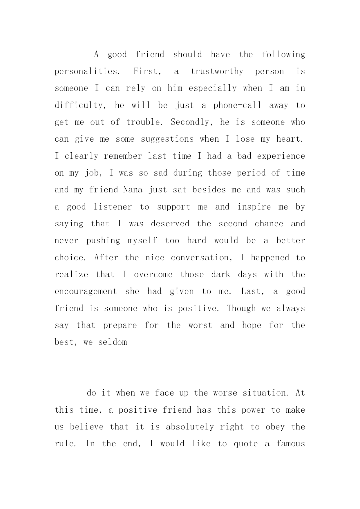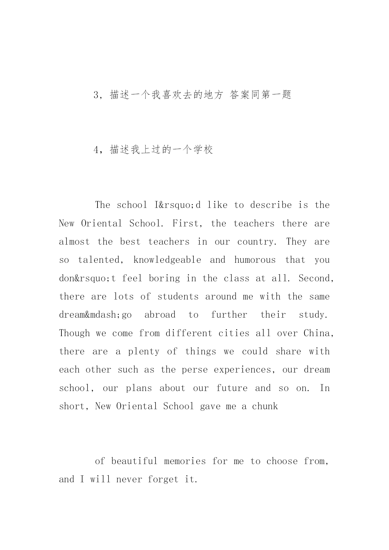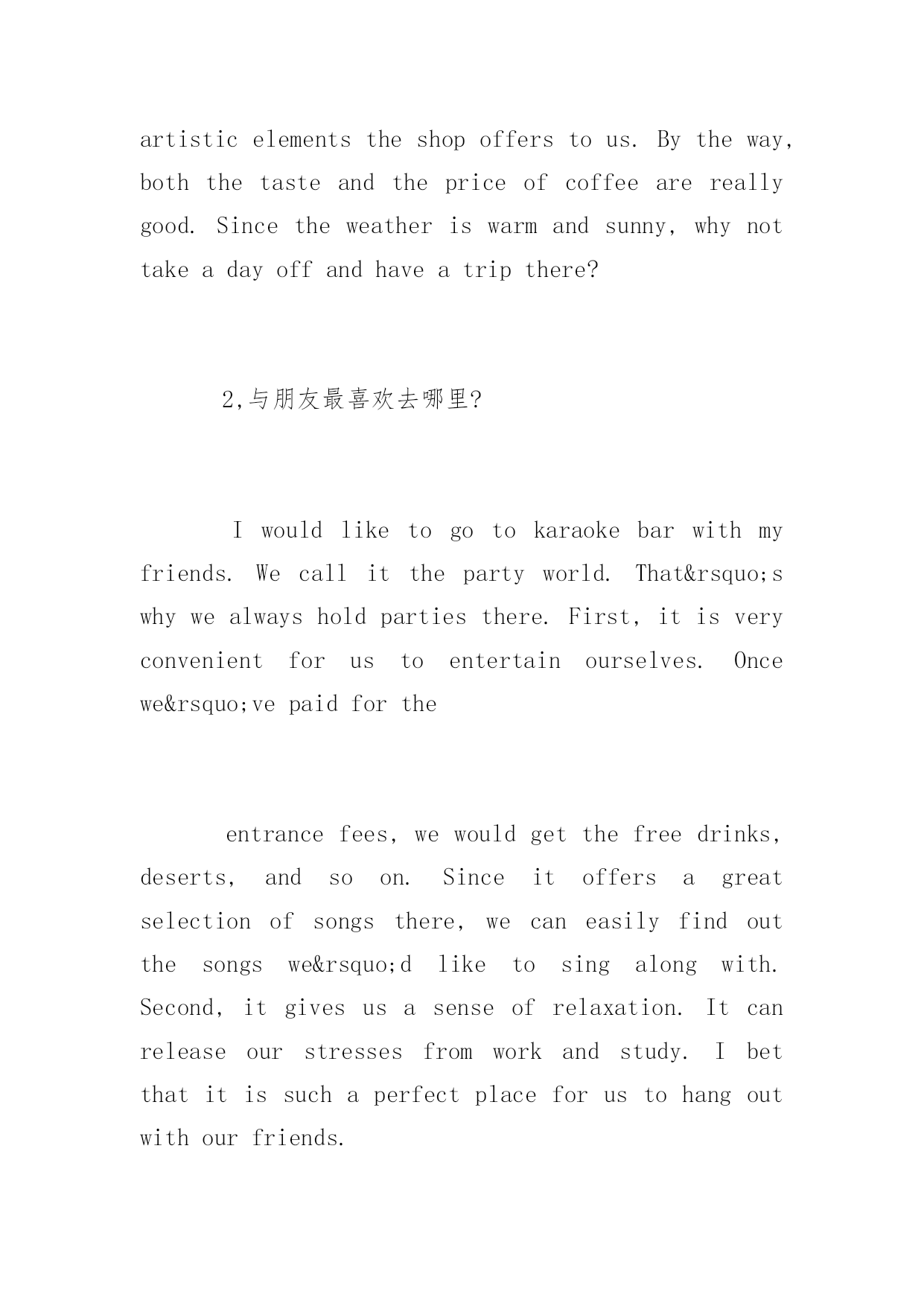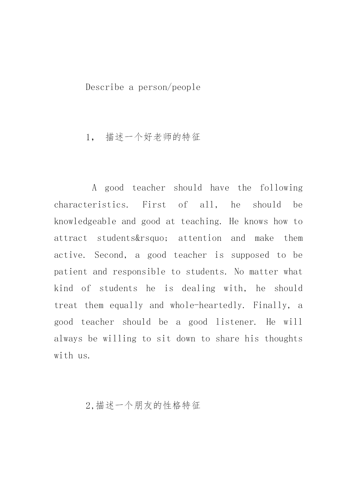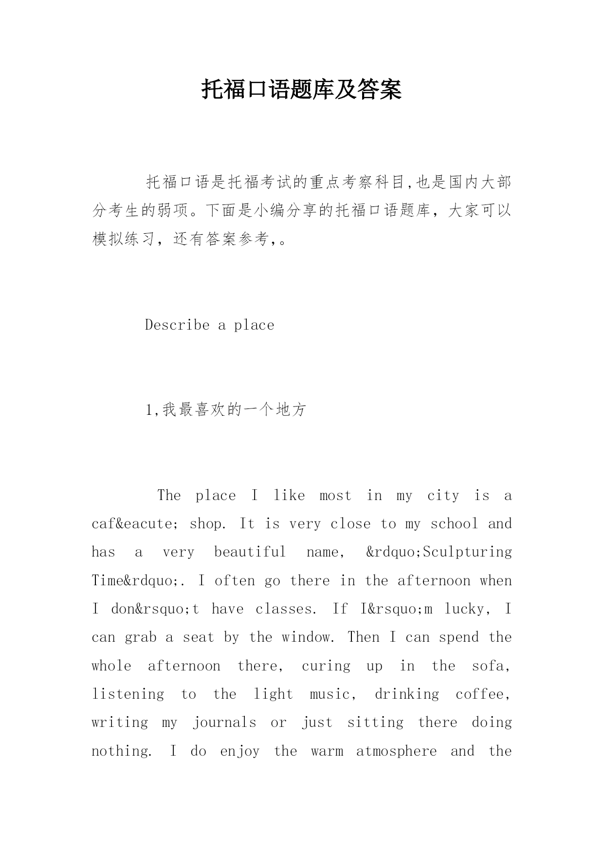 托福口语题库及答案 托福口语是托福考试的重点考察科目,也是国内大部分考生的弱项。下面是小编分享的托福口语题库,大家可以模拟练习,还有答案参考,。 Describeaplace 1,我最喜欢的一个地方 TheplaceIlikemostinmycityisacaféshop.Itisveryclosetomyschoolandhasaverybeautifulname,”SculpturingTime”.IoftengothereintheafternoonwhenIdon’thaveclasses.IfI’mlucky,Icangrabaseatbythewindow.ThenIcanspendthewholeafternoonthere,curingupinthesofa,listeningtothelightmusic,drinkingcoffee,writingmyjournalsorjustsittingtheredoingnothing.Idoenjoythewarmatmosphereandtheartisticelementstheshopofferstous.Bytheway,boththetasteandthepriceofcoffeearereallygood.Sincetheweatheriswarmandsunny,whynottakeadayoffandhaveatripthere? 2,与朋友最喜欢去哪里? Iwouldliketogotokaraokebarwithmyfriends.Wecallitthepartyworld.That’swhywealwaysholdpartiesthere.First,itisveryconvenientforustoentertainourselves.Oncewe’vepaidforthe entrancefees,wewouldgetthefreedrinks,deserts,andsoon.Sinceitoffersagreatselectionofsongsthere,wecaneasilyfindoutthesongswe’dliketosingalongwith.Second,itgivesusasenseofrelaxation.Itcanreleaseourstressesfromworkandstudy.Ibetthatitissuchaperfectplaceforustohangoutwithourfriends. 3,描述一个我喜欢去的地方答案同第一题 4,描述我上过的一个学校 TheschoolI’dliketodescribeistheNewOrientalSchool.First,theteacherstherearealmostthebestteachersinourcountry.Theyaresotalented,knowledgeableandhumorousthatyoudon’tfeelboringintheclassatall.Second,therearelotsofstudentsaroundmewiththesamedream—goabroadtofurthertheirstudy.ThoughwecomefromdifferentcitiesalloverChina,thereareaplentyofthingswecouldsharewitheachothersuchastheperseexperiences,ourdreamschool,ourplansaboutourfutureandsoon.Inshort,NewOrientalSchoolgavemeachunk ofbeautifulmemoriesformetochoosefrom,andIwillneverforgetit. Describeaperson/people 1,描述一个好老师的特征 Agoodteachershouldhavethefollowingcharacteristics.Firstofall,heshouldbeknowledgeableandgoodatteaching.Heknowshowtoattractstudents’attentionandmakethemactive.Second,agoodteacherissupposedtobepatientandresponsibletostudents.Nomatterwhatkindofstudentsheisd