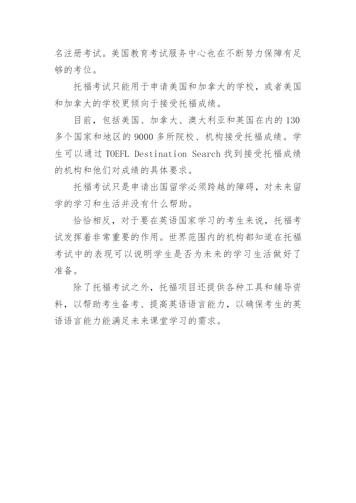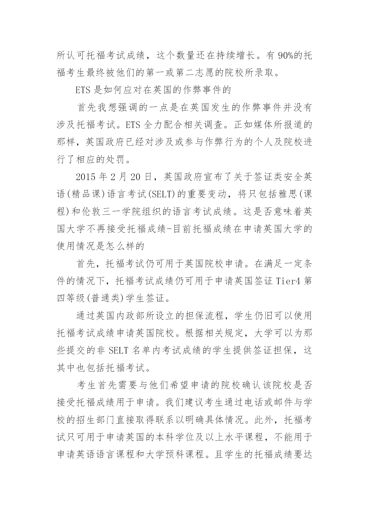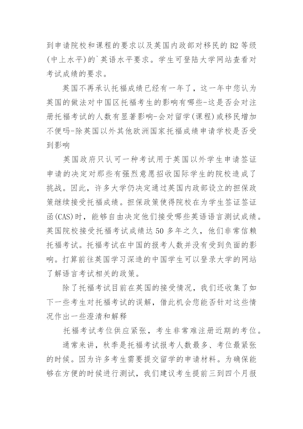 申请英国留学托福考试的介绍 英国留学仍可用托福成绩。近期,针对国内许多预备参加托福考试,尤其是想用托福成绩申请英国院校的学生来说,英国高校是否认可托福考试成绩成为大家关心的焦点问题。借此机会,我们看看美国教育考试服务中心(ETS)高等教育部副总裁及首席运营官DavidPayne怎么说。在中国,托福考试有很高的认知度。但是对于那些对托福考试并不很熟悉的读者,可否请您简要介绍一下-托福考试具体考察考生的哪些能力-考试成绩的使用范围包括哪些我们在2015年推出了新托福考试。该考试对考生听、说、读、写四方面的技能进行了全方位的衡量,并且要求考生综合运用这些技能进行有效的沟通。这些技能是他们今后在课堂学习中需要用到的。托福考试主要衡量学生实际使用语言的熟练程度,而不仅仅是他们对这门语言的了解程度。我们的考试题目主要是考察他们综合运用各种语言技能的能力。举例来说,考生可能会被要求阅读一段较短的学术文章,听一段相同话题的演讲,然后说出他们所读到和听到的内容。这与国外大学的日常课堂环境中十分相似,学生如能顺利完成任务,便有足够的信心应对未来课堂中对语言能力的要求。托福考试能够帮助考生脱颖而出,主要因为其在质量、公正性和百分百的学术内容方面的卓越声誉。目前有超过130个国家和地区的9000所大学、机构、奖学金项目和院校所认可托福考试成绩,这个数量还在持续增长。有90%的托福考生最终被他们的第一或第二志愿的院校所录取。ETS是如何应对在英国的作弊事件的首先我想强调的一点是在英国发生的作弊事件并没有涉及托福考试。ETS全力配合相关调查。正如媒体所报道的那样,英国政府已经对涉及或参与作弊行为的个人及院校进行了相应的处罚。2015年2月20日,英国政府宣布了关于签证类安全英语(精品课)语言考试(SELT)的重要变动,将只包括雅思(课程)和伦敦三一学院组织的语言考试成绩。这是否意味着英国大学不再接受托福成绩-目前托福成绩在申请英国大学的使用情况是怎么样的首先,托福考试仍可用于英国院校申请。在满足一定条件的情况下,托福考试成绩仍可用于申请英国签证Tier4第四等级(普通类)学生签证。通过英国内政部所设立的担保流程,学生仍旧可以使用托福考试成绩申请英国院校。根据相关规定,大学可以为那些提交的非SELT名单内考试成绩的学生提供签证担保,这其中也包括托福考试。考生首先需要与他们希望申请的院校确认该院校是否接受托福成绩用于申请。我们建议考生通过电话或邮件与学校的招生部门直接取得联系以明确具体情况。此外,托福考试只可用于申请英国的本科学位及以上水平课程,不能用于申请英语语言课程和大学预科课程。且学生的托福成绩要达到申请院校和课程的要求以及英国内政部对移民的B2等级(中上水平)的`英语水平要求。学生可登陆大学网站查看对考试成绩的要求。英国不再承认托福成绩已经有一年了,这一年中您认为英国的做法对中国区托福考生的影响有哪些-这是否会对注册托福考试的人数有显著影响-会对留学(课程)或移民增加不便吗-除英国以外其他欧洲国家托福成绩申请学校是否受到影响英国政府只认可一种考试用于英国以外学生申请签证申请的决定对那些有强烈意愿招收国际学生的院校造成了挑战。因此,许多大学仍决定通过英国内政部设立的担保政策继续接受托福成绩。担保政策使得院校在为学生签证签证函(CAS)时,能够自由决定他们接受哪些英语语言测试成绩。英国院校接受托福考试成绩达50多年之久,他们非常信赖托福考试。托福考试在中国的报考人数并没有受到负面的影响。打算前往英国学习深造的中国学生可以登录大学的网站了解语言考试相关的政策。除了托福考试目前在英国的接受情况,我们还收集了如下一些考生对托福考试的误解,借此机会您能否针对这些情况作出一些澄清和解释托福考试考位供应紧张,考生非常难注册近期的考位。通常来讲,秋季是托福考试报考人数最多、考位最紧张的时候。因为许多考生需要提交留学的申请材料。为确保能够在方便的时候进行测试,我们建议考生提前三到四个月报名注册考试。美国教育考试服务中心也在不断努力保障有足够的考位。托福考试只能用于申请美国和加拿大的学校,或者美国和加拿大的学校更倾向于接受托福成绩。目前,包括美国、加拿大、澳大利亚和英国在内的130多个国家和地区的9000多所院校、机构接受托福成绩。学生可以通过TOEFLDestinationSearch找到接受托福成绩的机构和他们对成绩的具体要求。托福考试只是申请出国留学必须跨越的障碍,对未来留学的学习和生活并没有什么帮助。恰恰相反,对于要在英语国家学习的考生来说,托福考试发挥着非常重要的作用。世界范围内的机构都知道在托福考试中的表现可以说明学生是否为未来的学习生活做好了准备。除了托福考试之外,托福项目还提供各种工具和辅导资料,以帮助考生备考、提高英语语言能力,以确保考生的英语语言能力