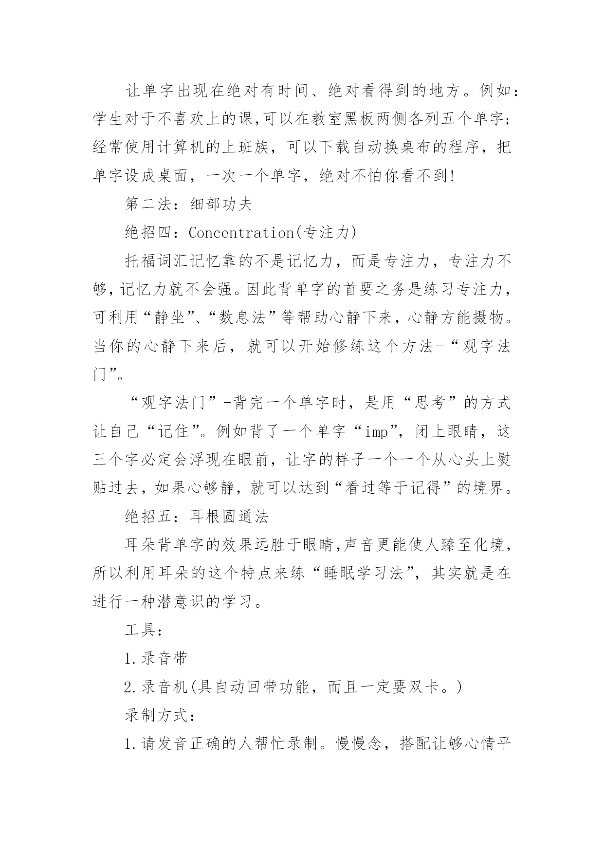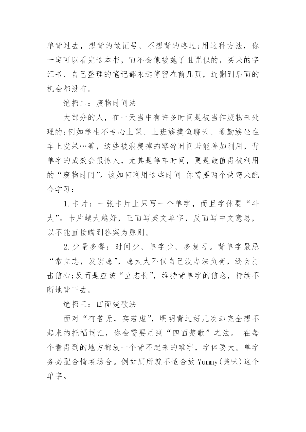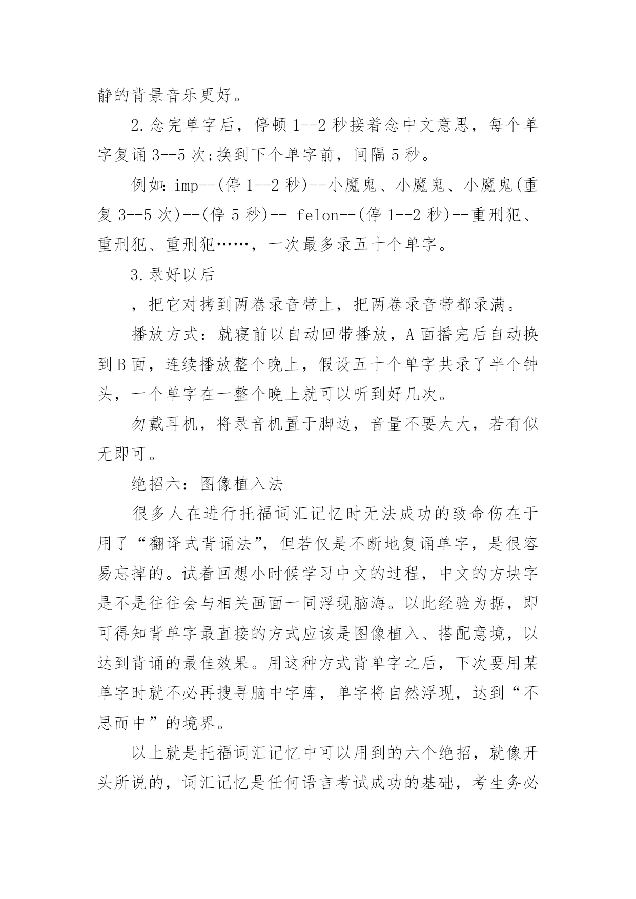托福词汇记忆绝妙方法 掌握托福单词是成功学习TOEFL的基础,没有了单词这个基础,接下来的会话、文法、阅读、写作都将无法顺利进行,因此在托福的复习中,“如何背单词”是绝不可忽略的首要之务,托福词汇记忆绝招将助你登上巅峰。第一法:基本功准备一本字汇书(或一本笔记),这本书(或笔记)的结构应该是:英文在最左边的位置,中文在最右边;中间则要空下来写“提示”,提示这个字“怎么背”。背单字的方法依每个字汇的不同,可能是依据字根、谐音、形状、例句等…完成工具的准备后,就可以开始背单字的工程。imp小魔鬼Vfelonfelonfelon念起来像“坏人”所以是重罪犯。重罪犯首先看到第一个字imp,在脑中我们可先自行加以判断:这个字“背”或“不背”,如果“不背”就跳过去,也不用做任何记号。再看到第二个字“重罪犯”:如果觉得很好背就背,不想背就跳过去,这一点很重要。背单字三秘诀:好背的才背、想背的才背、有时间才背。“重罪犯”怎么背felon的谐音听起来是不是很像“坏人”掌握了背这个字的诀窍后,这个字就被归于“好背”的部份;背起来了,就在旁边打个勾勾、做个记号。一本托福词汇书(笔记),就用这种轻松的'心情简简单单背过去,想背的做记号、不想背的略过;用这种方法,你一定可以看完这本书,而不会像被施了咀咒似的,买来的字汇书、自己整理的笔记都永远停留在前几页,连翻到后面的机会都没有。绝招二:废物时间法大部分的人,在一天当中有许多时间是被当作废物来处理的;例如学生不专心上课、上班族摸鱼聊天、通勤族坐在车上发呆…等,这些被浪费掉的零碎时间若能善加利用,背单字的成效会很惊人,尤其是等车时间,更是最值得被利用的“废物时间”。该如何利用这些时间你需要两个诀窍来配合学习:1.卡片:一张卡片上只写一个单字,而且字体要“斗大”。卡片越大越好,正面写英文单字,反面写中文意思,以不能直接瞄到答案为原则。2.少量多餐:时间少、单字少、多复习。背单字最忌“常立志,发宏愿”,愿太大不仅自己没办法负荷,还会打击信心;反而是应该“立志长”,维持背单字的信念,持续不断地背下去。绝招三:四面楚歌法面对“有若无,实若虚”,明明背过好几次却完全想不起来的托福词汇,你会需要用到“四面楚歌”之法。在每个看得到的地方都放一个背不起来的难字,字体要大。单字务必配合情境场合。例如厕所就不适合放Yummy(美味)这个单字。让单字出现在绝对有时间、绝对看得到的地方。例如:学生对于不喜欢上的课,可以在教室黑板两侧各列五个单字;经常使用计算机的上班族,可以下载自动换桌布的程序,把单字设成桌面,一次一个单字,绝对不怕你看不到!第二法:细部功夫绝招四:Concentration(专注力)托福词汇记忆靠的不是记忆力,而是专注力,专注力不够,记忆力就不会强。因此背单字的首要之务是练习专注力,可利用“静坐”、“数息法”等帮助心静下来,心静方能摄物。当你的心静下来后,就可以开始修练这个方法-“观字法门”。“观字法门”-背完一个单字时,是用“思考”的方式让自己“记住”。例如背了一个单字“imp”,闭上眼睛,这三个字必定会浮现在眼前,让字的样子一个一个从心头上熨贴过去,如果心够静,就可以达到“看过等于记得”的境界。绝招五:耳根圆通法耳朵背单字的效果远胜于眼睛,声音更能使人臻至化境,所以利用耳朵的这个特点来练“睡眠学习法”,其实就是在进行一种潜意识的学习。工具:1.录音带2.录音机(具自动回带功能,而且一定要双卡。)录制方式:1.请发音正确的人帮忙录制。慢慢念,搭配让够心情平静的背景音乐更好。2.念完单字后,停顿1--2秒接着念中文意思,每个单字复诵3--5次;换到下个单字前,间隔5秒。例如:imp--(停1--2秒)--小魔鬼、小魔鬼、小魔鬼(重复3--5次)--(停5秒)--felon--(停1--2秒)--重刑犯、重刑犯、重刑犯……,一次最多录五十个单字。3.录好以后,把它对拷到两卷录音带上,把两卷录音带都录满。播放方式:就寝前以自动回带播放,A面播完后自动换到B面,连续播放整个晚上,假设五十个单字共录了半个钟头,一个单字在一整个晚上就可以听到好几次。勿戴耳机,将录音机置于脚边,音量不要太大,若有似无即可。绝招六:图像植入法很多人在进行托福词汇记忆时无法成功的致命伤在于用了“翻译式背诵法”,但若仅是不断地复诵单字,是很容易忘掉的。试着回想小时候学习中文的过程,中文的方块字是不是往往会与相关画面一同浮现脑海。以此经验为据,即可得知背单字最直接的方式应该是图像植入、搭配意境,以达到背诵的最佳效果。用这种方式背单字之后,下次要用某单字时就不必再搜寻脑中字库,单字将自然浮现,达到“不思而中”的境界。以上就是托福词汇记忆中可以用到的六个绝招,就像开头所说的,词汇记忆是任何语言考试成功的基础,考生务必要扎实托福词汇的基础。
