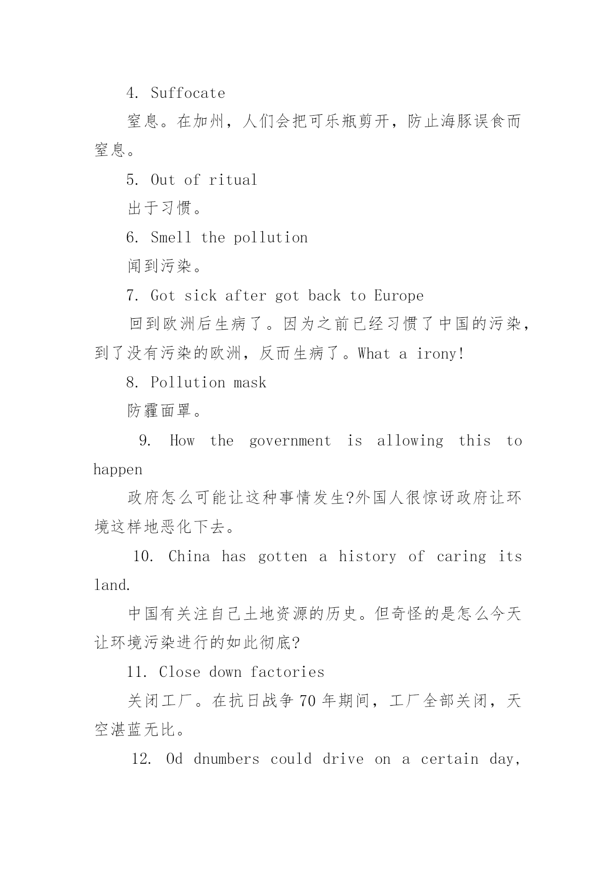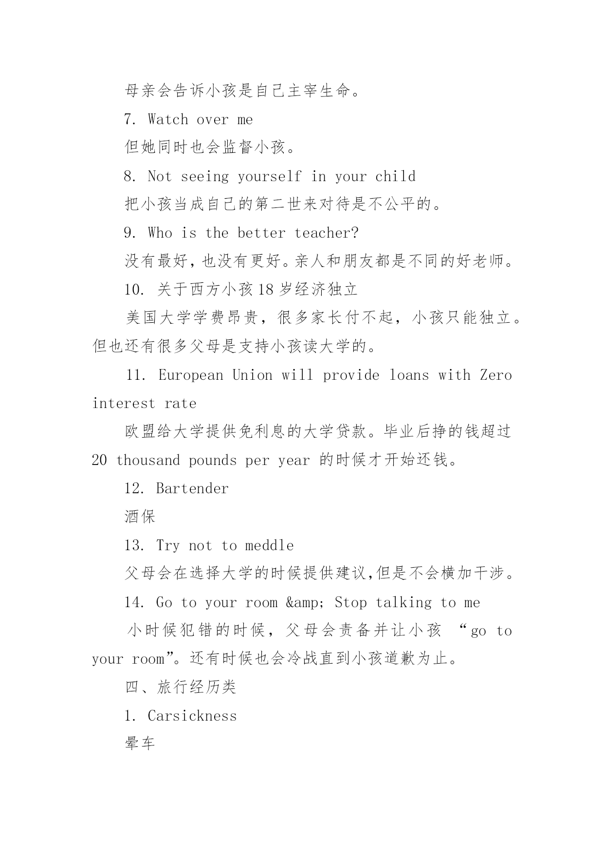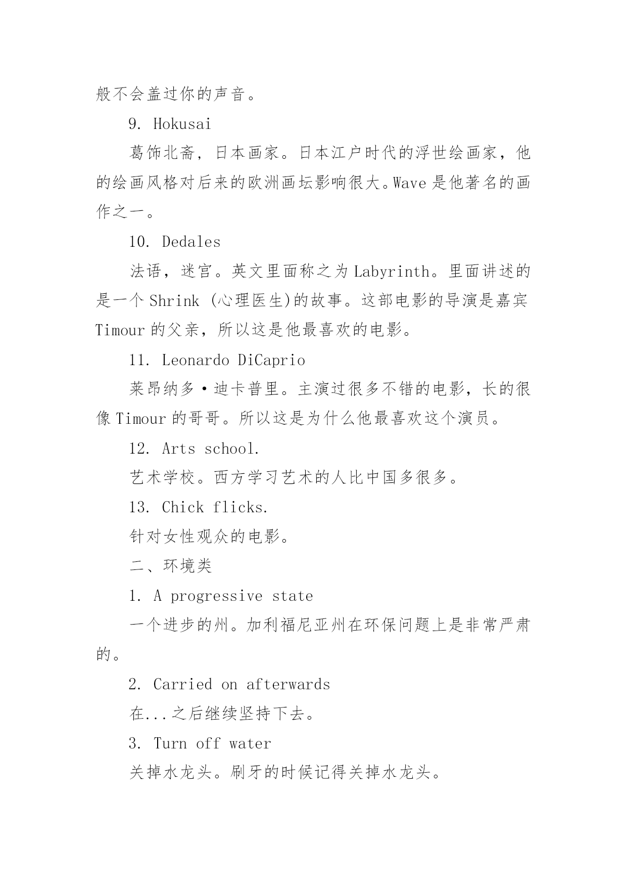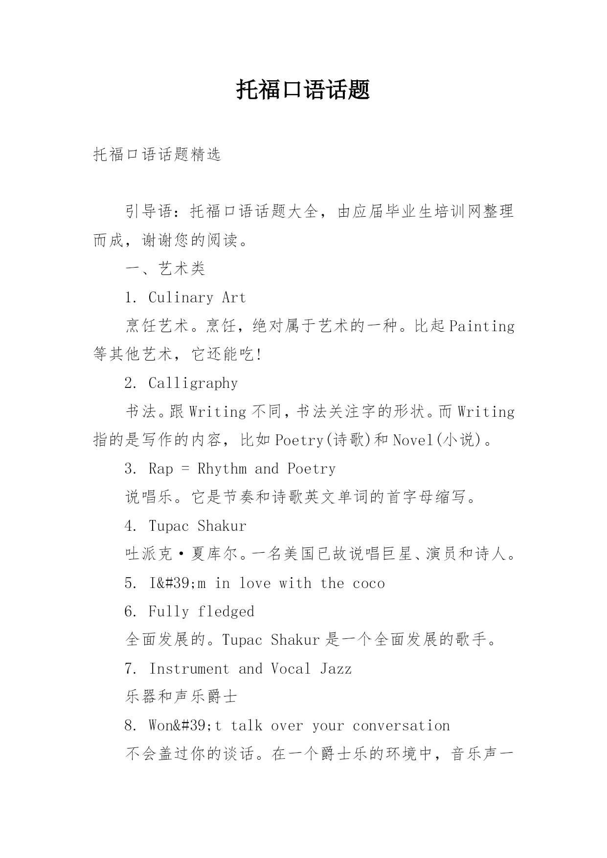托福口语话题 托福口语话题精选引导语:托福口语话题大全,由应届毕业生培训网整理而成,谢谢您的阅读。一、艺术类1.CulinaryArt烹饪艺术。烹饪,绝对属于艺术的一种。比起Painting等其他艺术,它还能吃!2.Calligraphy书法。跟Writing不同,书法关注字的形状。而Writing指的是写作的内容,比如Poetry(诗歌)和Novel(小说)。3.Rap=RhythmandPoetry说唱乐。它是节奏和诗歌英文单词的首字母缩写。4.TupacShakur吐派克·夏库尔。一名美国已故说唱巨星、演员和诗人。5.I'minlovewiththecoco6.Fullyfledged全面发展的。TupacShakur是一个全面发展的歌手。7.InstrumentandVocalJazz乐器和声乐爵士8.Won'ttalkoveryourconversation不会盖过你的谈话。在一个爵士乐的环境中,音乐声一般不会盖过你的声音。9.Hokusai葛饰北斋,日本画家。日本江户时代的浮世绘画家,他的绘画风格对后来的欧洲画坛影响很大。Wave是他著名的画作之一。10.Dedales法语,迷宫。英文里面称之为Labyrinth。里面讲述的是一个Shrink(心理医生)的故事。这部电影的导演是嘉宾Timour的父亲,所以这是他最喜欢的电影。11.LeonardoDiCaprio莱昂纳多·迪卡普里。主演过很多不错的电影,长的很像Timour的哥哥。所以这是为什么他最喜欢这个演员。12.Artsschool.艺术学校。西方学习艺术的人比中国多很多。13.Chickflicks.针对女性观众的电影。二、环境类1.Aprogressivestate一个进步的州。加利福尼亚州在环保问题上是非常严肃的。2.Carriedonafterwards在...之后继续坚持下去。3.Turnoffwater关掉水龙头。刷牙的时候记得关掉水龙头。4.Suffocate窒息。在加州,人们会把可乐瓶剪开,防止海豚误食而窒息。5.Outofritual出于习惯。6.Smellthepollution闻到污染。7.GotsickaftergotbacktoEurope回到欧洲后生病了。因为之前已经习惯了中国的污染,到了没有污染的欧洲,反而生病了。Whatairony!8.Pollutionmask防霾面罩。9.Howthegovernmentisallowingthistohappen政府怎么可能让这种事情发生?外国人很惊讶政府让环境这样地恶化下去。10.Chinahasgottenahistoryofcaringitsland.中国有关注自己土地资源的历史。但奇怪的是怎么今天让环境污染进行的如此彻底?11.Closedownfactories关闭工厂。在抗日战争70年期间,工厂全部关闭,天空湛蓝无比。12.Oddnumberscoulddriveonacertainday,whilecarswithlicensenumberfinishinginevennumberscoulddriveanotherday单双号限行。5个中文字居然翻译出这么多英文,这不科学。13.Volunteertocleantheenvironment自愿清洁环境。14.Thisconcernseverybody.这事关每个人。环境治理,人人有责。三、家庭教育类1.Emotionalavailability父母不仅需要在小孩成长的时候陪在身边,更需要从精神上给小孩以支持。2.Afirmhand但是父母也需要立场坚定。当小孩做错的时候,父母也需要有一个坚定的立场。3.Toomuchfreedomkillsfreedom太多的自由也会杀死自由。听起来互相矛盾,实则非常有道理的一句话。4.Runintoawall没有约束的小孩迟早也有一天会撞到南墙。5.WhenIgotoofar,mymotherisgoingtoinvervene当小孩走的路太离谱时,母亲会进行干预。6.I'minchargeofmyownlife母亲会告诉小孩是自己主宰生命。7.Watchoverme但她同时也会监督小孩。8.Notseeingyourselfinyourchild把小孩当成自己的第二世来对待是不公平的。9.Whoisthebetterteacher?没有最好,也没有更好。亲人和朋友都是不同的好老师。10.关于西方小孩18岁经济独立美国大学学费昂贵,很多家长付不起,小孩只能独立。但也还有很多父母是支持小孩读大学的。11.EuropeanUnionwillprovideloanswithZerointerestrate欧盟给大学提供免利息的大学贷款。毕业后挣的钱超过20thousan