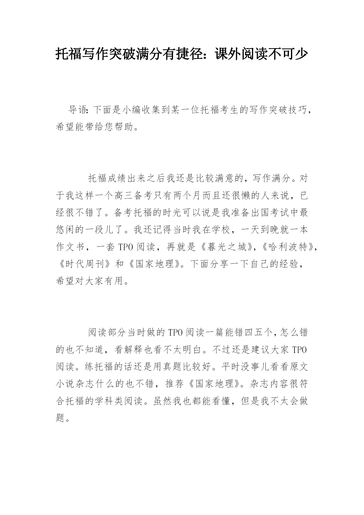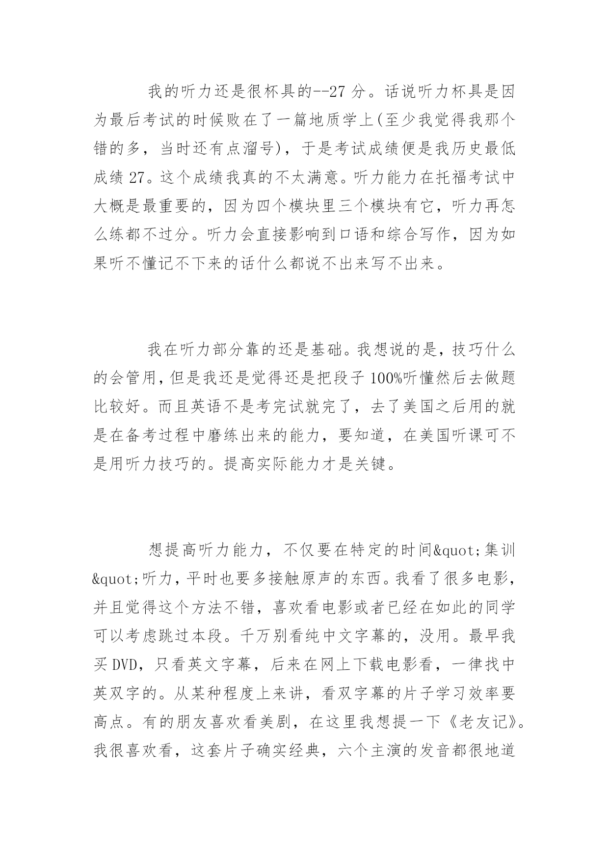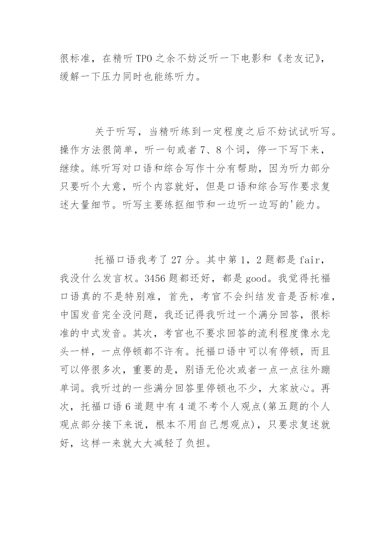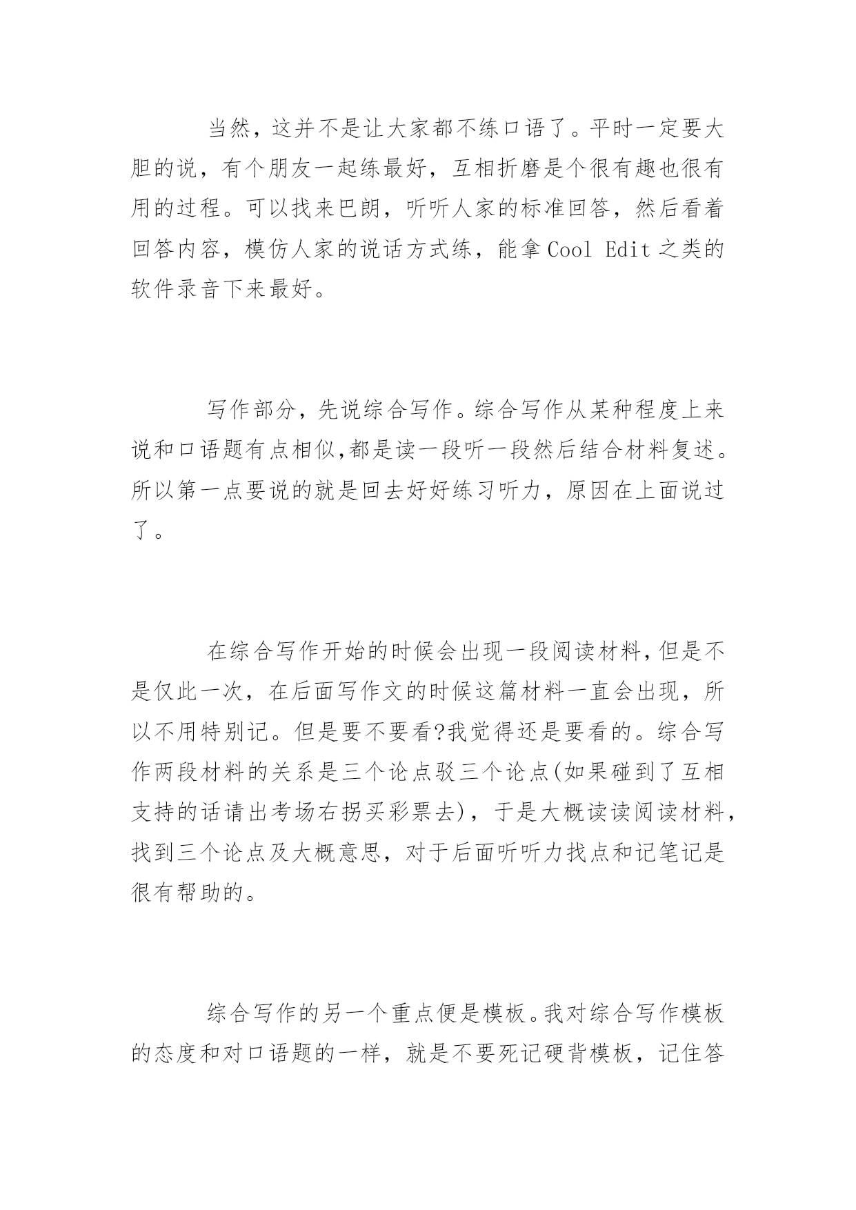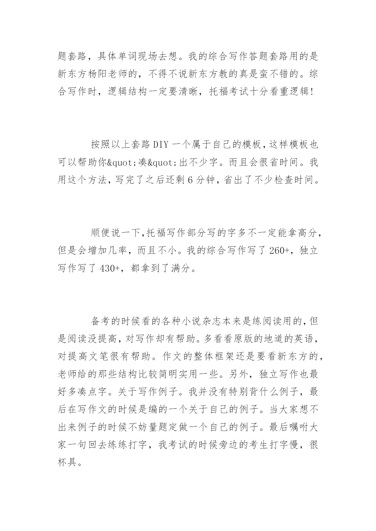 托福写作突破满分有捷径:课外阅读不可少 导语:下面是小编收集到某一位托福考生的写作突破技巧,希望能带给您帮助。 托福成绩出来之后我还是比较满意的,写作满分。对于我这样一个高三备考只有两个月而且还很懒的人来说,已经很不错了。备考托福的时光可以说是我准备出国考试中最悠闲的一段儿了。我还记得当时我在学校,一天到晚就一本作文书,一套TPO阅读,再就是《暮光之城》,《哈利波特》,《时代周刊》和《国家地理》。下面分享一下自己的经验,希望对大家有用。 阅读部分当时做的TPO阅读一篇能错四五个,怎么错的也不知道,看解释也看不太明白。不过还是建议大家TPO阅读。练托福的话还是用真题比较好。平时没事儿看看原文小说杂志什么的也不错,推荐《国家地理》。杂志内容很符合托福的学科类阅读。虽然我也都能看懂,但是我不太会做题。 我的听力还是很杯具的--27分。话说听力杯具是因为最后考试的时候败在了一篇地质学上(至少我觉得我那个错的多,当时还有点溜号),于是考试成绩便是我历史最低成绩27。这个成绩我真的不太满意。听力能力在托福考试中大概是最重要的,因为四个模块里三个模块有它,听力再怎么练都不过分。听力会直接影响到口语和综合写作,因为如果听不懂记不下来的话什么都说不出来写不出来。 我在听力部分靠的还是基础。我想说的是,技巧什么的会管用,但是我还是觉得还是把段子100%听懂然后去做题比较好。而且英语不是考完试就完了,去了美国之后用的就是在备考过程中磨练出来的能力,要知道,在美国听课可不是用听力技巧的。提高实际能力才是关键。 想提高听力能力,不仅要在特定的时间"集训"听力,平时也要多接触原声的东西。我看了很多电影,并且觉得这个方法不错,喜欢看电影或者已经在如此的同学可以考虑跳过本段。千万别看纯中文字幕的,没用。最早我买DVD,只看英文字幕,后来在网上下载电影看,一律找中英双字的。从某种程度上来讲,看双字幕的片子学习效率要高点。有的朋友喜欢看美剧,在这里我想提一下《老友记》。我很喜欢看,这套片子确实经典,六个主演的发音都很地道很标准,在精听TPO之余不妨泛听一下电影和《老友记》,缓解一下压力同时也能练听力。 关于听写,当精听练到一定程度之后不妨试试听写。操作方法很简单,听一句或者7、8个词,停一下写下来,继续。练听写对口语和综合写作十分有帮助,因为听力部分只要听个大意,听个内容就好,但是口语和综合写作要求复述大量细节。听写主要练抠细节和一边听一边写的'能力。 托福口语我考了27分。其中第1,2题都是fair,我没什么发言权。3456题都还好,都是good。我觉得托福口语真的不是特别难,首先,考官不会纠结发音是否标准,中国发音完全没问题,我还记得我听过一个满分回答,很标准的中式发音。其次,考官也不要求回答的流利程度像水龙头一样,一点停顿都不许有。托福口语中可以有停顿,而且可以停很多次,重要的是,别语无伦次或者一点一点往外蹦单词。我听过的一些满分回答里停顿也不少,大家放心。再次,托福口语6道题中有4道不考个人观点(第五题的个人观点部分接下来说,根本不用自己想观点),只要求复述就好,这样一来就大大减轻了负担。 当然,这并不是让大家都不练口语了。平时一定要大胆的说,有个朋友一起练最好,互相折磨是个很有趣也很有用的过程。可以找来巴朗,听听人家的标准回答,然后看着回答内容,模仿人家的说话方式练,能拿CoolEdit之类的软件录音下来最好。 写作部分,先说综合写作。综合写作从某种程度上来说和口语题有点相似,都是读一段听一段然后结合材料复述。所以第一点要说的就是回去好好练习听力,原因在上面说过了。 在综合写作开始的时候会出现一段阅读材料,但是不是仅此一次,在后面写作文的时候这篇材料一直会出现,所以不用特别记。但是要不要看?我觉得还是要看的。综合写作两段材料的关系是三个论点驳三个论点(如果碰到了互相支持的话请出考场右拐买彩票去),于是大概读读阅读材料,找到三个论点及大概意思,对于后面听听力找点和记笔记是很有帮助的。 综合写作的另一个重点便是模板。我对综合写作模板的态度和对口语题的一样,就是不要死记硬背模板,记住答题套路,具体单词现场去想。我的综合写作答题套路用的是新东方杨阳老师的,不得不说新东方教的真是蛮不错的。综合写作时,逻辑结构一定要清晰,托福考试十分看重逻辑! 按照以上套路DIY一个属于自己的模板,这样模板也可以帮助你"凑"出不少字。而且会很省时间。我用这个方法,写完了之后还剩6分钟,省出了不少检查时间。 顺便说一下,托福写作部分写的字多不一定能拿高分,但是会增加几率,而且不小。我的综合写作写了260+,独立写作写了430+,都拿到了满分。 备考的时候看的各种小说杂志本来是练阅读用的,但是阅读没提高,对写作却有帮助。多看看原版的地道的英
