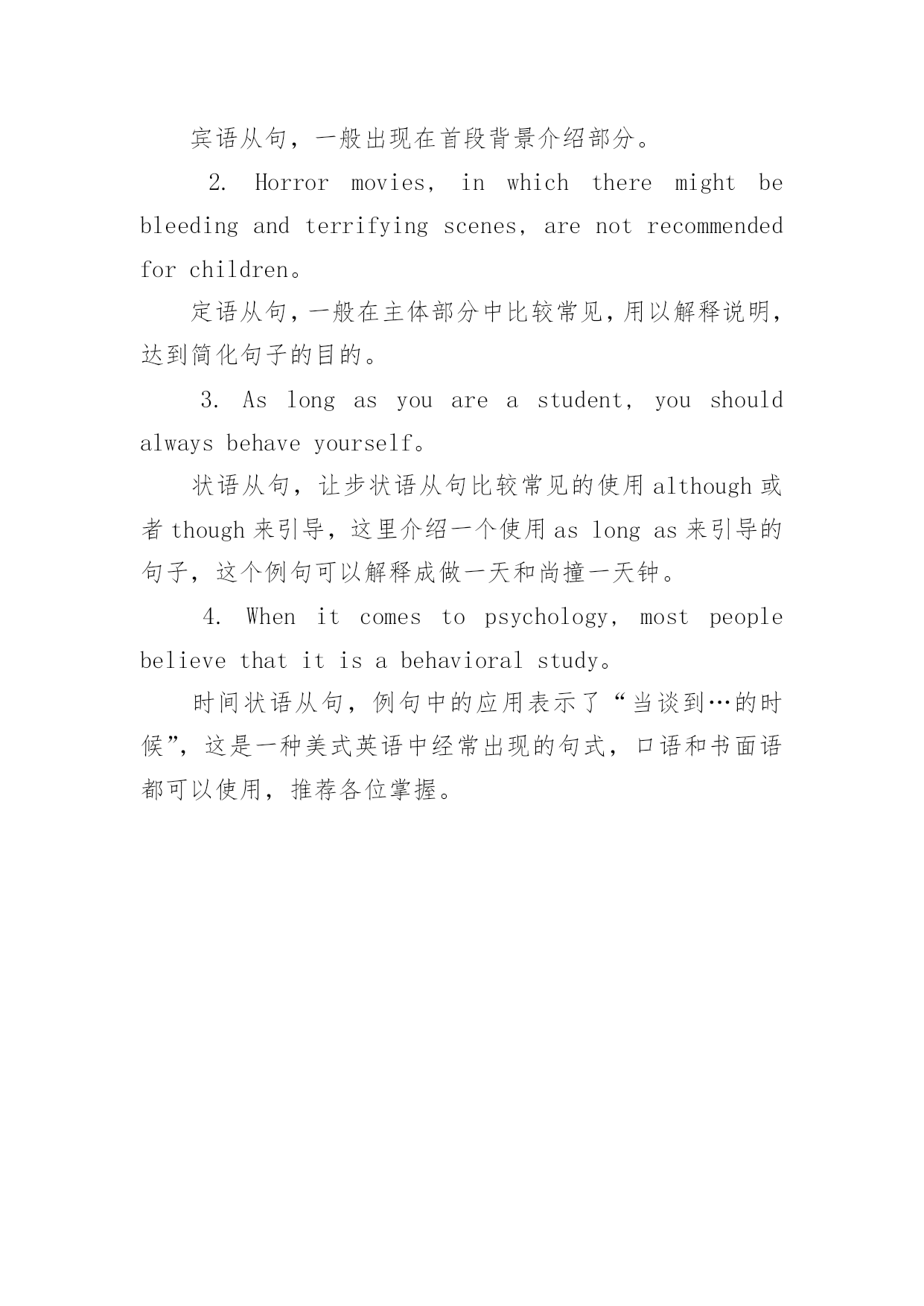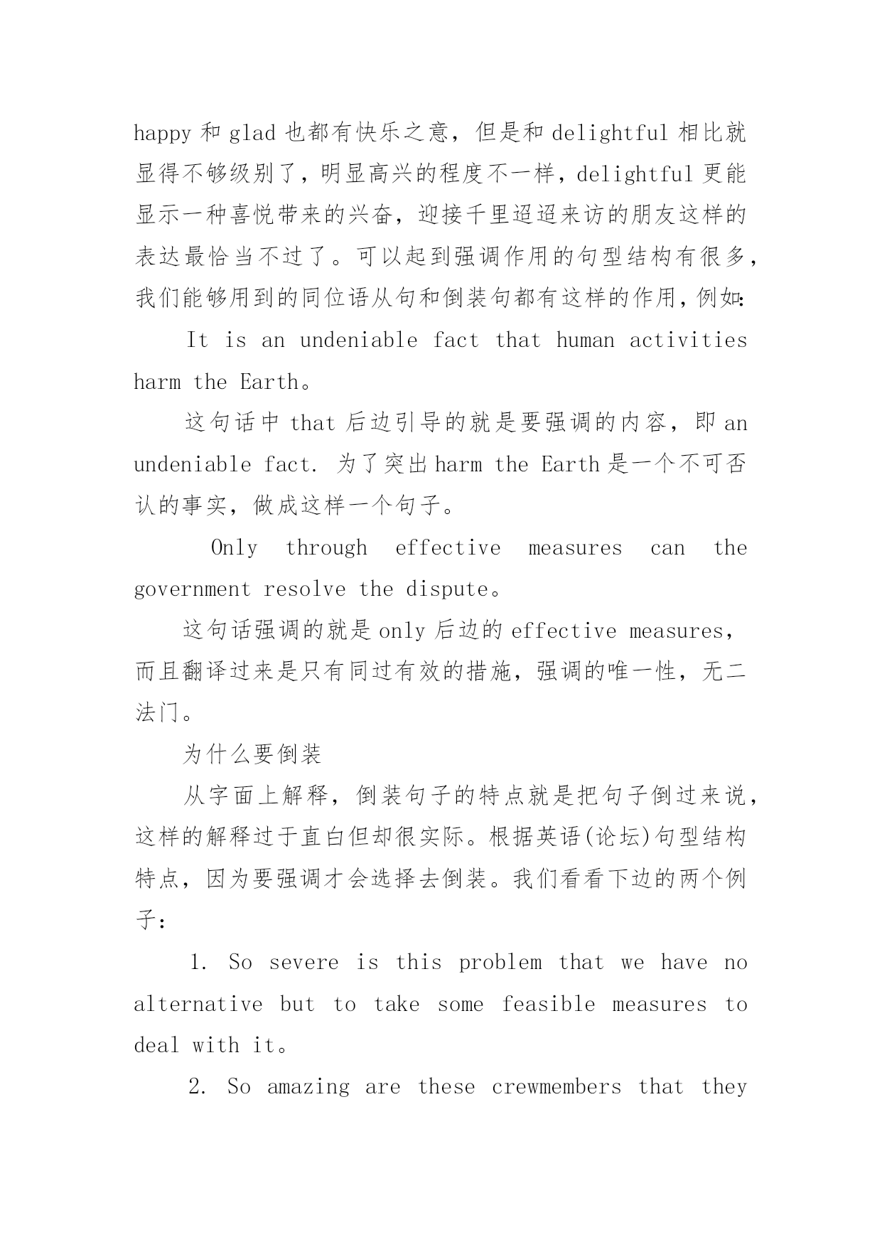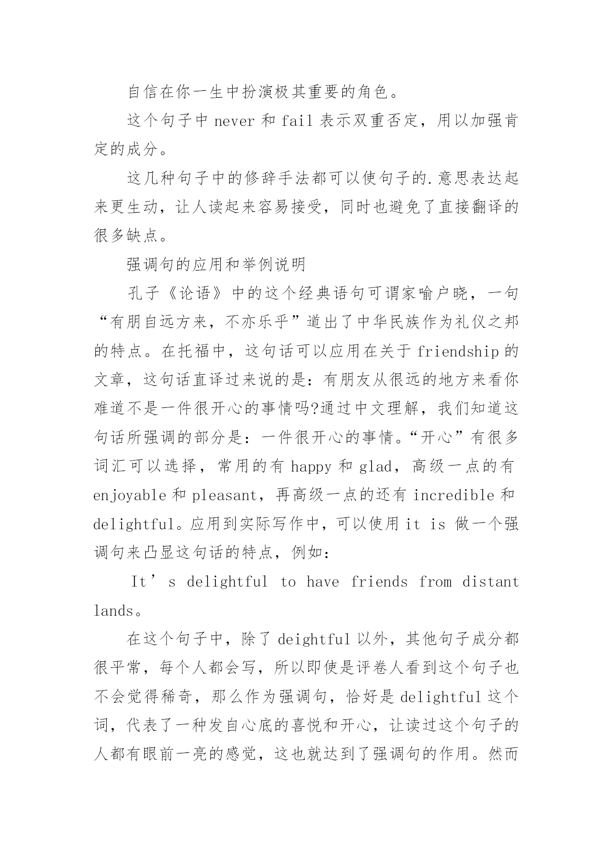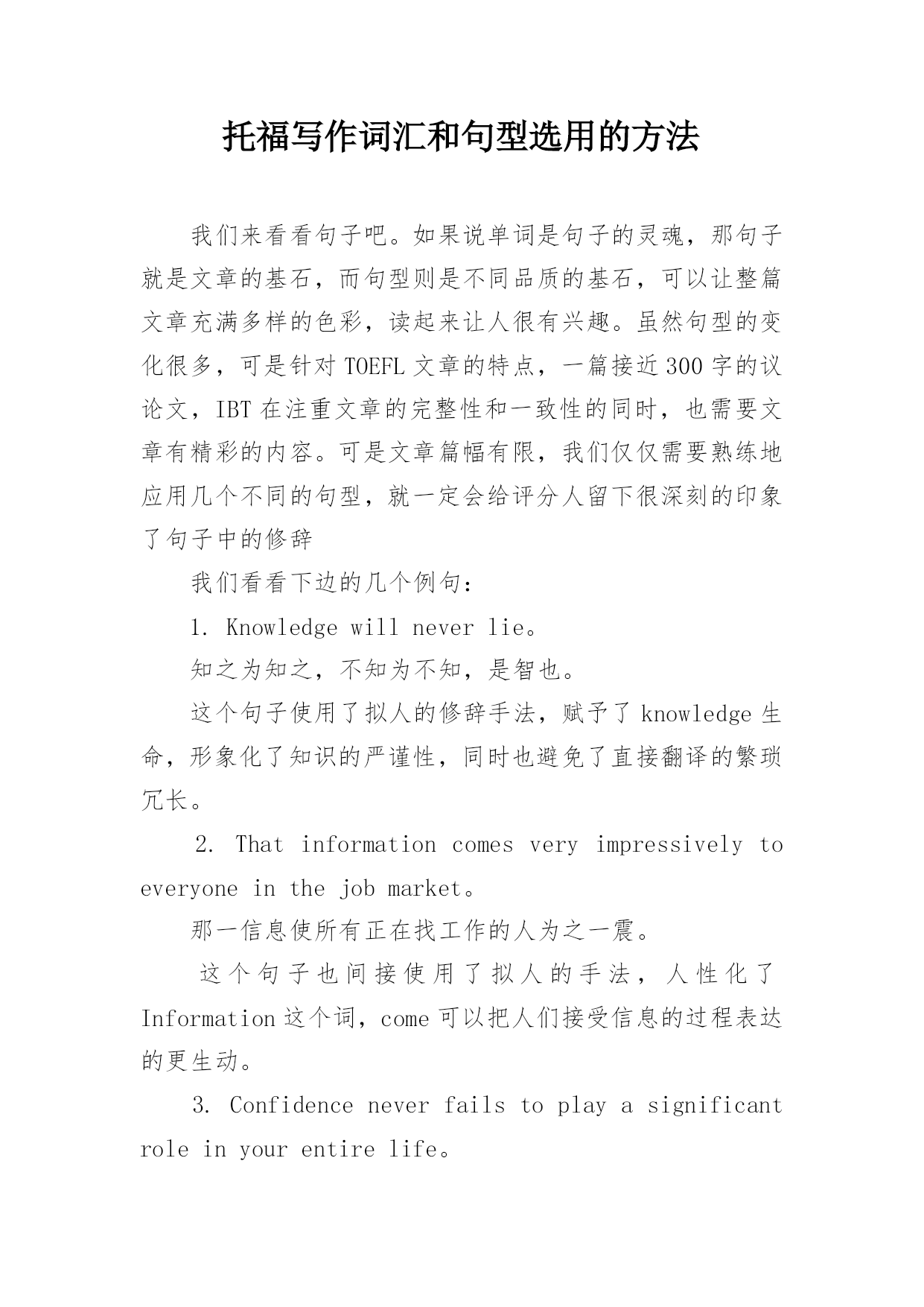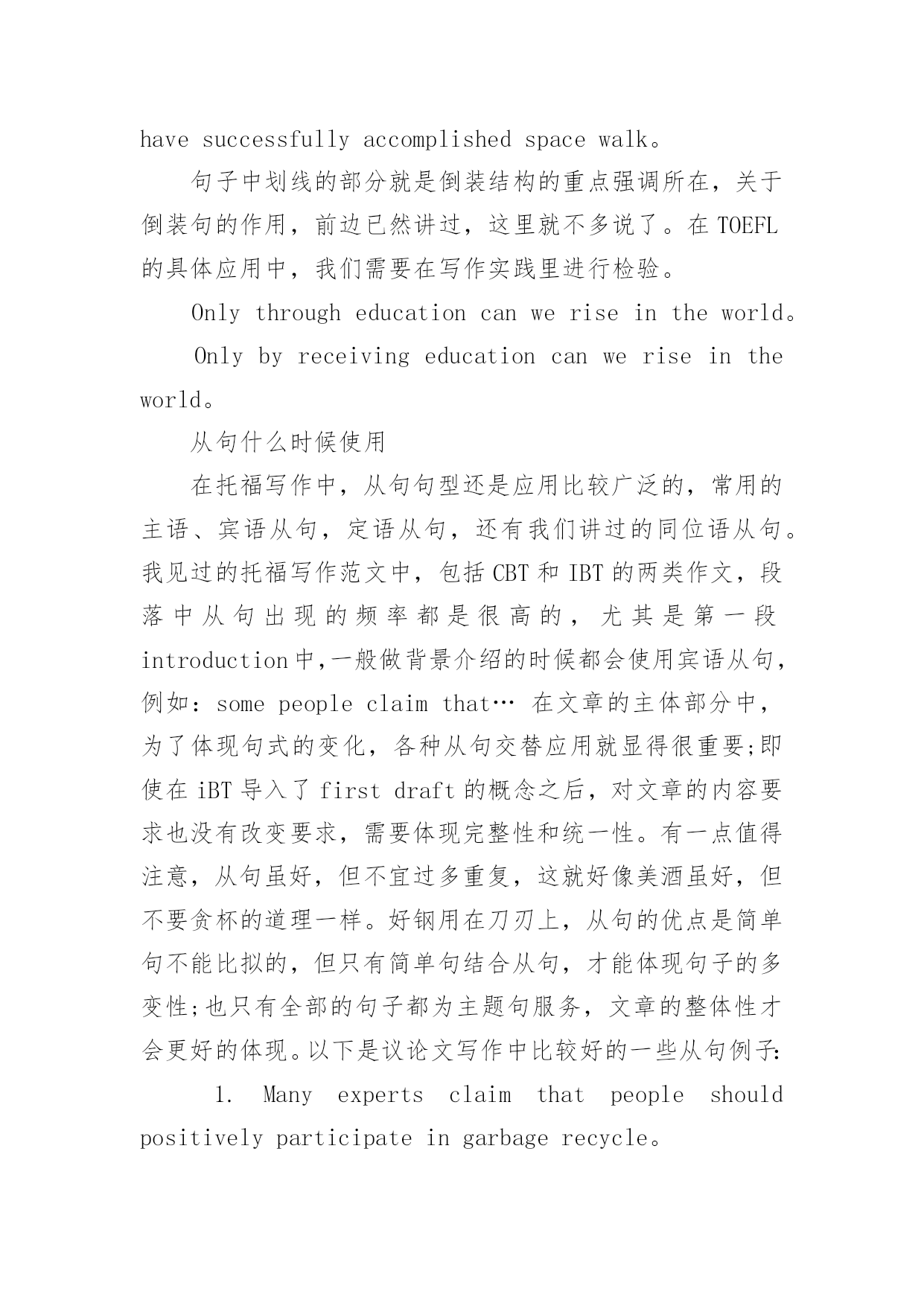 托福写作词汇和句型选用的方法 我们来看看句子吧。如果说单词是句子的灵魂,那句子就是文章的基石,而句型则是不同品质的基石,可以让整篇文章充满多样的色彩,读起来让人很有兴趣。虽然句型的变化很多,可是针对TOEFL文章的特点,一篇接近300字的议论文,IBT在注重文章的完整性和一致性的同时,也需要文章有精彩的内容。可是文章篇幅有限,我们仅仅需要熟练地应用几个不同的句型,就一定会给评分人留下很深刻的印象了句子中的修辞我们看看下边的几个例句:1.Knowledgewillneverlie。知之为知之,不知为不知,是智也。这个句子使用了拟人的修辞手法,赋予了knowledge生命,形象化了知识的严谨性,同时也避免了直接翻译的繁琐冗长。2.Thatinformationcomesveryimpressivelytoeveryoneinthejobmarket。那一信息使所有正在找工作的人为之一震。这个句子也间接使用了拟人的手法,人性化了Information这个词,come可以把人们接受信息的过程表达的更生动。3.Confidenceneverfailstoplayasignificantroleinyourentirelife。自信在你一生中扮演极其重要的角色。这个句子中never和fail表示双重否定,用以加强肯定的成分。这几种句子中的修辞手法都可以使句子的.意思表达起来更生动,让人读起来容易接受,同时也避免了直接翻译的很多缺点。强调句的应用和举例说明孔子《论语》中的这个经典语句可谓家喻户晓,一句“有朋自远方来,不亦乐乎”道出了中华民族作为礼仪之邦的特点。在托福中,这句话可以应用在关于friendship的文章,这句话直译过来说的是:有朋友从很远的地方来看你难道不是一件很开心的事情吗?通过中文理解,我们知道这句话所强调的部分是:一件很开心的事情。“开心”有很多词汇可以选择,常用的有happy和glad,高级一点的有enjoyable和pleasant,再高级一点的还有incredible和delightful。应用到实际写作中,可以使用itis做一个强调句来凸显这句话的特点,例如:It’sdelightfultohavefriendsfromdistantlands。在这个句子中,除了deightful以外,其他句子成分都很平常,每个人都会写,所以即使是评卷人看到这个句子也不会觉得稀奇,那么作为强调句,恰好是delightful这个词,代表了一种发自心底的喜悦和开心,让读过这个句子的人都有眼前一亮的感觉,这也就达到了强调句的作用。然而happy和glad也都有快乐之意,但是和delightful相比就显得不够级别了,明显高兴的程度不一样,delightful更能显示一种喜悦带来的兴奋,迎接千里迢迢来访的朋友这样的表达最恰当不过了。可以起到强调作用的句型结构有很多,我们能够用到的同位语从句和倒装句都有这样的作用,例如:ItisanundeniablefactthathumanactivitiesharmtheEarth。这句话中that后边引导的就是要强调的内容,即anundeniablefact.为了突出harmtheEarth是一个不可否认的事实,做成这样一个句子。Onlythrougheffectivemeasurescanthegovernmentresolvethedispute。这句话强调的就是only后边的effectivemeasures,而且翻译过来是只有同过有效的措施,强调的唯一性,无二法门。为什么要倒装从字面上解释,倒装句子的特点就是把句子倒过来说,这样的解释过于直白但却很实际。根据英语(论坛)句型结构特点,因为要强调才会选择去倒装。我们看看下边的两个例子:1.Sosevereisthisproblemthatwehavenoalternativebuttotakesomefeasiblemeasurestodealwithit。2.Soamazingarethesecrewmembersthattheyhavesuccessfullyaccomplishedspacewalk。句子中划线的部分就是倒装结构的重点强调所在,关于倒装句的作用,前边已然讲过,这里就不多说了。在TOEFL的具体应用中,我们需要在写作实践里进行检验。Onlythrougheducationcanweriseintheworld。Onlybyreceivingeducationcanweriseintheworld。从句什么时候使用在托福写作中,从句句型还是应用比较广泛的,常用的主语、宾语从句,定语从句,还有我们讲过的同位语从句。我见过的托福写作范文中,包括CBT和IBT的两类作文,段落中从句出现的频率都是很高的,尤其是第一段introduc