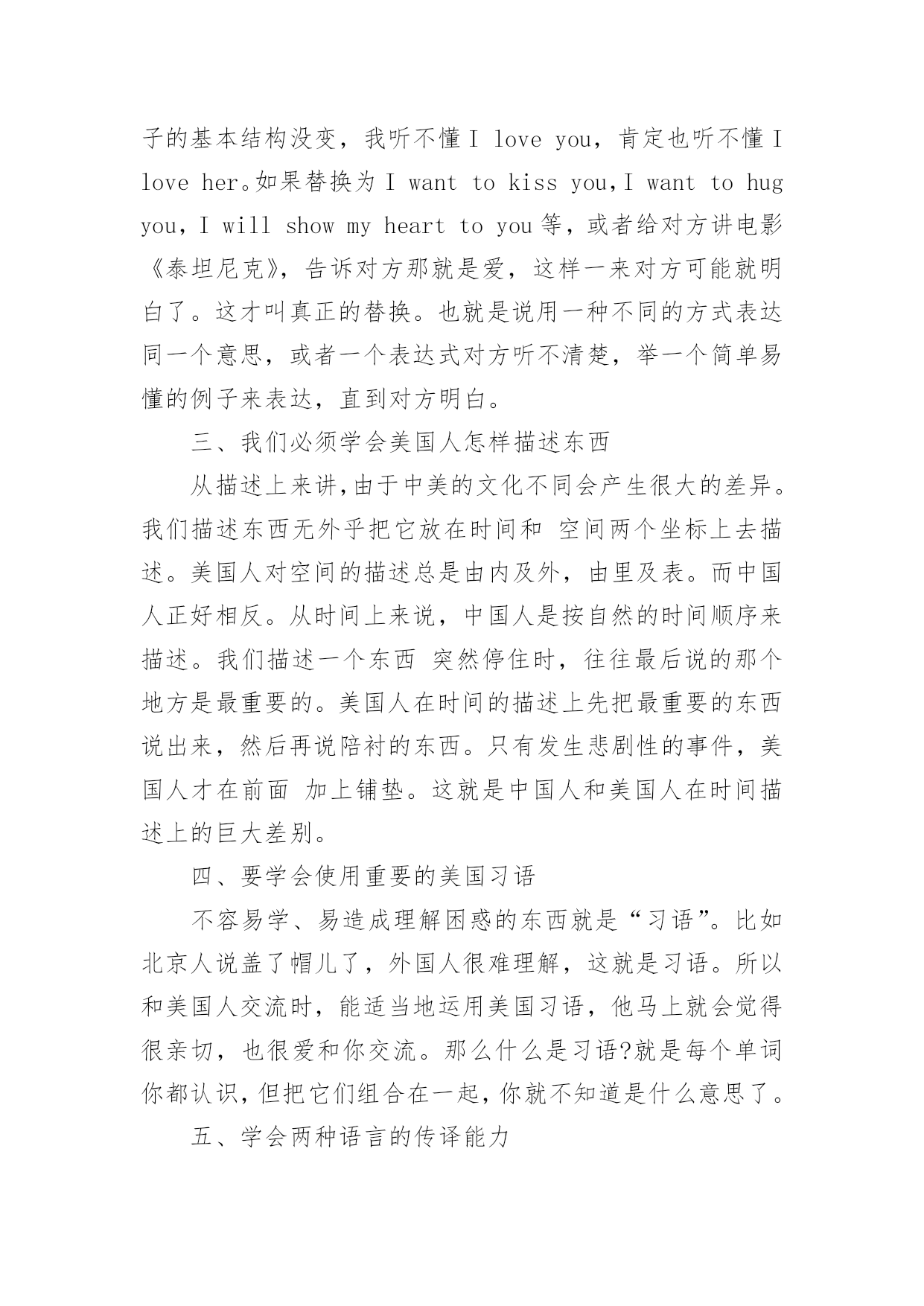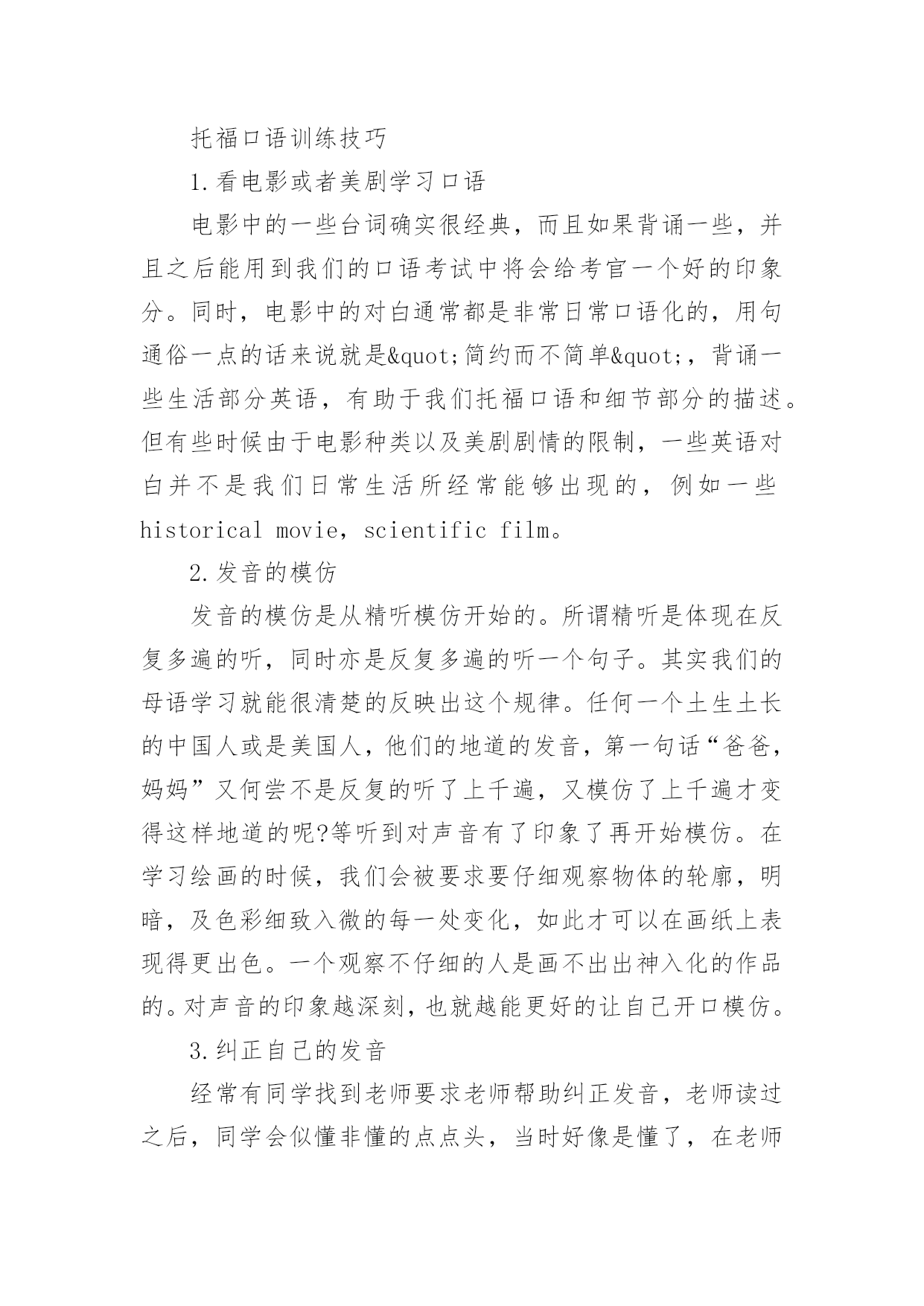 托福口语重要的六大交流方法 导语:托福口语主要考察考生的英语交流能力,如果能够在日常生活中练习托福口语,效果会更迅速,更自然。下面小编分享托福口语重要的六大交流方法,欢迎参考!一、如何用英文简单界定一个东西的技巧美国人和美国人交谈80%是想告诉对方这个事物是什么。我们的课本尽管词汇难度不断加深,但思维逻辑结构却只停留在一个水平上。中国人常说Whereisthebook(这本书在哪儿)?很少有人说Whatisabook(书是什么)?而美国的小学生就开始问:Whatisthebook?这种Whereisthebook只是思维的描述阶段。但是我想连大学生也很难回答Whatisabook?因为中国传统英语教学模式没有教会学生表达思想的技巧。二、用不同的方式解释同一事物如果已经学会界定,但理解还有偏差,那就要训练Howtoexplainthingsindifferentways,一种表达式对方不懂,美国人会寻找另一种表达式最终让对方明白。因为事物就一个,但表达它的语言符号可能会很多。这就要多做替换练习。传统的教学方法也做替换练习,但这种替换不是真替换,只是语言层面的替换,而不是思维层面的替换。比如,Iloveyou(我爱你)。按我们教学的替换方法就把you换成her,mymother等,这种替换和小学生练描红没有什么区别。这种替换没有对智力构成挑战,没有启动思维。这种替换句子的基本结构没变,我听不懂Iloveyou,肯定也听不懂Iloveher。如果替换为Iwanttokissyou,Iwanttohugyou,Iwillshowmyhearttoyou等,或者给对方讲电影《泰坦尼克》,告诉对方那就是爱,这样一来对方可能就明白了。这才叫真正的替换。也就是说用一种不同的方式表达同一个意思,或者一个表达式对方听不清楚,举一个简单易懂的例子来表达,直到对方明白。三、我们必须学会美国人怎样描述东西从描述上来讲,由于中美的文化不同会产生很大的差异。我们描述东西无外乎把它放在时间和空间两个坐标上去描述。美国人对空间的描述总是由内及外,由里及表。而中国人正好相反。从时间上来说,中国人是按自然的时间顺序来描述。我们描述一个东西突然停住时,往往最后说的那个地方是最重要的。美国人在时间的描述上先把最重要的东西说出来,然后再说陪衬的东西。只有发生悲剧性的事件,美国人才在前面加上铺垫。这就是中国人和美国人在时间描述上的巨大差别。四、要学会使用重要的美国习语不容易学、易造成理解困惑的东西就是“习语”。比如北京人说盖了帽儿了,外国人很难理解,这就是习语。所以和美国人交流时,能适当地运用美国习语,他马上就会觉得很亲切,也很爱和你交流。那么什么是习语?就是每个单词你都认识,但把它们组合在一起,你就不知道是什么意思了。五、学会两种语言的传译能力这是衡量口语水平的一个最重要标准。因为英语不是我们的母语,我们天生就有自己的母语。很多人都认为学好外语必须丢掉自己的母语,这是不对的。六、要有猜测能力为什么美国人和美国人、中国人和中国人之间交流很少产生歧义?就是因为他们之间能“猜测”。我们的教学不提倡“猜测”。但我觉得猜测对学好美国口语很重要。在交流中,有一个词你没有听懂,你不可能马上去查字典,这时候就需要猜测来架起一座桥梁来弥补这个缺口,否则交流就会中断。中国人学习口语讲究背诵,背句型、背语调,结果就是很多人讲口语的时候讲着讲着眼就开始向上翻,实际上是在记忆中寻找曾经背过的东西。如果他要是能猜测的话,我想也就不会出现这种现象。以上就是学会用美国人思维方式的6个技巧。中国学生如果能做到这6点,用较短的时间肯定能学好口语。再说说英语语音的问题。留学专家表示,我们中国人不需要钻牛角尖,一定追求发音像一个本地人,只要我们的发音不至于让对方产生误解就可以了。我们在平时,不需要迷信什么科学方法,只需要记住一点:模仿。但一定要模仿标准的英语或美语。在模仿的基础上,每天保持1个小时的自我口语练习,这个练习必须假想一个双向交流的场合,即仿佛有人与你交流一样。最后,讲讲英语的用气问题。我们在发音时,尽量气运丹田,而避免用肺发音,这可以使英语发音洪亮圆润。托福口语训练技巧1.看电影或者美剧学习口语电影中的一些台词确实很经典,而且如果背诵一些,并且之后能用到我们的口语考试中将会给考官一个好的印象分。同时,电影中的对白通常都是非常日常口语化的,用句通俗一点的话来说就是"简约而不简单",背诵一些生活部分英语,有助于我们托福口语和细节部分的描述。但有些时候由于电影种类以及美剧剧情的限制,一些英语对白并不是我们日常生活所经常能够出现的,例如一些historicalmovie,scientificfilm。2.发音的模仿发音的模仿是从精听模仿开始的。所谓精听是体现在反复多遍的听,同时亦是反