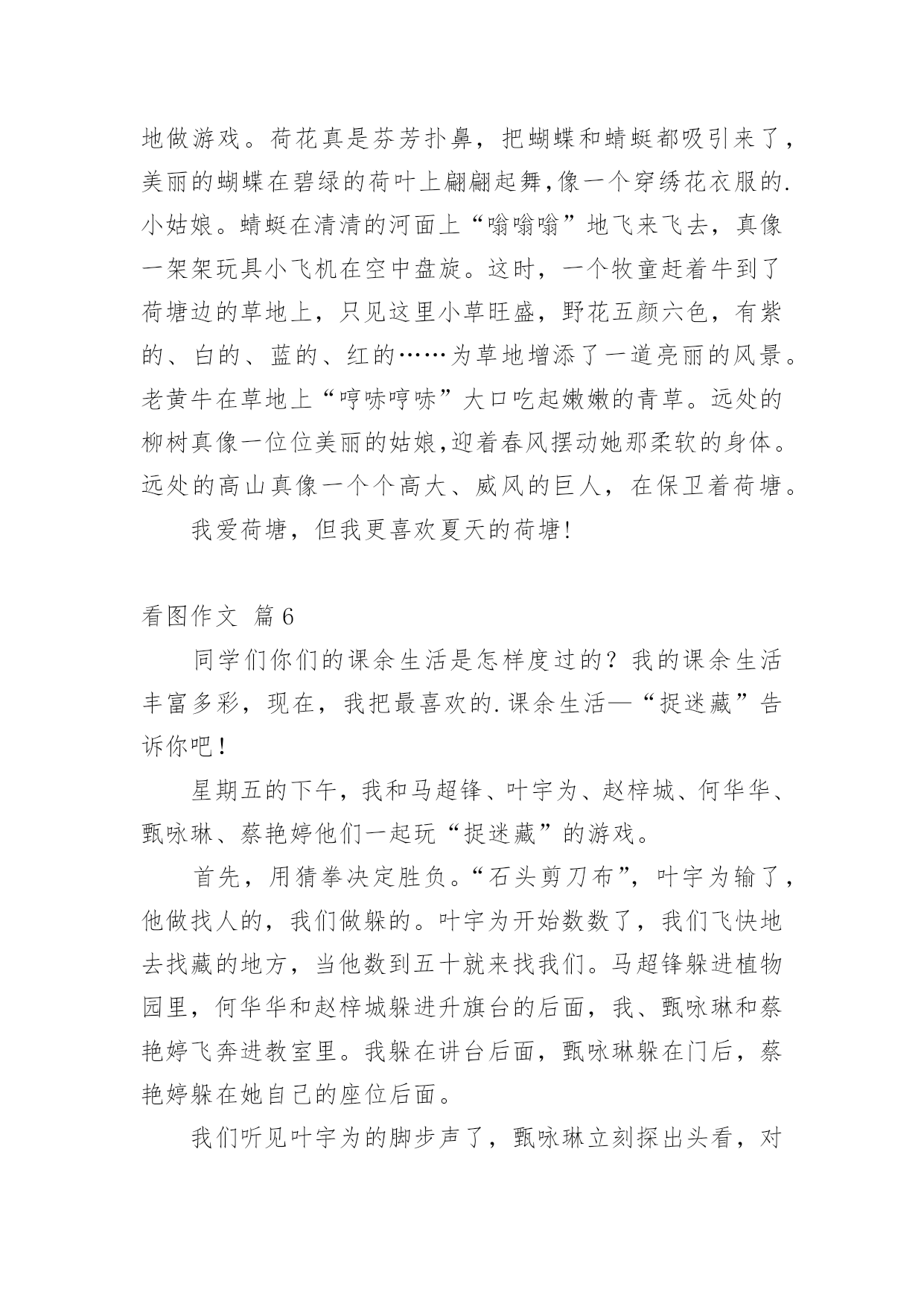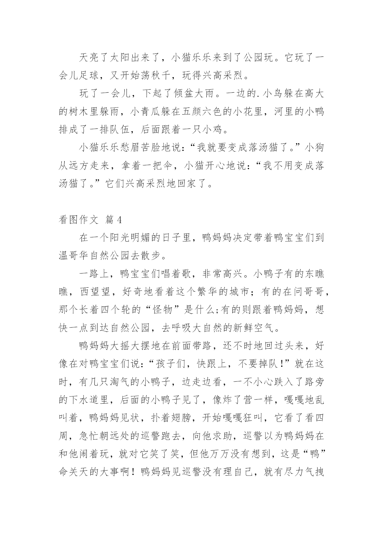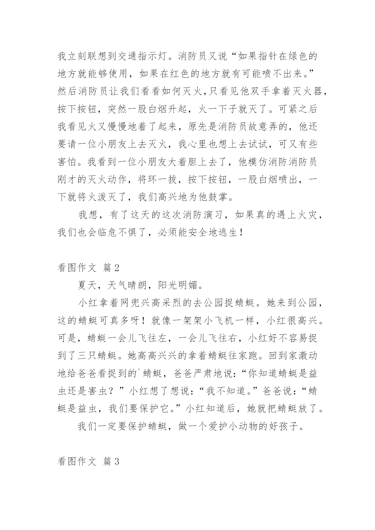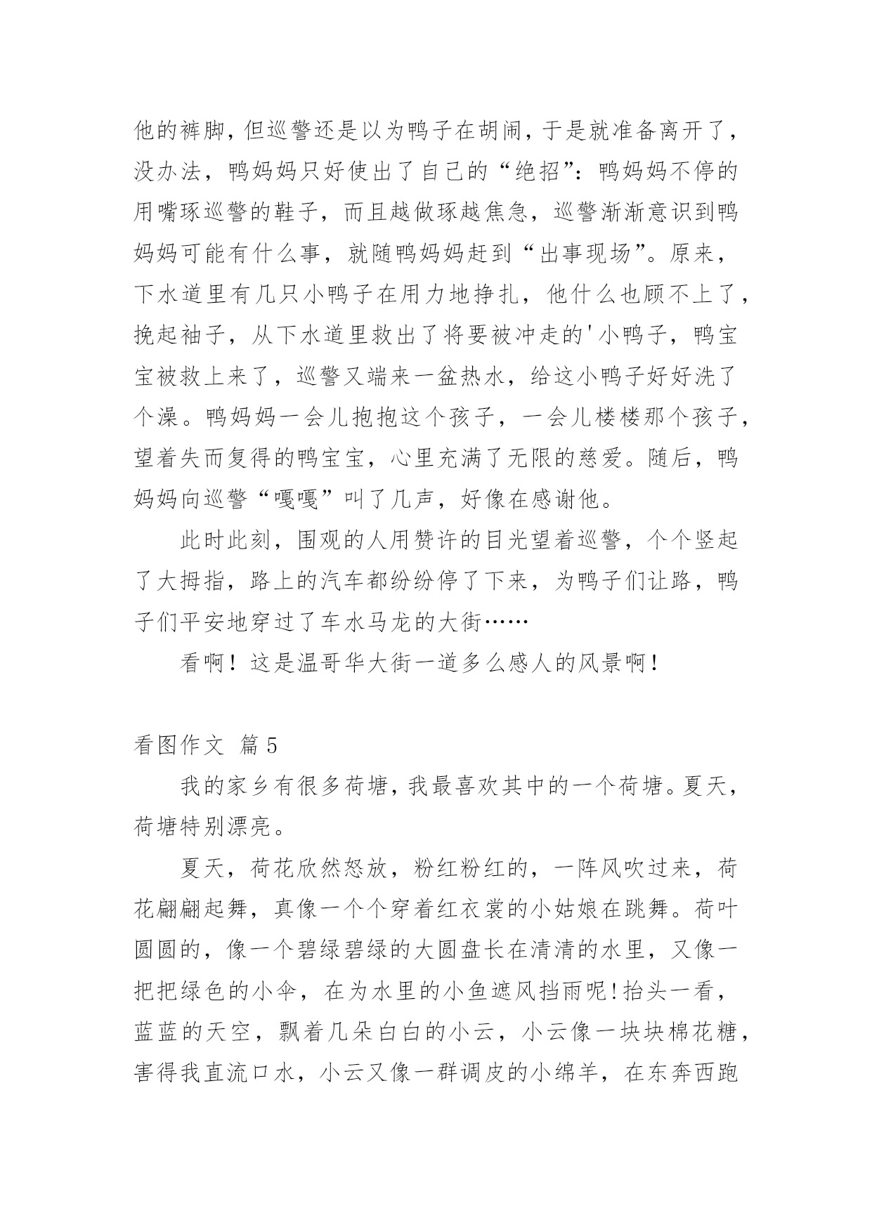 看图作文 看图作文合集8篇在平平淡淡的学习、工作、生活中,许多人都写过作文吧,作文一定要做到主题集中,围绕同一主题作深入阐述,切忌东拉西扯,主题涣散甚至无主题。那要怎么写好作文呢?下面是小编整理的看图作文8篇,希望能够帮助到大家。看图作文篇1这天上午,第一堂课快下课时,突然响起了急促的警报声,我听到老师在说“着火了,大家立刻安静有序地离开教室。”我心里十分得慌乱……我看到同学们都拿着毛巾捂住嘴巴,于是我也连忙拿出毛巾捂着,跟着同学们跑。一出门,我就闻到一股烟味,之后看到下方停着红红的消防车,我心里更恐惧了,仿佛被一块大石头压着,嘴巴不停地抖,脑子里一片空白。我飞快地跟了上去,走廊里的烟越来越大。我们跑到了操场,看到国旗台下有一团火焰,那火焰好像一条条全身赤红的大蛇,晃动地身体,还发出“咻、咻、咻”的叫声,好像准备随时蹿到我们身上来一样。火苗还在不停地蔓延着,跳动的火苗一劲地往上蹿,丝毫没有减弱的.迹象。过了一会儿,消防员把灭火器拿了过来,他说先要把灭火器的环拔掉,然后再看看压力表。压力表分三块,一块红、一块黄、一块绿,这让我立刻联想到交通指示灯。消防员又说“如果指针在绿色的地方就能够使用,如果在红色的地方就有可能喷不出来。”然后消防员让我们看看如何灭火,只看见他双手拿着灭火器,按下按钮,突然一股白烟升起,火一下子就灭了。可紧之后我看见火又慢慢地着了起来,原先是消防员故意弄的,他还要请一位小朋友上去灭火,我心里也想上去试试,可又有些害怕。我看到一位小朋友大着胆上去了,他模仿消防消防员刚才的灭火动作,将环一拔,按下按钮,一股白烟喷出,一下就将火泼灭了,我们高兴地为他鼓掌。我想,有了这天的这次消防演习,如果真的遇上火灾,我们也会临危不惧了,必须能安全地逃生!看图作文篇2夏天,天气晴朗,阳光明媚。小红拿着网兜兴高采烈的去公园捉蜻蜓。她来到公园,这的蜻蜓可真多呀!就像一架架小飞机一样,小红很高兴。可是,蜻蜓一会儿飞往左,一会儿飞往右,小红好不容易捉到了三只蜻蜓。她高高兴兴的拿着蜻蜓往家跑。回到家激动地给爸爸看捉到的`蜻蜓,爸爸严肃地说:“你知道蜻蜓是益虫还是害虫?”小红想了想说:“我不知道。”爸爸说:“蜻蜓是益虫,我们要保护它。”小红知道后,她就把蜻蜓放了。我们一定要保护蜻蜓,做一个爱护小动物的好孩子。看图作文篇3天亮了太阳出来了,小猫乐乐来到了公园玩。它玩了一会儿足球,又开始荡秋千,玩得兴高采烈。玩了一会儿,下起了倾盆大雨。一边的.小鸟躲在高大的树木里躲雨,小青瓜躲在五颜六色的小花里,河里的小鸭排成了一排队伍,后面跟着一只小鸡。小猫乐乐愁眉苦脸地说:“我就要变成落汤猫了。”小狗从远方走来,拿着一把伞,小猫开心地说:“我不用变成落汤猫了。”它们兴高采烈地回家了。看图作文篇4在一个阳光明媚的日子里,鸭妈妈决定带着鸭宝宝们到温哥华自然公园去散步。一路上,鸭宝宝们唱着歌,非常高兴。小鸭子有的东瞧瞧,西望望,好奇地看着这个繁华的城市;有的在问哥哥,那个长着四个轮的“怪物”是什么;有的则跟着鸭妈妈,想快一点到达自然公园,去呼吸大自然的新鲜空气。鸭妈妈大摇大摆地在前面带路,还不时地回过头来,好像在对鸭宝宝们说:“孩子们,快跟上,不要掉队!”就在这时,有几只淘气的小鸭子,边走边看,一不小心跌入了路旁的下水道里,后面的小鸭子见了,像炸了营一样,嘎嘎地乱叫着,鸭妈妈见状,扑着翅膀,开始嘎嘎狂叫,它看了看四周,急忙朝远处的巡警跑去,向他求助,巡警以为鸭妈妈在和他闹着玩,就对它笑了笑,但他万万没有想到,这是“鸭”命关天的大事啊!鸭妈妈见巡警没有理自己,就有尽力气拽他的裤脚,但巡警还是以为鸭子在胡闹,于是就准备离开了,没办法,鸭妈妈只好使出了自己的“绝招”:鸭妈妈不停的用嘴琢巡警的鞋子,而且越做琢越焦急,巡警渐渐意识到鸭妈妈可能有什么事,就随鸭妈妈赶到“出事现场”。原来,下水道里有几只小鸭子在用力地挣扎,他什么也顾不上了,挽起袖子,从下水道里救出了将要被冲走的'小鸭子,鸭宝宝被救上来了,巡警又端来一盆热水,给这小鸭子好好洗了个澡。鸭妈妈一会儿抱抱这个孩子,一会儿楼楼那个孩子,望着失而复得的鸭宝宝,心里充满了无限的慈爱。随后,鸭妈妈向巡警“嘎嘎”叫了几声,好像在感谢他。此时此刻,围观的人用赞许的目光望着巡警,个个竖起了大拇指,路上的汽车都纷纷停了下来,为鸭子们让路,鸭子们平安地穿过了车水马龙的大街……看啊!这是温哥华大街一道多么感人的风景啊!看图作文篇5我的家乡有很多荷塘,我最喜欢其中的一个荷塘。夏天,荷塘特别漂亮。夏天,荷花欣然怒放,粉红粉红的,一阵风吹过来,荷花翩翩起舞,真像一个个穿着红衣裳的小姑娘在跳舞。荷叶圆圆的,像一个碧绿碧绿的大圆盘长在清清的水里,又像一把把绿色的小伞,在为水里的小鱼遮风挡雨呢!抬头一看,蓝蓝的天空,飘着几朵白白的小云,小云像一块块