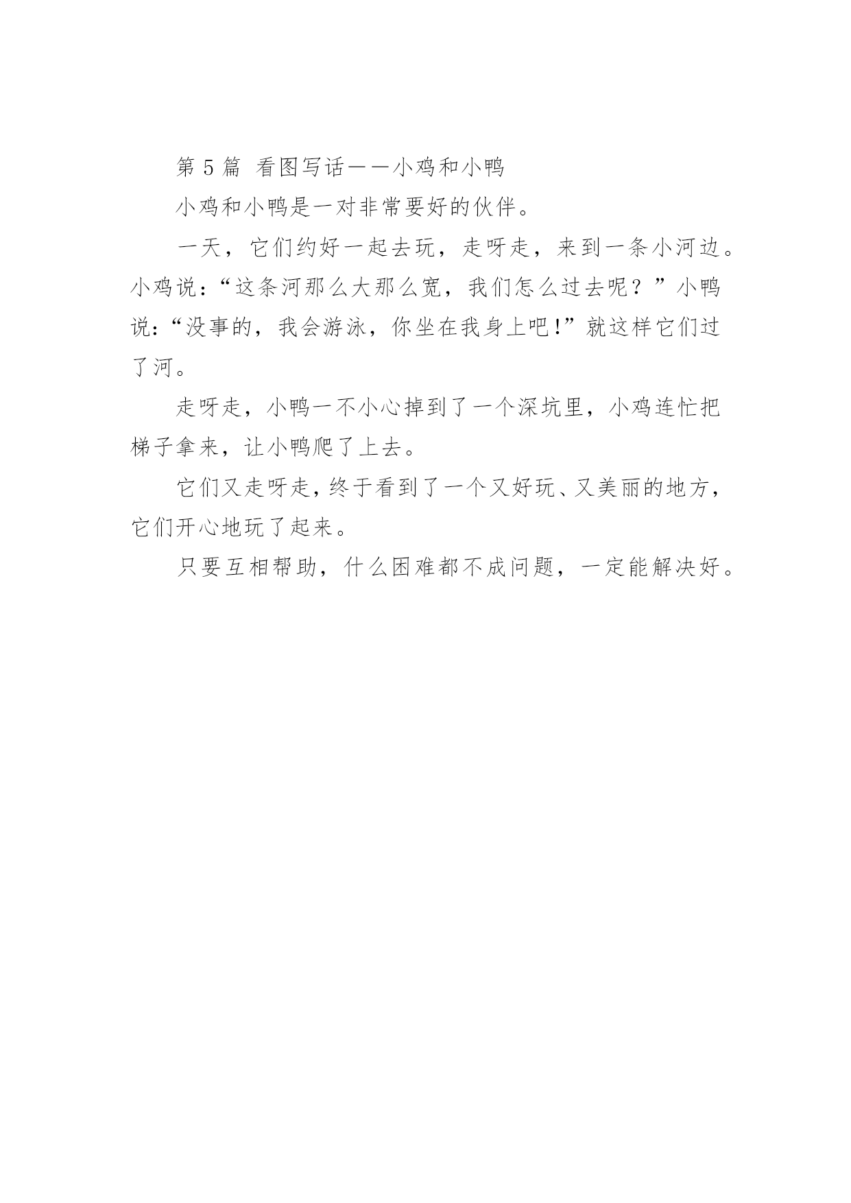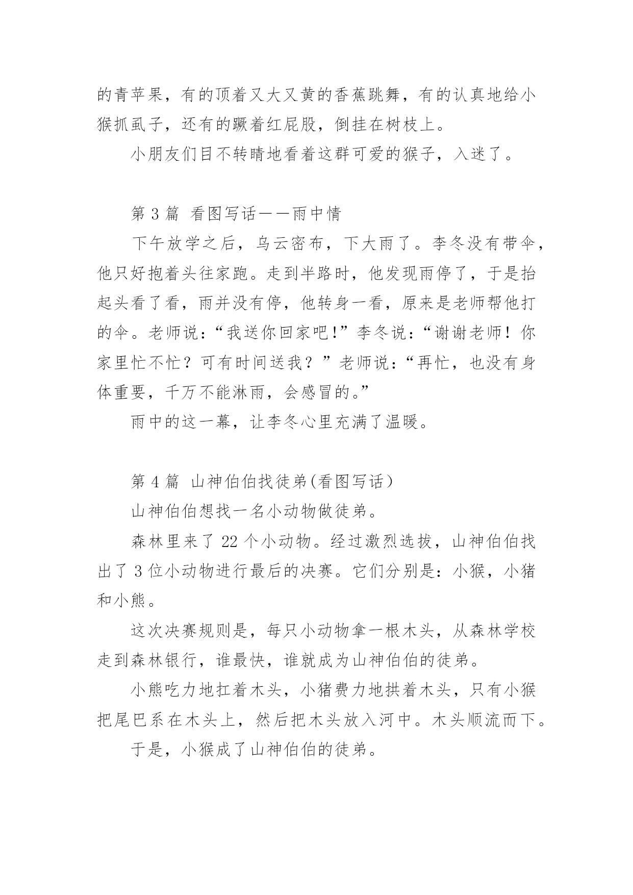 看图作文 第1篇[妈妈晒]看图写话才开始看到老师的博客,已经学到很好用的一招,就是口述作文。我家孩子一年级,这是他的一个看图写话。红红的太阳从东边升起来了,小鸡叽叽喳喳的在唱歌,把小明给吵醒了。妈妈说:“现在还早,你出去散散步,呼吸一下新鲜空气吧。”于是小明穿好衣服跳下床,跑到外面,在林子里散步。小鸟说:“早上好,小明。”小鸟们围着小明来了个大合唱,小明听着小鸟的歌声,晒着暖暖的太阳,感受到了一个春光明媚的.景象,一个鸟语花香的早上开始了。小明感到很开心。这样改一是为了语句简练,另一方面孩子小,写字慢,晚上八点开始作,已经在揉眼睛,打哈欠了,就这还誊抄到九点。不知道写得怎么样,指导得对不对,特别是最后一句,改了后是否还能表达小明开心的心情。(本来按老师的指导,为了对称鸟语花香还应加点花儿的描写,但太晚了怕影响休息,所以没做要求。)还有那些欠缺的,请老师及各位帮忙看看。第2篇猴子们的世界(看图写话)今天,我们去春游。老师带我们参观动物园。天蓝蓝的,白白的云彩在天空中飘浮,一片片绿树给小鸟搭起了温馨的家。猴子们在假山上玩耍。有的坐在假山顶上吃着又香又甜的青苹果,有的顶着又大又黄的香蕉跳舞,有的认真地给小猴抓虱子,还有的蹶着红屁股,倒挂在树枝上。小朋友们目不转睛地看着这群可爱的猴子,入迷了。第3篇看图写话――雨中情下午放学之后,乌云密布,下大雨了。李冬没有带伞,他只好抱着头往家跑。走到半路时,他发现雨停了,于是抬起头看了看,雨并没有停,他转身一看,原来是老师帮他打的伞。老师说:“我送你回家吧!”李冬说:“谢谢老师!你家里忙不忙?可有时间送我?”老师说:“再忙,也没有身体重要,千万不能淋雨,会感冒的。”雨中的这一幕,让李冬心里充满了温暖。第4篇山神伯伯找徒弟(看图写话)山神伯伯想找一名小动物做徒弟。森林里来了22个小动物。经过激烈选拔,山神伯伯找出了3位小动物进行最后的决赛。它们分别是:小猴,小猪和小熊。这次决赛规则是,每只小动物拿一根木头,从森林学校走到森林银行,谁最快,谁就成为山神伯伯的徒弟。小熊吃力地扛着木头,小猪费力地拱着木头,只有小猴把尾巴系在木头上,然后把木头放入河中。木头顺流而下。于是,小猴成了山神伯伯的徒弟。第5篇看图写话――小鸡和小鸭小鸡和小鸭是一对非常要好的伙伴。一天,它们约好一起去玩,走呀走,来到一条小河边。小鸡说:“这条河那么大那么宽,我们怎么过去呢?”小鸭说:“没事的,我会游泳,你坐在我身上吧!”就这样它们过了河。走呀走,小鸭一不小心掉到了一个深坑里,小鸡连忙把梯子拿来,让小鸭爬了上去。它们又走呀走,终于看到了一个又好玩、又美丽的地方,它们开心地玩了起来。只要互相帮助,什么困难都不成问题,一定能解决好。
